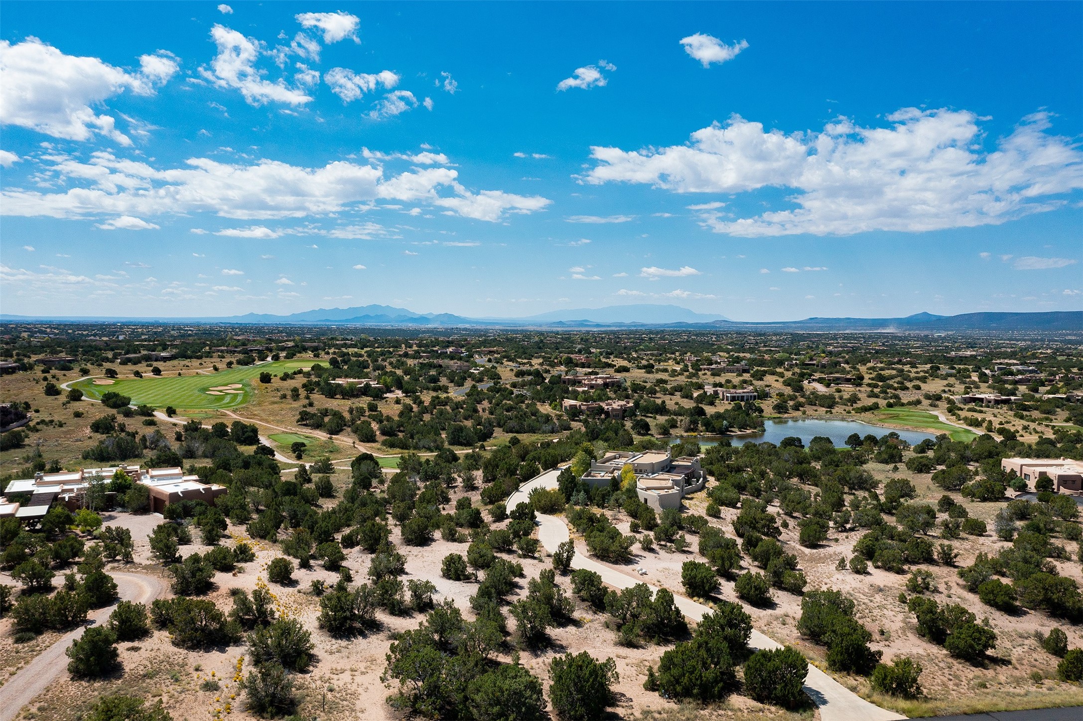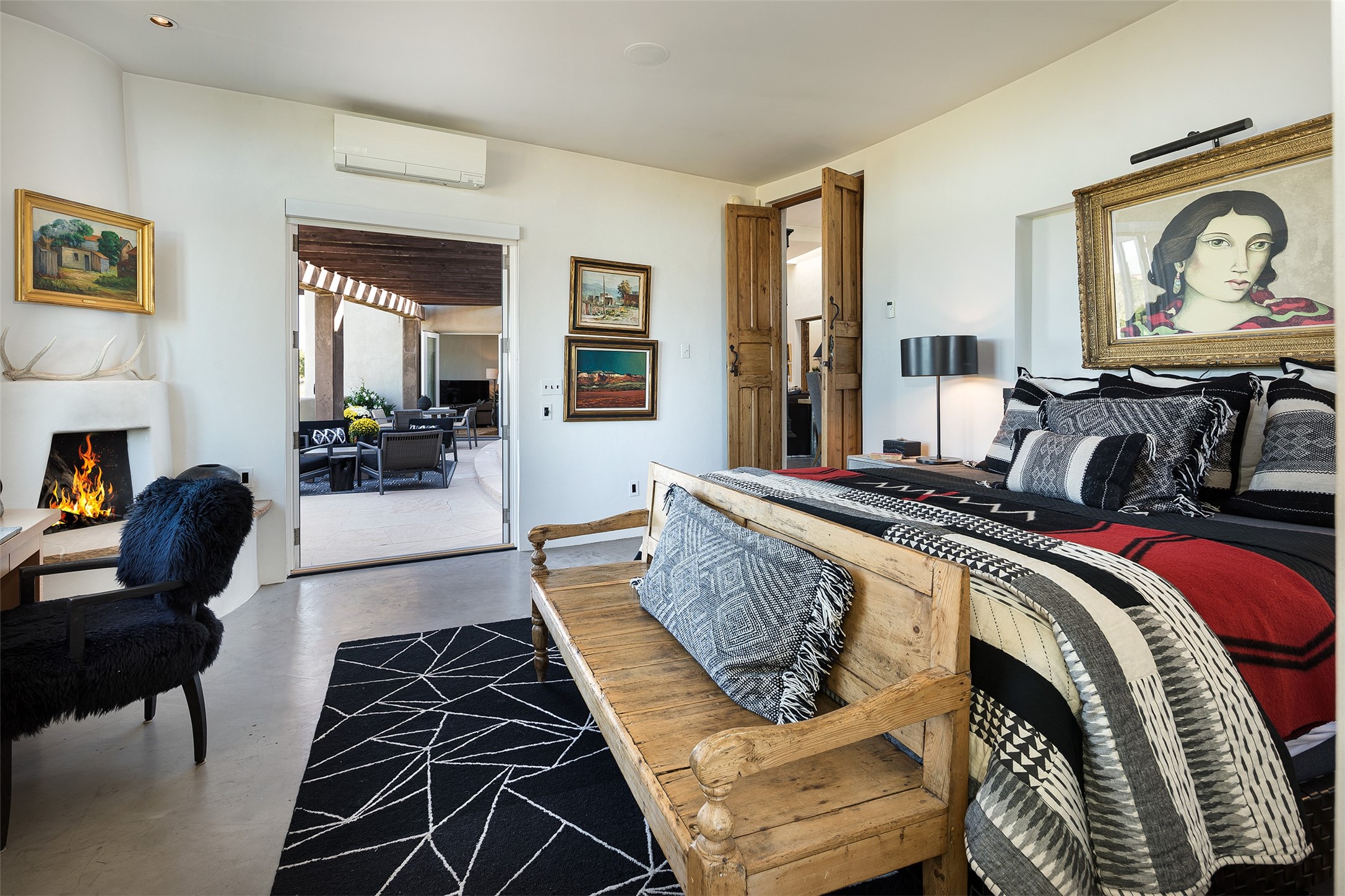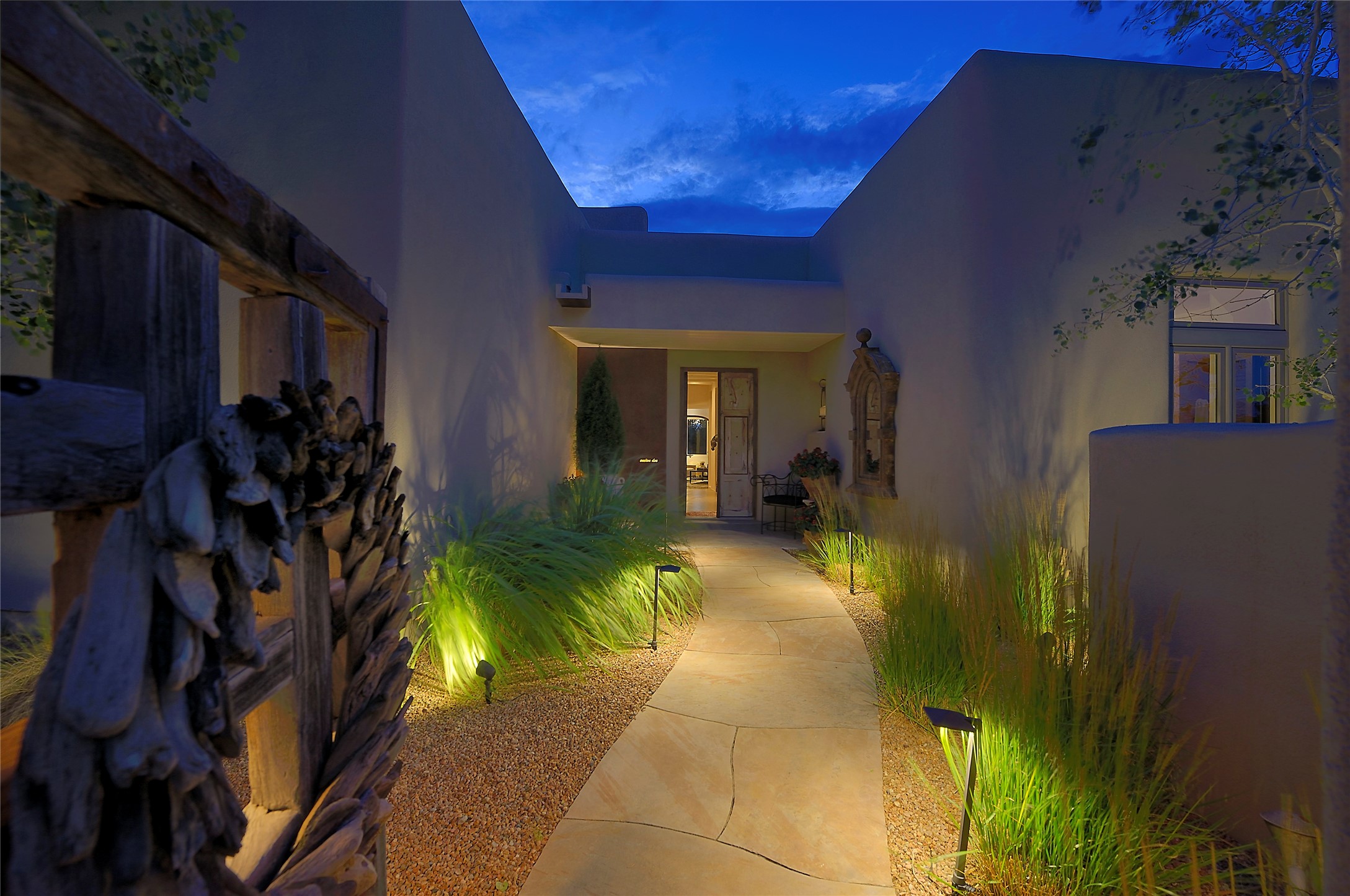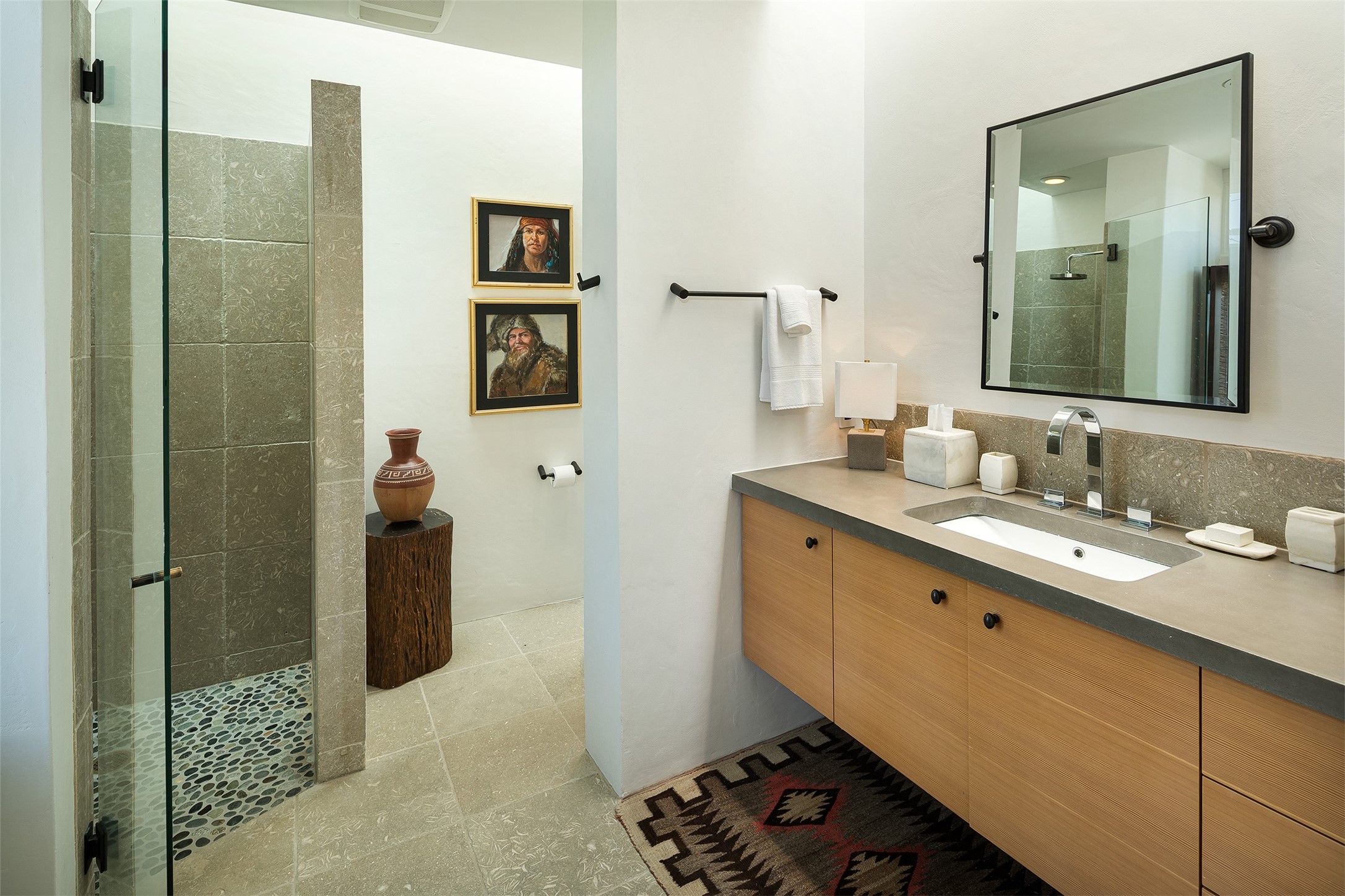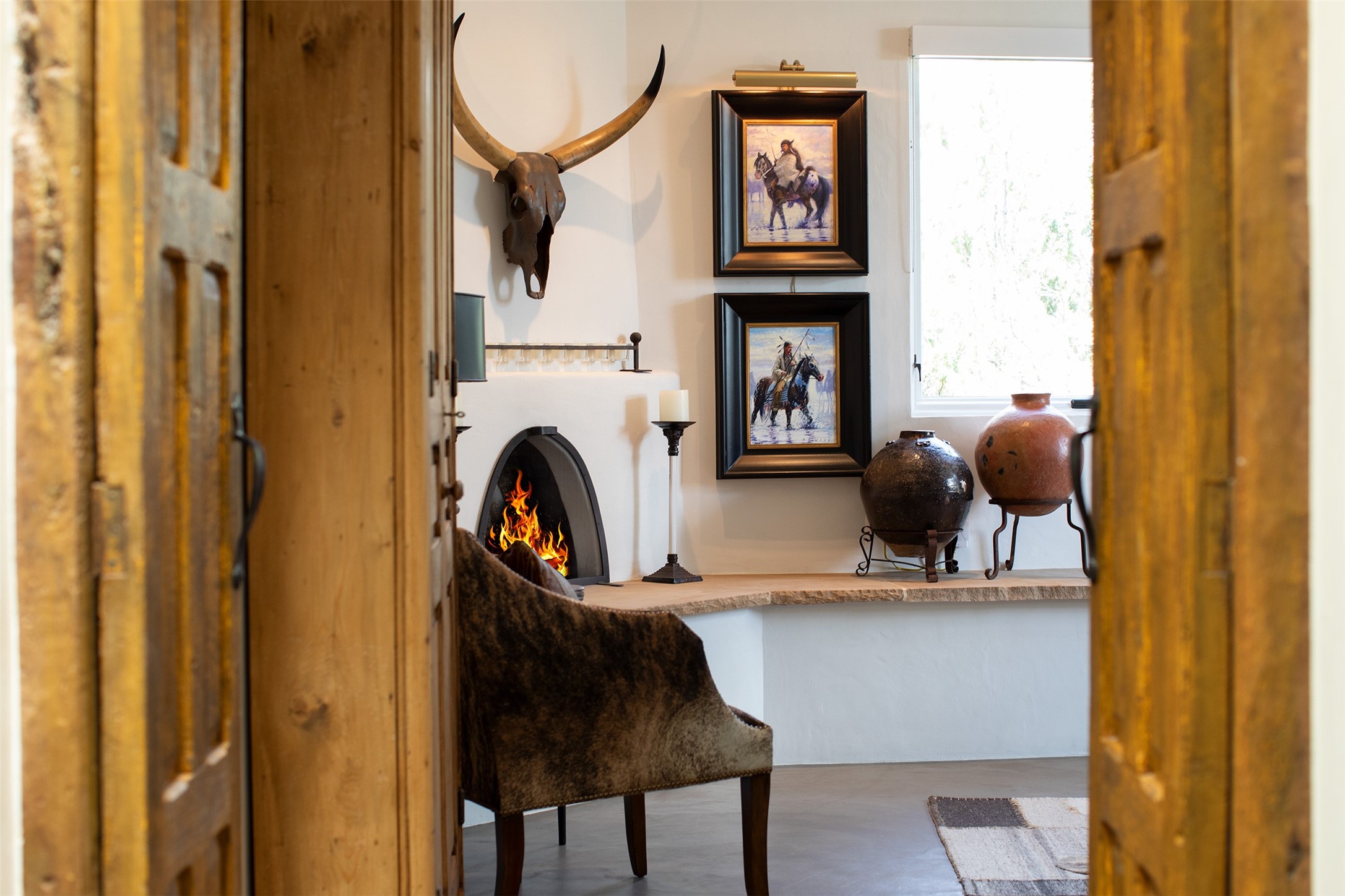 One of the most extraordinary homes in all of Santa Fe, this captivating residence by the award-winning builder, Tierra Concepts, stuns with contemporary architecture, majestic, expansive mountain, golf course and sunset views. Perched on an elevated double lot, with unmatched privacy on 4.5 acres, overlooking the Jack Nicklaus designed Sunrise Golf Course, within the famed community of Las Campanas and the coveted Wildhorse Estates, this exquisite home exemplifies the unique blend of modern design with the warmth of New Mexican accents. Defining features begin with the long, private, concrete driveway, entering the custom carved courtyard doors and vibrant landscape. This tranquil retreat offers 3 bedrooms, 4 baths, plus a media room/office with portal access. The 55' great room excites with surround mountain views, high ceilings, vast walls for art, clerestory windows, 9 double atrium glass doors which lead to the dual outdoor portals. The well-appointed kitchen with fireplace impresses with a large island and seating, walk-in pantry, dual sinks, and Wolf, Viking, Sub-Zero, Bosch, and Miele appliances, all of which opens to a breakfast dining area, casual sitting room, outdoor built-in BBQ and dining area. Off the kitchen is a wine bar and formal dining room with a 350-bottle glassed wine wall and fireplace. Luxurious owner's suite with a sitting area, fireplace, spa-like bath, floating vanity, dual sinks, soaking tub, steam shower and walk-in closet. Two spacious ensuite bedrooms with views, built-in desks, and fireplaces. Seamless outdoor living experience is enhanced with 2 generous, private, walled courtyards with deep portals, 2 fireplaces and RH Design outdoor furnishings. Highlights include soft, natural light, with 7 fireplaces, 14 recessed skylights, 6 imported double antique doors, and creamy white plaster walls. Substantially furnished by RH Design, inside and out. Featured in an 8-page spread in Western Art Collector Magazine and Su Casa Magazine.