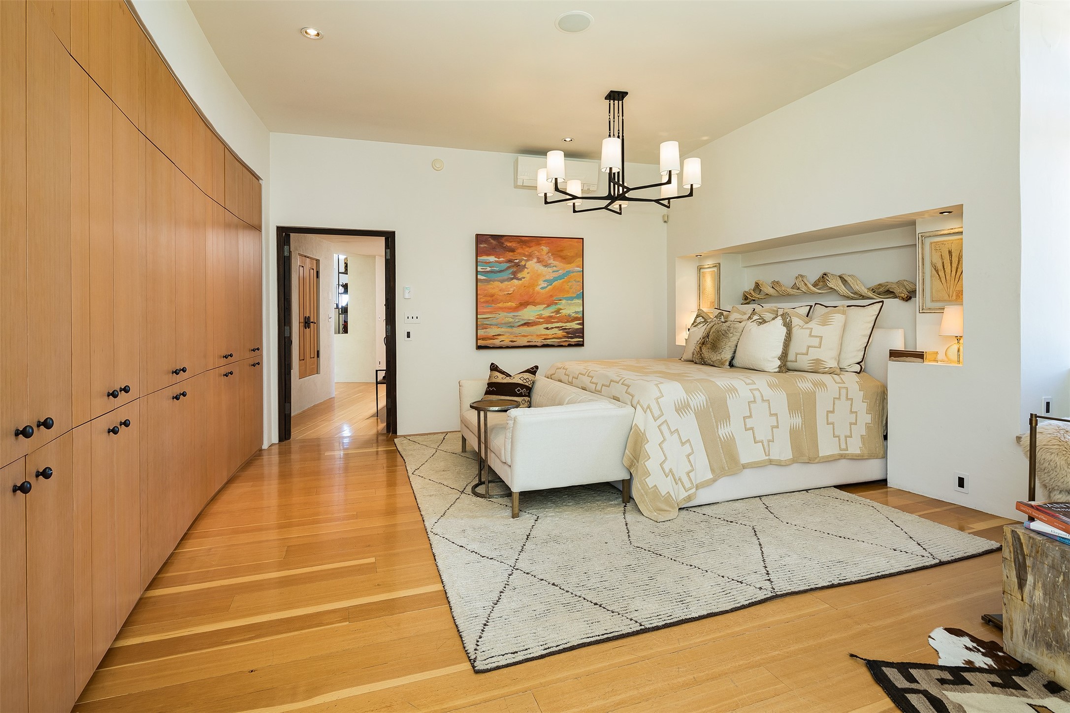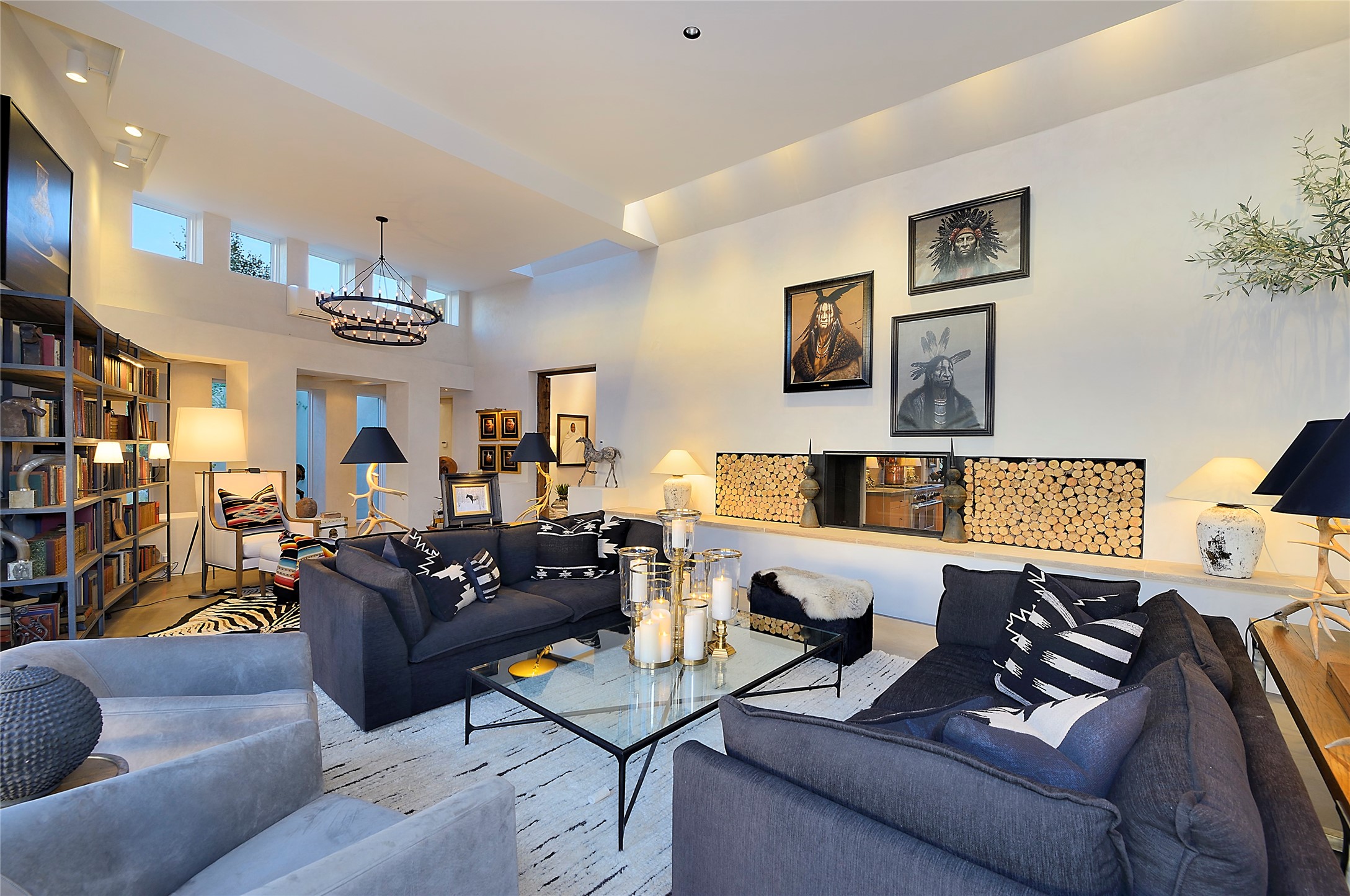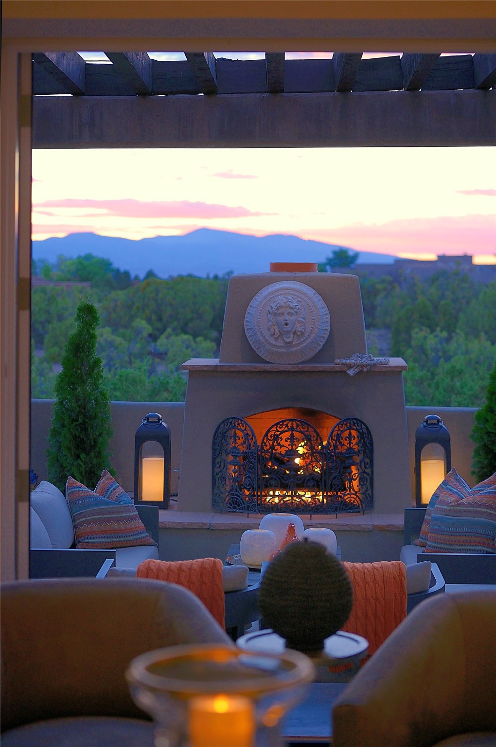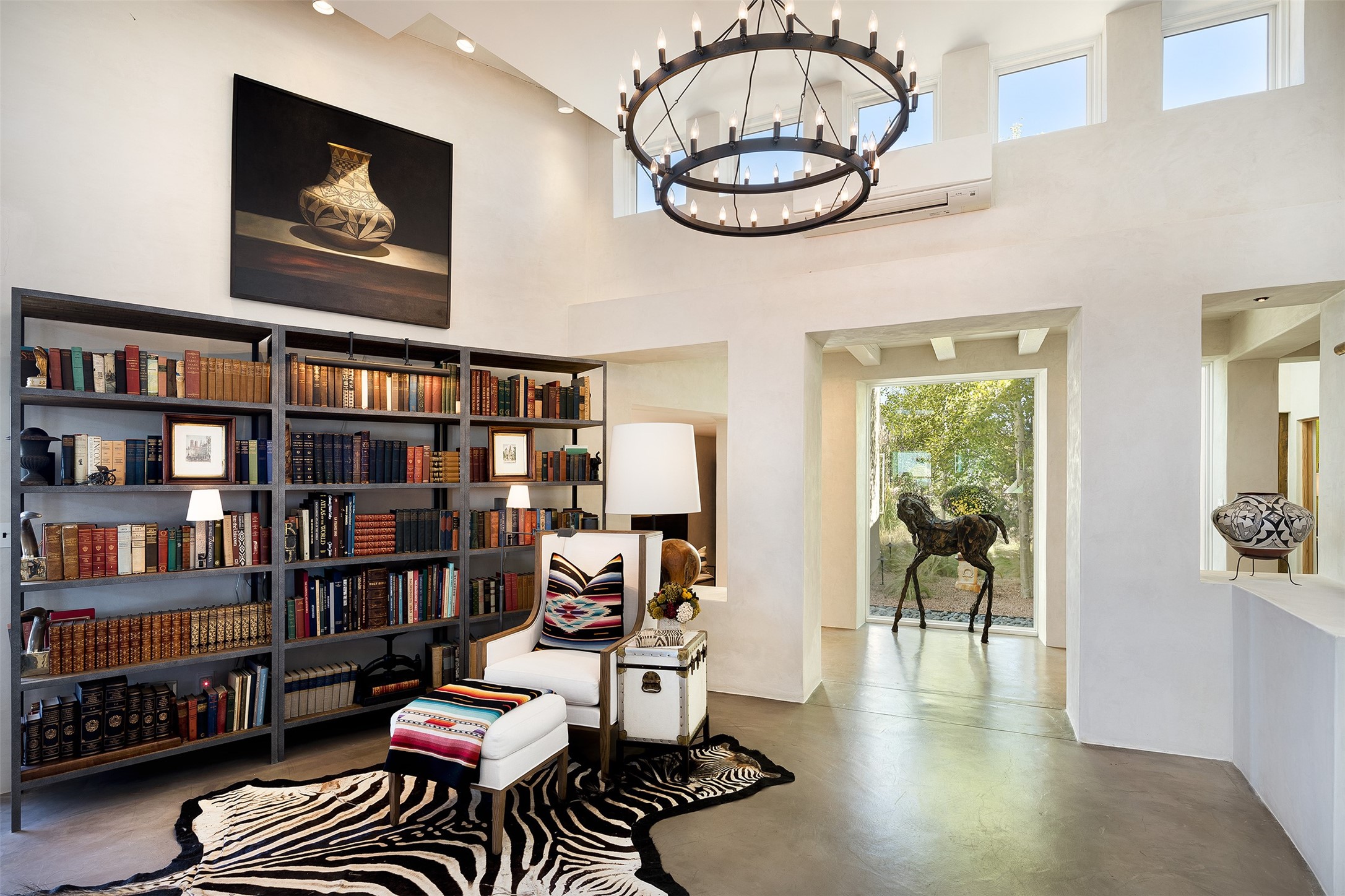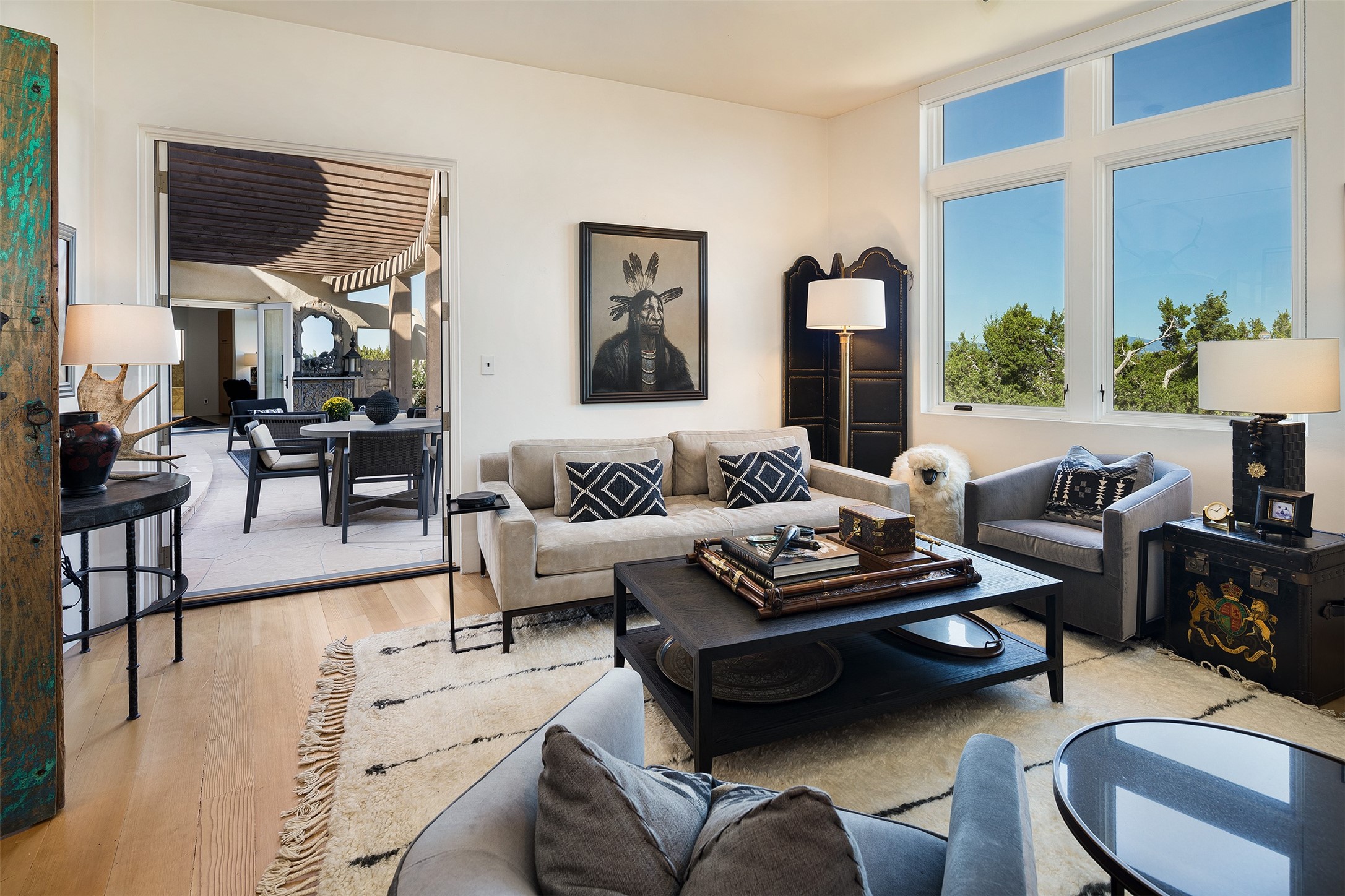 One of the most extraordinary homes in all of Santa Fe, this captivating residence by the award-winning builder, Tierra Concepts, stuns with contemporary architecture, majestic, expansive mountain, golf course and sunset views. Perched on an elevated double lot, with unmatched privacy on 4.5 acres, overlooking the Jack Nicklaus designed Sunrise Golf Course, within the famed community of Las Campanas and the coveted Wildhorse Estates, this exquisite home exemplifies the unique blend of modern design with the warmth of New Mexican accents. Defining features begin with the long, private, concrete driveway, entering the custom carved courtyard doors and vibrant landscape. This tranquil retreat offers 3 bedrooms, 4 baths, plus a media room/office with portal access. The 55' great room excites with surround mountain views, high ceilings, vast walls for art, clerestory windows, 9 double atrium glass doors which lead to the dual outdoor portals. The well-appointed kitchen with fireplace impresses with a large island and seating, walk-in pantry, dual sinks, and Wolf, Viking, Sub-Zero, Bosch, and Miele appliances, all of which opens to a breakfast dining area, casual sitting room, outdoor built-in BBQ and dining area. Off the kitchen is a wine bar and formal dining room with a 350-bottle glassed wine wall and fireplace. Luxurious owner's suite with a sitting area, fireplace, spa-like bath, floating vanity, dual sinks, soaking tub, steam shower and walk-in closet. Two spacious ensuite bedrooms with views, built-in desks, and fireplaces. Seamless outdoor living experience is enhanced with 2 generous, private, walled courtyards with deep portals, 2 fireplaces and RH Design outdoor furnishings. Highlights include soft, natural light, with 7 fireplaces, 14 recessed skylights, 6 imported double antique doors, and creamy white plaster walls. Substantially furnished by RH Design, inside and out. Featured in an 8-page spread in Western Art Collector Magazine and Su Casa Magazine.