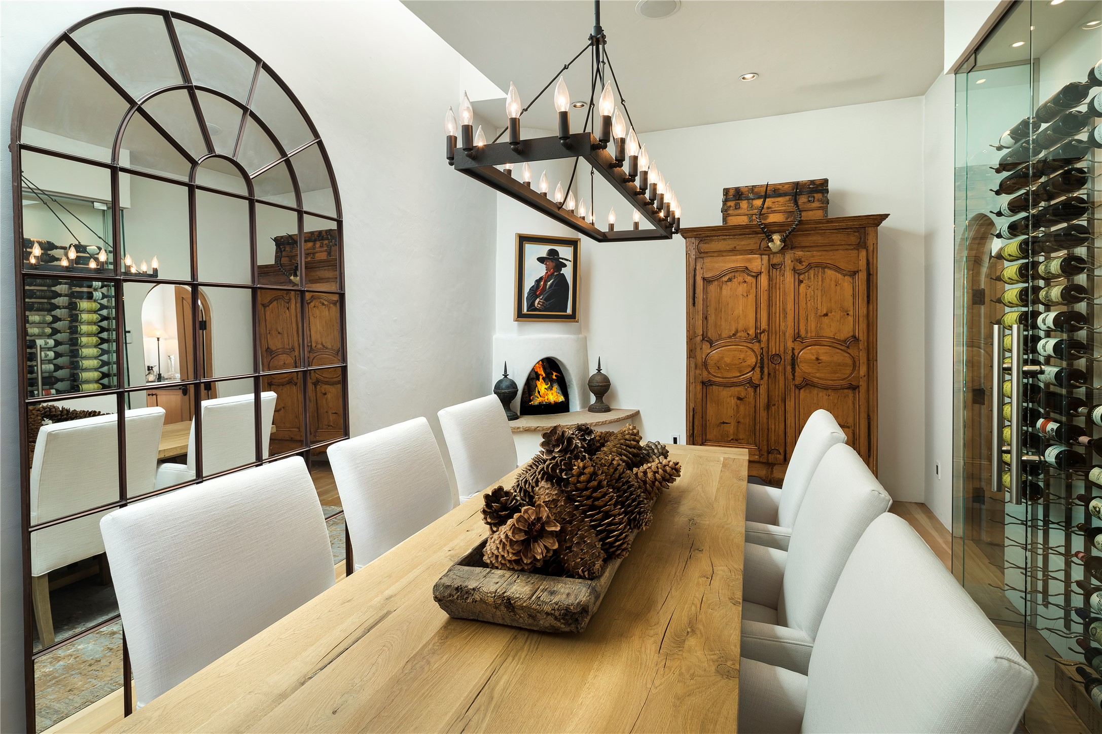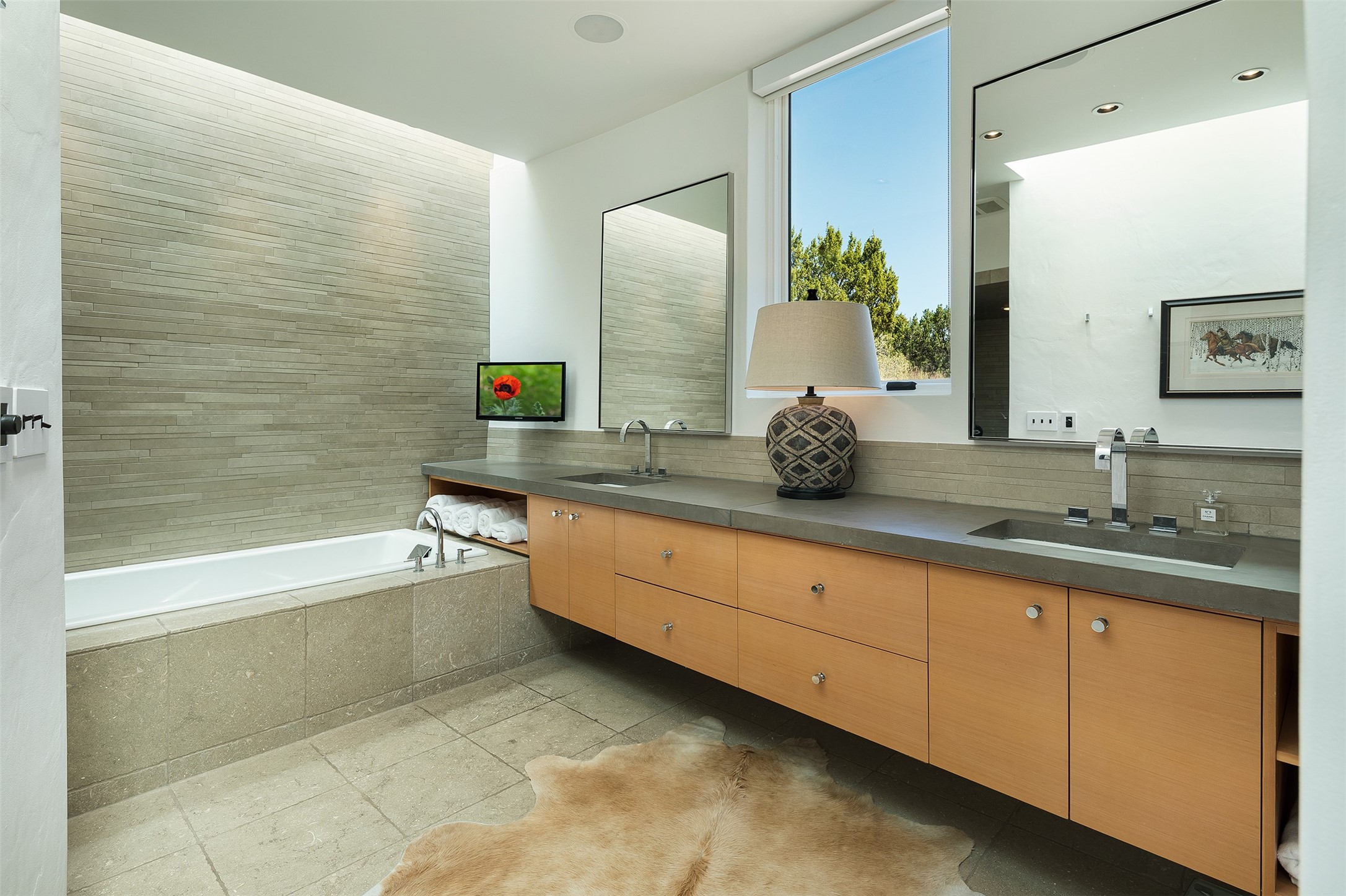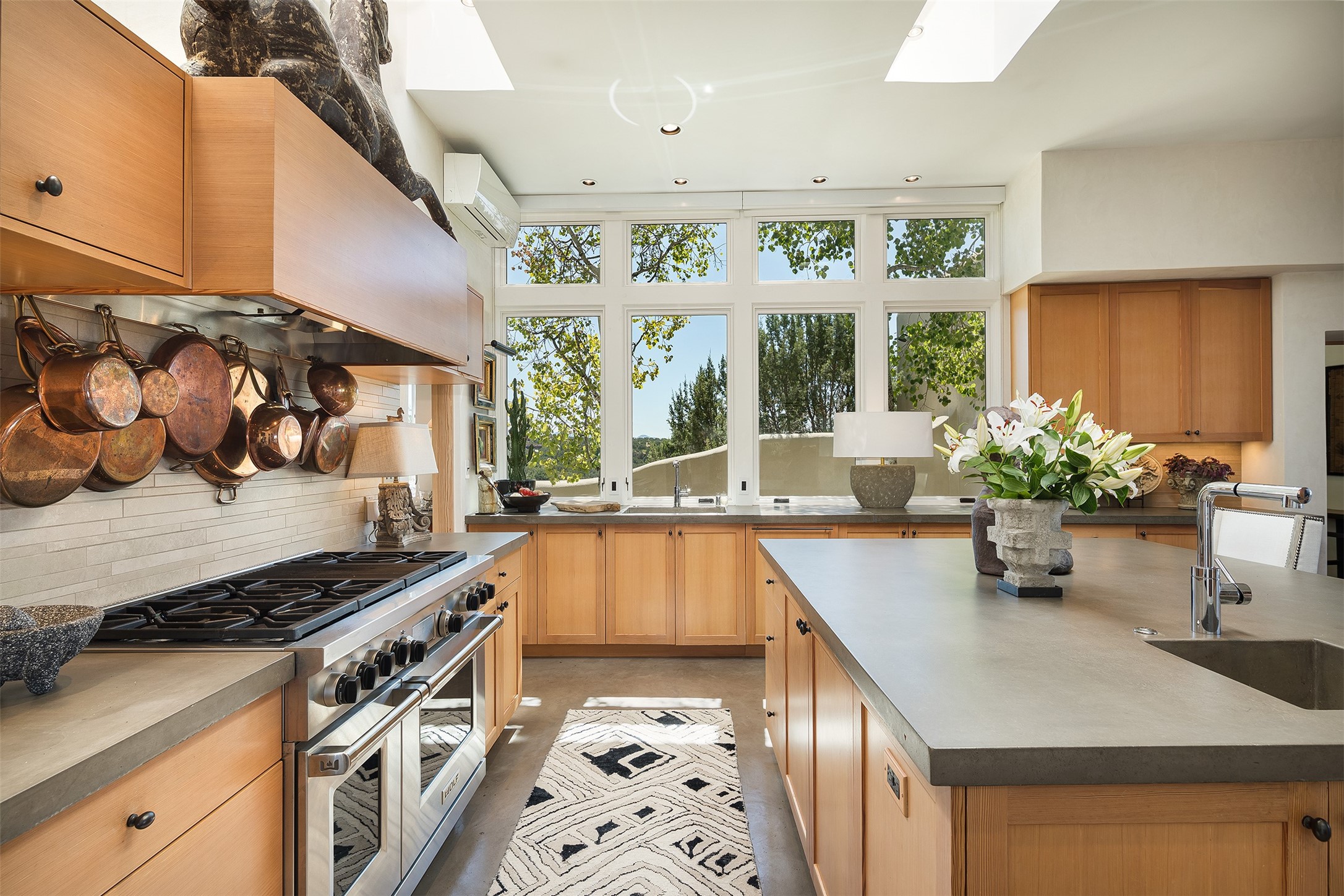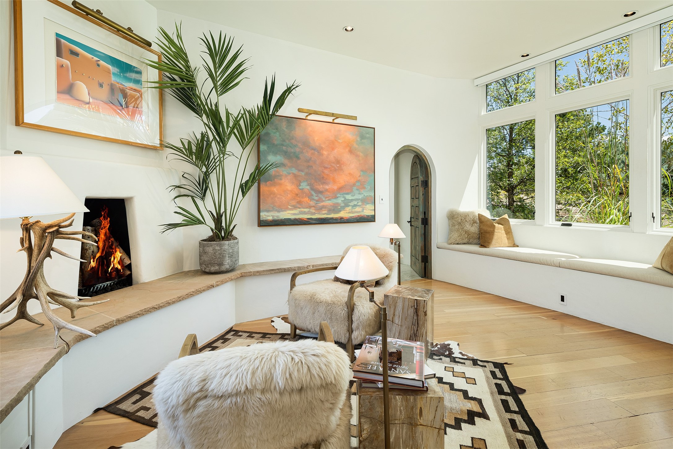 One of the most extraordinary homes in all of Santa Fe, this captivating residence by the award-winning builder, Tierra Concepts, stuns with contemporary architecture, majestic, expansive mountain, golf course and sunset views. Perched on an elevated double lot, with unmatched privacy on 4.5 acres, overlooking the Jack Nicklaus designed Sunrise Golf Course, within the famed community of Las Campanas and the coveted Wildhorse Estates, this exquisite home exemplifies the unique blend of modern design with the warmth of New Mexican accents. Defining features begin with the long, private, concrete driveway, entering the custom carved courtyard doors and vibrant landscape. This tranquil retreat offers 3 bedrooms, 4 baths, plus a media room/office with portal access. The 55' great room excites with surround mountain views, high ceilings, vast walls for art, clerestory windows, 9 double atrium glass doors which lead to the dual outdoor portals. The well-appointed kitchen with fireplace impresses with a large island and seating, walk-in pantry, dual sinks, and Wolf, Viking, Sub-Zero, Bosch, and Miele appliances, all of which opens to a breakfast dining area, casual sitting room, outdoor built-in BBQ and dining area. Off the kitchen is a wine bar and formal dining room with a 350-bottle glassed wine wall and fireplace. Luxurious owner's suite with a sitting area, fireplace, spa-like bath, floating vanity, dual sinks, soaking tub, steam shower and walk-in closet. Two spacious ensuite bedrooms with views, built-in desks, and fireplaces. Seamless outdoor living experience is enhanced with 2 generous, private, walled courtyards with deep portals, 2 fireplaces and RH Design outdoor furnishings. Highlights include soft, natural light, with 7 fireplaces, 14 recessed skylights, 6 imported double antique doors, and creamy white plaster walls. Substantially furnished by RH Design, inside and out. Featured in an 8-page spread in Western Art Collector Magazine and Su Casa Magazine.