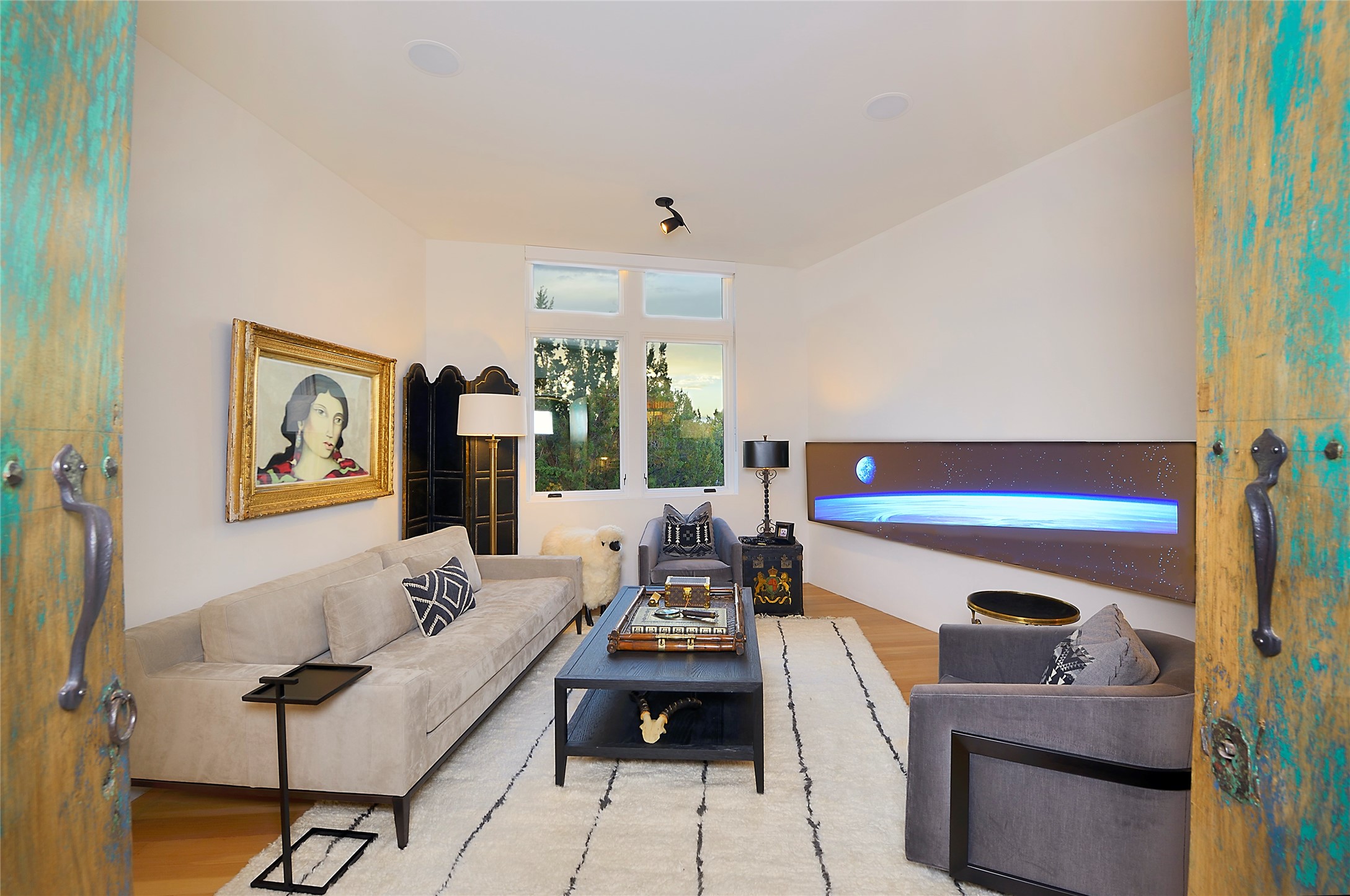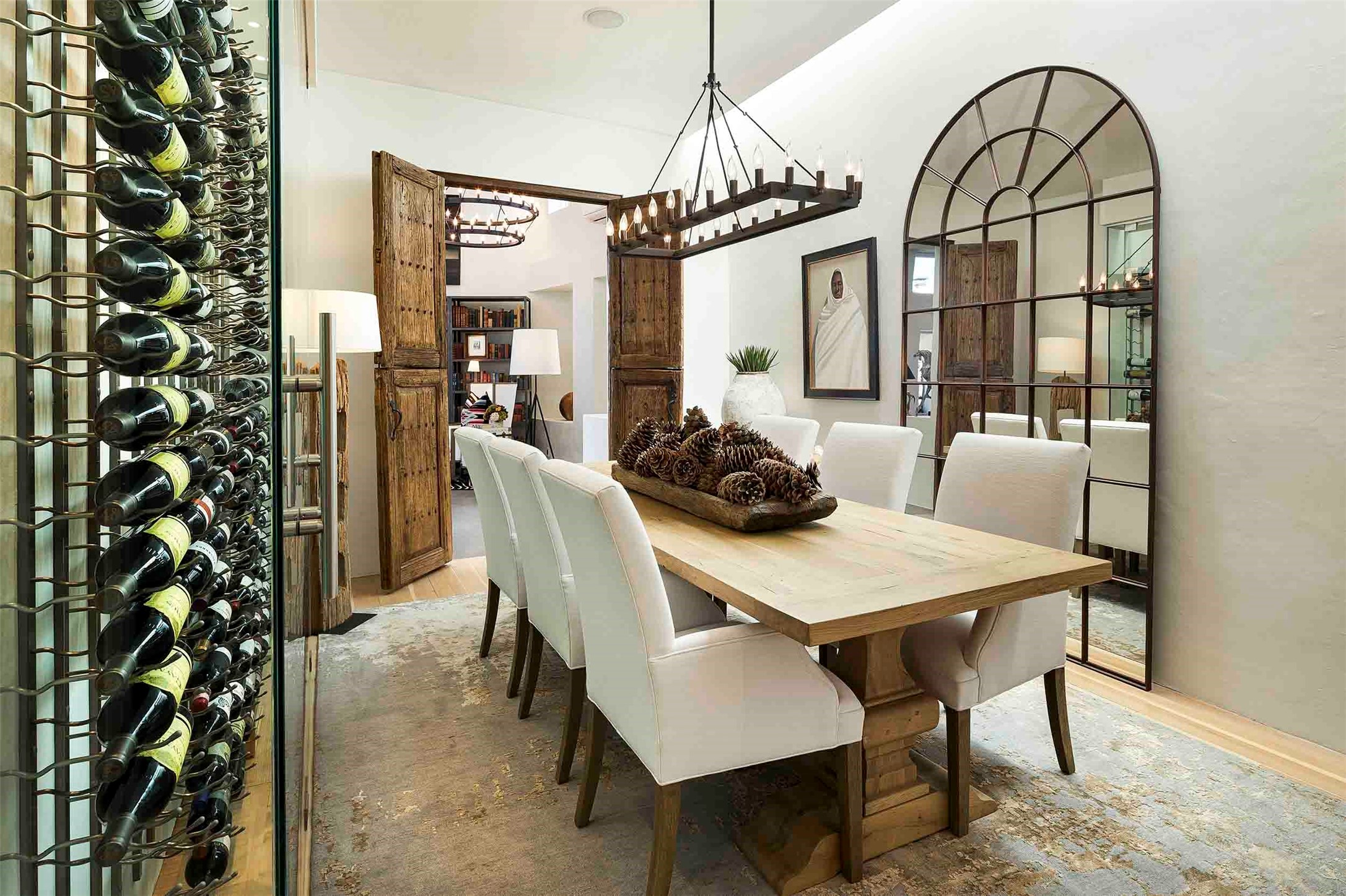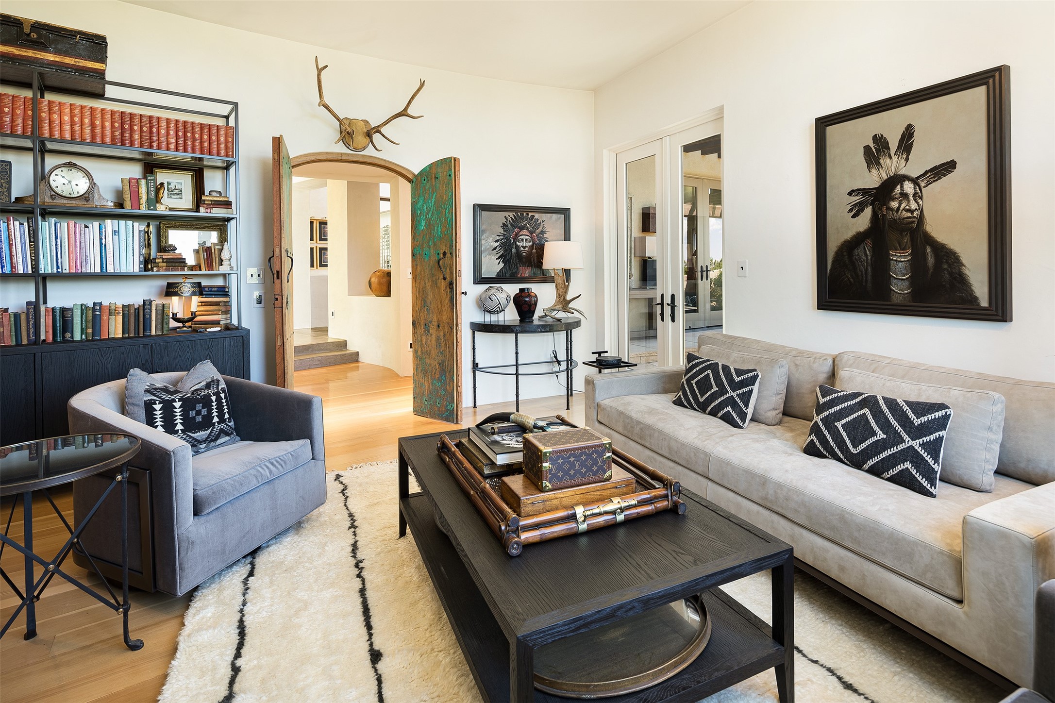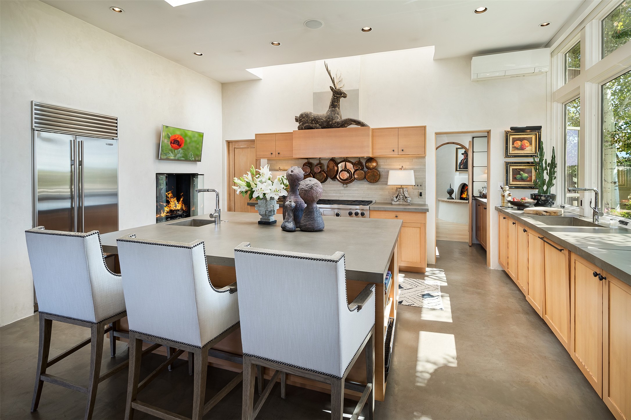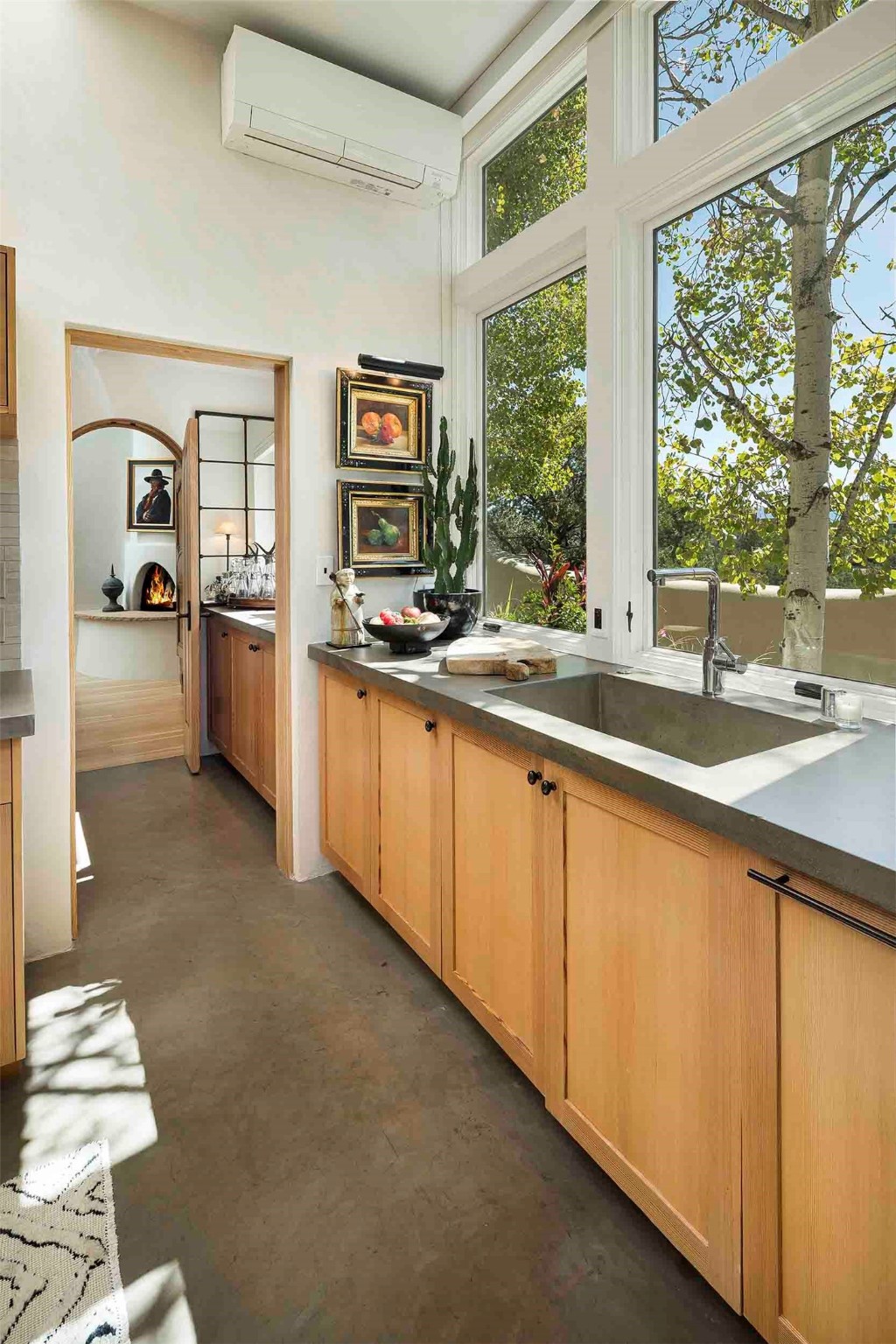 One of the most extraordinary homes in all of Santa Fe, this captivating residence by the award-winning builder, Tierra Concepts, stuns with contemporary architecture, majestic, expansive mountain, golf course and sunset views. Perched on an elevated double lot, with unmatched privacy on 4.5 acres, overlooking the Jack Nicklaus designed Sunrise Golf Course, within the famed community of Las Campanas and the coveted Wildhorse Estates, this exquisite home exemplifies the unique blend of modern design with the warmth of New Mexican accents. Defining features begin with the long, private, concrete driveway, entering the custom carved courtyard doors and vibrant landscape. This tranquil retreat offers 3 bedrooms, 4 baths, plus a media room/office with portal access. The 55' great room excites with surround mountain views, high ceilings, vast walls for art, clerestory windows, 9 double atrium glass doors which lead to the dual outdoor portals. The well-appointed kitchen with fireplace impresses with a large island and seating, walk-in pantry, dual sinks, and Wolf, Viking, Sub-Zero, Bosch, and Miele appliances, all of which opens to a breakfast dining area, casual sitting room, outdoor built-in BBQ and dining area. Off the kitchen is a wine bar and formal dining room with a 350-bottle glassed wine wall and fireplace. Luxurious owner's suite with a sitting area, fireplace, spa-like bath, floating vanity, dual sinks, soaking tub, steam shower and walk-in closet. Two spacious ensuite bedrooms with views, built-in desks, and fireplaces. Seamless outdoor living experience is enhanced with 2 generous, private, walled courtyards with deep portals, 2 fireplaces and RH Design outdoor furnishings. Highlights include soft, natural light, with 7 fireplaces, 14 recessed skylights, 6 imported double antique doors, and creamy white plaster walls. Substantially furnished by RH Design, inside and out. Featured in an 8-page spread in Western Art Collector Magazine and Su Casa Magazine.
