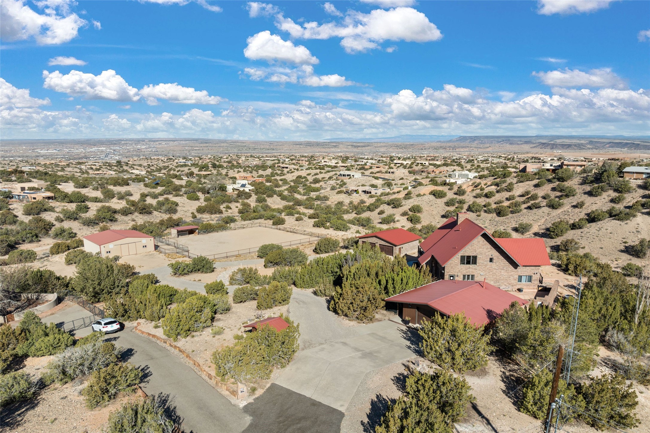 Fabulous family compound and horse property! 4.98 acres of space, views, and a lifestyle that invites multi family living, excellent horse facilities, two separate garages, one with heat/cool, room for lift, other with heat/cool plus bathroom. Must see this well maintained Northern NM brick beauty. Main house 3952 sf plus the 1 BR connected guest house is 1304 sf., total heated is 5256 sf. Main level of home features a living room, formal dining, on suite BR, spacious kitchen, nook for informal dining, half bath, and over 1300sf of open trex deck! Upstairs features primary suite, 3rd BR, loft which is open to main level. Lower level offers family room, 4th BR or office, bath, laundry and a 1304 sf attached 1 BR guest house included in the 5256 sf w/full kitchen, living, plus a 18 X 22 BR w/washer dryer hook ups, and separate entry also. Refrigerated Air, CFA, HWB, mini splits. Well designed barn 4 stall barn, center isle, hay storage, tack, steel lined, runs off 3 stalls, opens to an arena w/shelter. Easy access to National Forest trails.