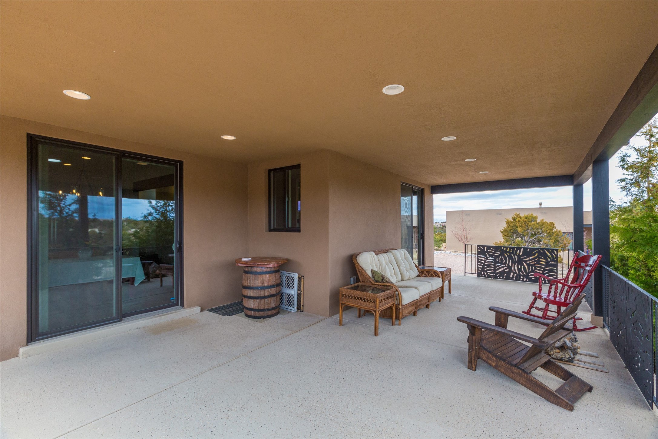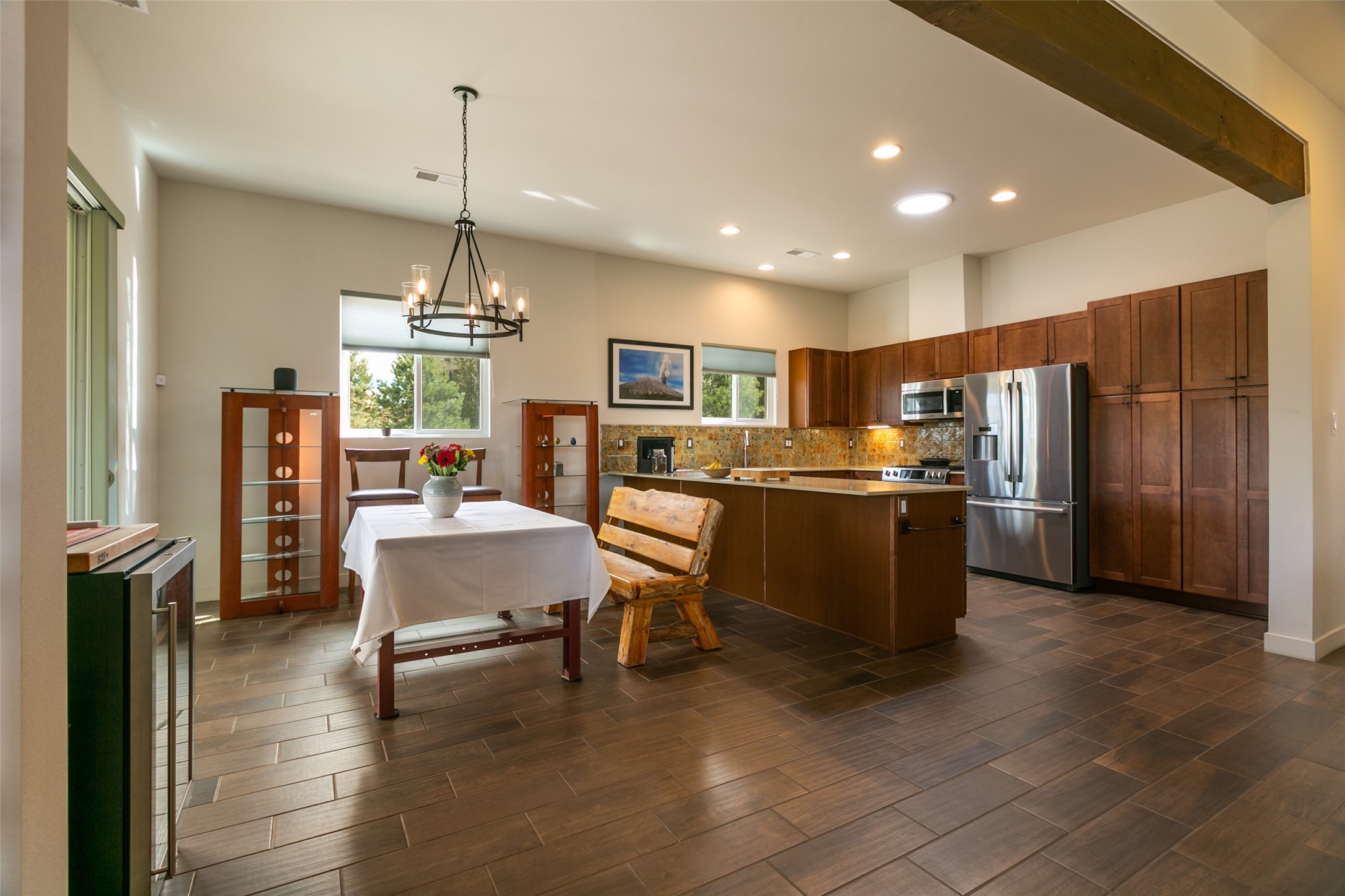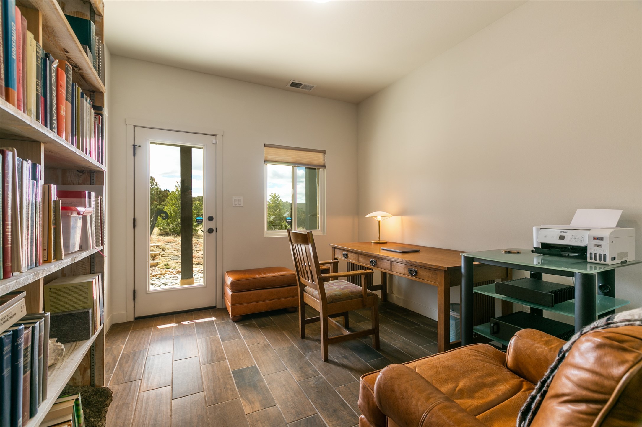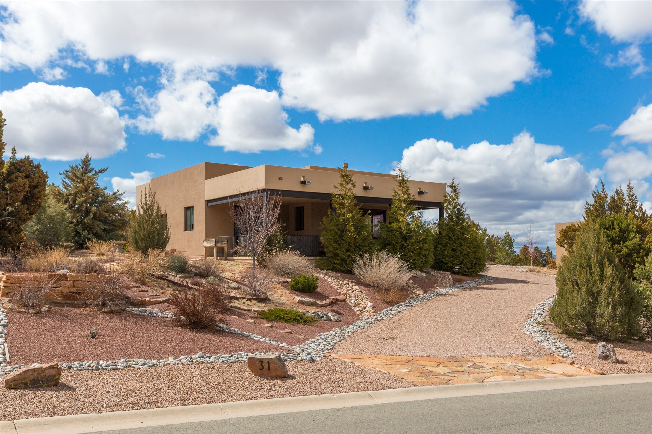 This immaculately maintained home, built in 2019, offers beautiful finishes and meticulous native landscaping. The home boasts an open floorplan with light comfortable living spaces, perfect for entertaining. Granite countertops, beautiful baths, and all tile floors ensure an harmonious environment. A large and lovely portal offers stunning panoramic views of the Sangre de Cristo and a generous outdoor living space. The location is semi-rural and yet convenient to town. The neighborhood incudes common areas and many trails to explore just beyond your front door. Enjoy gracious living, privacy, quiet, and dark night skies in your new home.