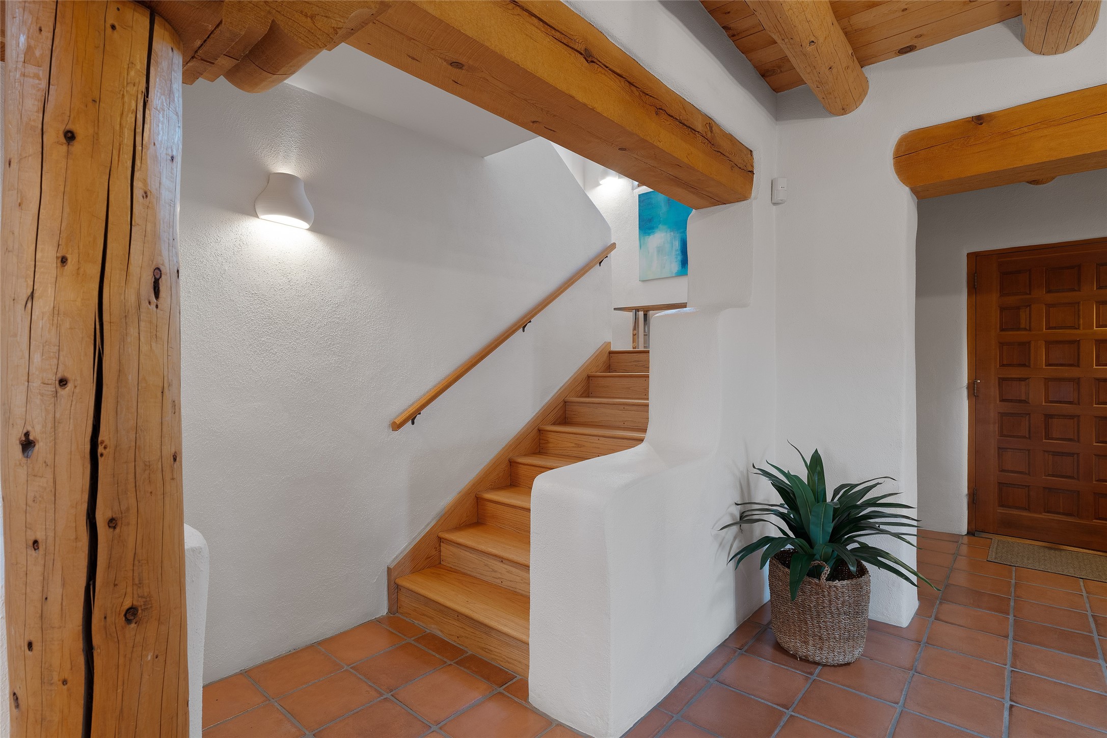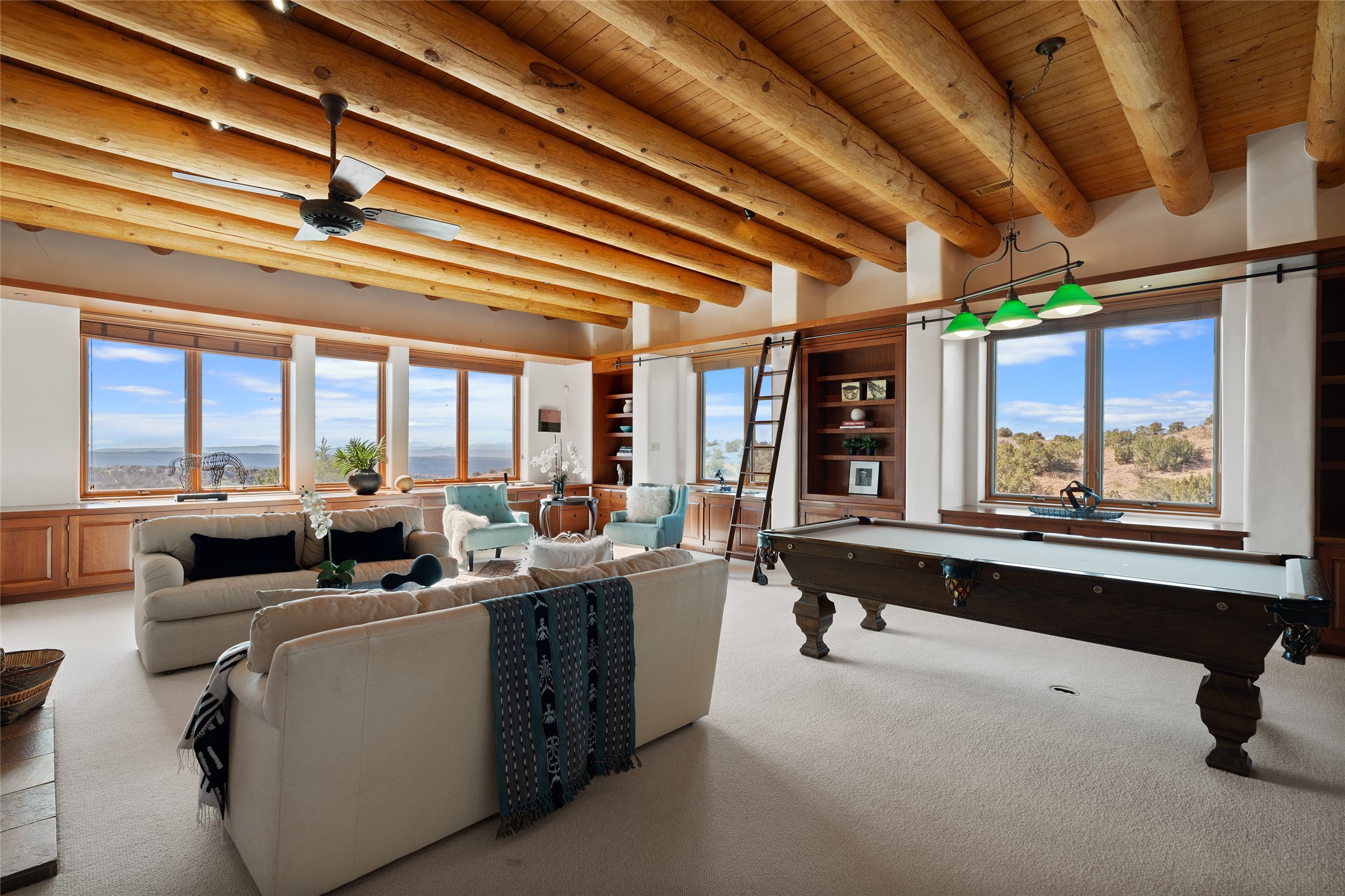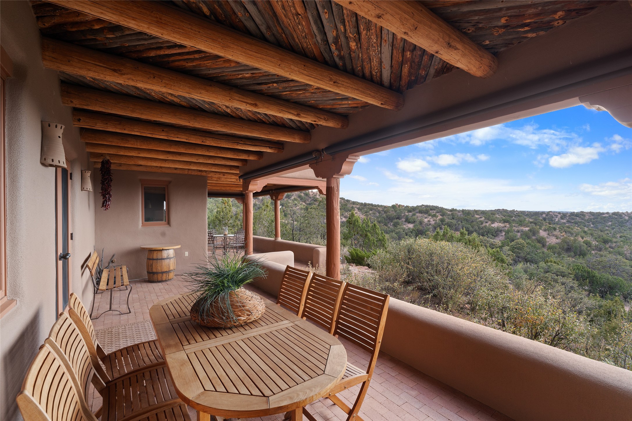 She said, " I want a gorgeous big house with room for all our family, with spaces for various activities, totally private on some land with fabulous views, and only about 15 minutes to the plaza." He replied, "Then let's live on Love Street, Camino Amor." Impressive construction, beautiful finishes, and thoughtful features for happy, comfortable living in beauty. Located in prestigious, Los Caminitos. A classic Santa Fe Style Hacienda sits atop a glorious ridgeline on 27 lush, private acres surrounded by luxurious green hills with views that go on forever and ever. Private. This is easy living, stylishly, with easy entertaining flowing through spacious rooms with high finished ceilings and all of the Santa Fe touches; vigas, corbels, lintels, nichos and bancos that enhance this happy ambience. 5 bedrooms suites a 6th powder room with a nice separation of spaces comfortably accommodate all your family and friends! Otherwise, most of your living is on the main floor! It is silent here...You can hear the cicadas and the bluebirds, and see millions of stars at night in the dark sky sitting on stone bancos around the stunning firepit. You can be alone with the universe here. This impeccably maintained home is move-in ready now as it is, or you could take it to the next level and create a showplace. As an owner in this lovely gated community of Los Caminitos, you will be a member of the private Los Caminitos Clubouse with pool, tennis, pickleball, barbecue facilities and private party house for members use. (Los Caminitos.com, for complete HOA information), A stones throw to the elegant Four Seasons Encantado Resort, and about 12 minutes to the plaza, you are sure to come back home to peace, serenity, and love here on Camino Amor.