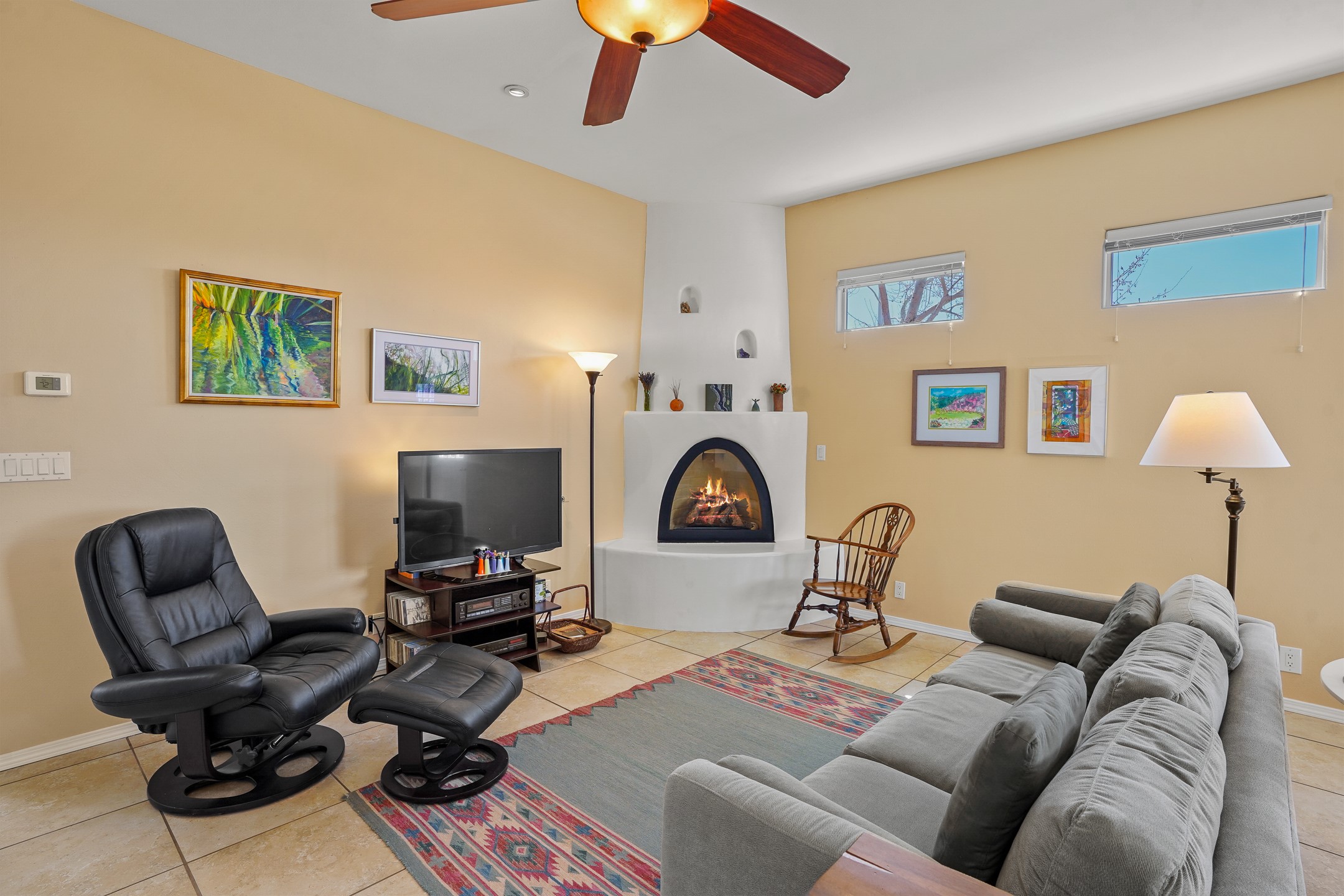 This charming home offers an abundance of natural light, with five skylights thoughtfully placed throughout the space--two in the hallway, one in each bathroom, and another in the direct entry garage. The former owner, a passionate artist, used the garage as a painting studio, which benefits from this incredible light. Enjoy stunning views of the expansive Arroyo de los Chamisos, perfect for soaking in breathtaking sunsets.For energy efficiency, solar panels keep your electric costs low. The home has been lovingly maintained, with both the roof and stucco remaining under a transferrable warranty for added peace of mind. Plus, there's wiring already in place for a hot tub on the patio, just waiting for your relaxation!You'll also appreciate the friendly neighborhood community, with dog walkers and hikers often seen enjoying the scenic arroyo trails. The current owner has also cultivated a beautiful stretch of NM sunflowers, which are set to bloom along the arroyo retaining wall. Simply use the drip/sprinkler hose in place, and you can continue this lovely annual tradition!This home truly offers the perfect blend of comfort, beauty, and efficiency, all in a peaceful, welcoming environment.