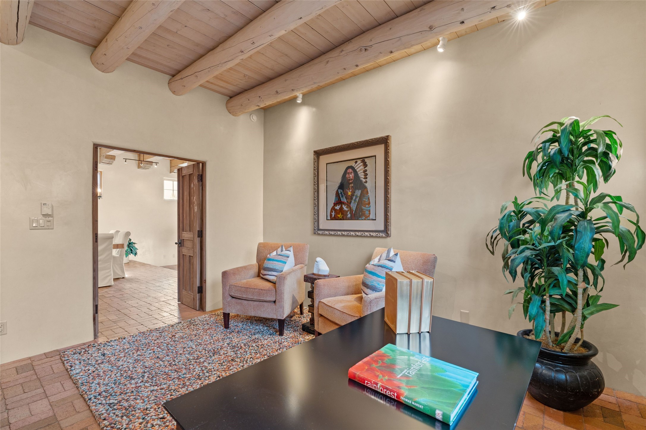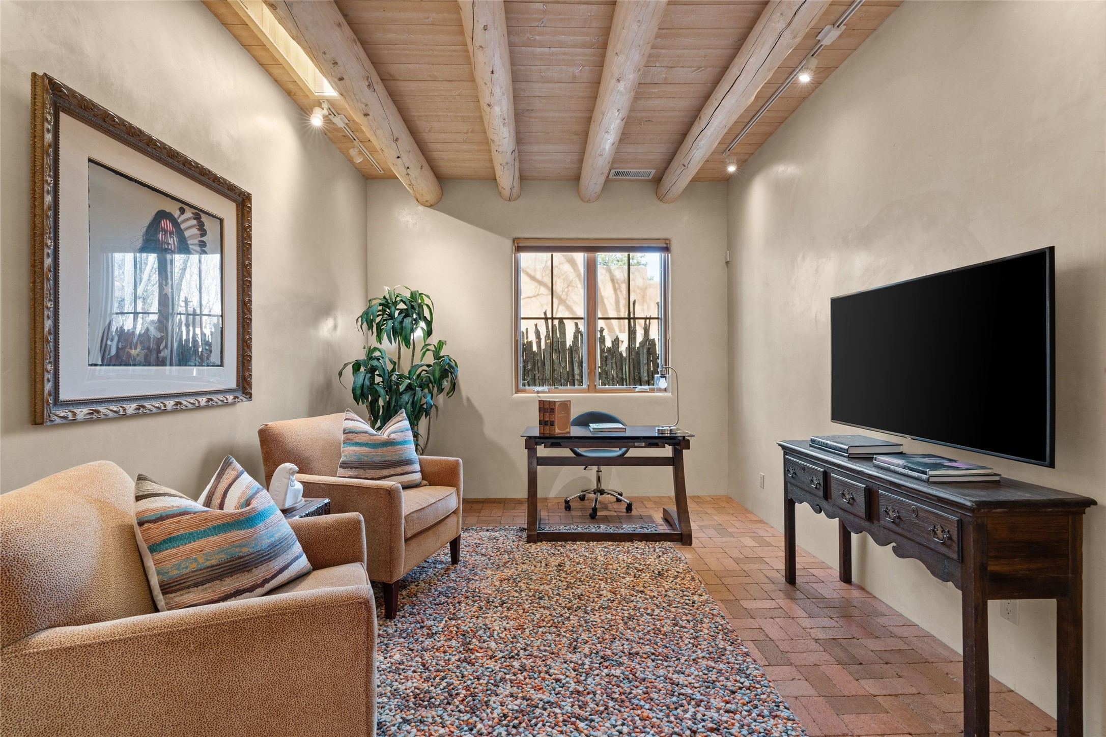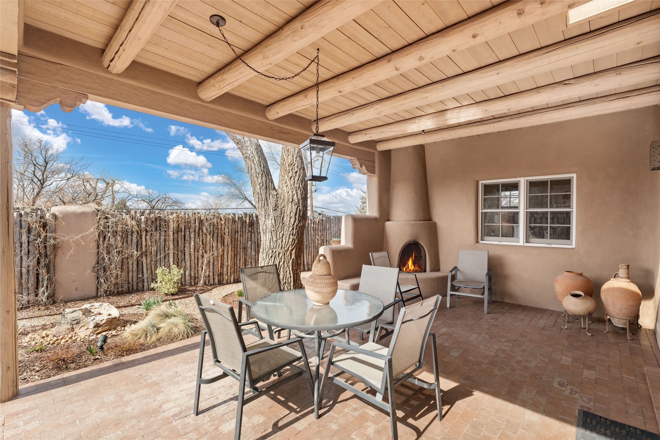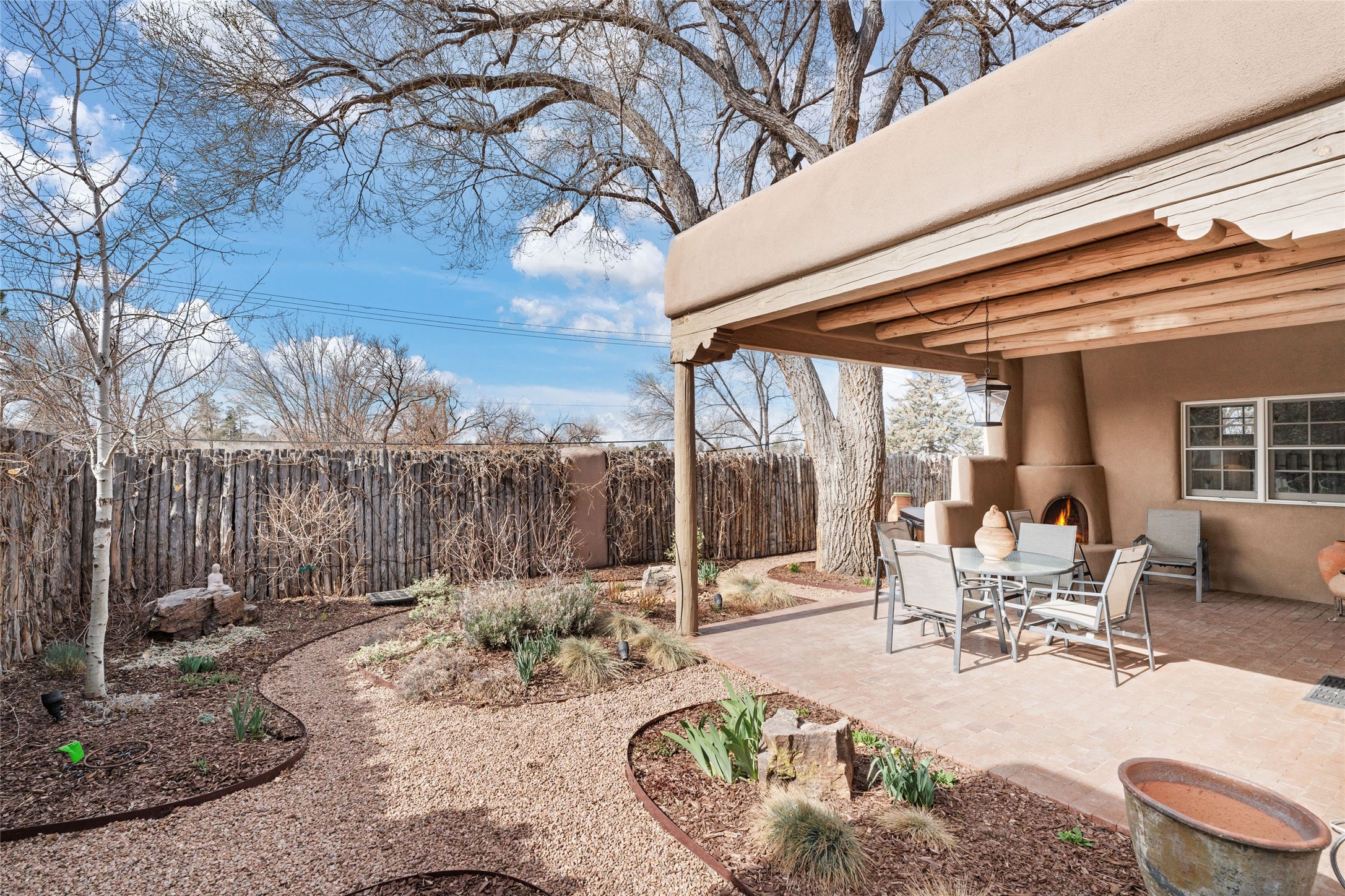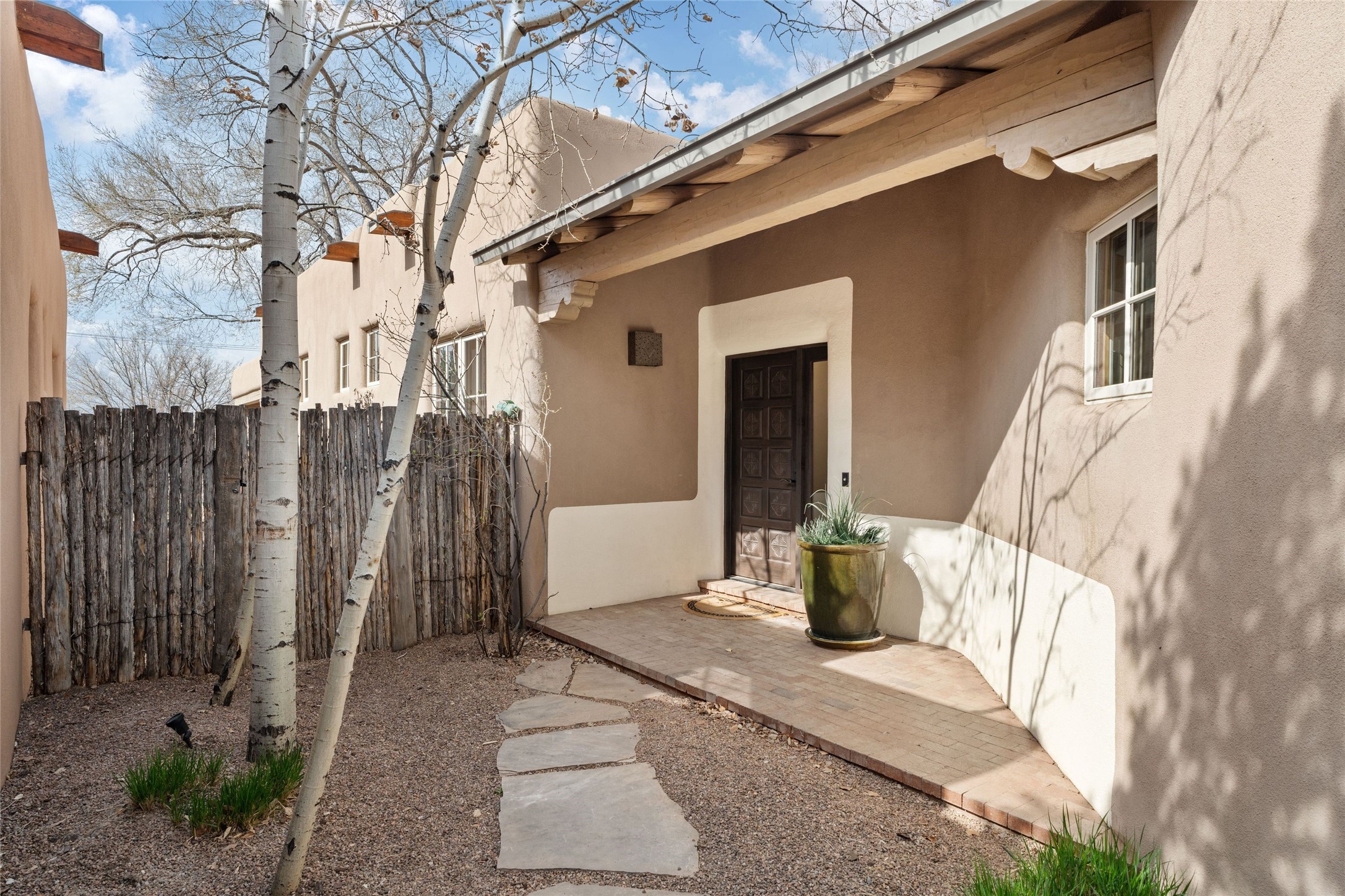 729 E Palace Unit C is a sweet, lock and leave, three-bedroom home in the heart of downtown. Located in La Reina Compound, a private five-unit gated community on East Palace Avenue in the Historic Eastside, this freestanding Pueblo-style condo lives like a single family home and offers a blend of elegance and convenience. The home features three bedrooms and three baths, with high-end finishes and top-tier appliances throughout. The open-concept living, dining, and kitchen area is designed for both comfort and style, with high beamed ceilings and brick floors adding warmth and character. A slight level change between the dining and living areas is marked by just two easy steps, maintaining the home's seamless flow. A deep portal with a fireplace flows into a private courtyard, making an inviting outdoor space that's complemented by a private hot tub--perfect for relaxing under the Santa Fe sky. Rare for the Eastside, this home also includes a two-car garage. This property represents great value for someone looking to secure a comfortable and low maintenance home in a quintessential Santa Fe neighborhood close to the Santa Fe River, Plaza and famous Canyon Road.