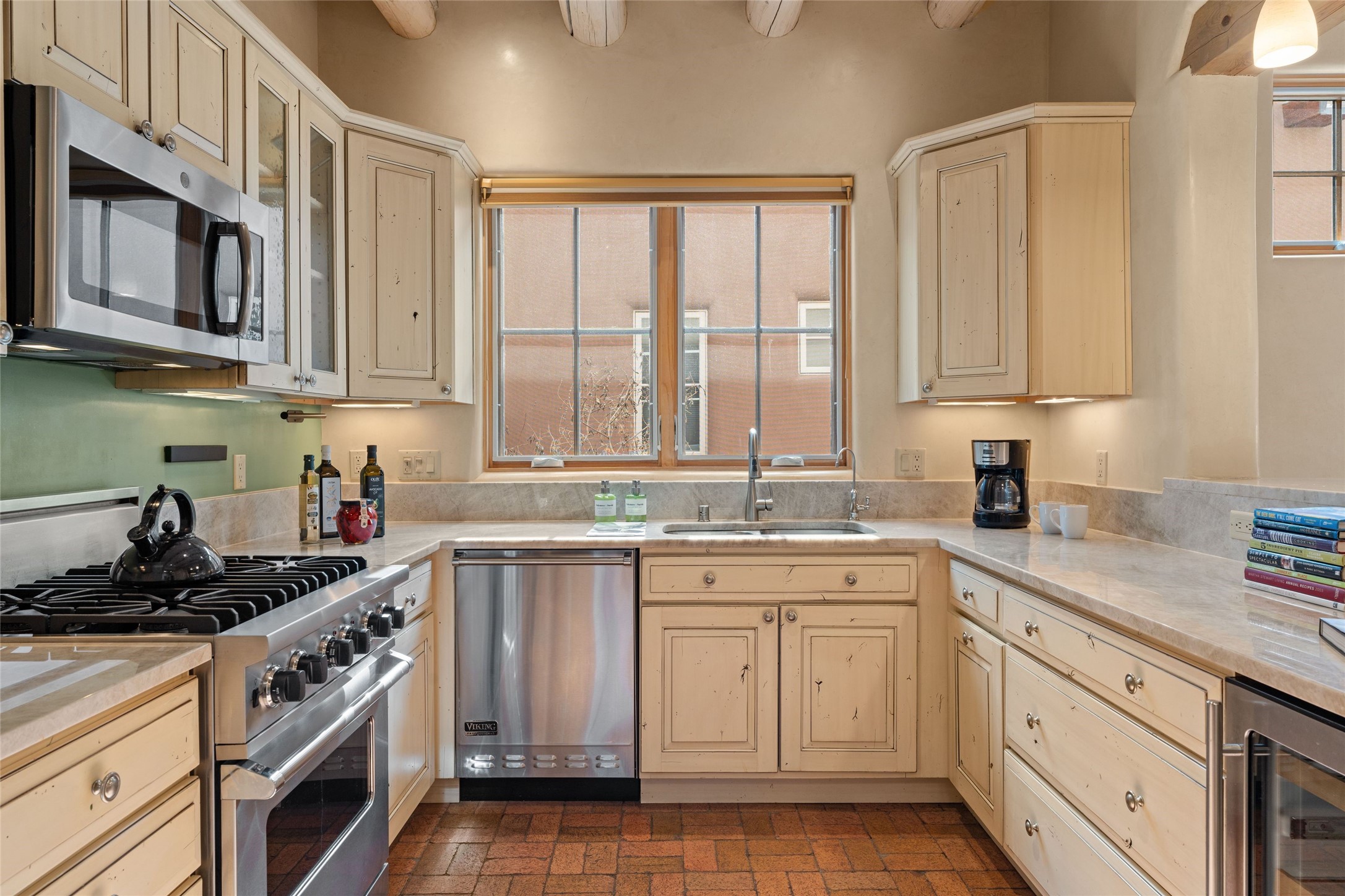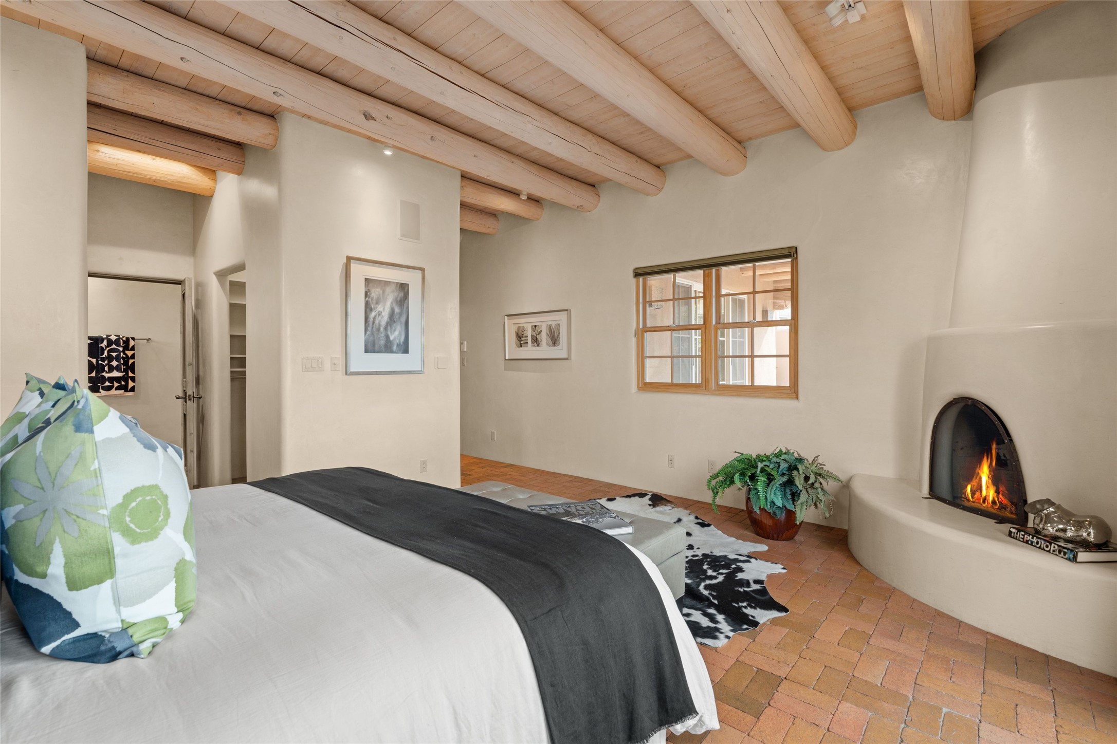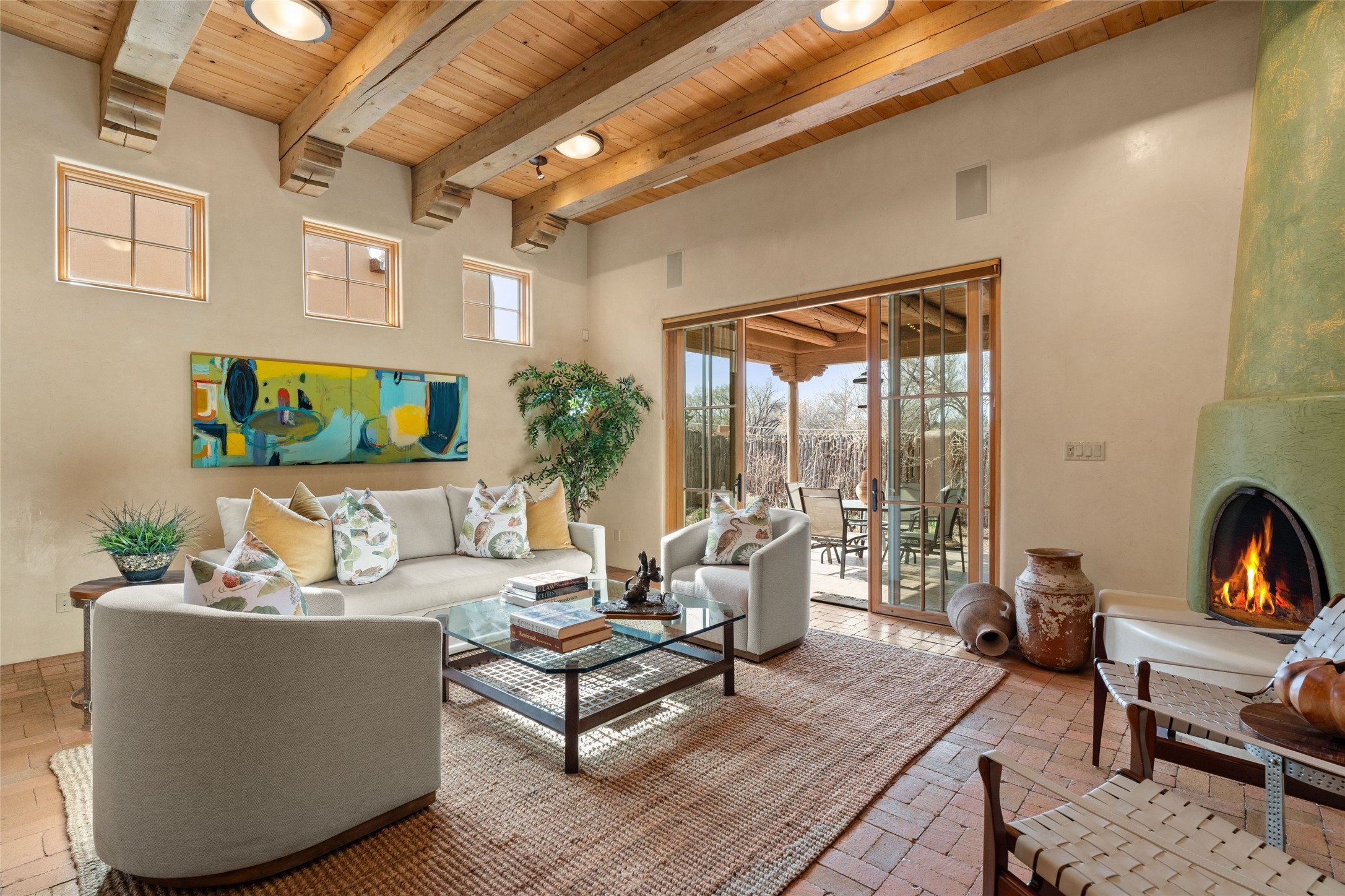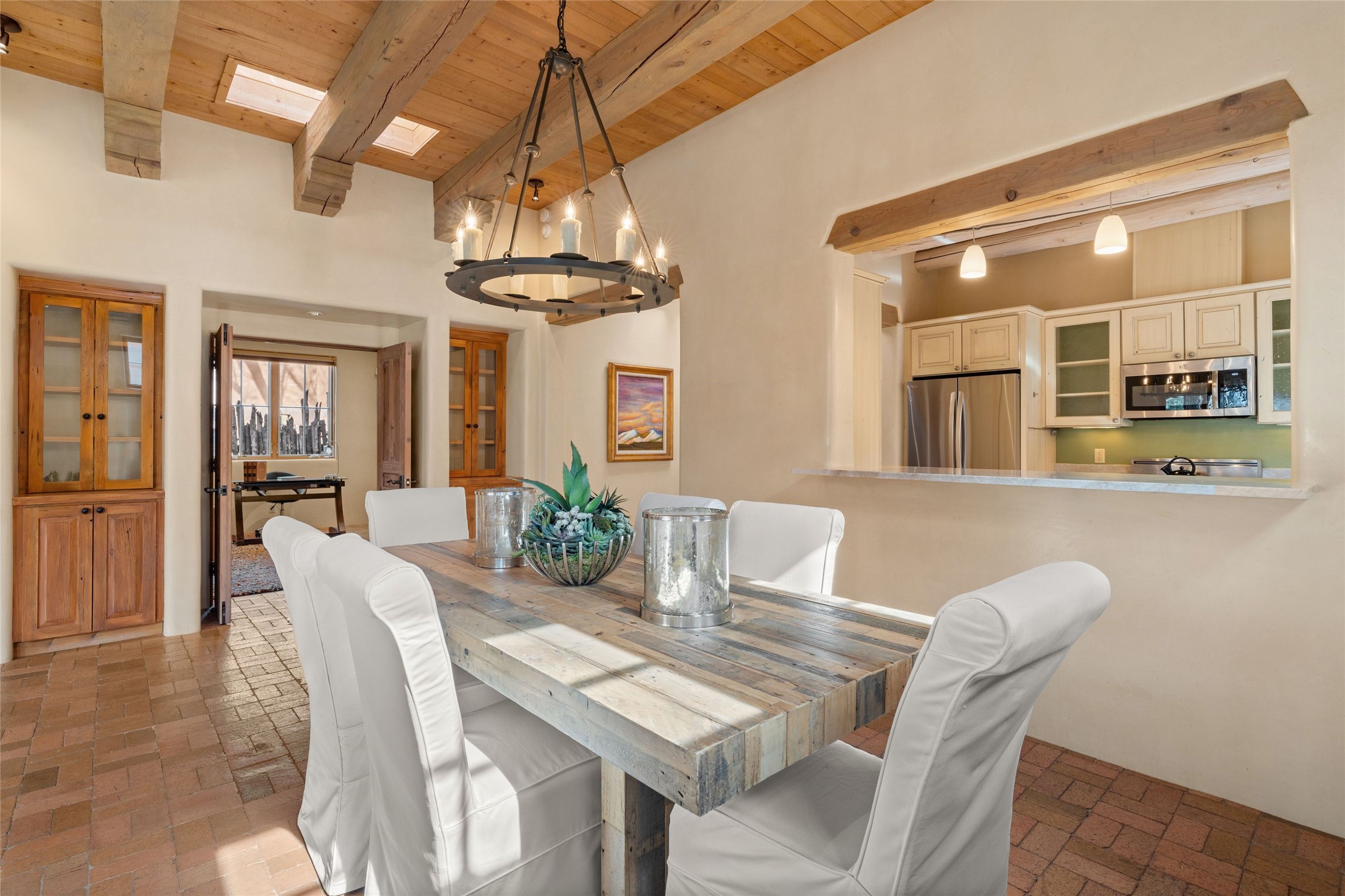 729 E Palace Unit C is a sweet, lock and leave, three-bedroom home in the heart of downtown. Located in La Reina Compound, a private five-unit gated community on East Palace Avenue in the Historic Eastside, this freestanding Pueblo-style condo lives like a single family home and offers a blend of elegance and convenience. The home features three bedrooms and three baths, with high-end finishes and top-tier appliances throughout. The open-concept living, dining, and kitchen area is designed for both comfort and style, with high beamed ceilings and brick floors adding warmth and character. A slight level change between the dining and living areas is marked by just two easy steps, maintaining the home's seamless flow. A deep portal with a fireplace flows into a private courtyard, making an inviting outdoor space that's complemented by a private hot tub--perfect for relaxing under the Santa Fe sky. Rare for the Eastside, this home also includes a two-car garage. This property represents great value for someone looking to secure a comfortable and low maintenance home in a quintessential Santa Fe neighborhood close to the Santa Fe River, Plaza and famous Canyon Road.