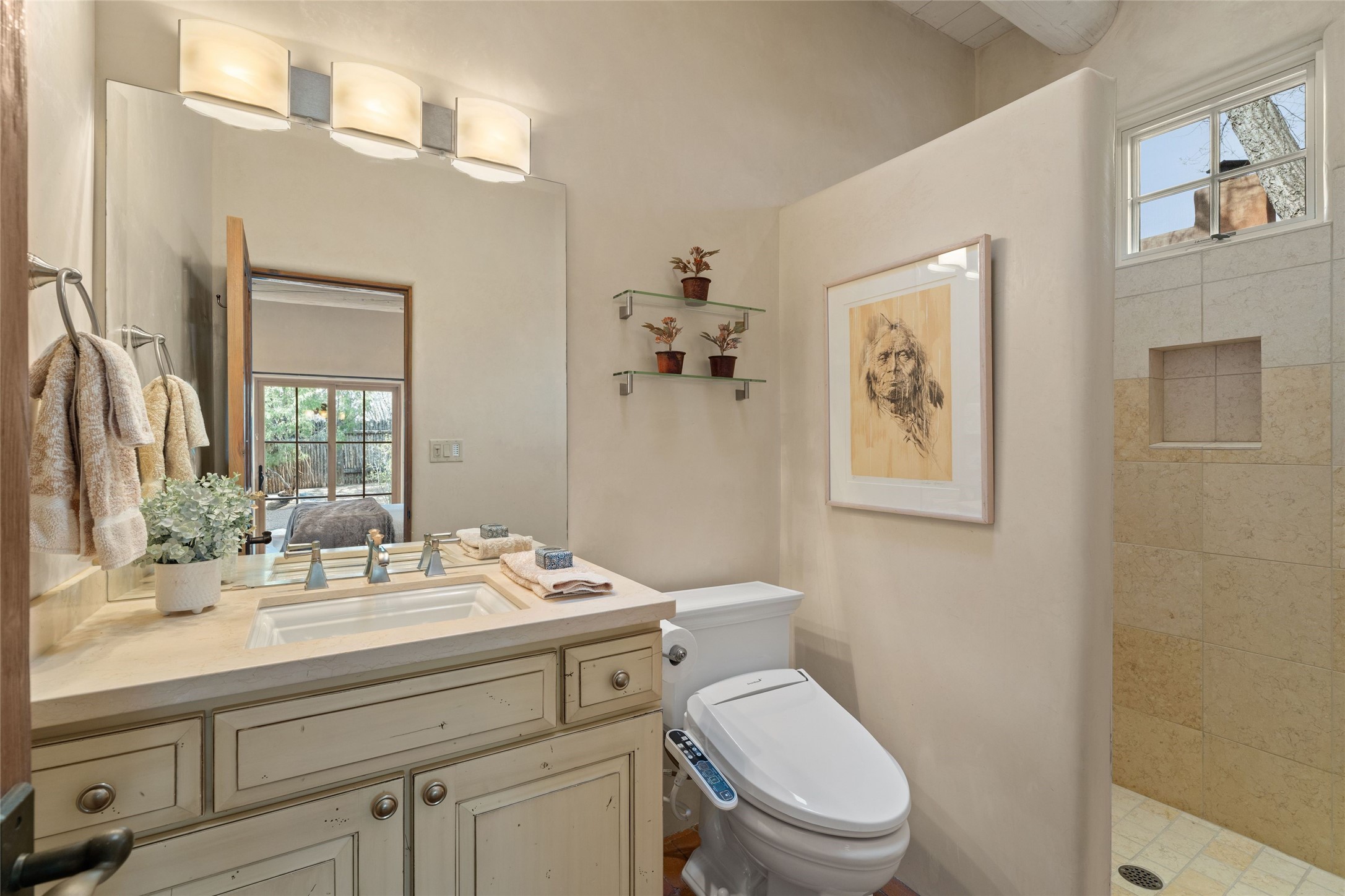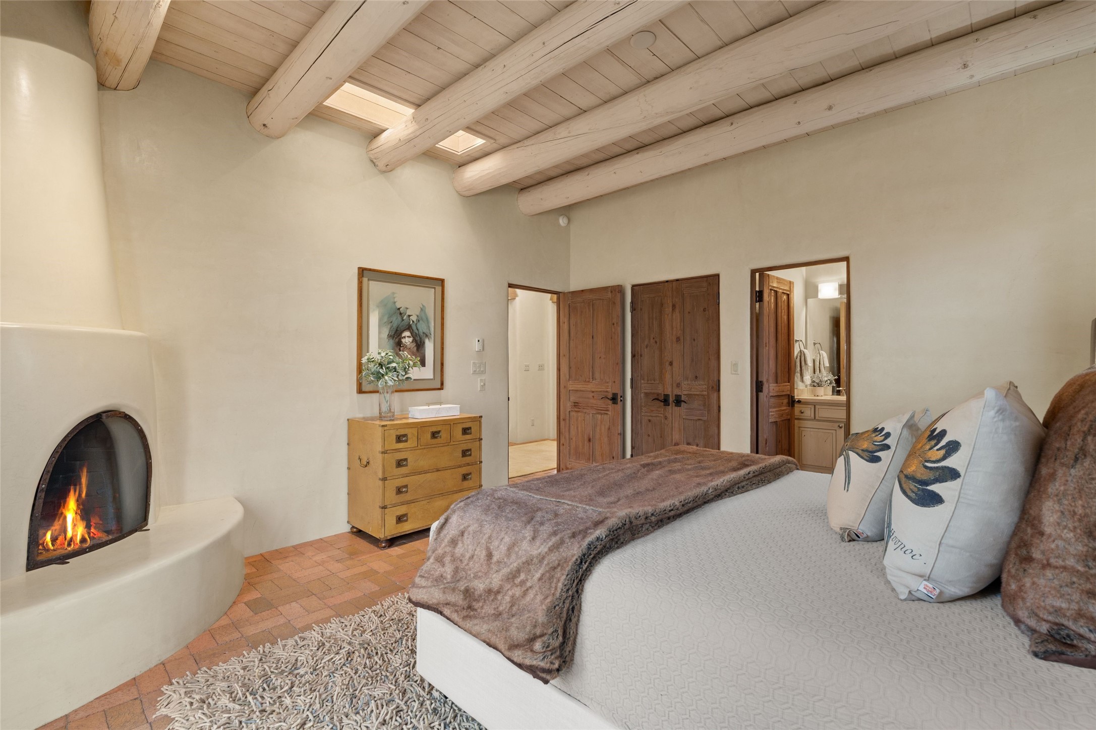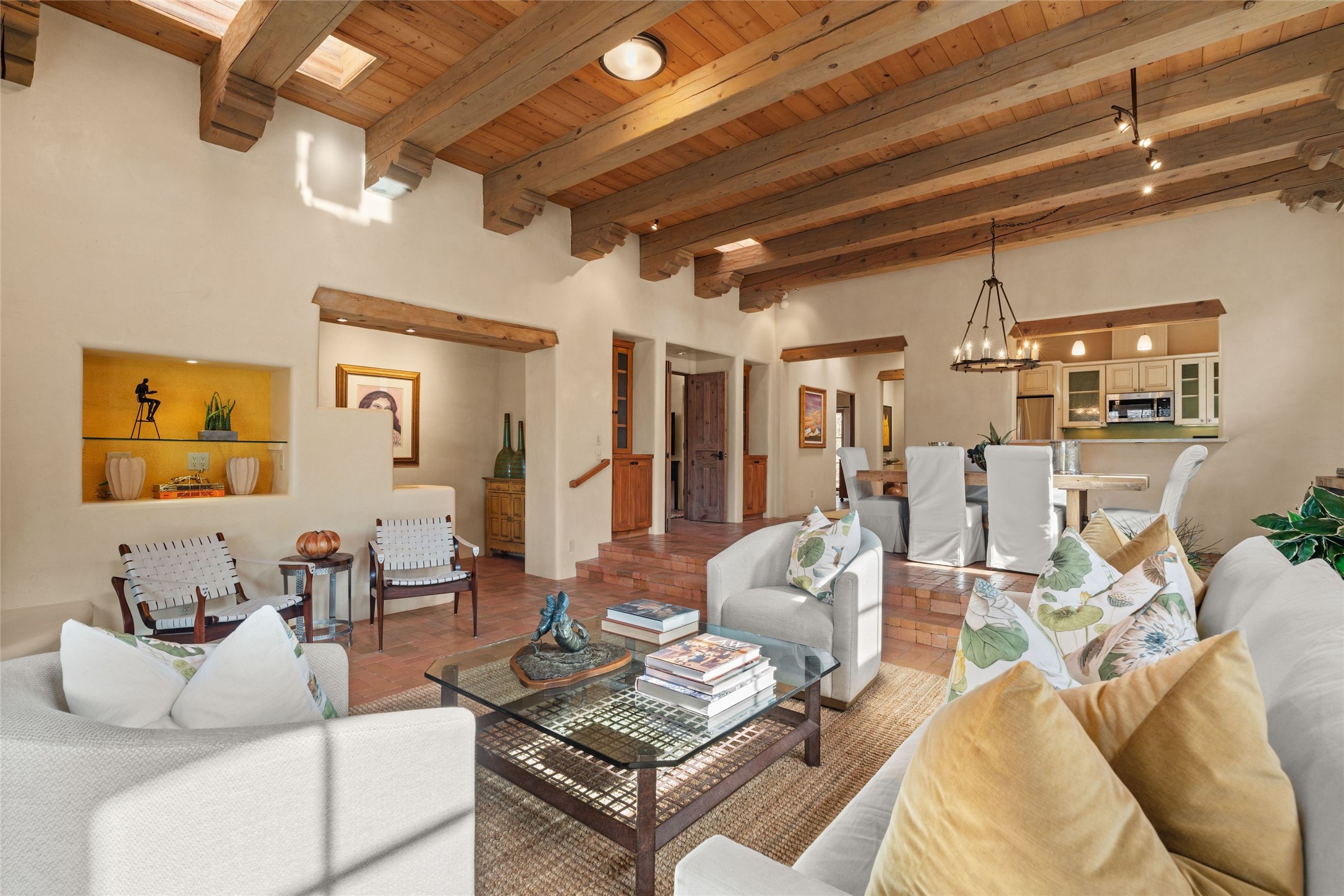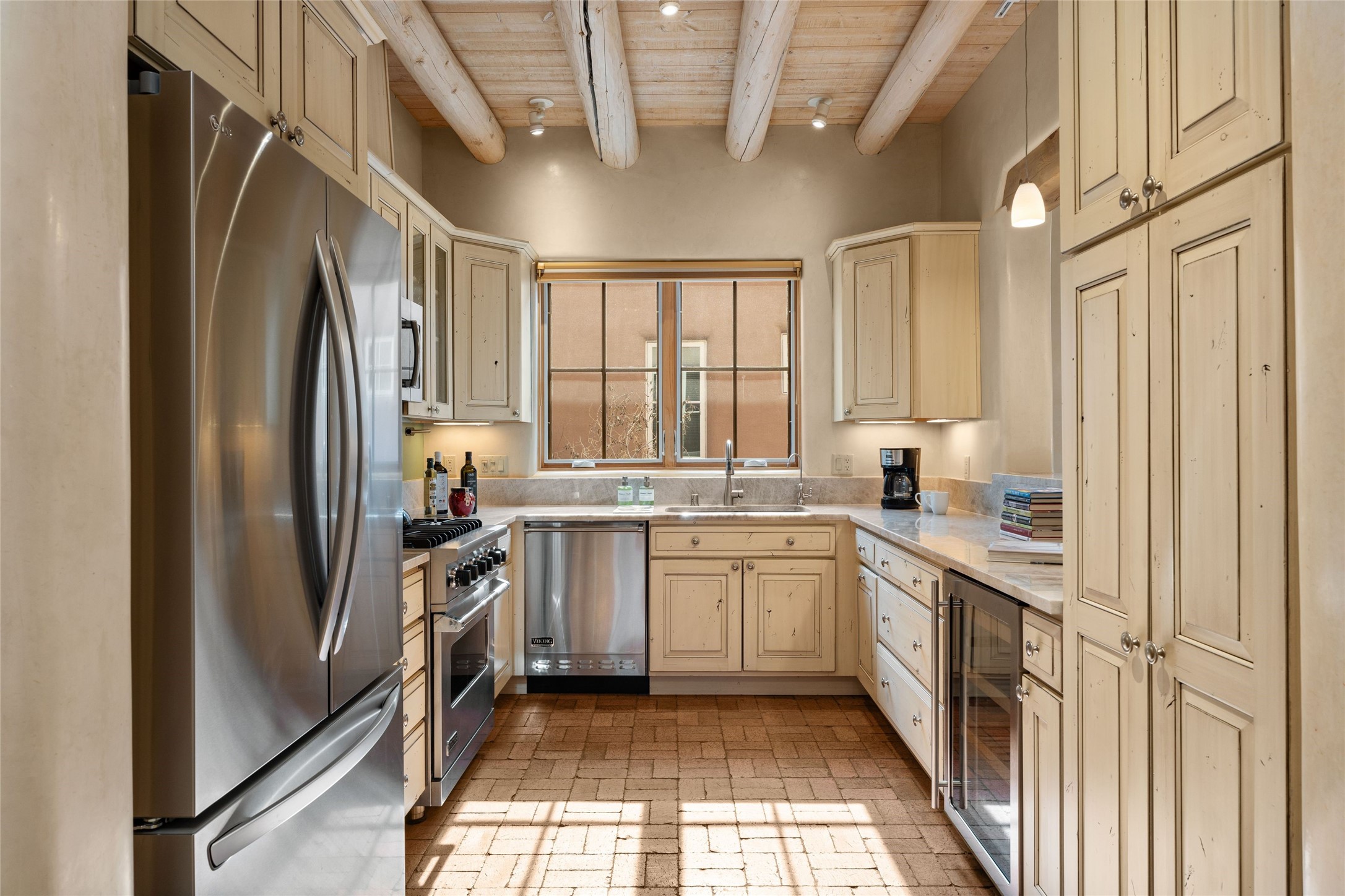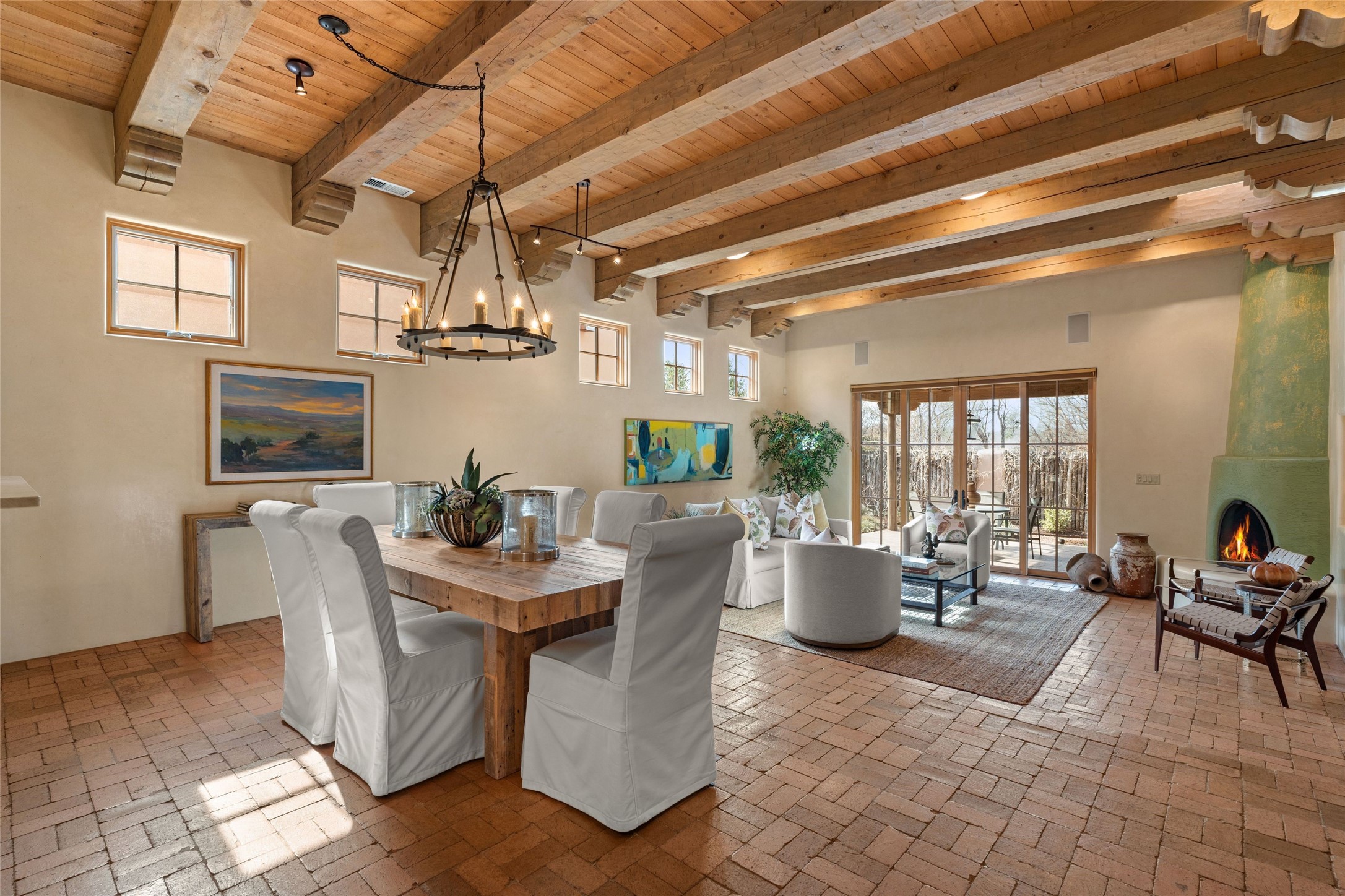 729 E Palace Unit C is a sweet, lock and leave, three-bedroom home in the heart of downtown. Located in La Reina Compound, a private five-unit gated community on East Palace Avenue in the Historic Eastside, this freestanding Pueblo-style condo lives like a single family home and offers a blend of elegance and convenience. The home features three bedrooms and three baths, with high-end finishes and top-tier appliances throughout. The open-concept living, dining, and kitchen area is designed for both comfort and style, with high beamed ceilings and brick floors adding warmth and character. A slight level change between the dining and living areas is marked by just two easy steps, maintaining the home's seamless flow. A deep portal with a fireplace flows into a private courtyard, making an inviting outdoor space that's complemented by a private hot tub--perfect for relaxing under the Santa Fe sky. Rare for the Eastside, this home also includes a two-car garage. This property represents great value for someone looking to secure a comfortable and low maintenance home in a quintessential Santa Fe neighborhood close to the Santa Fe River, Plaza and famous Canyon Road.