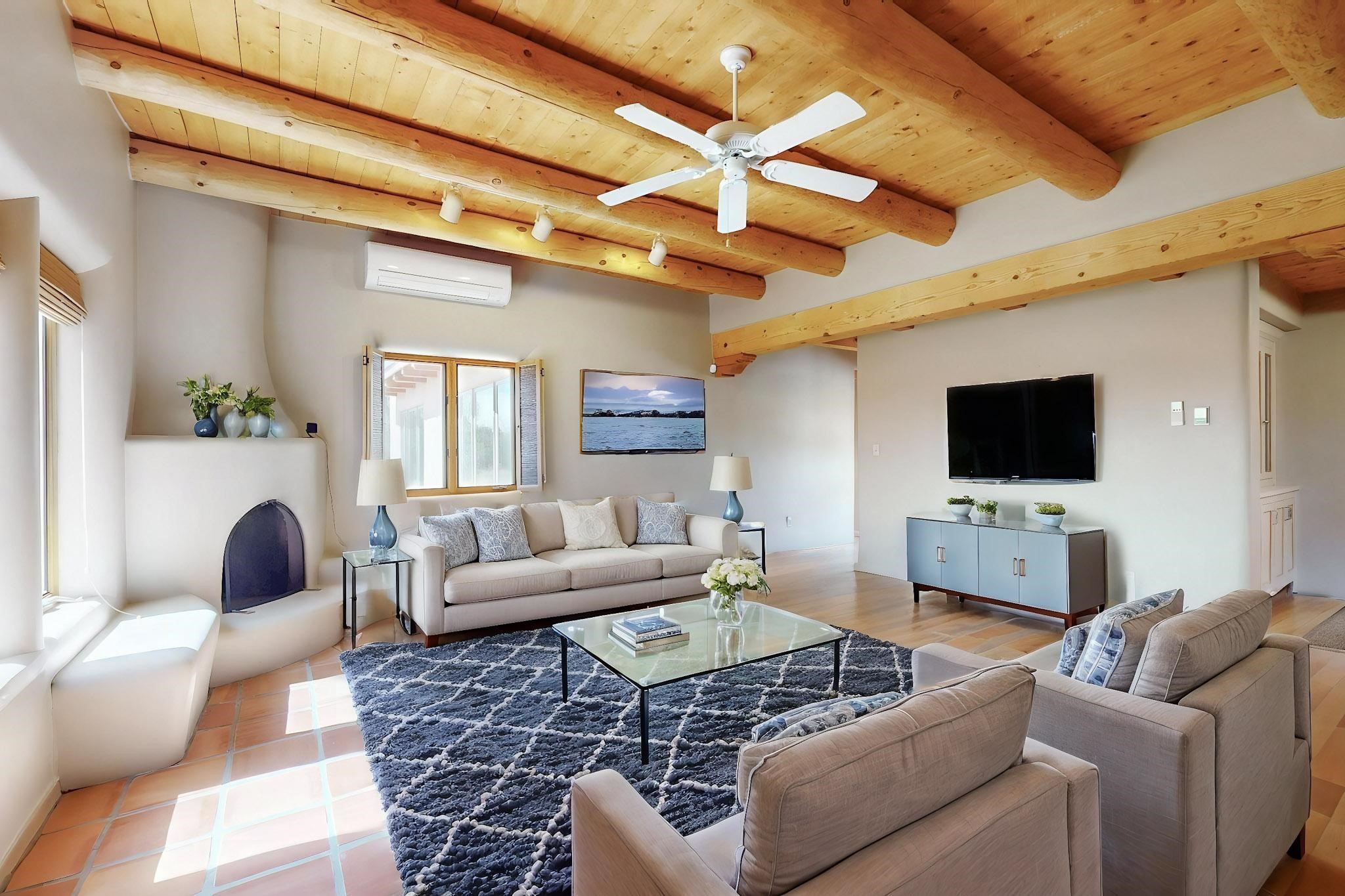 Set back from the road for privacy, this beautifully built adobe home by Shaylube Construction offers multiple access points and versatile outdoor spaces. Designed with thoughtful detail, it begins with a welcoming entrance room ideal for drinking morning coffee or greeting guests, flowing seamlessly into a charming living area with a traditional kiva fireplace. The dining room is conveniently located between the entrance and living room, creating an easy flow for entertaining. The kitchen boasts exceptional storage with multiple lazy-susan cupboards and a built-in China cabinet. The spacious primary bedroom features its own kiva fireplace, creating a warm, inviting retreat. Two additional bedrooms offer flexibility, along with a possible third bedroom or office with a secure, locking storage closet--perfect for valuables or private archives. At the rear of the home, accessed via an exterior walkway, a private office with custom built bookshelves and rich wood flooring provides a peaceful workspace. This well-maintained home comes with significant recent upgrades: Completely re-roofed in 2018 with warranty through 2028; New furnace and tankless water heater 2015; Updated mini-split systems 2024; New refrigerator 2023. Includes mountain views, multiple patios and garden spaces, and a flexible floor plan that allows for independence and coexistence under one roof.
