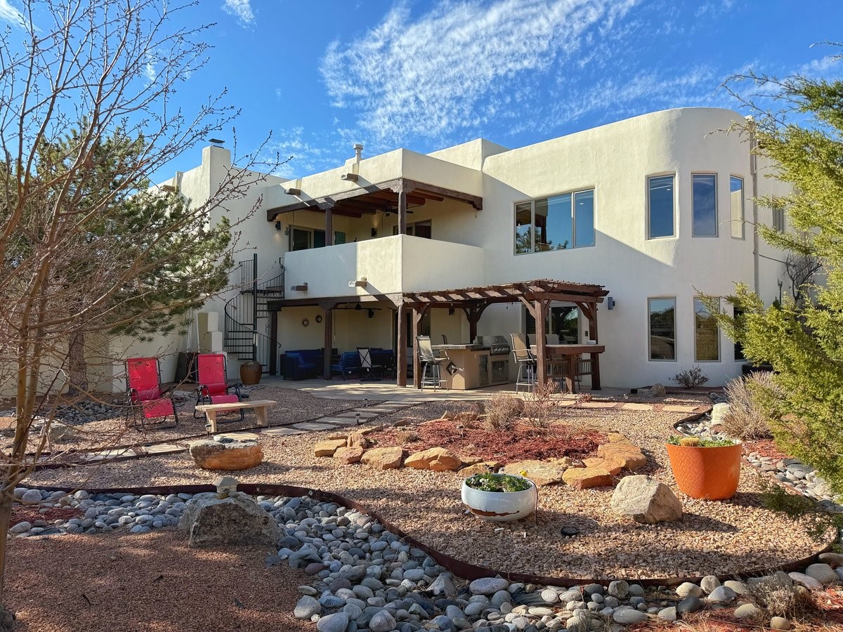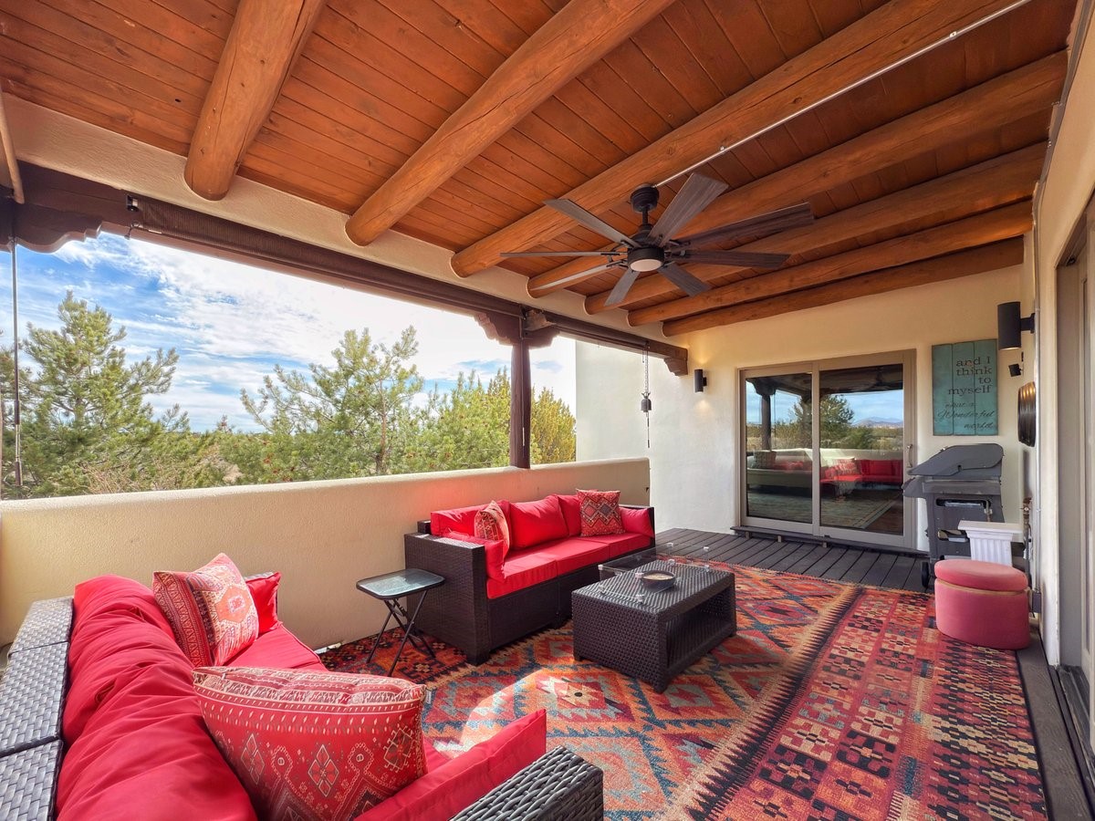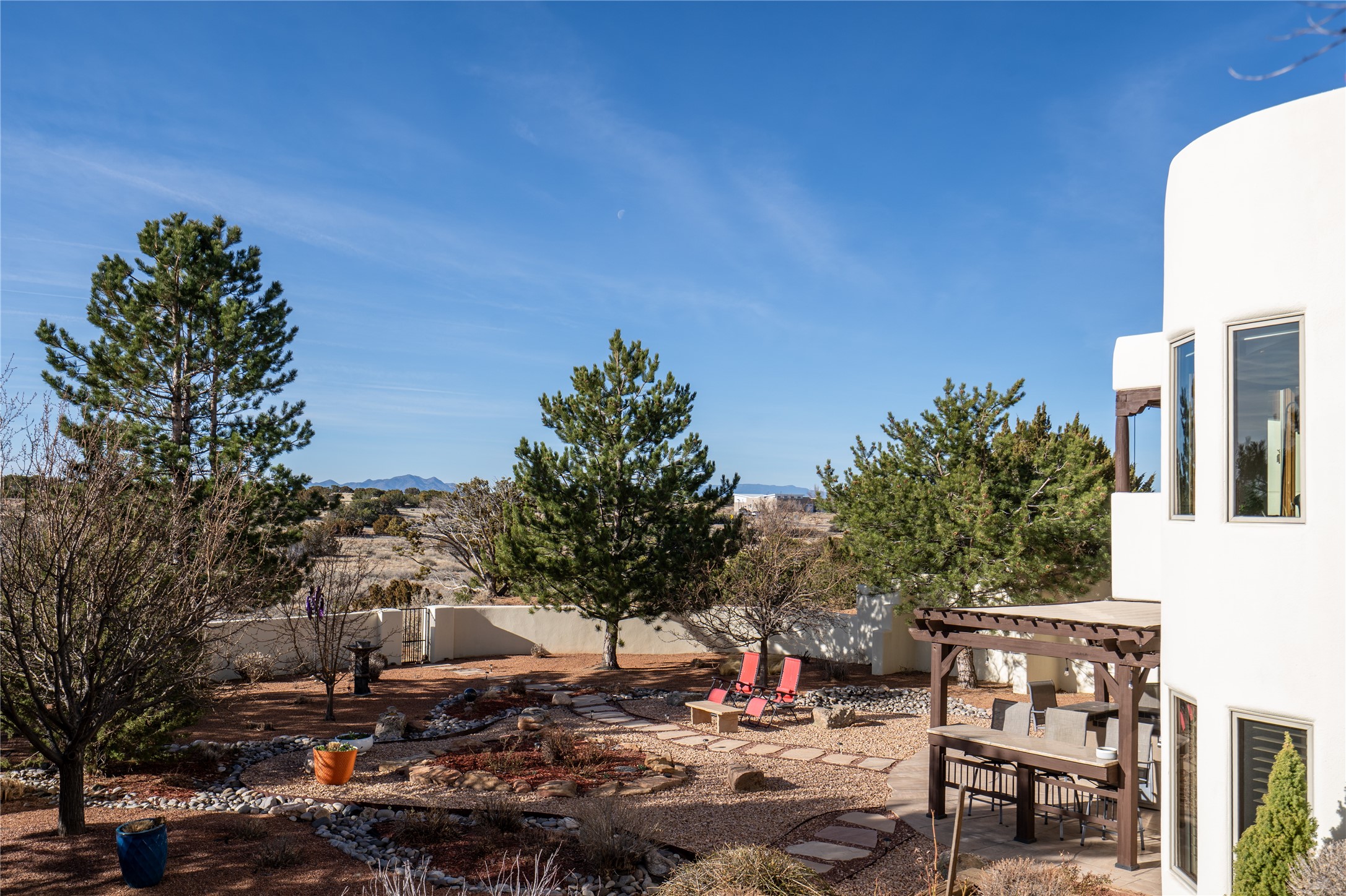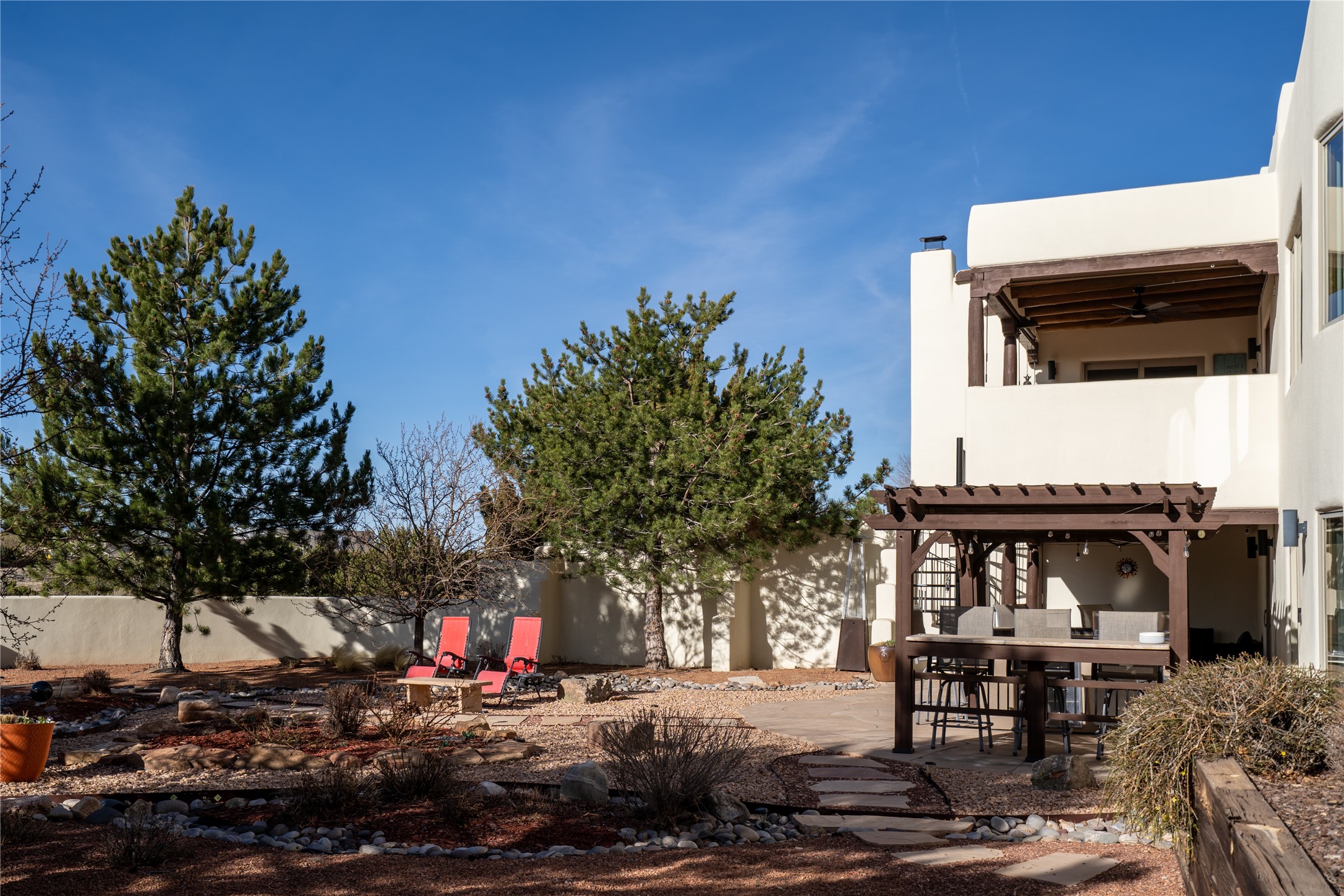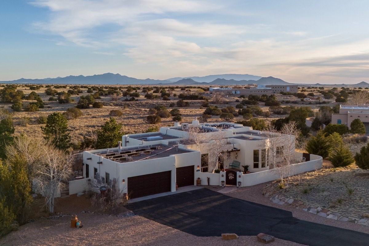 You'll love this custom Santa Fe home with a guest house that proves you can have both beauty and brains. Tucked away on a quiet cul-de-sac in the exclusive Village Estates of Rancho Viejo, this thoughtfully designed home blends smart living with timeless Santa Fe charm. Let's start with the brains: 23 owned solar panels creating electric bills under $10 a month. There's a whole-house water filtration/softener system, a hot water recirculating pump on an Alexa plug, a remotely operated irrigation system, and more. As for the beauty: an inviting new kitchen designed for gathering and gourmet cooking takes center stage in the one-level main house. You'll enjoy generous living and dining areas, a private primary suite with a kiva fireplace, dual custom closets, and a remodeled en suite bath with spa-like finishes. Two guest bedrooms share a full bath, and there's a bright office plus a powder room with a shower--perfect for overnight guests. The living room has a gas fireplace, and there's also a convenient utility room with extensive storage.Step outside to a welcoming patio accessible from the living room or primary suite. Downstairs, a stylish guest house has its own entrance, living space, bedroom, modern kitchen, full bath, and a walk-out covered patio with an outdoor kitchen--perfect for long-term guests or multi-generational living.Enjoy unobstructed views of the Ortiz and Sandia Mountains, or wake up to the sunrise over the Sangre de Cristos. Whether it's morning coffee or sunset cocktails, the patios are the perfect place to soak it all in. Situated on 1.25 acres and backing up to a dedicated greenbelt, the property offers privacy and space. And yes, there's an oversized 3-car garage.When you're ready to explore, Rancho Viejo offers over 12 miles of scenic walking and biking trails--perfect for a morning stroll, evening ride, or spontaneous dog walk. The neighborhood is designed to keep you connected--to nature and to community.