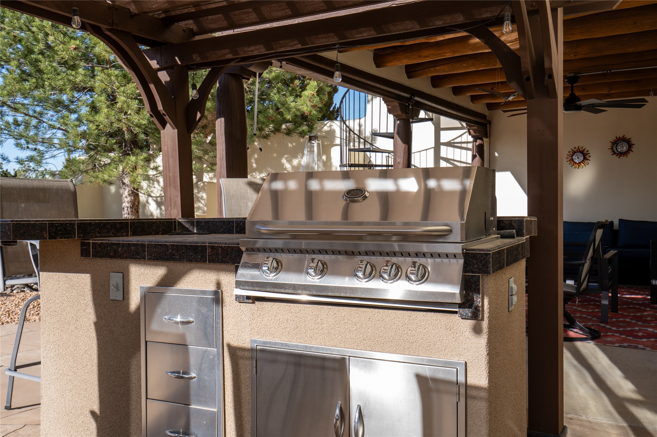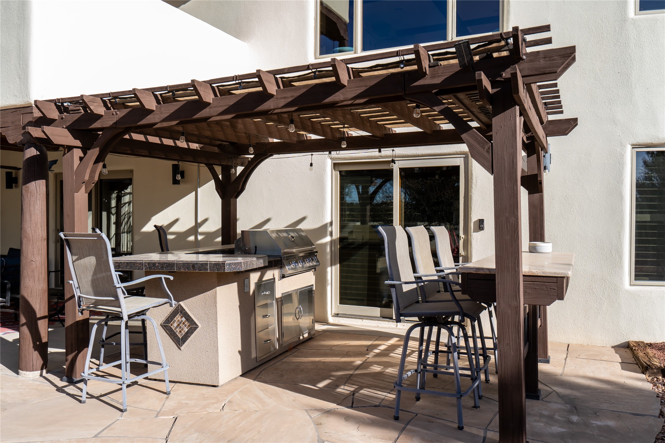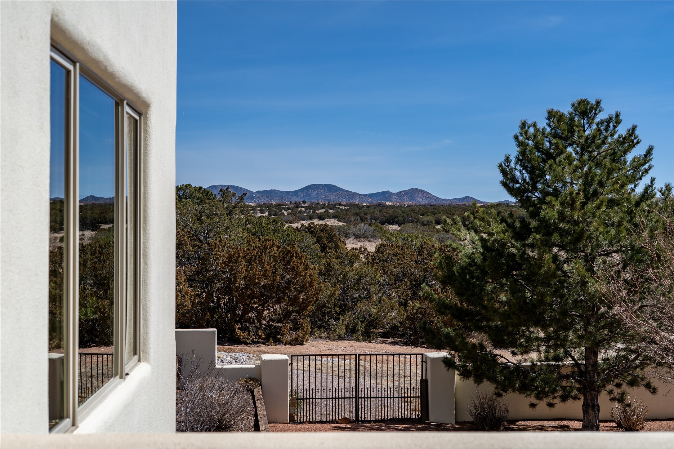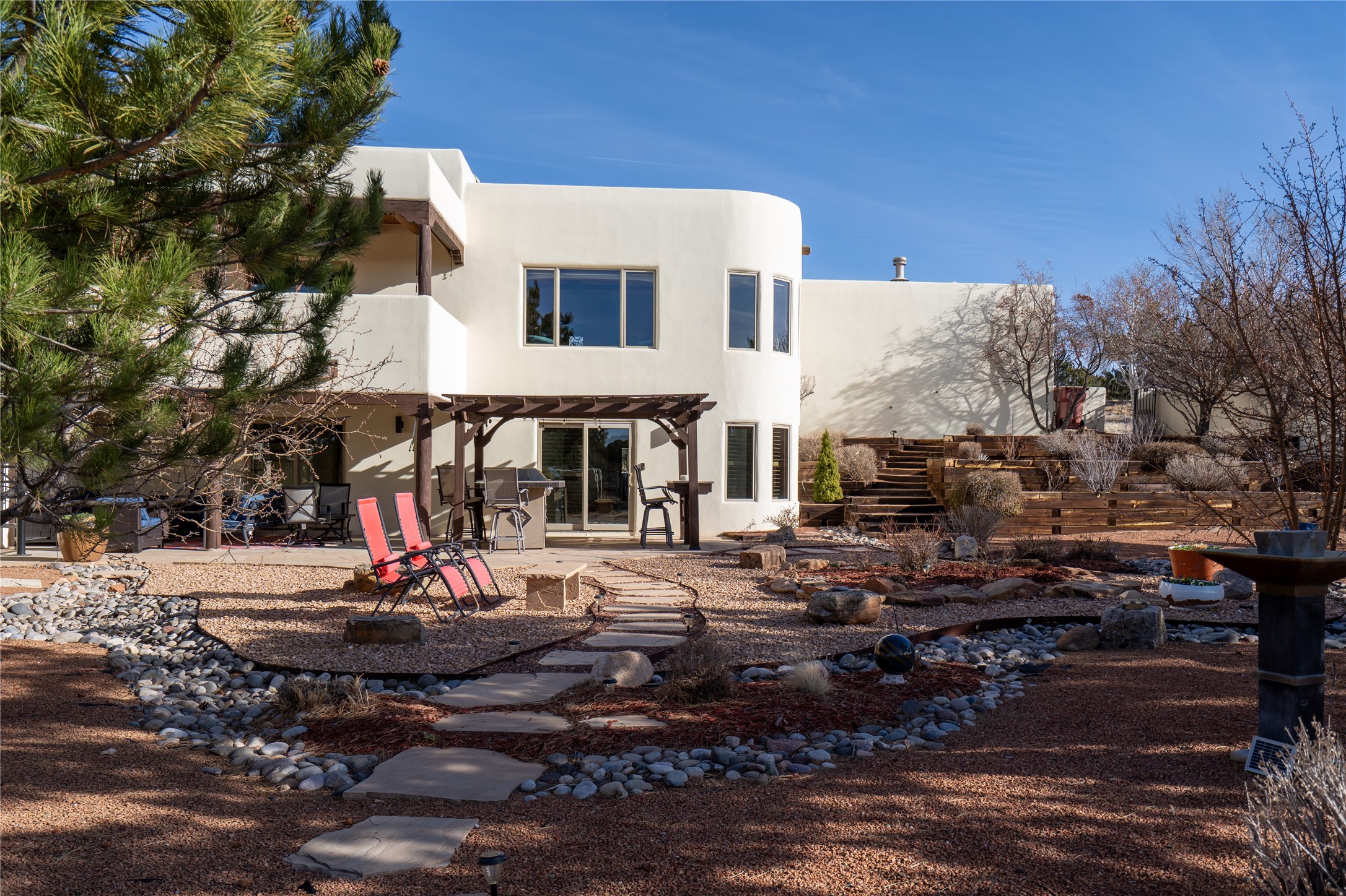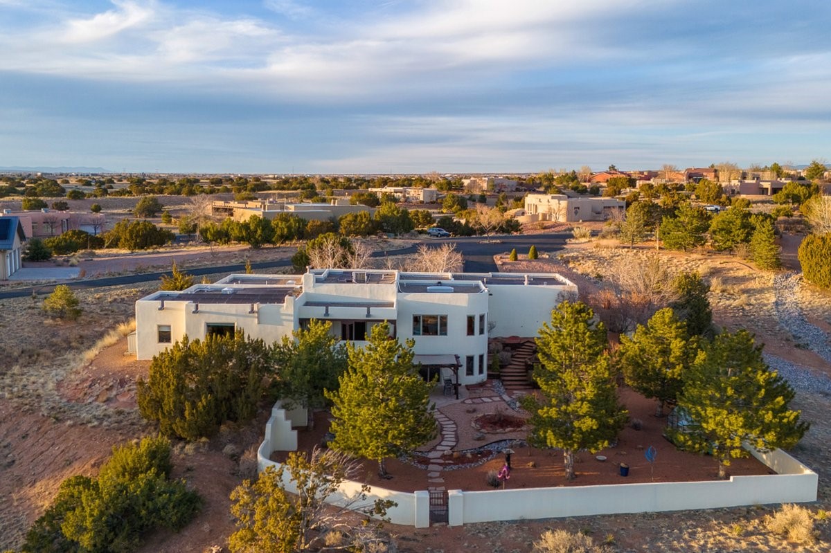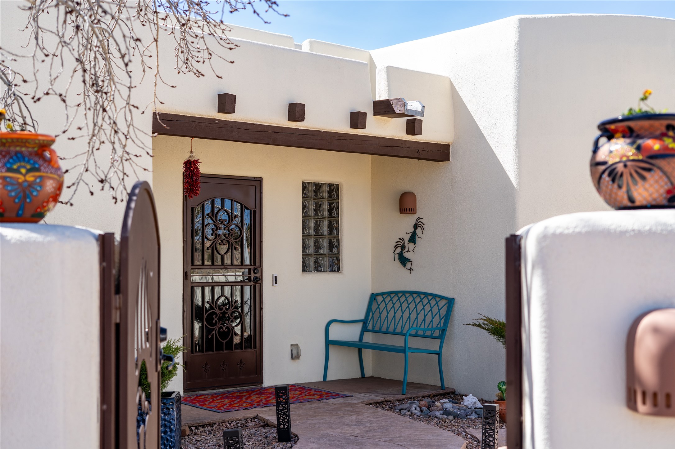 You'll love this custom Santa Fe home with a guest house that proves you can have both beauty and brains. Tucked away on a quiet cul-de-sac in the exclusive Village Estates of Rancho Viejo, this thoughtfully designed home blends smart living with timeless Santa Fe charm. Let's start with the brains: 23 owned solar panels creating electric bills under $10 a month. There's a whole-house water filtration/softener system, a hot water recirculating pump on an Alexa plug, a remotely operated irrigation system, and more. As for the beauty: an inviting new kitchen designed for gathering and gourmet cooking takes center stage in the one-level main house. You'll enjoy generous living and dining areas, a private primary suite with a kiva fireplace, dual custom closets, and a remodeled en suite bath with spa-like finishes. Two guest bedrooms share a full bath, and there's a bright office plus a powder room with a shower--perfect for overnight guests. The living room has a gas fireplace, and there's also a convenient utility room with extensive storage.Step outside to a welcoming patio accessible from the living room or primary suite. Downstairs, a stylish guest house has its own entrance, living space, bedroom, modern kitchen, full bath, and a walk-out covered patio with an outdoor kitchen--perfect for long-term guests or multi-generational living.Enjoy unobstructed views of the Ortiz and Sandia Mountains, or wake up to the sunrise over the Sangre de Cristos. Whether it's morning coffee or sunset cocktails, the patios are the perfect place to soak it all in. Situated on 1.25 acres and backing up to a dedicated greenbelt, the property offers privacy and space. And yes, there's an oversized 3-car garage.When you're ready to explore, Rancho Viejo offers over 12 miles of scenic walking and biking trails--perfect for a morning stroll, evening ride, or spontaneous dog walk. The neighborhood is designed to keep you connected--to nature and to community.