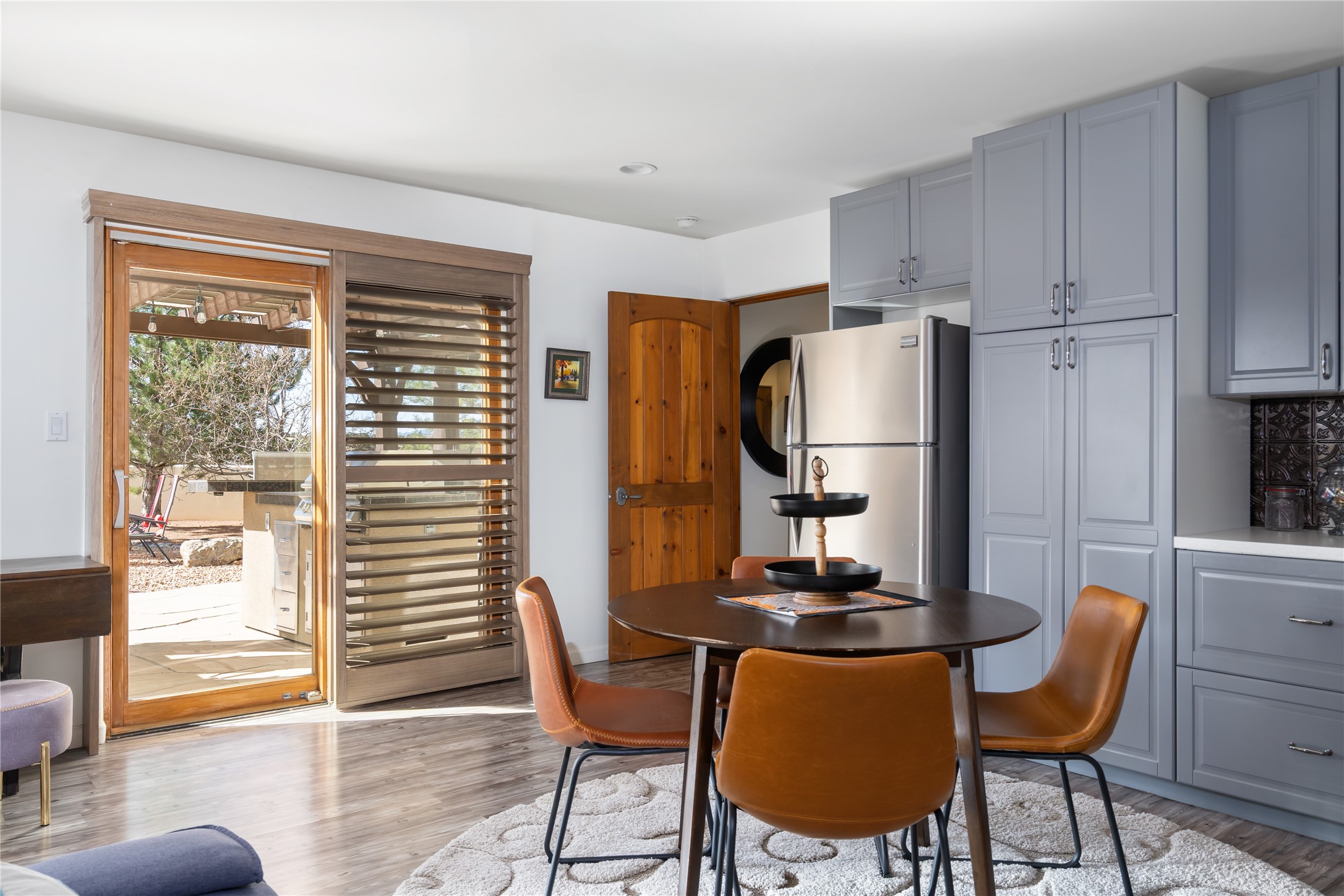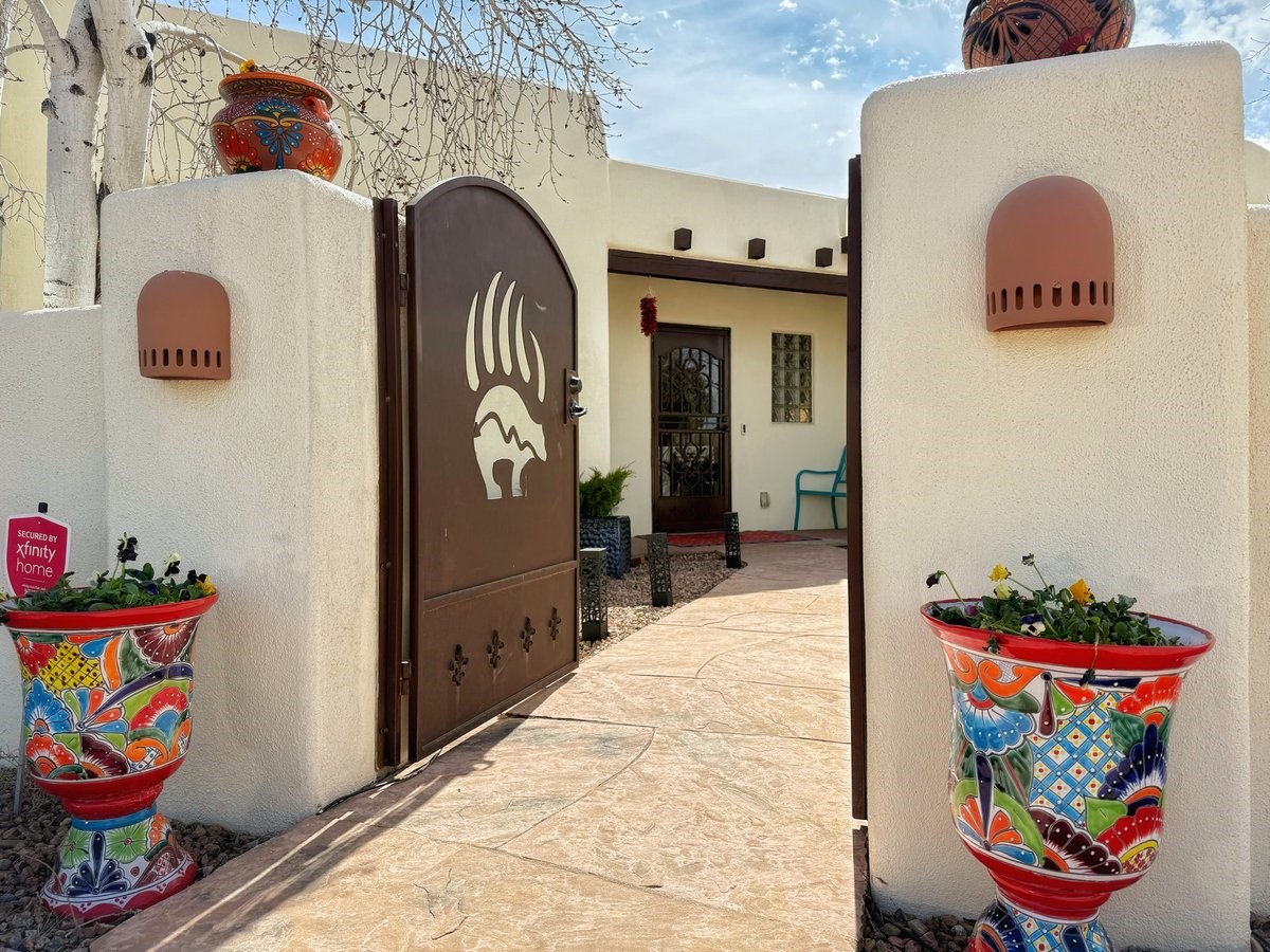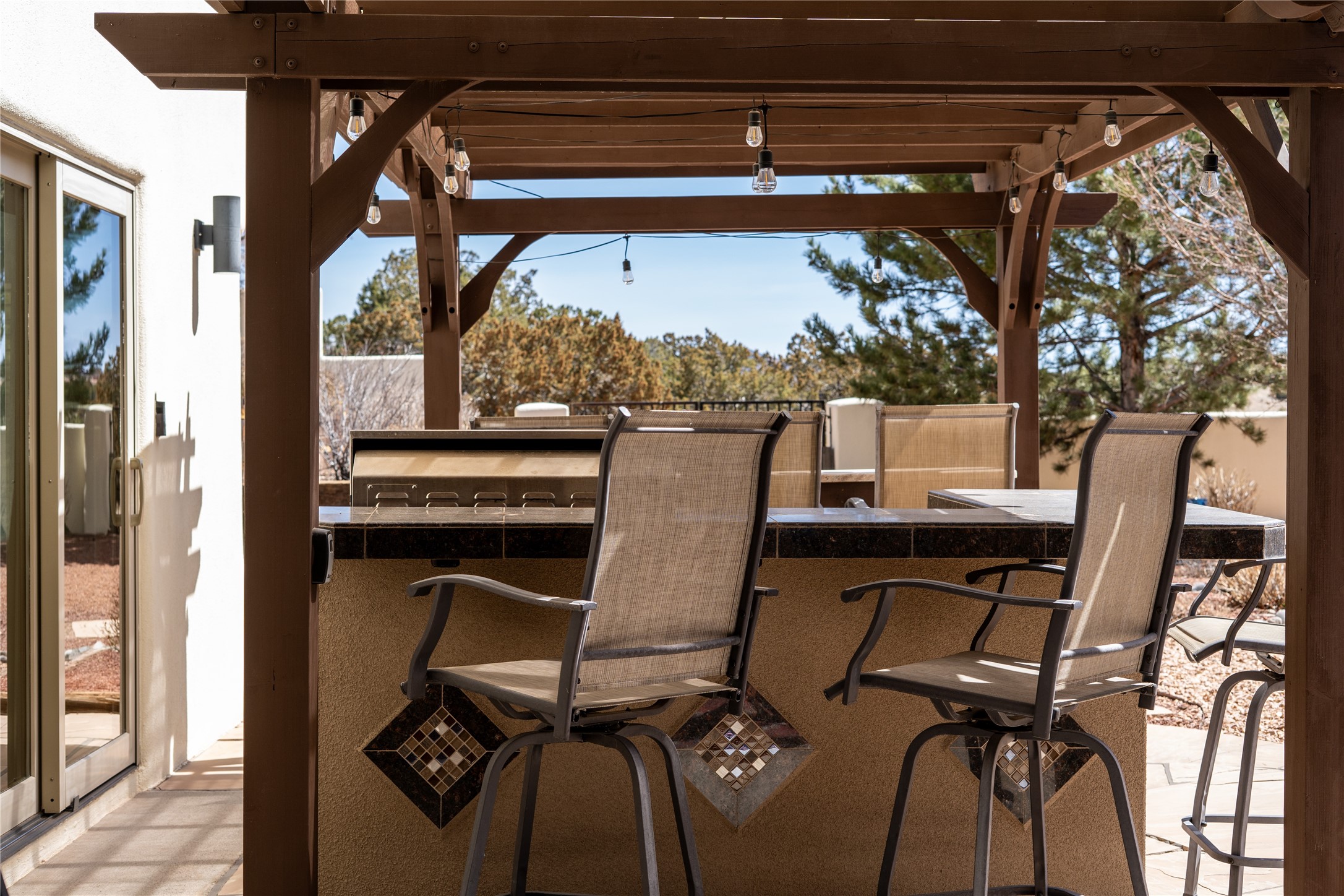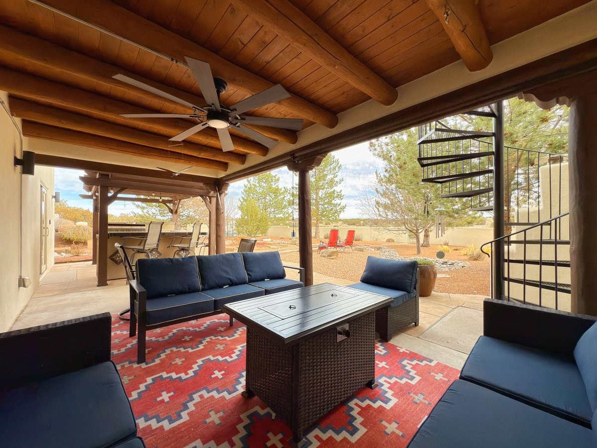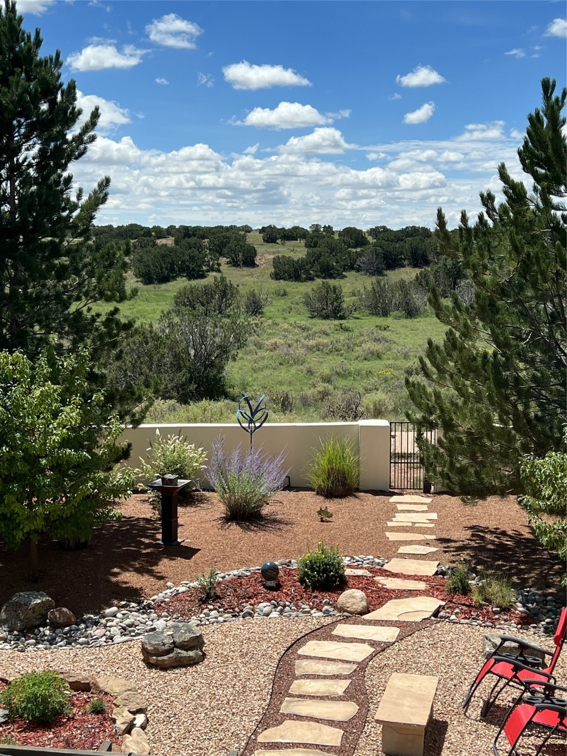 You'll love this custom Santa Fe home with a guest house that proves you can have both beauty and brains. Tucked away on a quiet cul-de-sac in the exclusive Village Estates of Rancho Viejo, this thoughtfully designed home blends smart living with timeless Santa Fe charm. Let's start with the brains: 23 owned solar panels creating electric bills under $10 a month. There's a whole-house water filtration/softener system, a hot water recirculating pump on an Alexa plug, a remotely operated irrigation system, and more. As for the beauty: an inviting new kitchen designed for gathering and gourmet cooking takes center stage in the one-level main house. You'll enjoy generous living and dining areas, a private primary suite with a kiva fireplace, dual custom closets, and a remodeled en suite bath with spa-like finishes. Two guest bedrooms share a full bath, and there's a bright office plus a powder room with a shower--perfect for overnight guests. The living room has a gas fireplace, and there's also a convenient utility room with extensive storage.Step outside to a welcoming patio accessible from the living room or primary suite. Downstairs, a stylish guest house has its own entrance, living space, bedroom, modern kitchen, full bath, and a walk-out covered patio with an outdoor kitchen--perfect for long-term guests or multi-generational living.Enjoy unobstructed views of the Ortiz and Sandia Mountains, or wake up to the sunrise over the Sangre de Cristos. Whether it's morning coffee or sunset cocktails, the patios are the perfect place to soak it all in. Situated on 1.25 acres and backing up to a dedicated greenbelt, the property offers privacy and space. And yes, there's an oversized 3-car garage.When you're ready to explore, Rancho Viejo offers over 12 miles of scenic walking and biking trails--perfect for a morning stroll, evening ride, or spontaneous dog walk. The neighborhood is designed to keep you connected--to nature and to community.