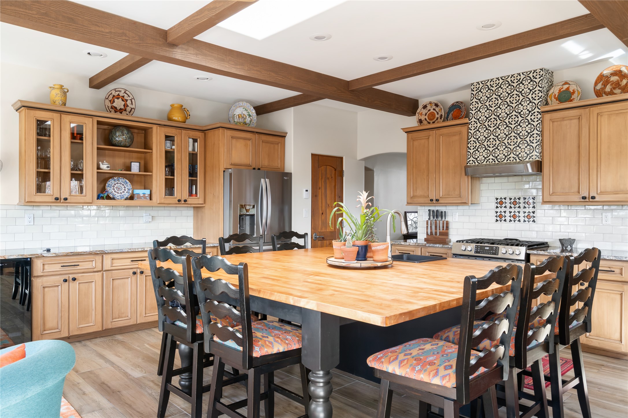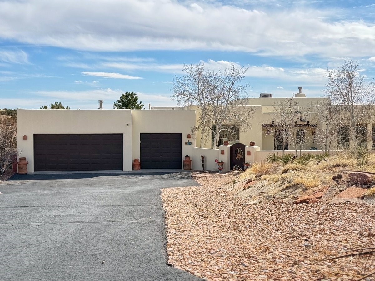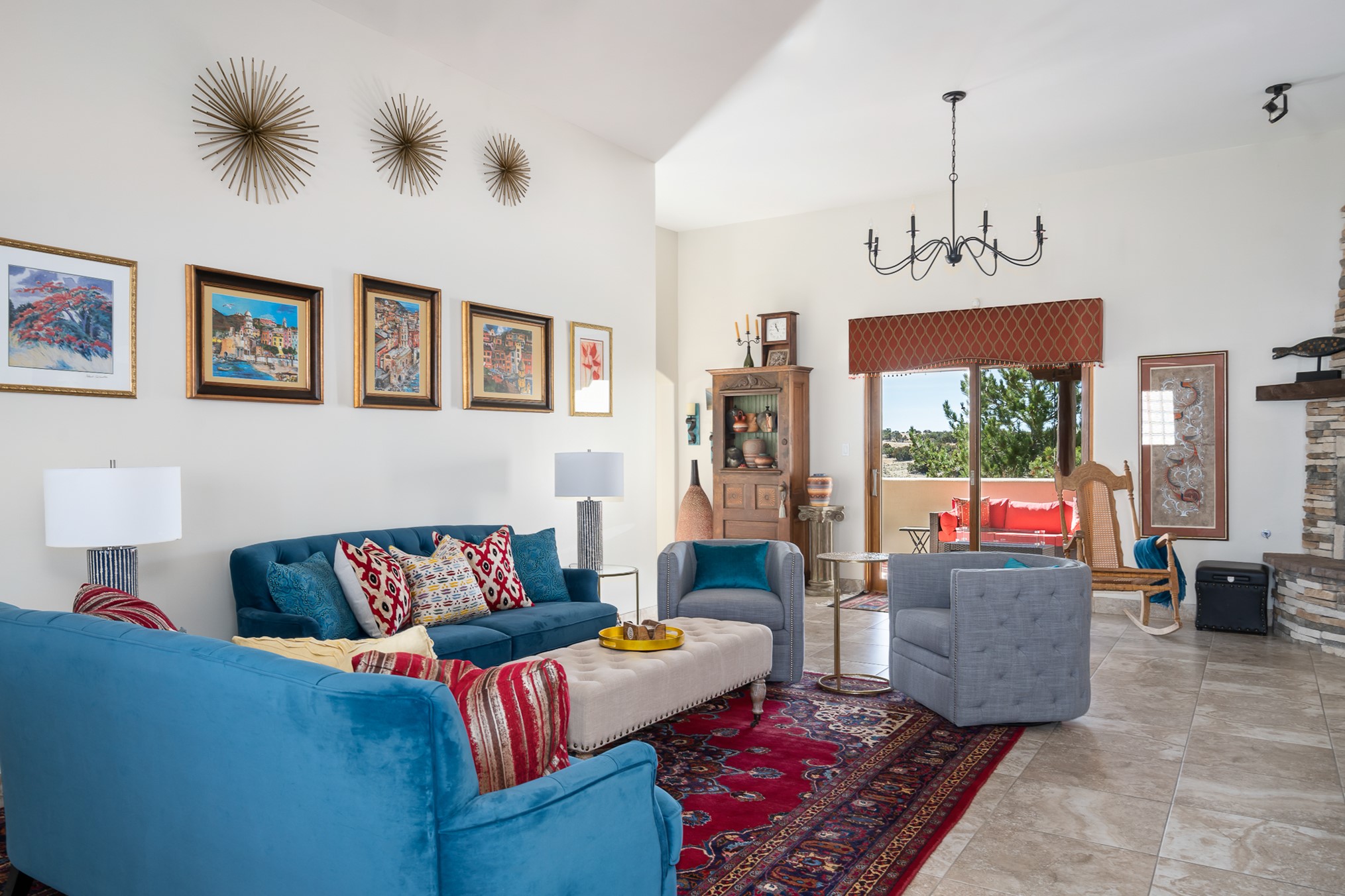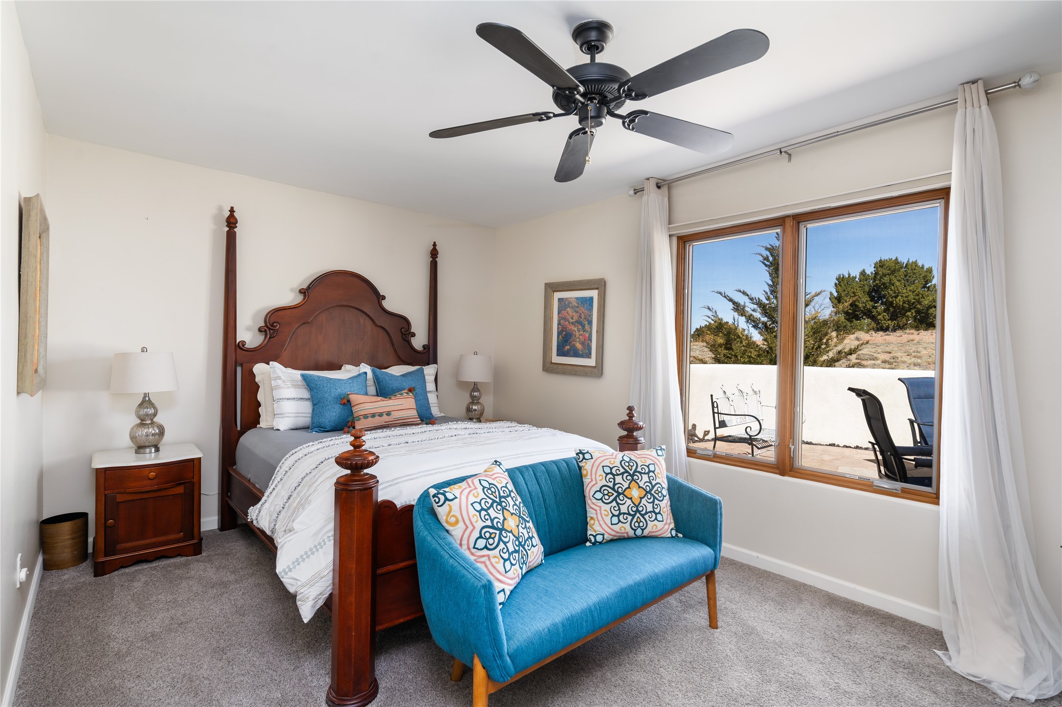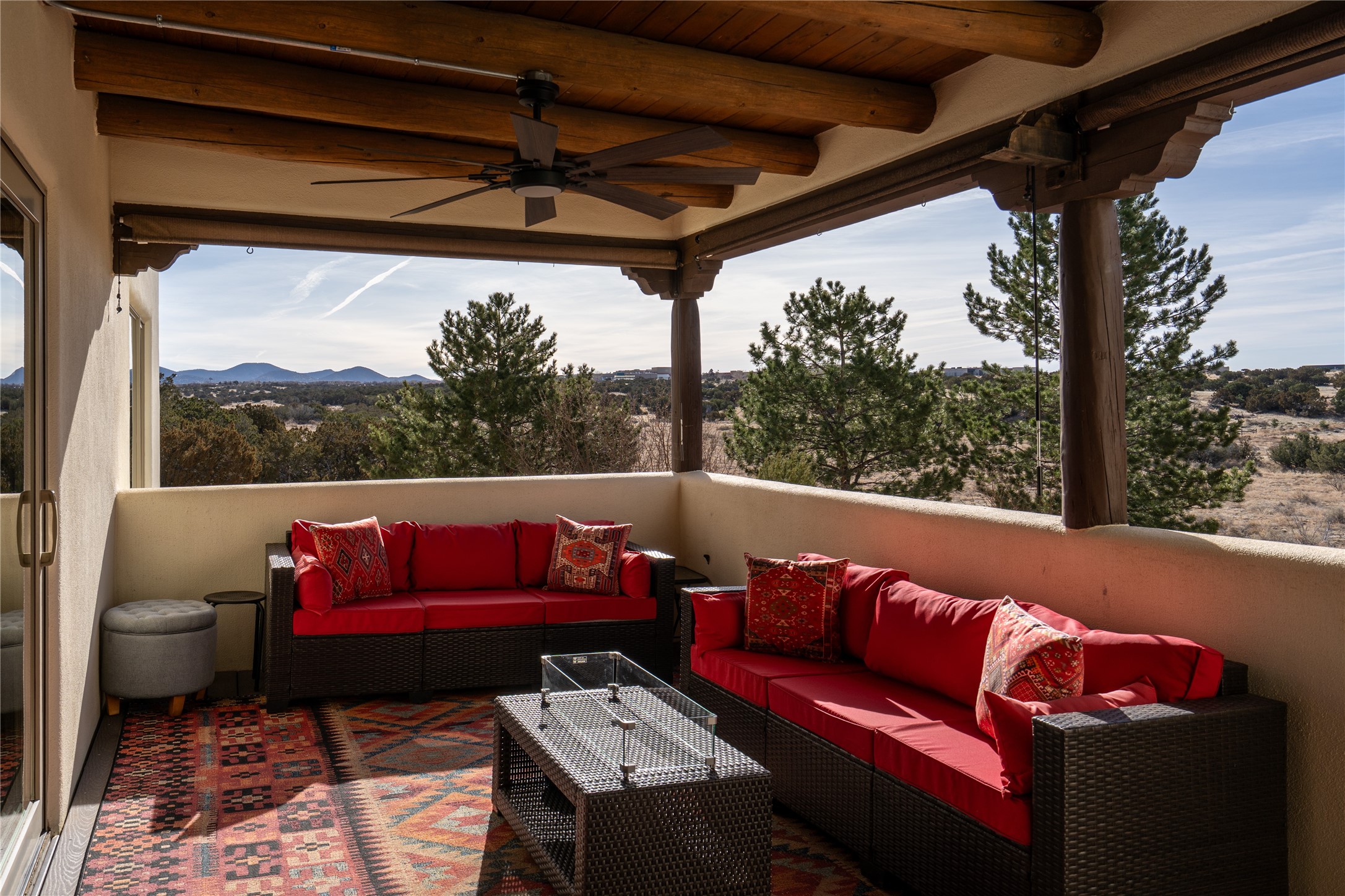 You'll love this custom Santa Fe home with a guest house that proves you can have both beauty and brains. Tucked away on a quiet cul-de-sac in the exclusive Village Estates of Rancho Viejo, this thoughtfully designed home blends smart living with timeless Santa Fe charm. Let's start with the brains: 23 owned solar panels creating electric bills under $10 a month. There's a whole-house water filtration/softener system, a hot water recirculating pump on an Alexa plug, a remotely operated irrigation system, and more. As for the beauty: an inviting new kitchen designed for gathering and gourmet cooking takes center stage in the one-level main house. You'll enjoy generous living and dining areas, a private primary suite with a kiva fireplace, dual custom closets, and a remodeled en suite bath with spa-like finishes. Two guest bedrooms share a full bath, and there's a bright office plus a powder room with a shower--perfect for overnight guests. The living room has a gas fireplace, and there's also a convenient utility room with extensive storage.Step outside to a welcoming patio accessible from the living room or primary suite. Downstairs, a stylish guest house has its own entrance, living space, bedroom, modern kitchen, full bath, and a walk-out covered patio with an outdoor kitchen--perfect for long-term guests or multi-generational living.Enjoy unobstructed views of the Ortiz and Sandia Mountains, or wake up to the sunrise over the Sangre de Cristos. Whether it's morning coffee or sunset cocktails, the patios are the perfect place to soak it all in. Situated on 1.25 acres and backing up to a dedicated greenbelt, the property offers privacy and space. And yes, there's an oversized 3-car garage.When you're ready to explore, Rancho Viejo offers over 12 miles of scenic walking and biking trails--perfect for a morning stroll, evening ride, or spontaneous dog walk. The neighborhood is designed to keep you connected--to nature and to community.