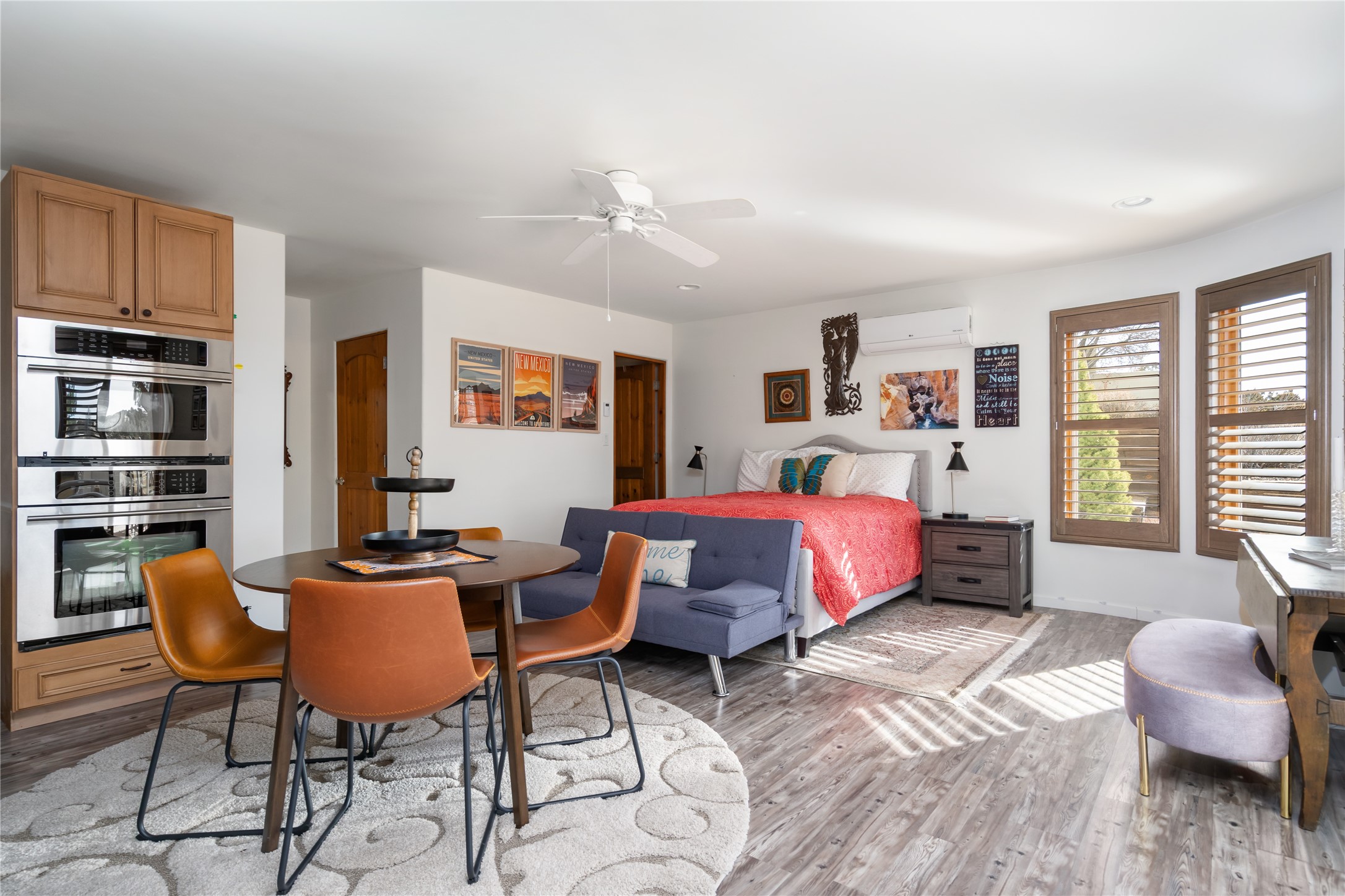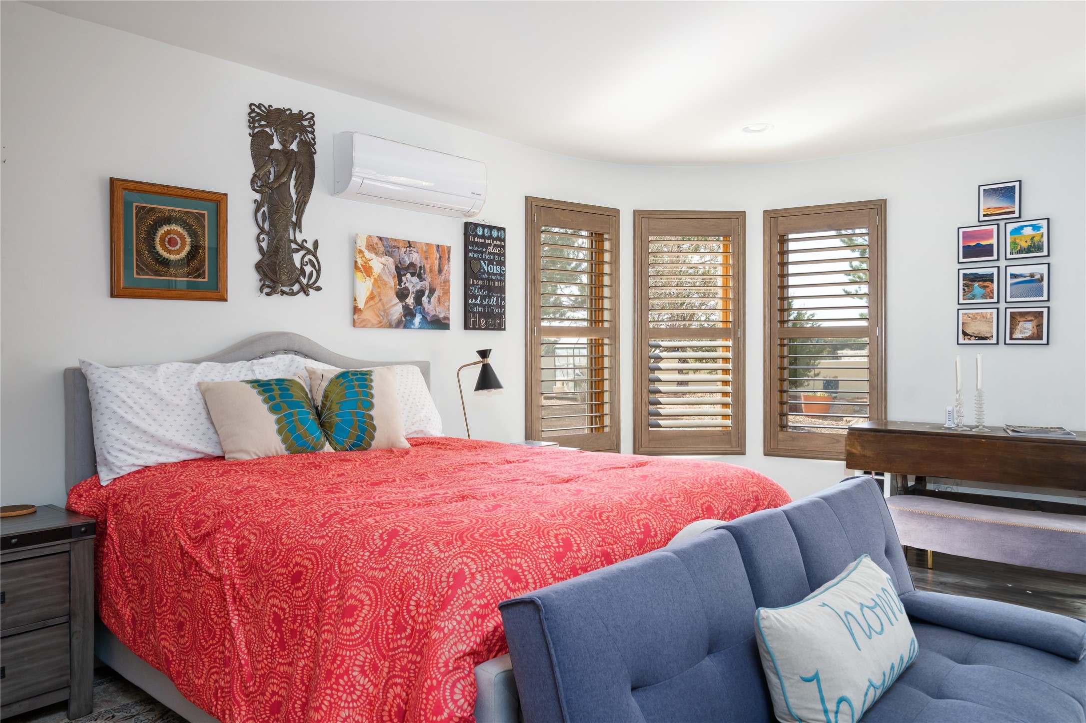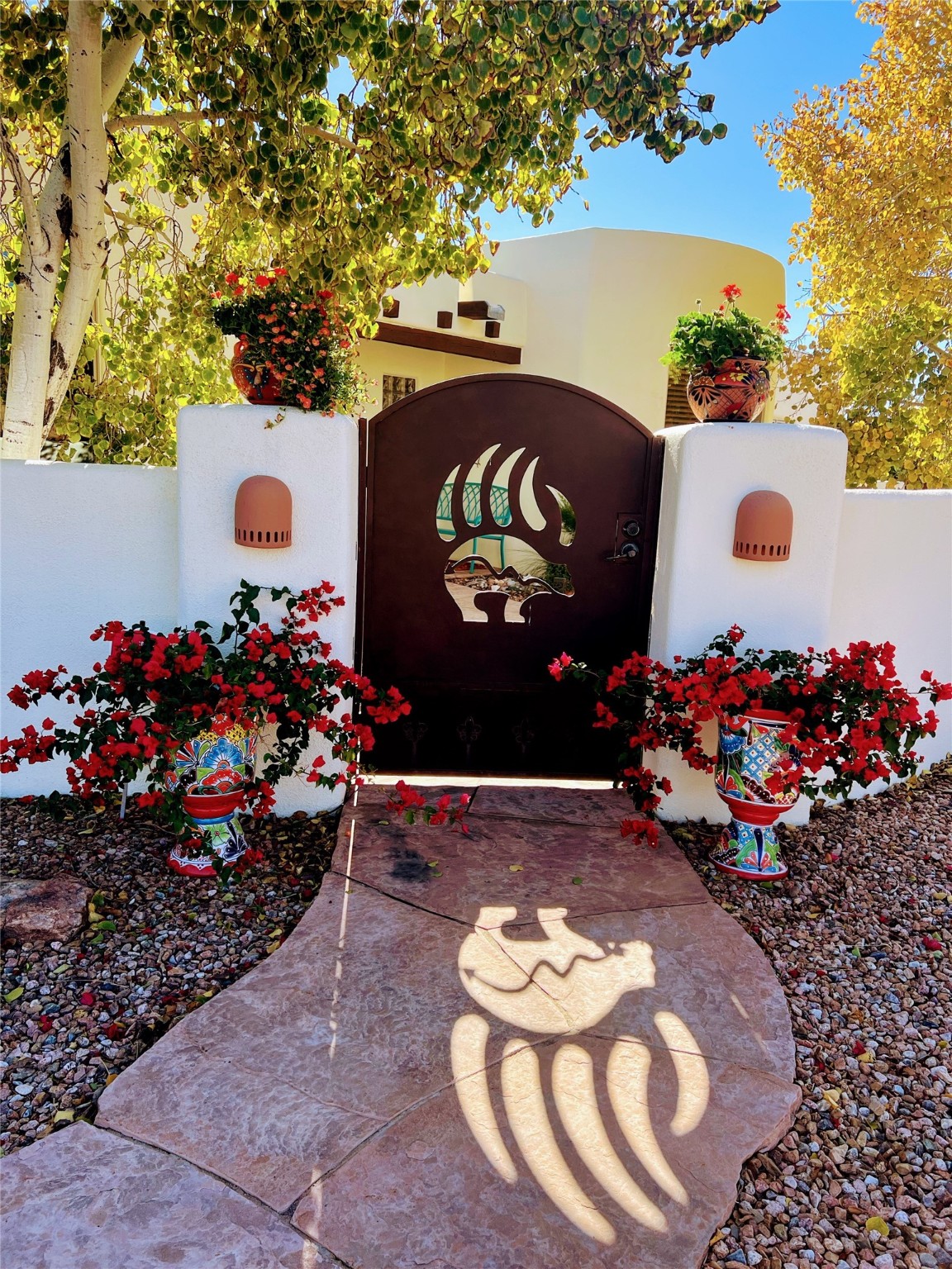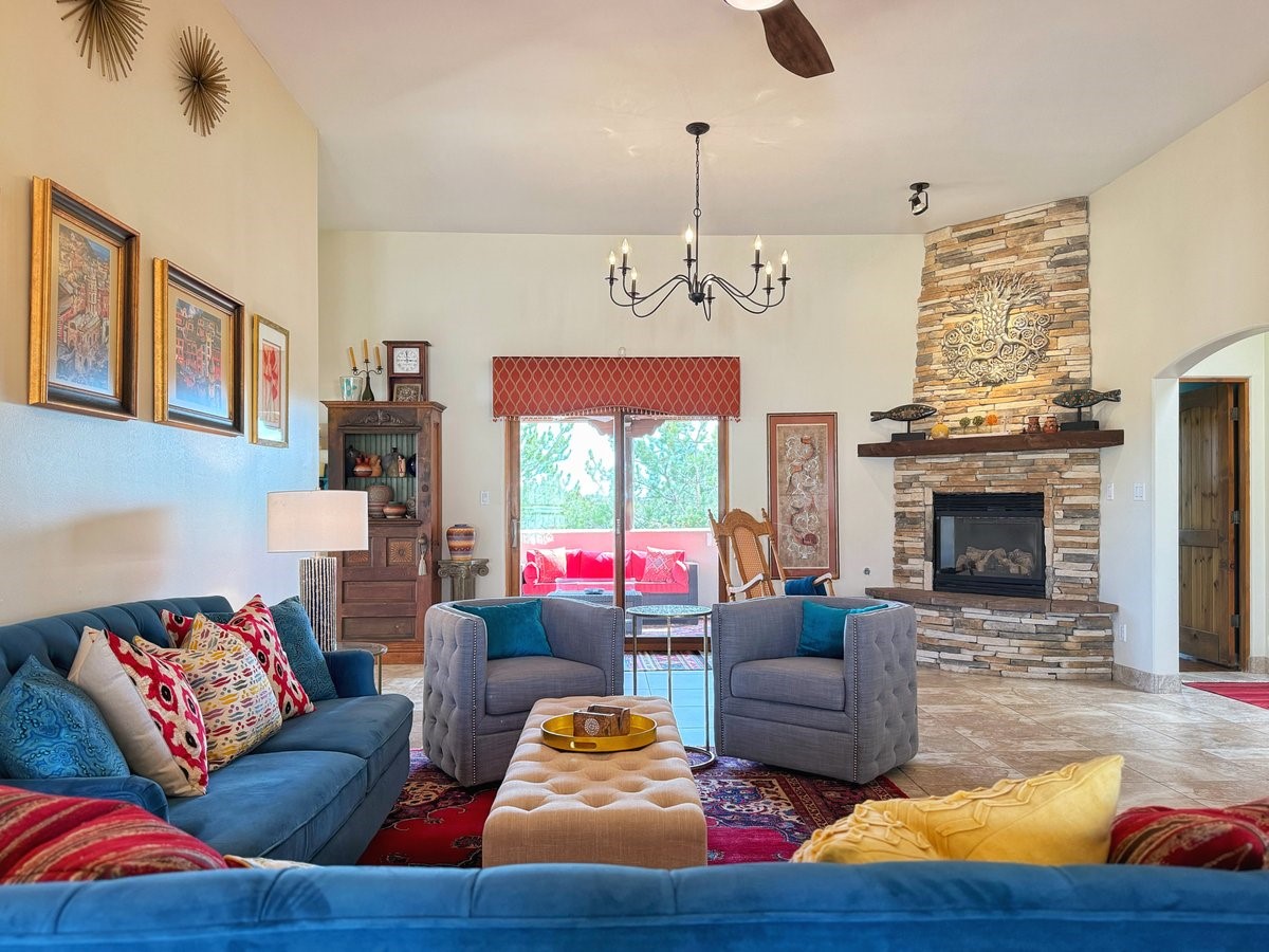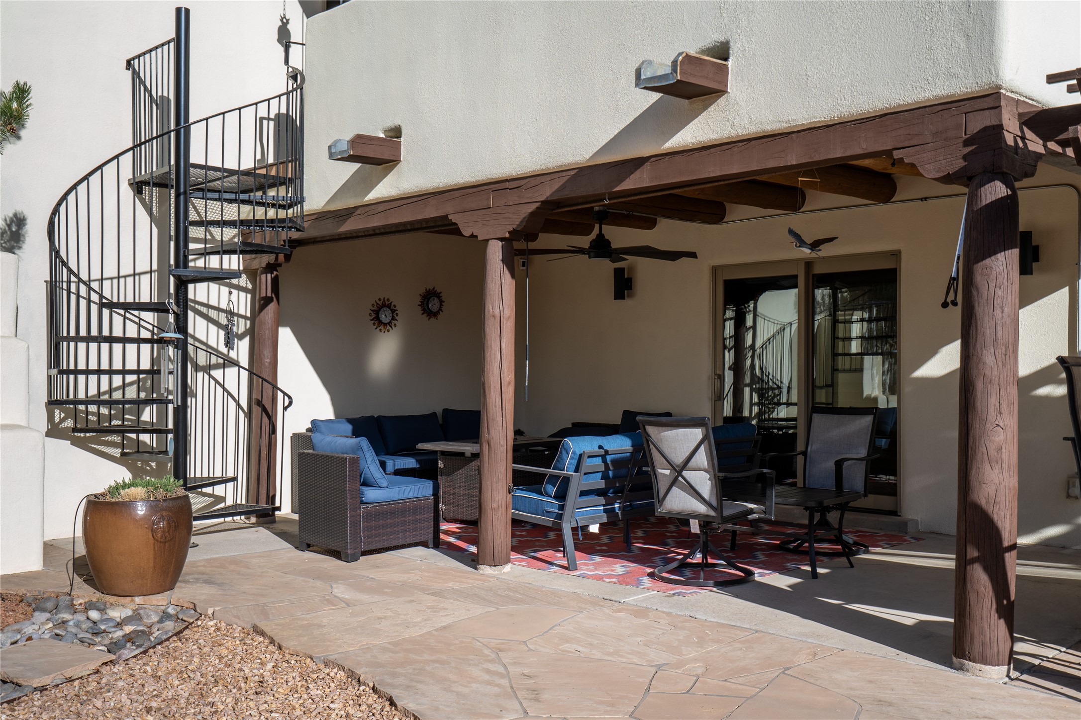 You'll love this custom Santa Fe home with a guest house that proves you can have both beauty and brains. Tucked away on a quiet cul-de-sac in the exclusive Village Estates of Rancho Viejo, this thoughtfully designed home blends smart living with timeless Santa Fe charm. Let's start with the brains: 23 owned solar panels creating electric bills under $10 a month. There's a whole-house water filtration/softener system, a hot water recirculating pump on an Alexa plug, a remotely operated irrigation system, and more. As for the beauty: an inviting new kitchen designed for gathering and gourmet cooking takes center stage in the one-level main house. You'll enjoy generous living and dining areas, a private primary suite with a kiva fireplace, dual custom closets, and a remodeled en suite bath with spa-like finishes. Two guest bedrooms share a full bath, and there's a bright office plus a powder room with a shower--perfect for overnight guests. The living room has a gas fireplace, and there's also a convenient utility room with extensive storage.Step outside to a welcoming patio accessible from the living room or primary suite. Downstairs, a stylish guest house has its own entrance, living space, bedroom, modern kitchen, full bath, and a walk-out covered patio with an outdoor kitchen--perfect for long-term guests or multi-generational living.Enjoy unobstructed views of the Ortiz and Sandia Mountains, or wake up to the sunrise over the Sangre de Cristos. Whether it's morning coffee or sunset cocktails, the patios are the perfect place to soak it all in. Situated on 1.25 acres and backing up to a dedicated greenbelt, the property offers privacy and space. And yes, there's an oversized 3-car garage.When you're ready to explore, Rancho Viejo offers over 12 miles of scenic walking and biking trails--perfect for a morning stroll, evening ride, or spontaneous dog walk. The neighborhood is designed to keep you connected--to nature and to community.