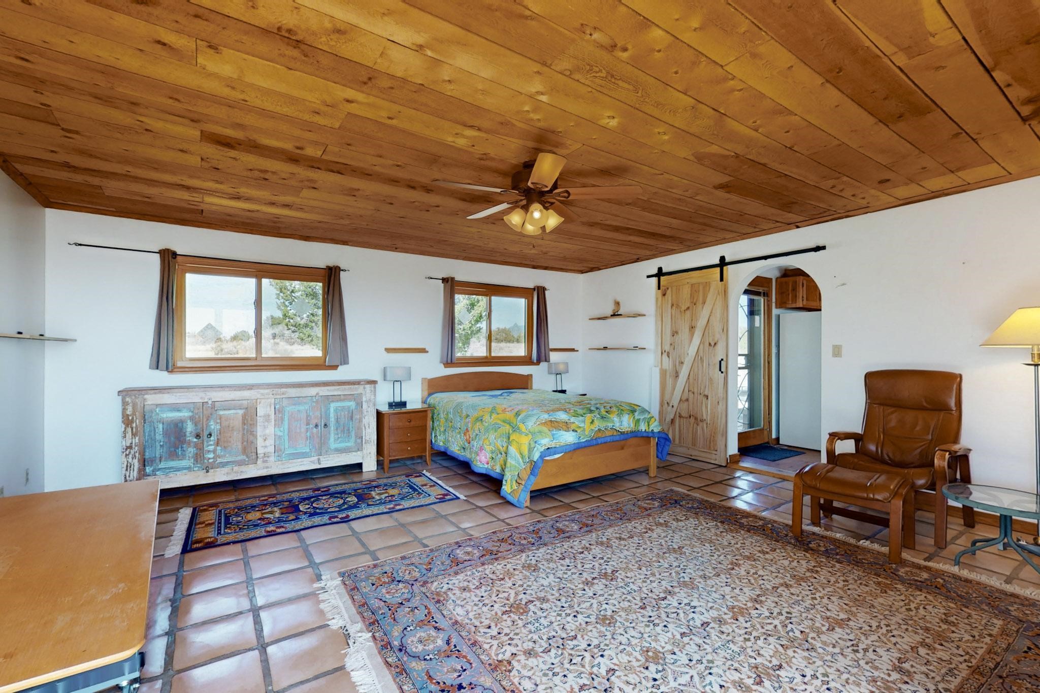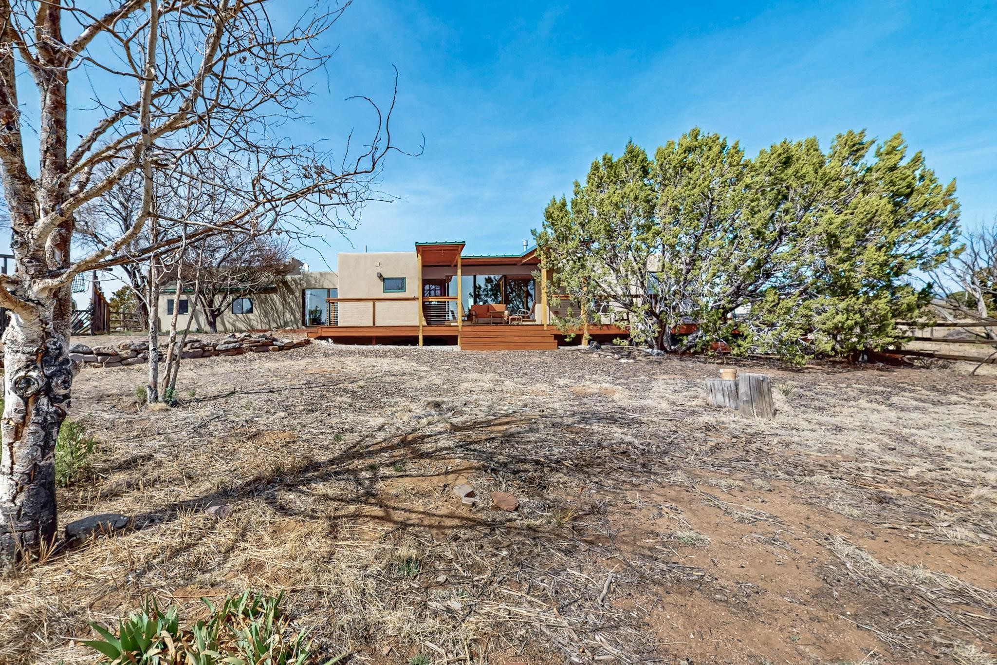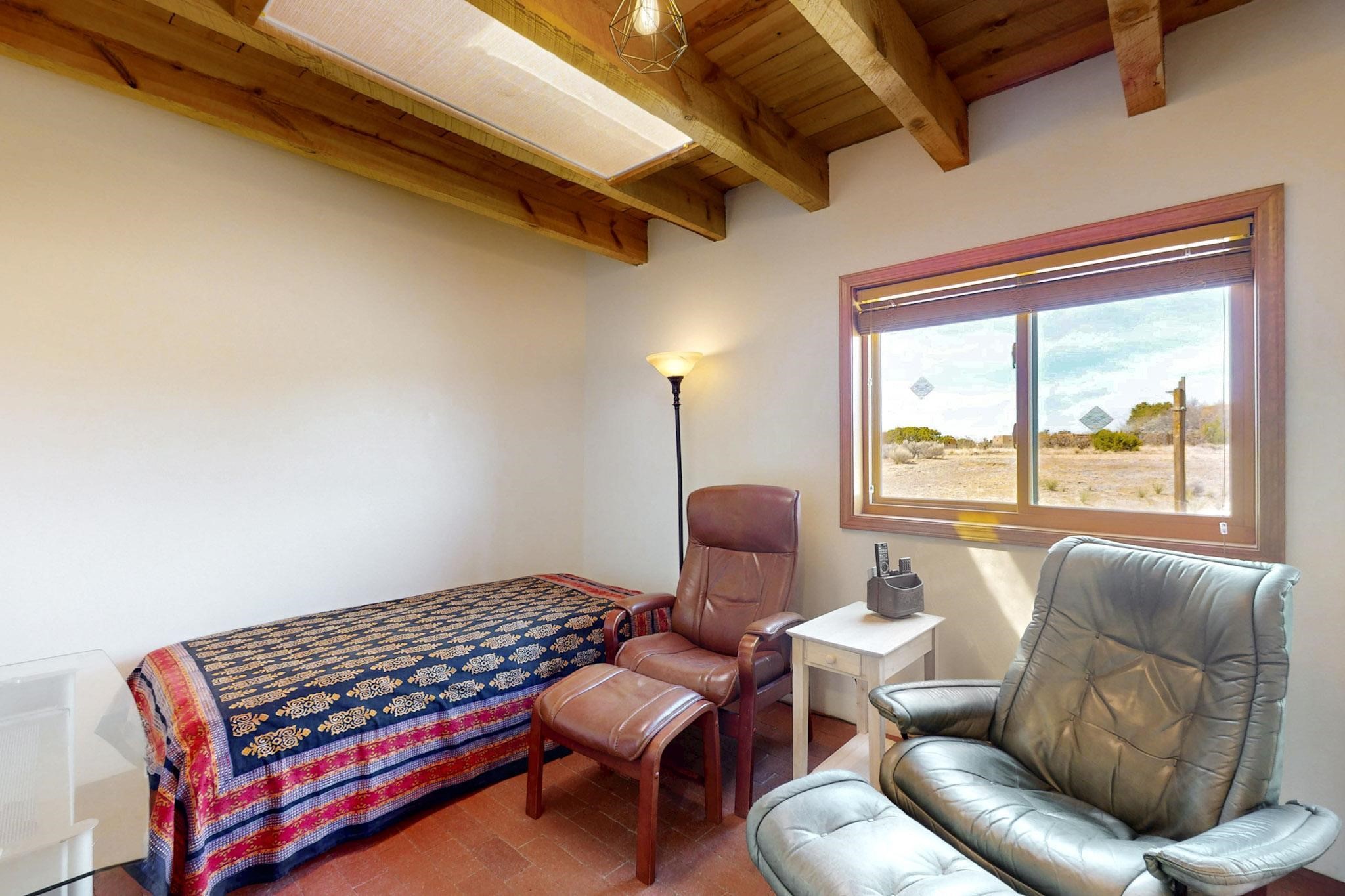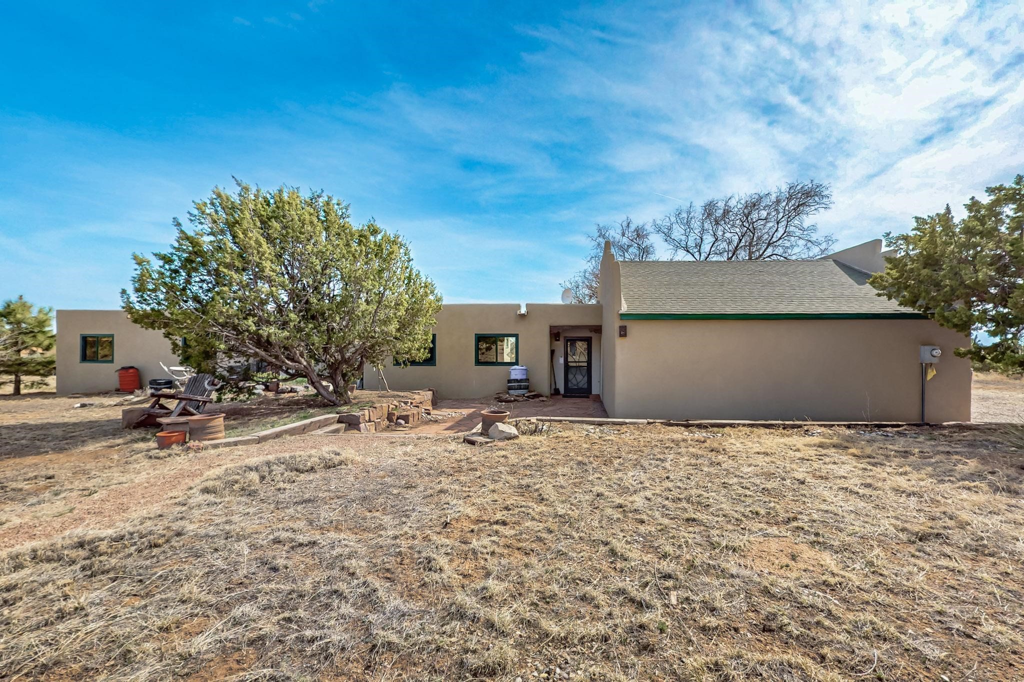 Newly priced lovely remodeled pueblo farmhouse with gleaming Saltillo tile and brick floors, beam ceilings throughout and long south facing windows for passive solar winter gain. The kitchen was remodeled, also both bathrooms were remodeled in 2021. The main bedroom bathroom has a spa like finish and includes a remodeled laundry area with a new Navien hot water heater in 2021, washer and dryer installed in 2022. Extremely flexible floor plan with two master suites, plus another guest bedroom center by the main living open plan areas. There are two mini splits to cool in the summer and 2 gas Regency stoves installed in 2015 add a cosy winter heat, serviced in 2024. A large deck was installed in 2020 for outside enjoyment, and the 2 car garage which was once used as a workshop has an old woodstove. The roof has been maintained, the private well pump was replaced in 2010, and a Nuvo water filter installed in 2021. There is a large fenced private back yard and plenty of parking space for guests. This home accesses all of Eldorado amenities, close to local shopping, the pub, schools, parks, trails, library and senior center and is only minutes into Santa Fe.
