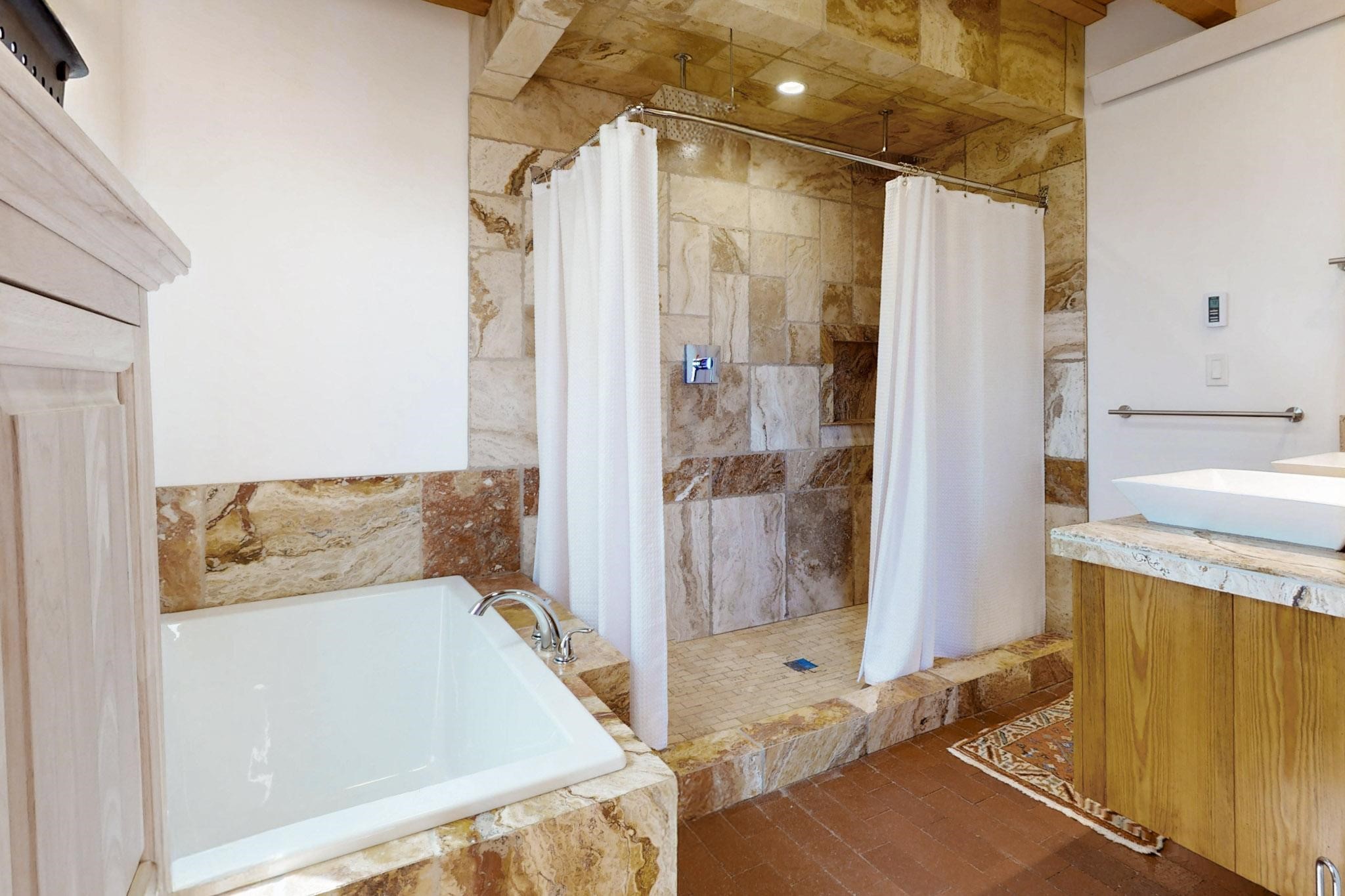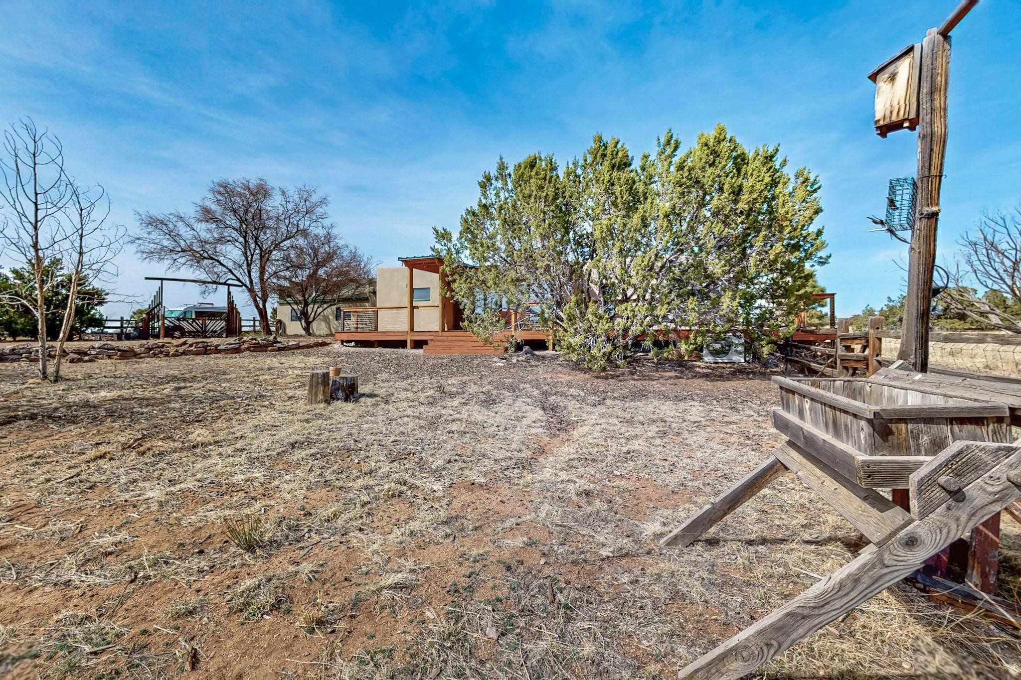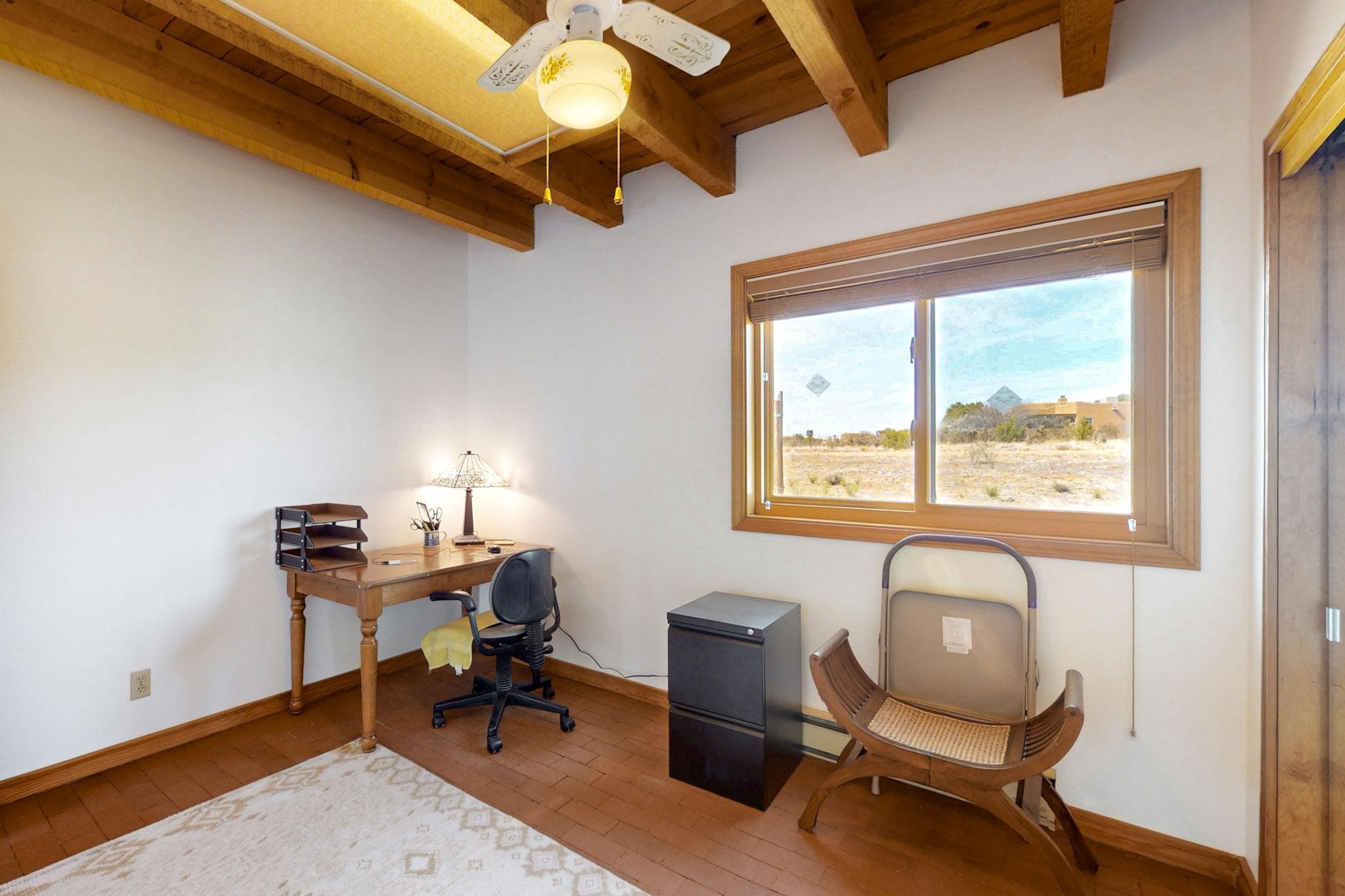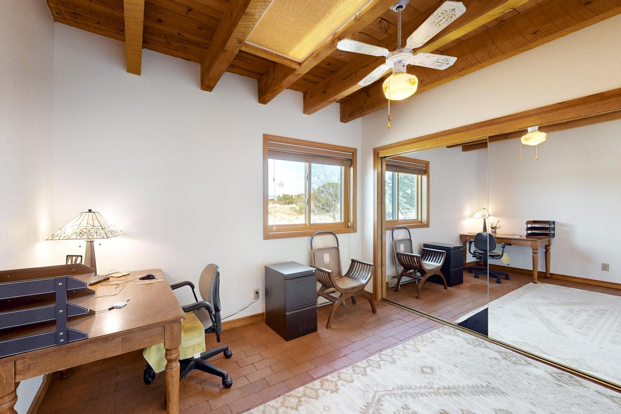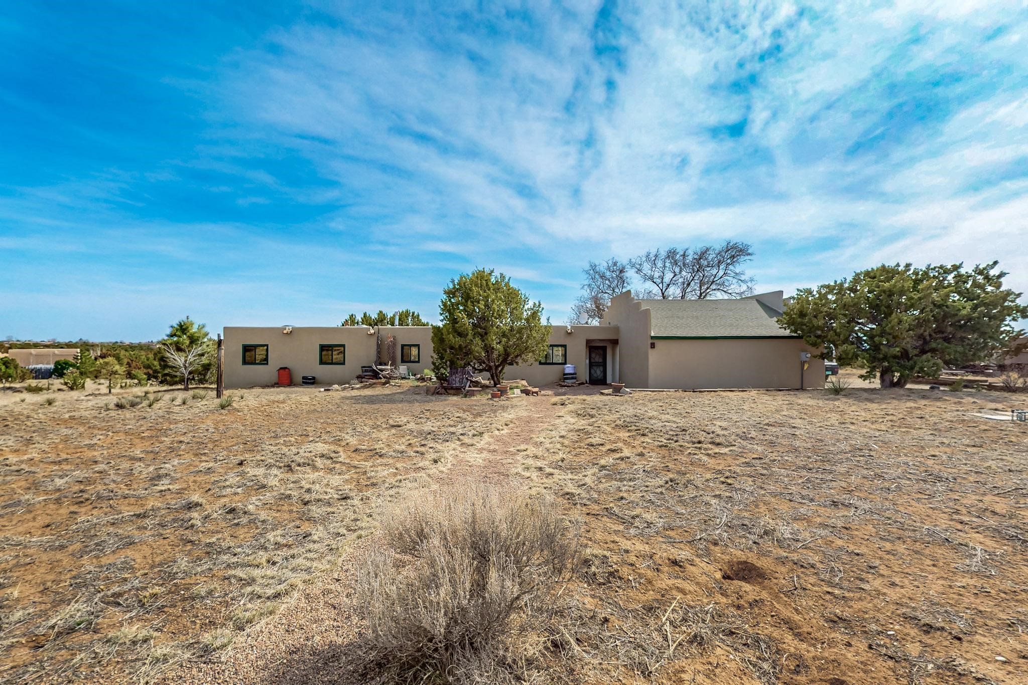 Newly priced lovely remodeled pueblo farmhouse with gleaming Saltillo tile and brick floors, beam ceilings throughout and long south facing windows for passive solar winter gain. The kitchen was remodeled, also both bathrooms were remodeled in 2021. The main bedroom bathroom has a spa like finish and includes a remodeled laundry area with a new Navien hot water heater in 2021, washer and dryer installed in 2022. Extremely flexible floor plan with two master suites, plus another guest bedroom center by the main living open plan areas. There are two mini splits to cool in the summer and 2 gas Regency stoves installed in 2015 add a cosy winter heat, serviced in 2024. A large deck was installed in 2020 for outside enjoyment, and the 2 car garage which was once used as a workshop has an old woodstove. The roof has been maintained, the private well pump was replaced in 2010, and a Nuvo water filter installed in 2021. There is a large fenced private back yard and plenty of parking space for guests. This home accesses all of Eldorado amenities, close to local shopping, the pub, schools, parks, trails, library and senior center and is only minutes into Santa Fe.