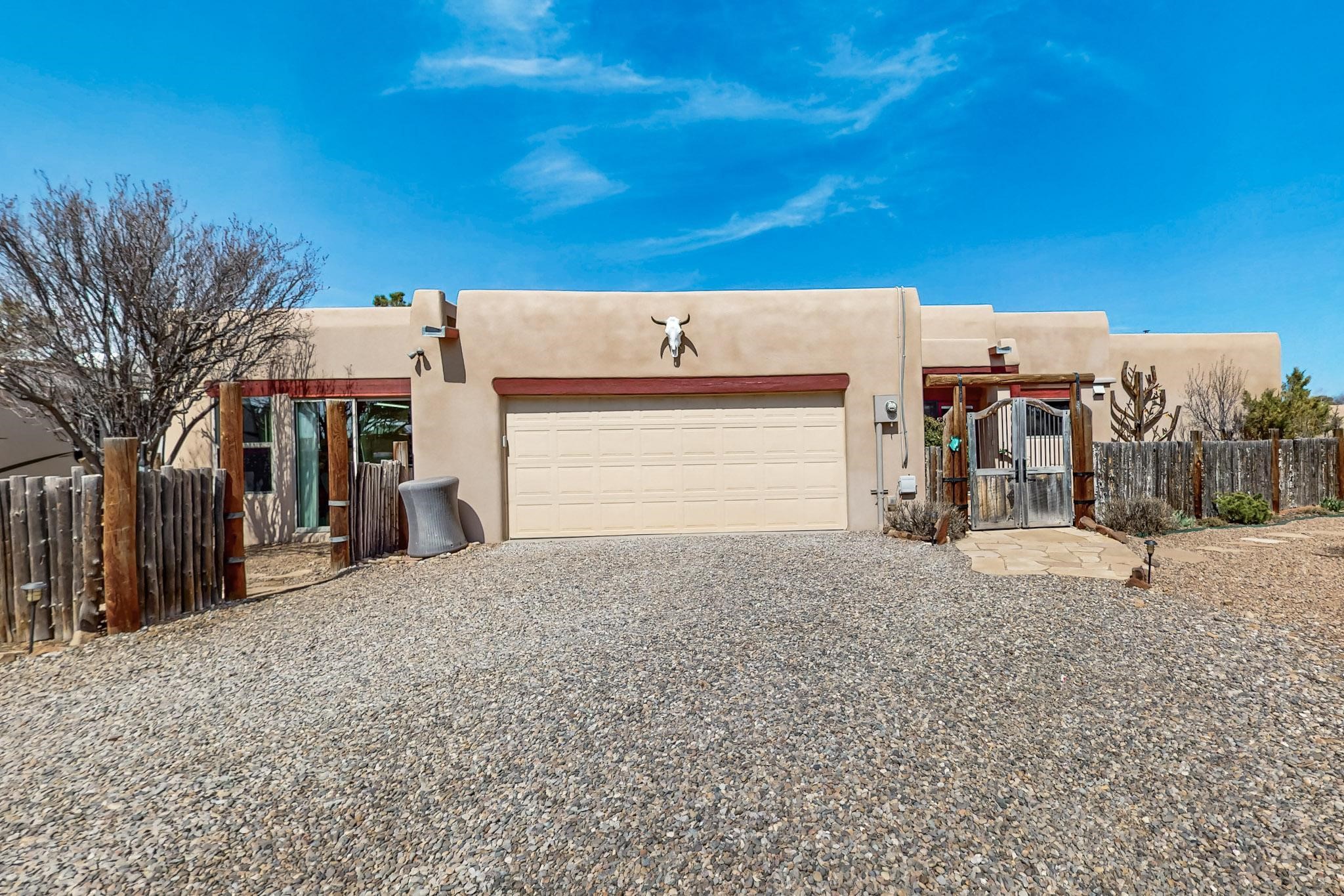 Lovely contemporary pueblo open plan design custom built by the builder for himself, enhanced by wonderful handcrafted additional Santa Fe features by the current owners. The refreshed kitchen area has added southwestern touches, custom hardware and cabinetry, granite countertop and newer appliances. There are two mini splits for air-conditioning and supplemental heat, the radiant heating is believed to be Pex, boiler serviced and new hot water heater in 2025. The stucco was redone in 2024, and the roof upgraded in 2025 with a 2 year warranty. The 2 car finished garage has an added 3rd bay/workshop/studio plus there is an approved RV parking area. The fabulous exterior metal artwork outside will stay, there is a sunset bench, walkways and private landscaped north patio with Jemez and north mountain views. This home has access to all Eldorado amenities, easy reach to parks, trails, local library, senior centre, shopping, schools and only minutes into Santa Fe.
