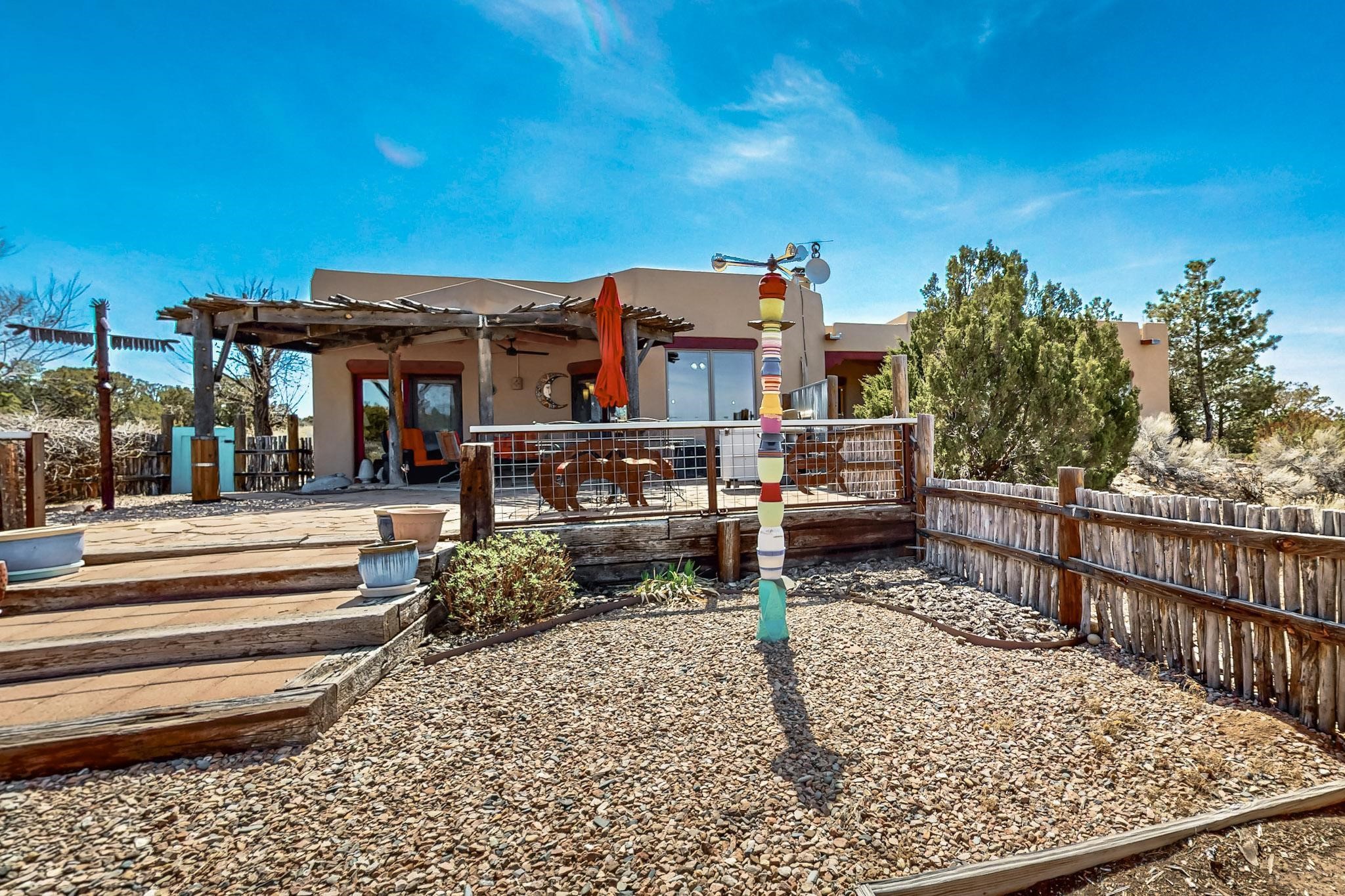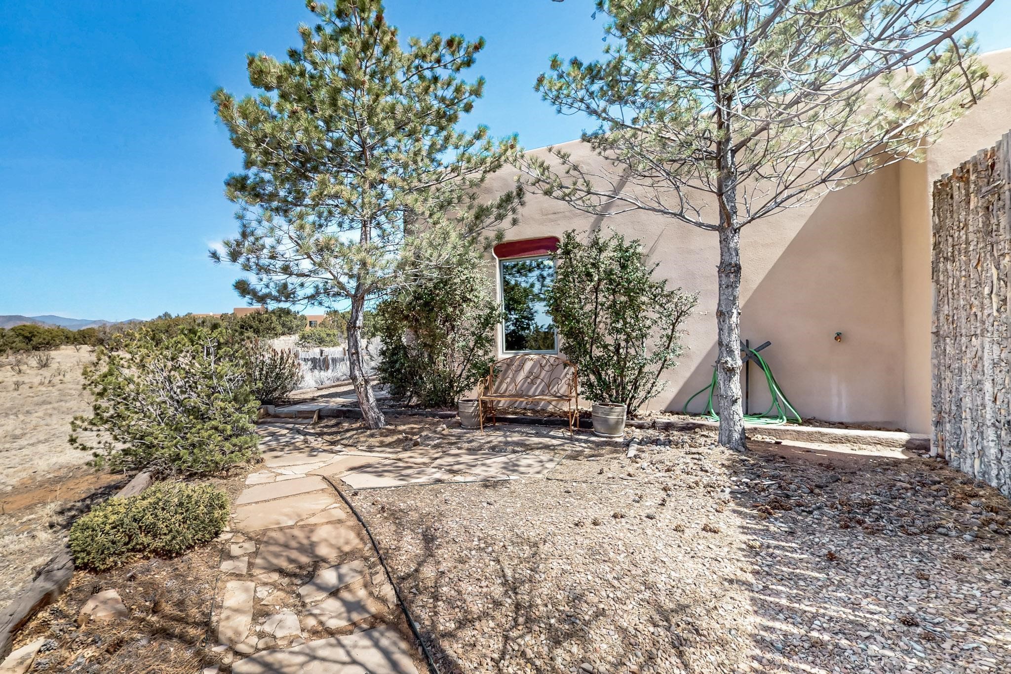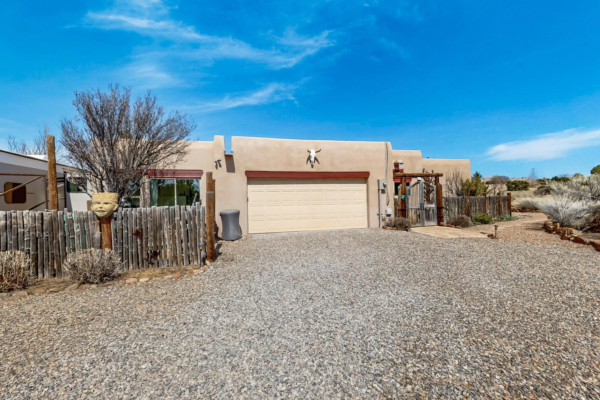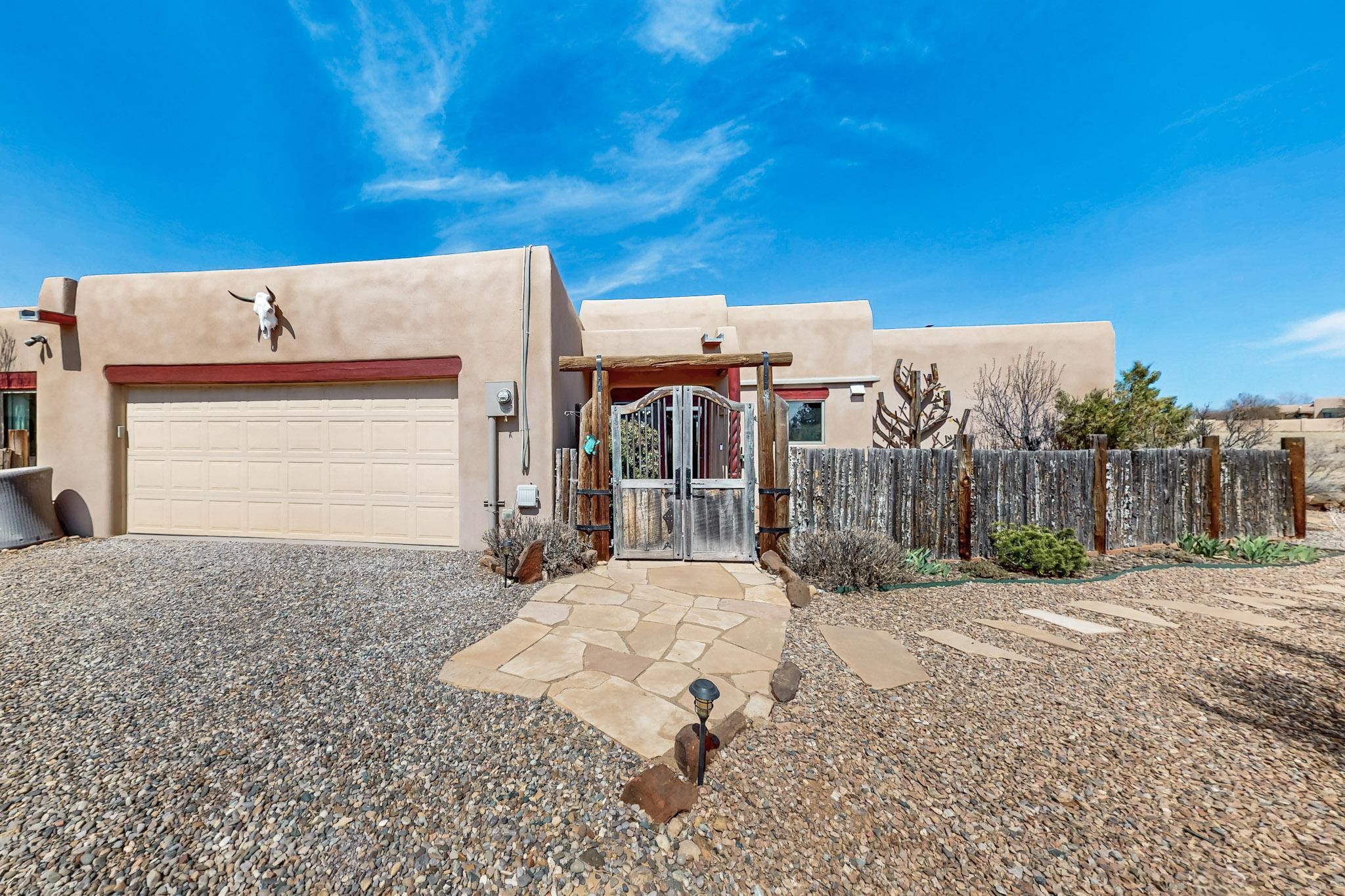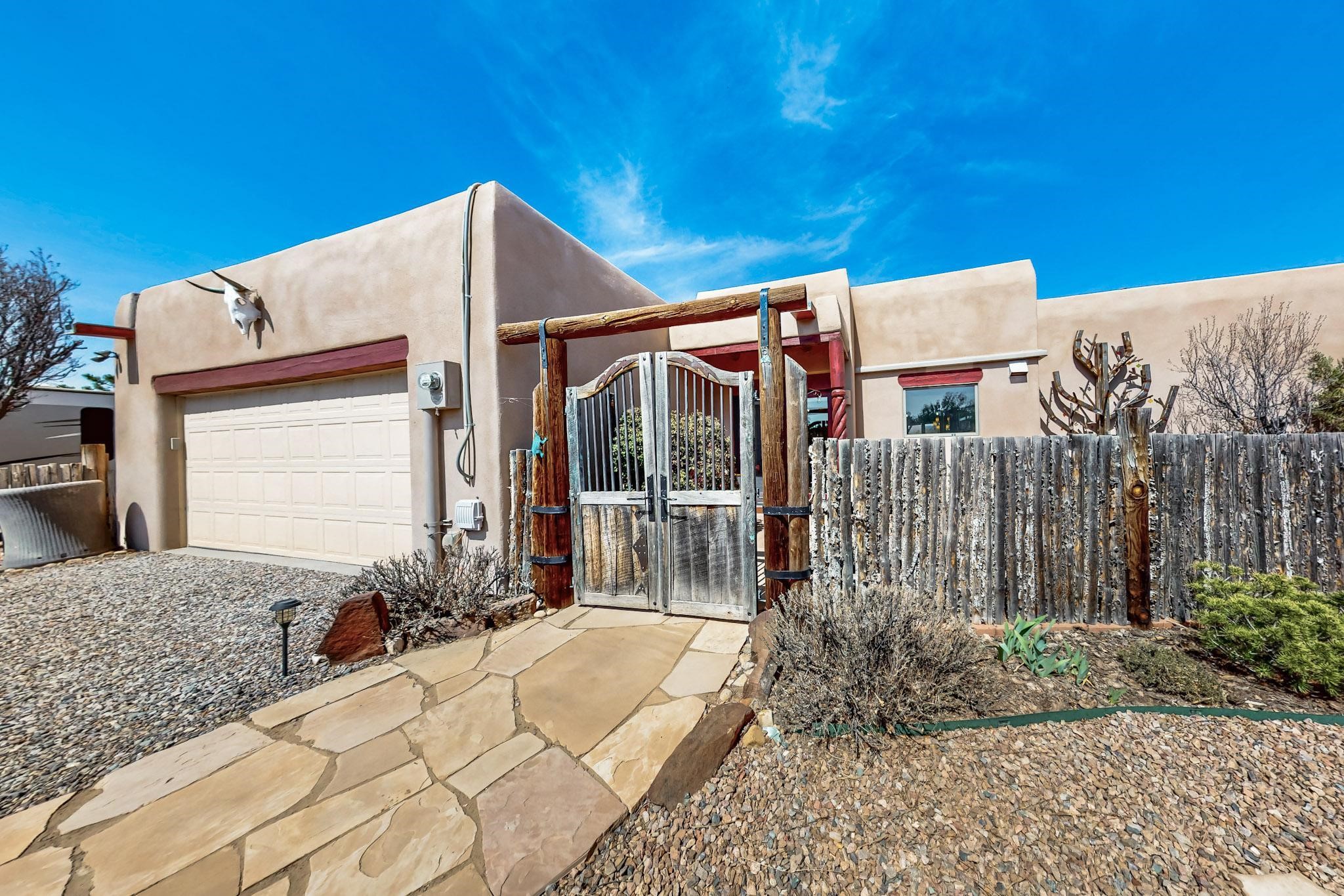 Lovely contemporary pueblo open plan design custom built by the builder for himself, enhanced by wonderful handcrafted additional Santa Fe features by the current owners. The refreshed kitchen area has added southwestern touches, custom hardware and cabinetry, granite countertop and newer appliances. There are two mini splits for air-conditioning and supplemental heat, the radiant heating is believed to be Pex, boiler serviced and new hot water heater in 2025. The stucco was redone in 2024, and the roof upgraded in 2025 with a 2 year warranty. The 2 car finished garage has an added 3rd bay/workshop/studio plus there is an approved RV parking area. The fabulous exterior metal artwork outside will stay, there is a sunset bench, walkways and private landscaped north patio with Jemez and north mountain views. This home has access to all Eldorado amenities, easy reach to parks, trails, local library, senior centre, shopping, schools and only minutes into Santa Fe.