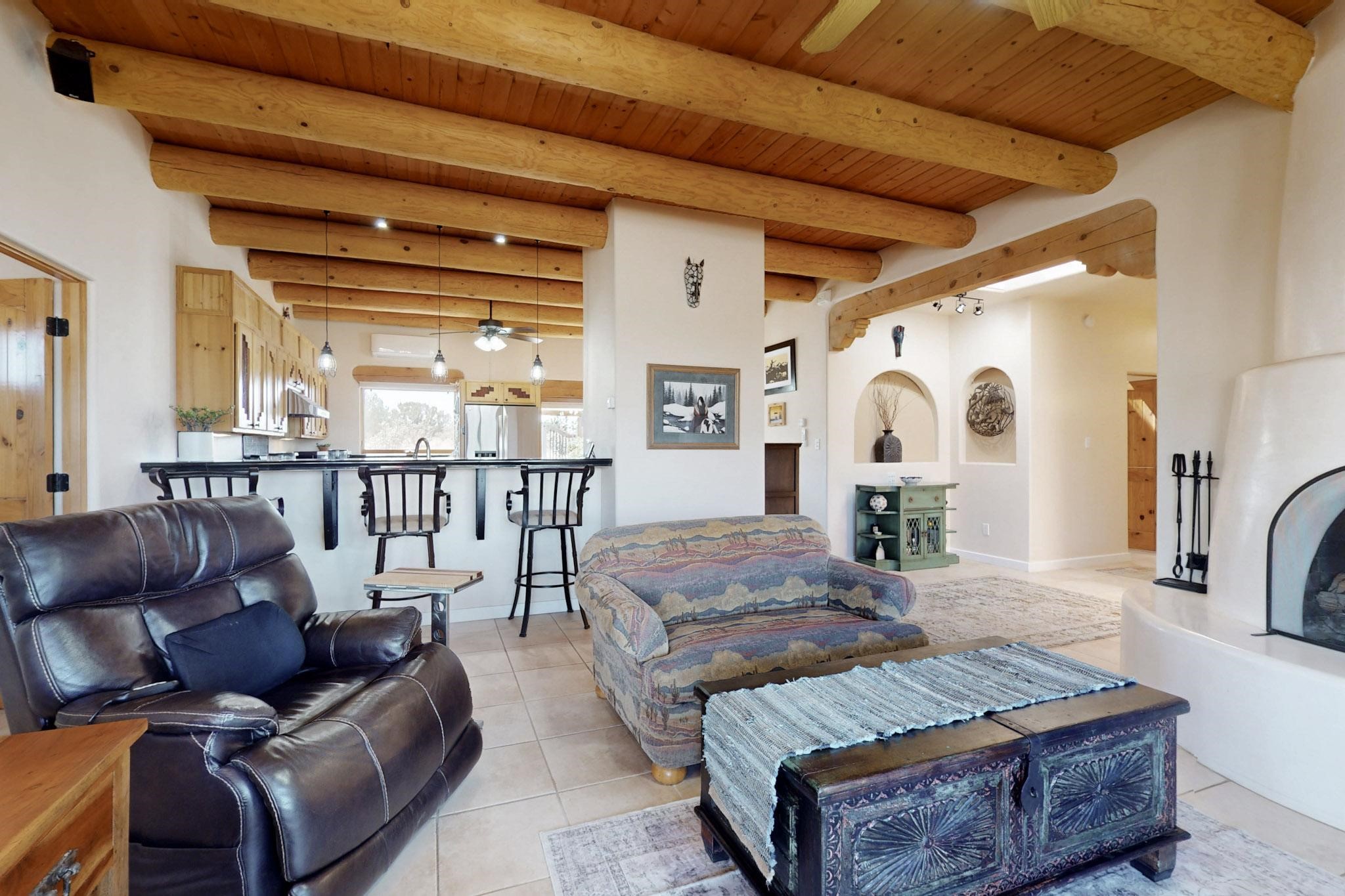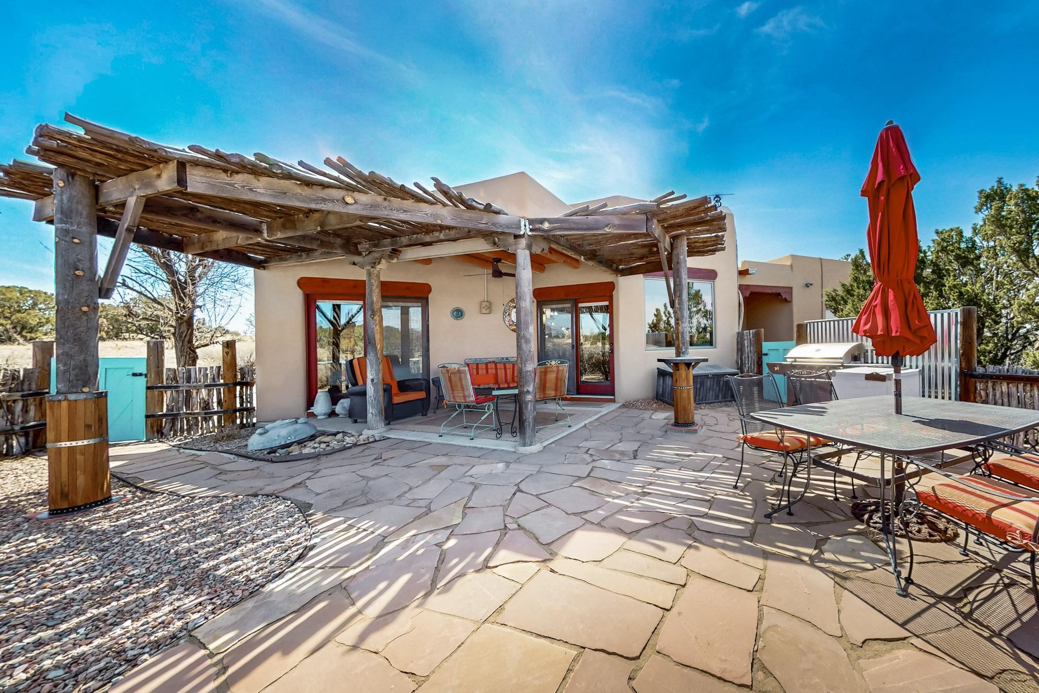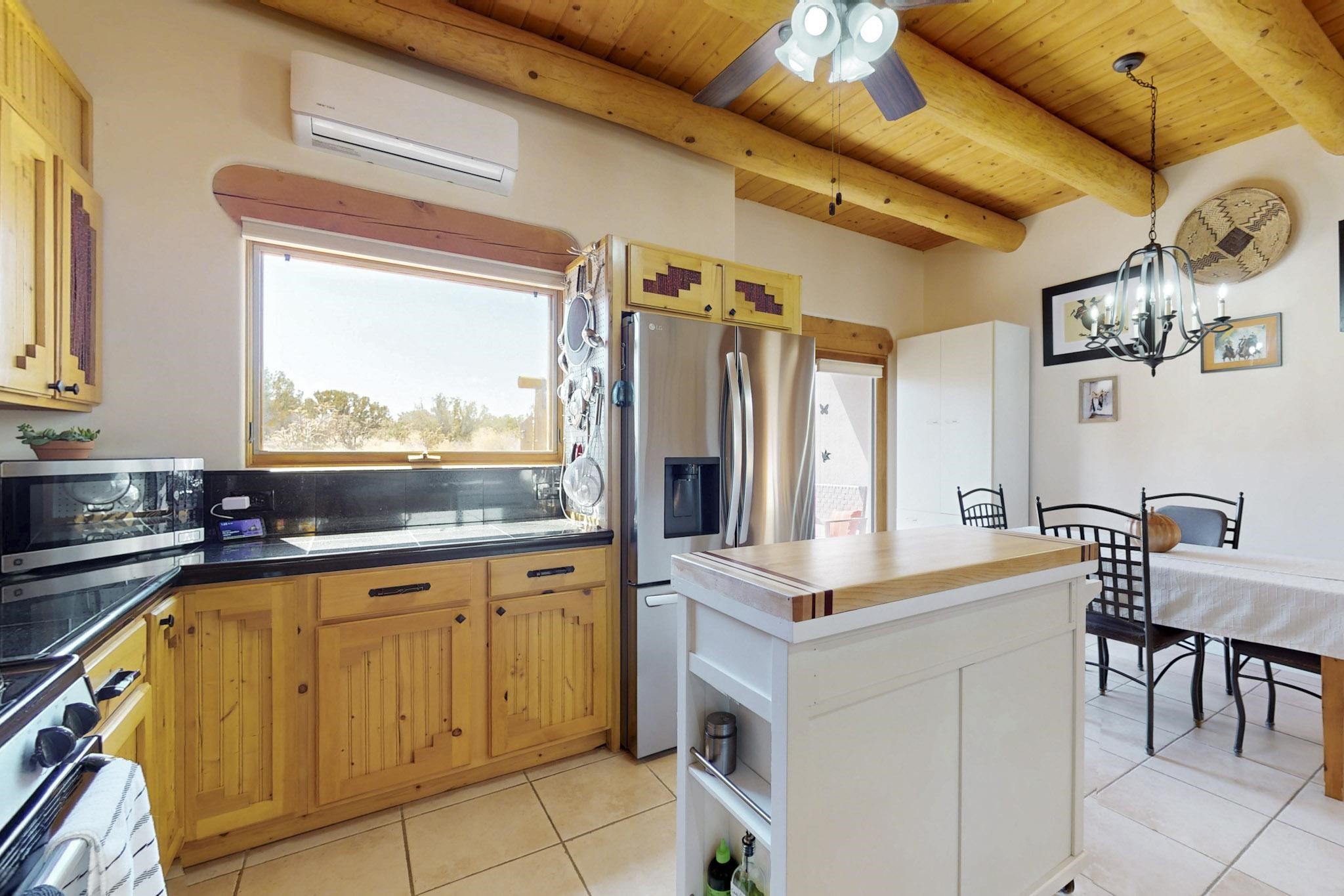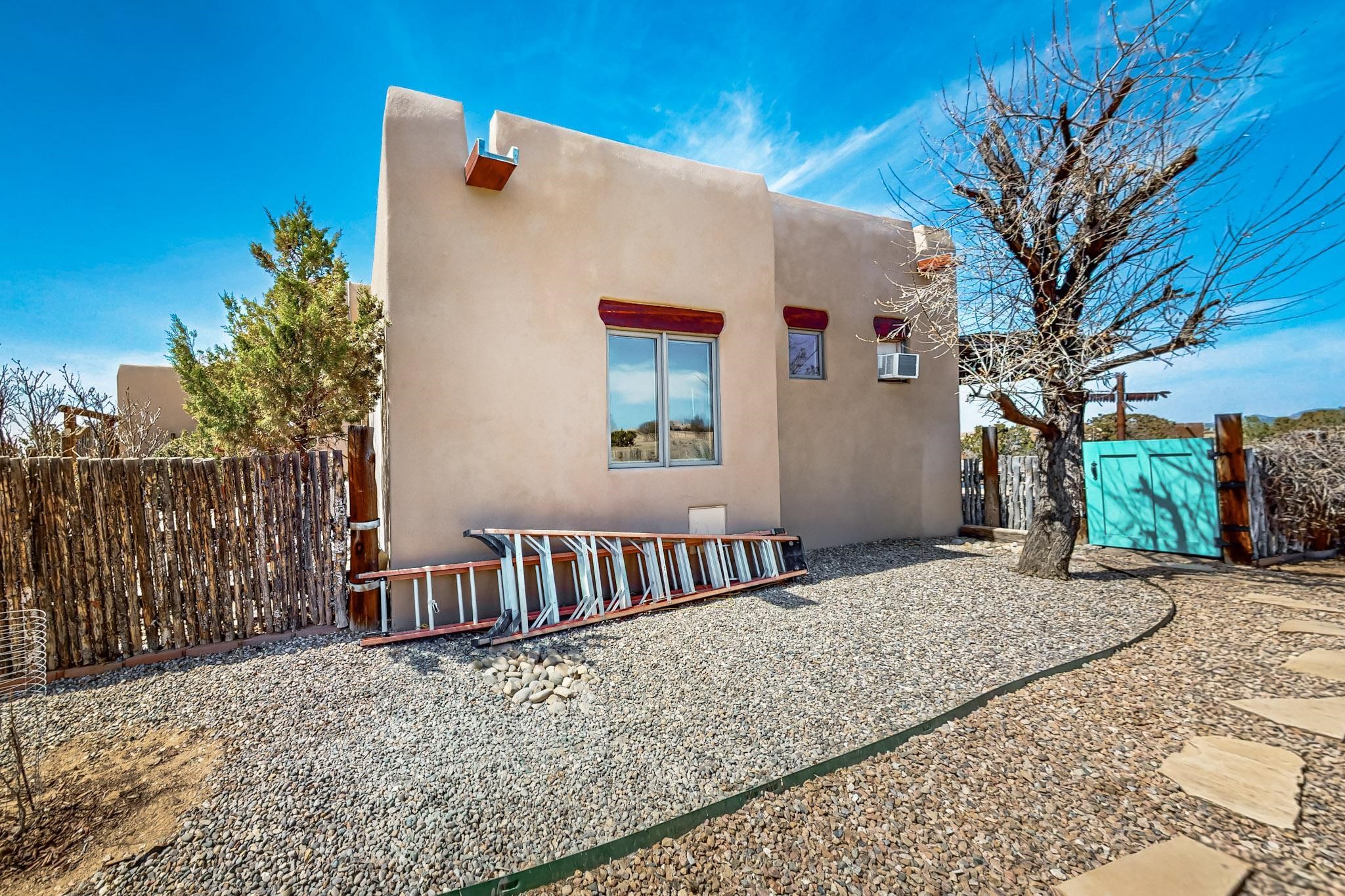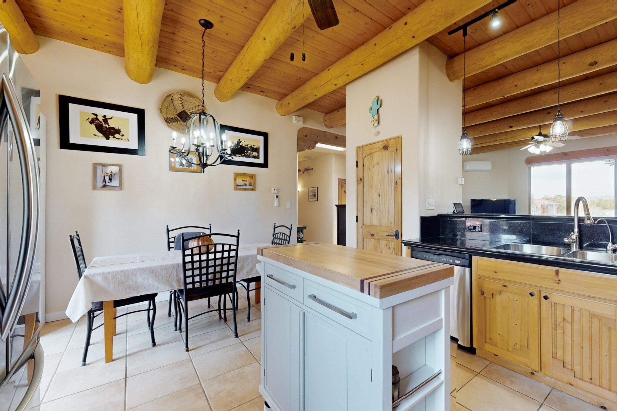 Lovely contemporary pueblo open plan design custom built by the builder for himself, enhanced by wonderful handcrafted additional Santa Fe features by the current owners. The refreshed kitchen area has added southwestern touches, custom hardware and cabinetry, granite countertop and newer appliances. There are two mini splits for air-conditioning and supplemental heat, the radiant heating is believed to be Pex, boiler serviced and new hot water heater in 2025. The stucco was redone in 2024, and the roof upgraded in 2025 with a 2 year warranty. The 2 car finished garage has an added 3rd bay/workshop/studio plus there is an approved RV parking area. The fabulous exterior metal artwork outside will stay, there is a sunset bench, walkways and private landscaped north patio with Jemez and north mountain views. This home has access to all Eldorado amenities, easy reach to parks, trails, local library, senior centre, shopping, schools and only minutes into Santa Fe.