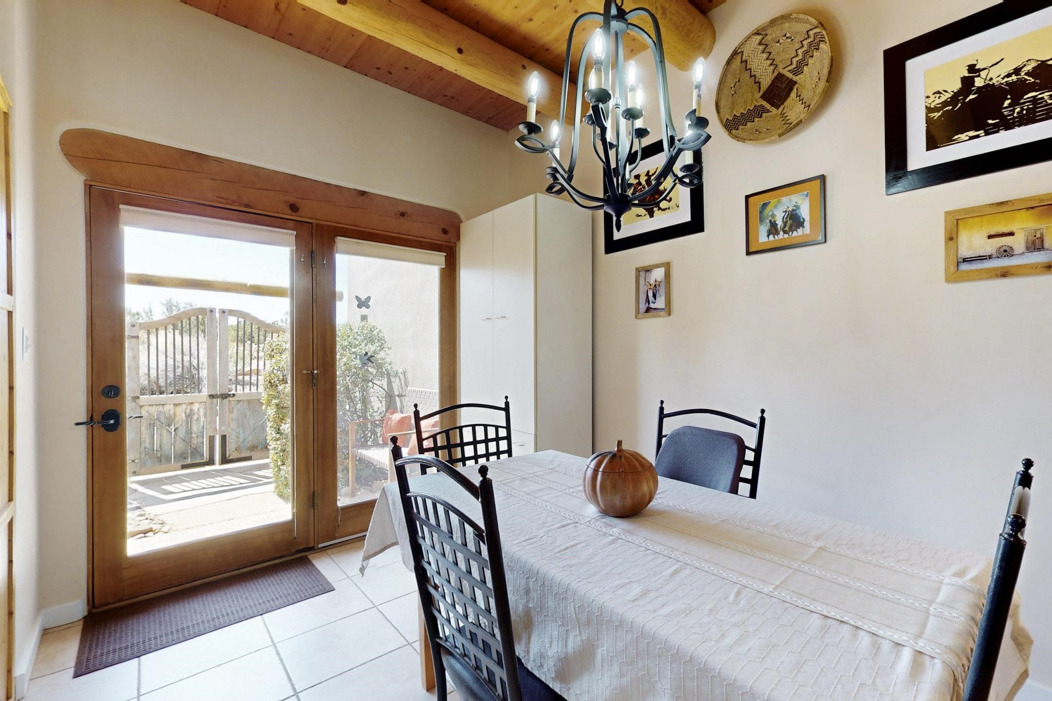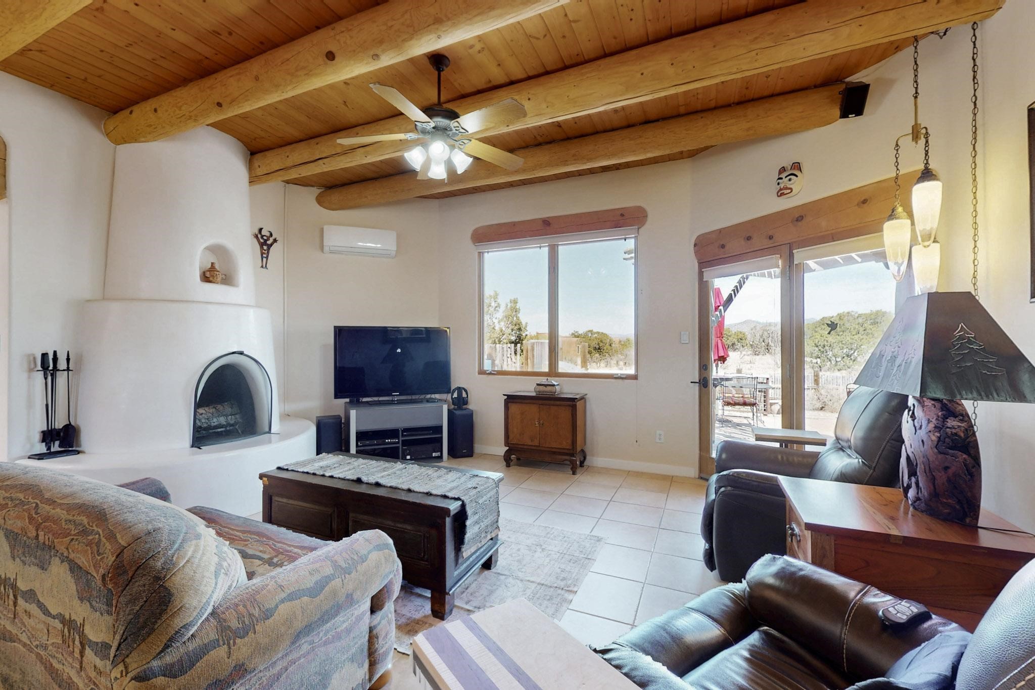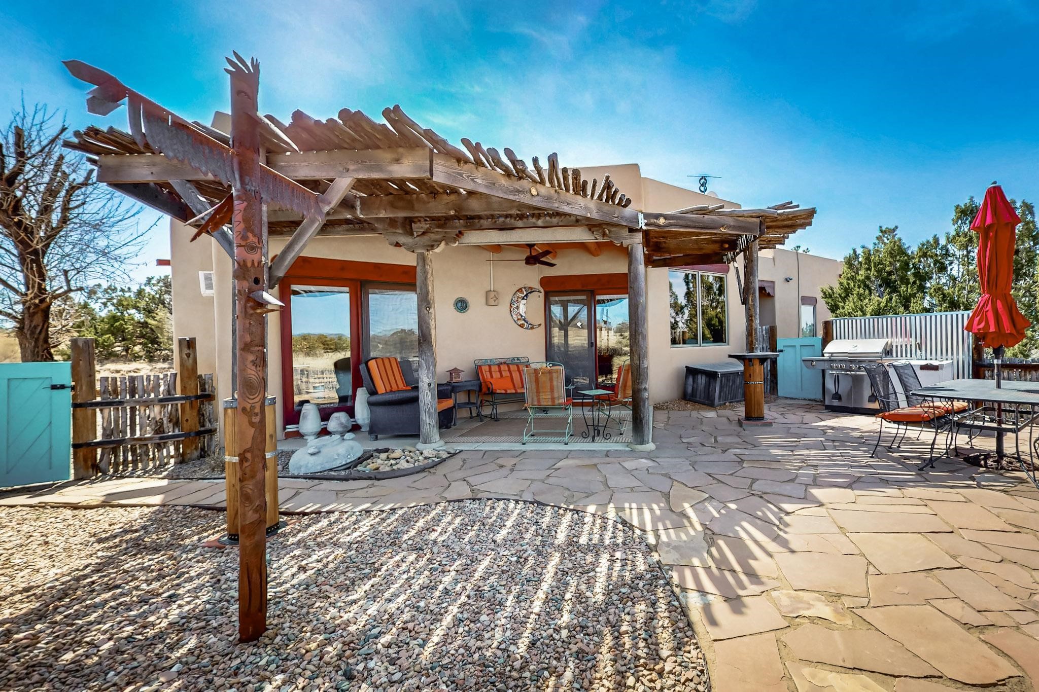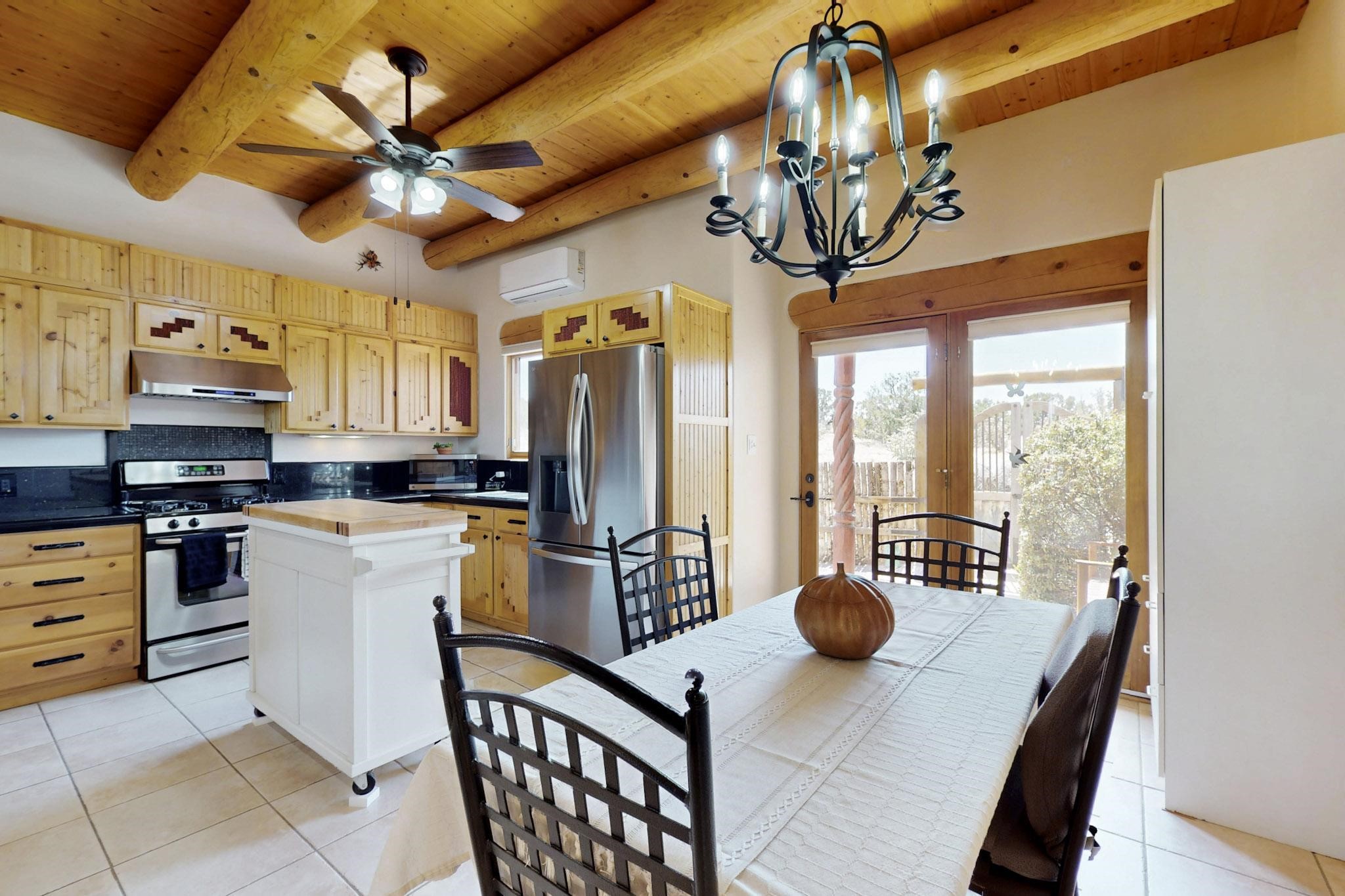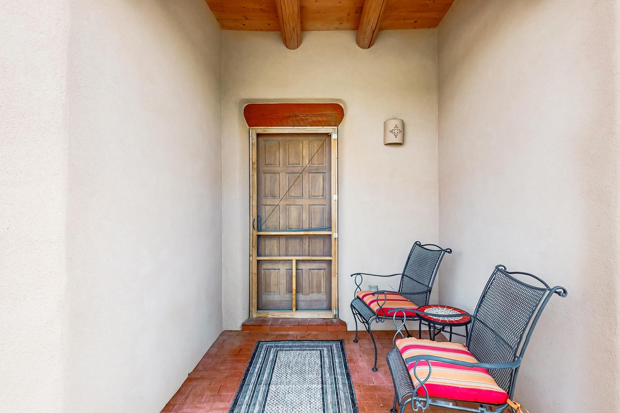 Lovely contemporary pueblo open plan design custom built by the builder for himself, enhanced by wonderful handcrafted additional Santa Fe features by the current owners. The refreshed kitchen area has added southwestern touches, custom hardware and cabinetry, granite countertop and newer appliances. There are two mini splits for air-conditioning and supplemental heat, the radiant heating is believed to be Pex, boiler serviced and new hot water heater in 2025. The stucco was redone in 2024, and the roof upgraded in 2025 with a 2 year warranty. The 2 car finished garage has an added 3rd bay/workshop/studio plus there is an approved RV parking area. The fabulous exterior metal artwork outside will stay, there is a sunset bench, walkways and private landscaped north patio with Jemez and north mountain views. This home has access to all Eldorado amenities, easy reach to parks, trails, local library, senior centre, shopping, schools and only minutes into Santa Fe.