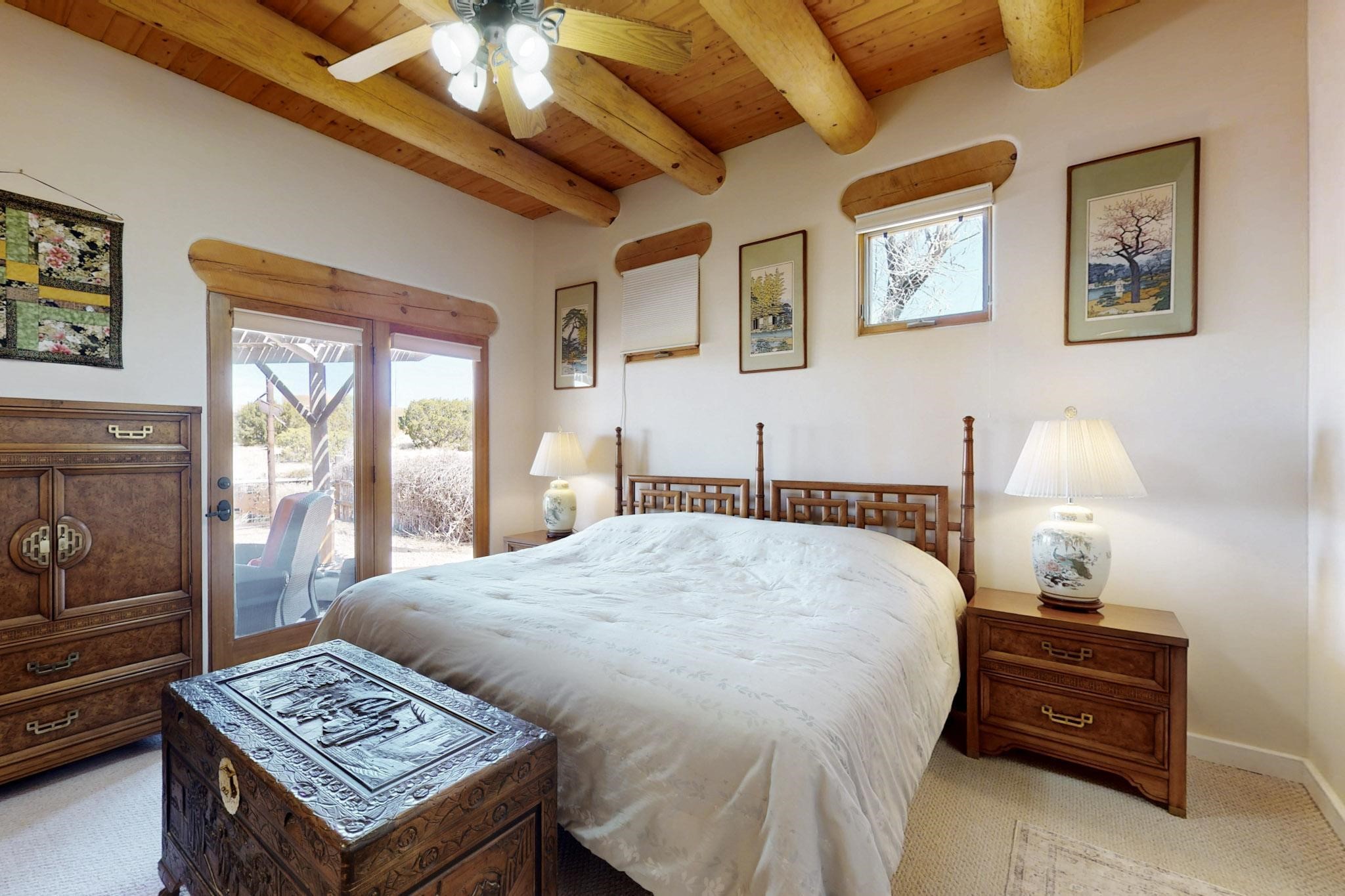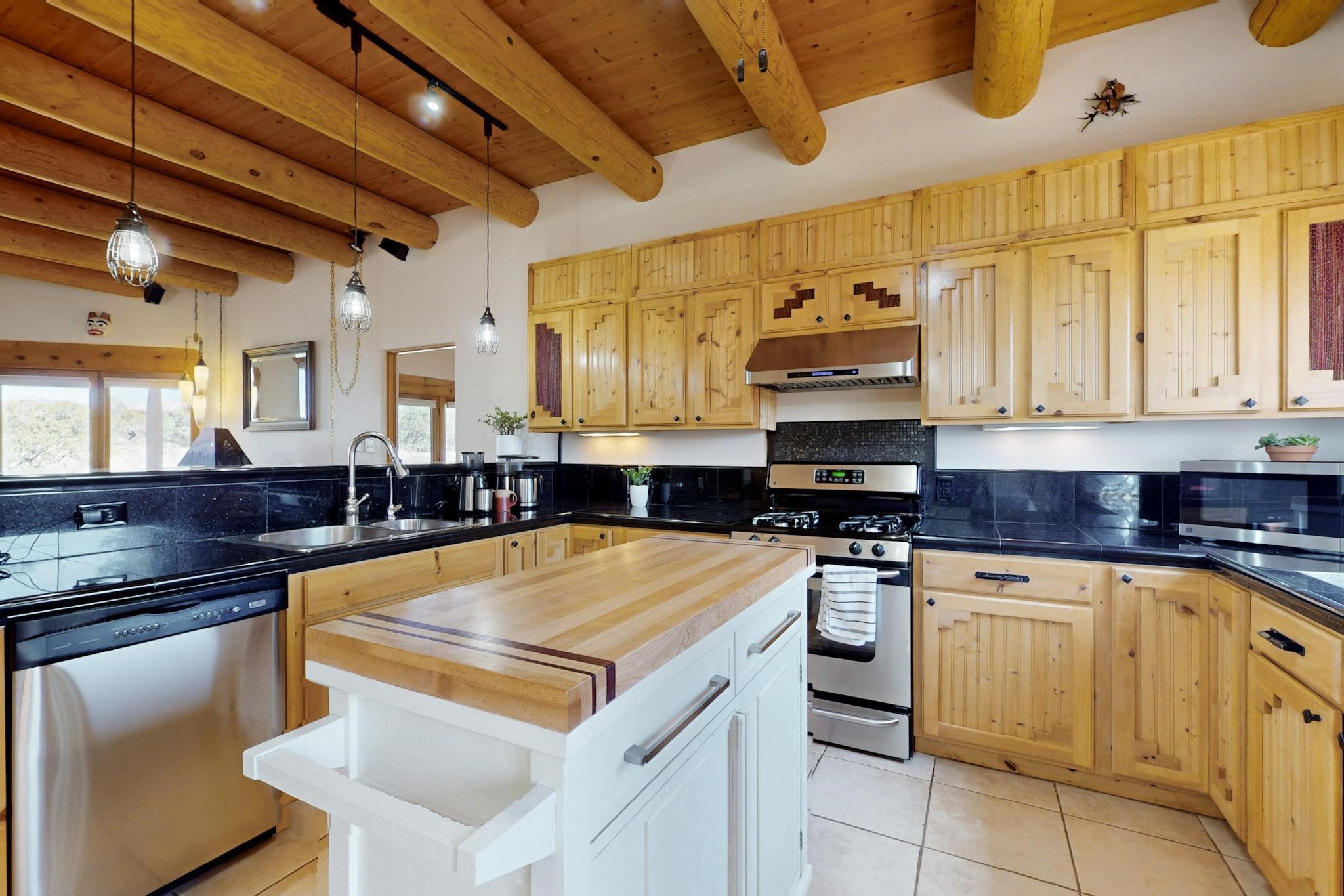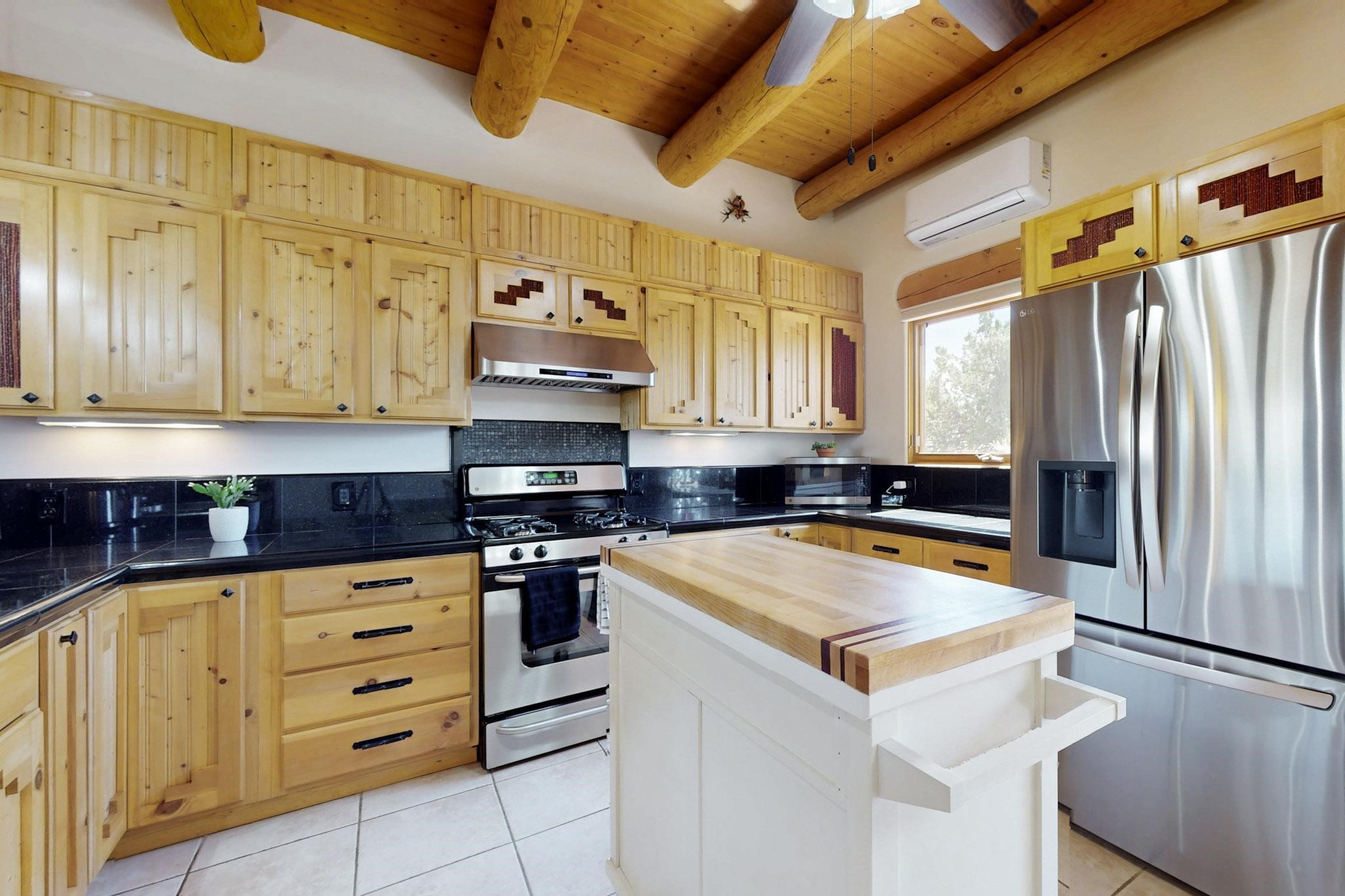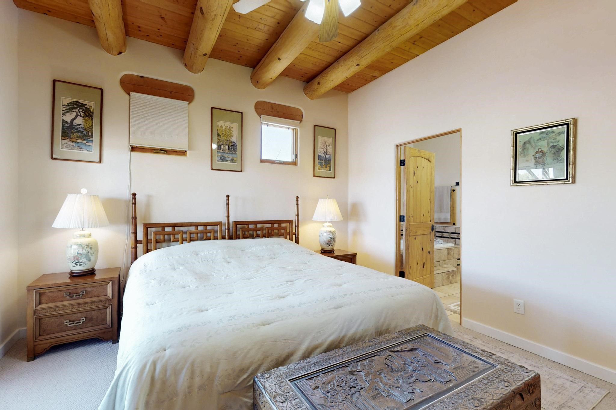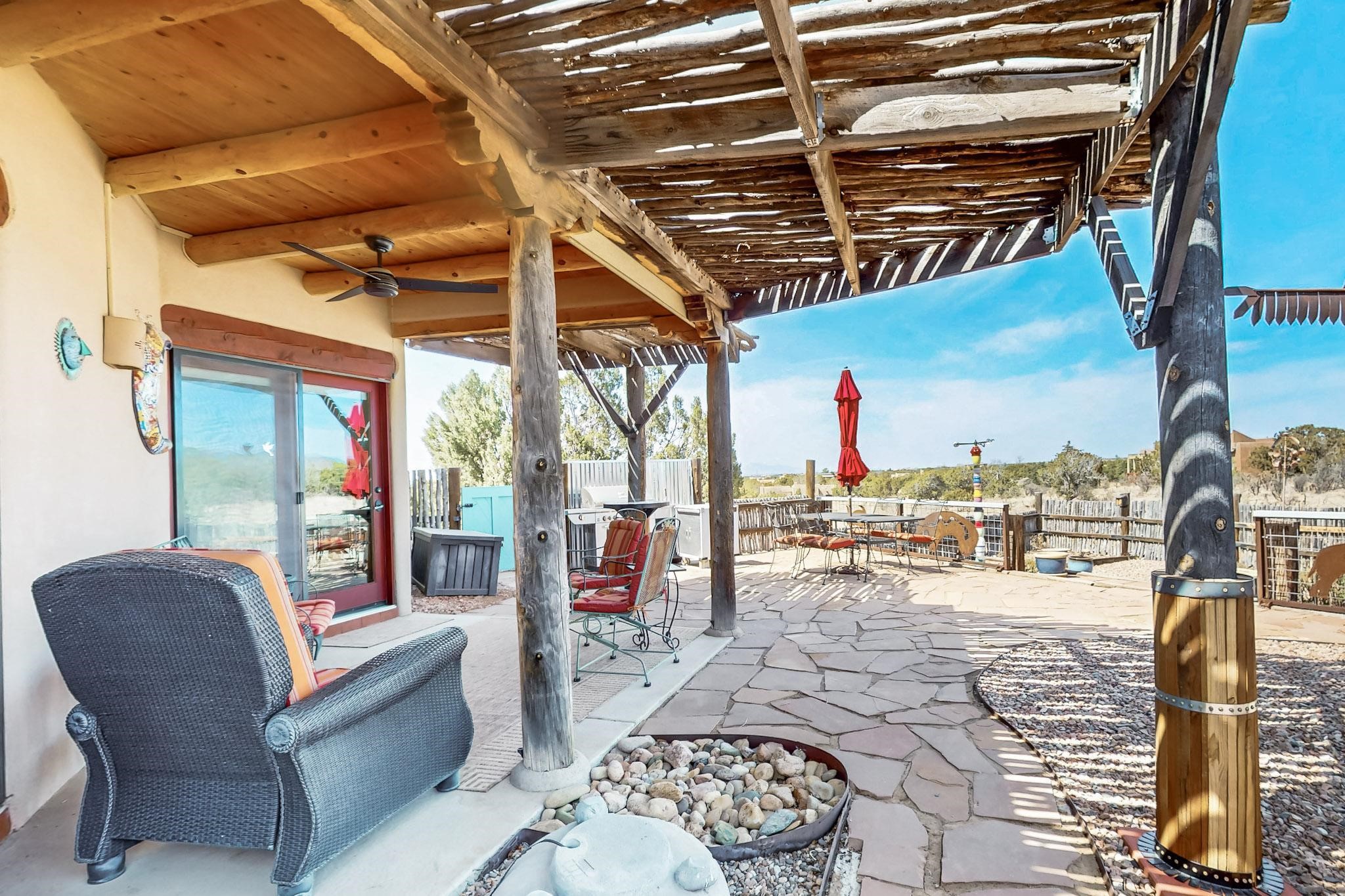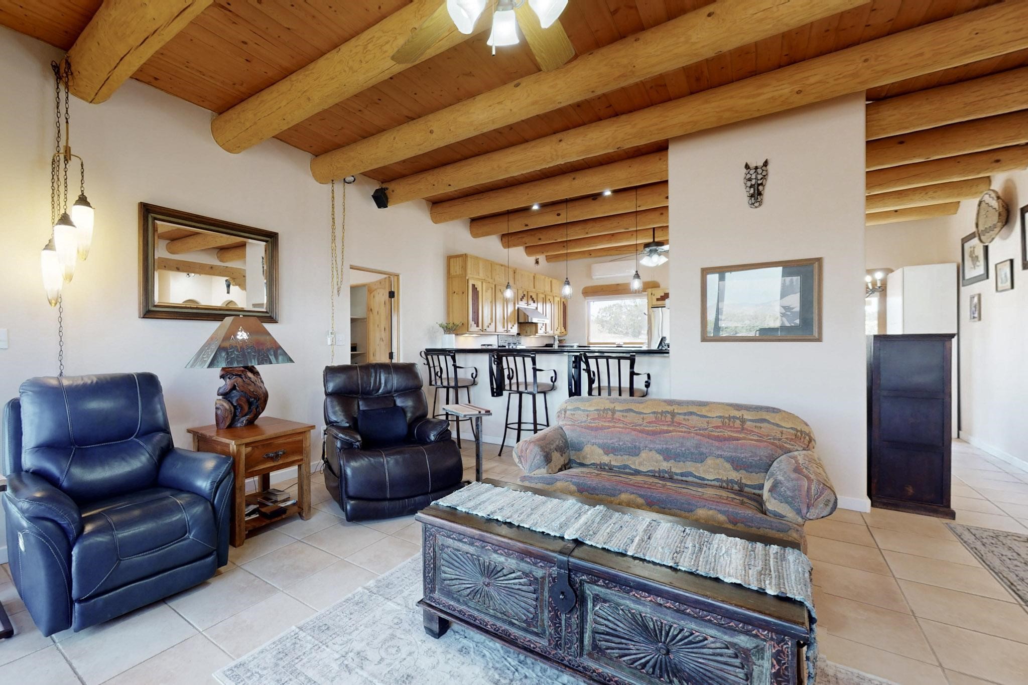 Lovely contemporary pueblo open plan design custom built by the builder for himself, enhanced by wonderful handcrafted additional Santa Fe features by the current owners. The refreshed kitchen area has added southwestern touches, custom hardware and cabinetry, granite countertop and newer appliances. There are two mini splits for air-conditioning and supplemental heat, the radiant heating is believed to be Pex, boiler serviced and new hot water heater in 2025. The stucco was redone in 2024, and the roof upgraded in 2025 with a 2 year warranty. The 2 car finished garage has an added 3rd bay/workshop/studio plus there is an approved RV parking area. The fabulous exterior metal artwork outside will stay, there is a sunset bench, walkways and private landscaped north patio with Jemez and north mountain views. This home has access to all Eldorado amenities, easy reach to parks, trails, local library, senior centre, shopping, schools and only minutes into Santa Fe.