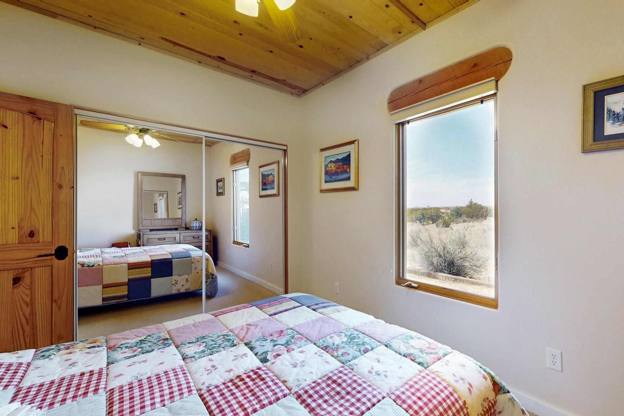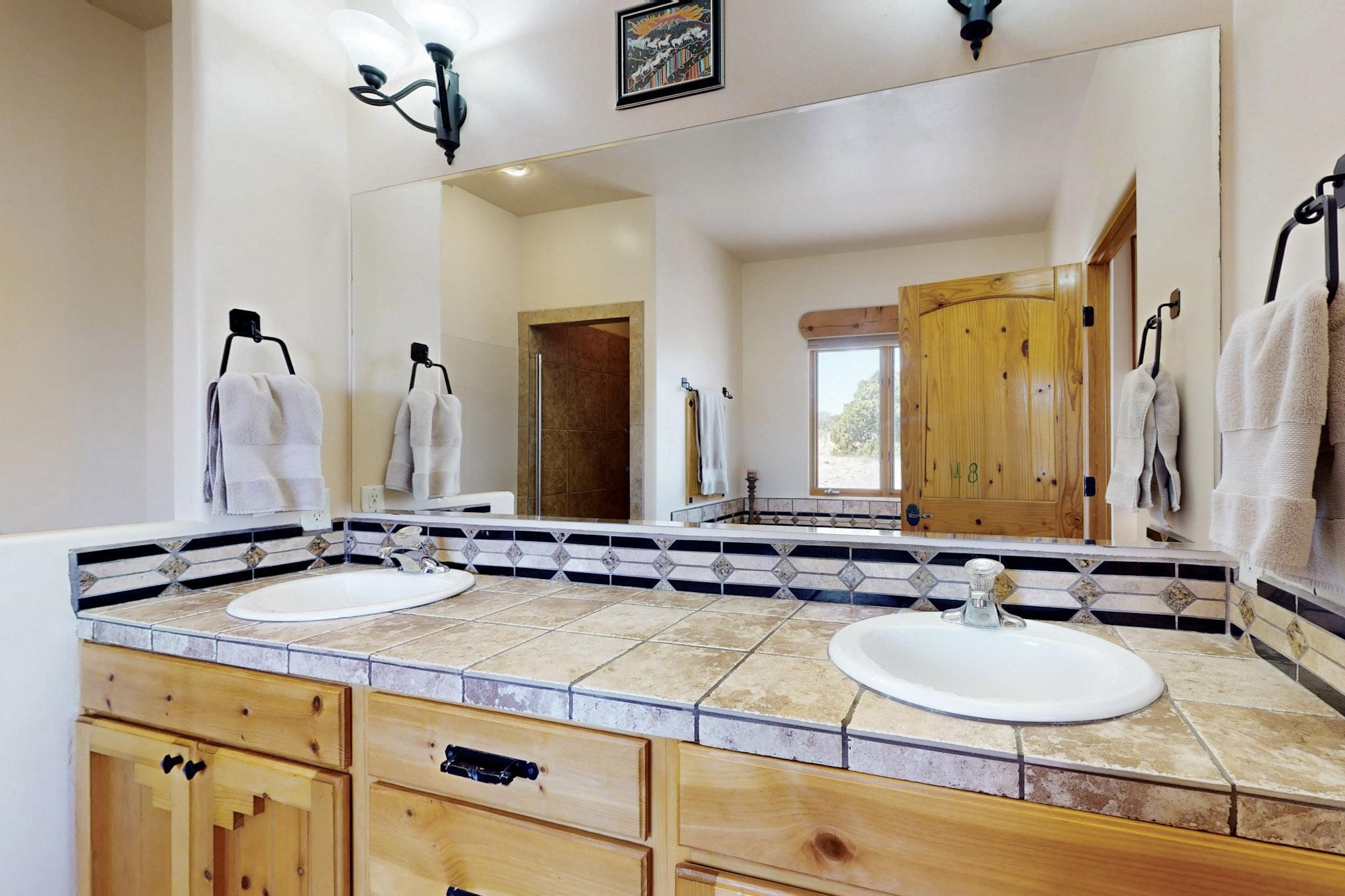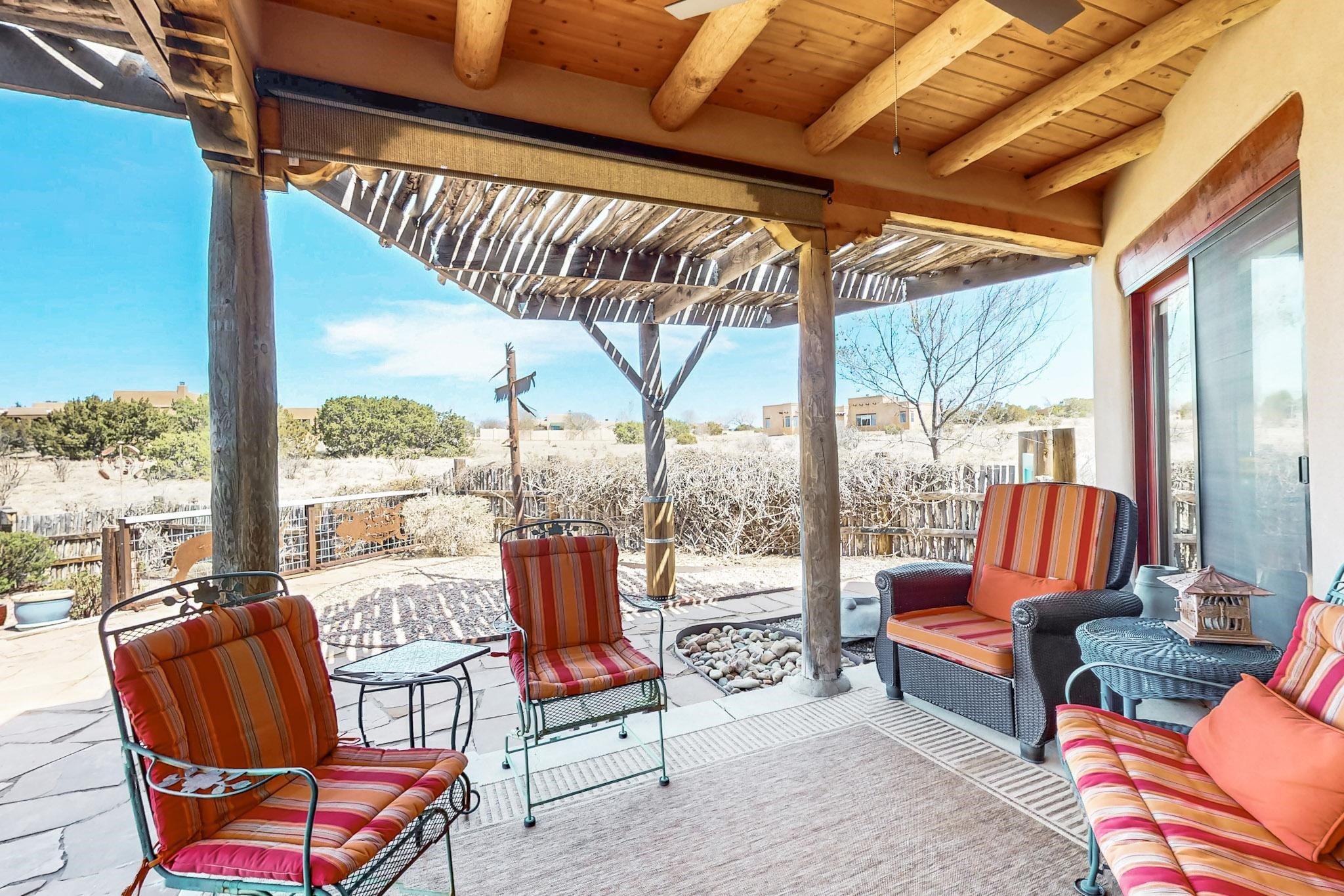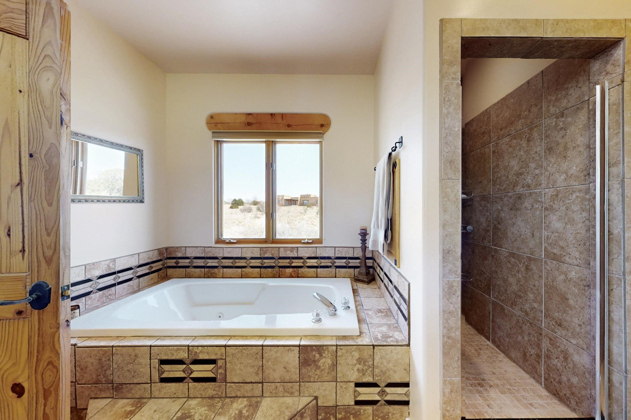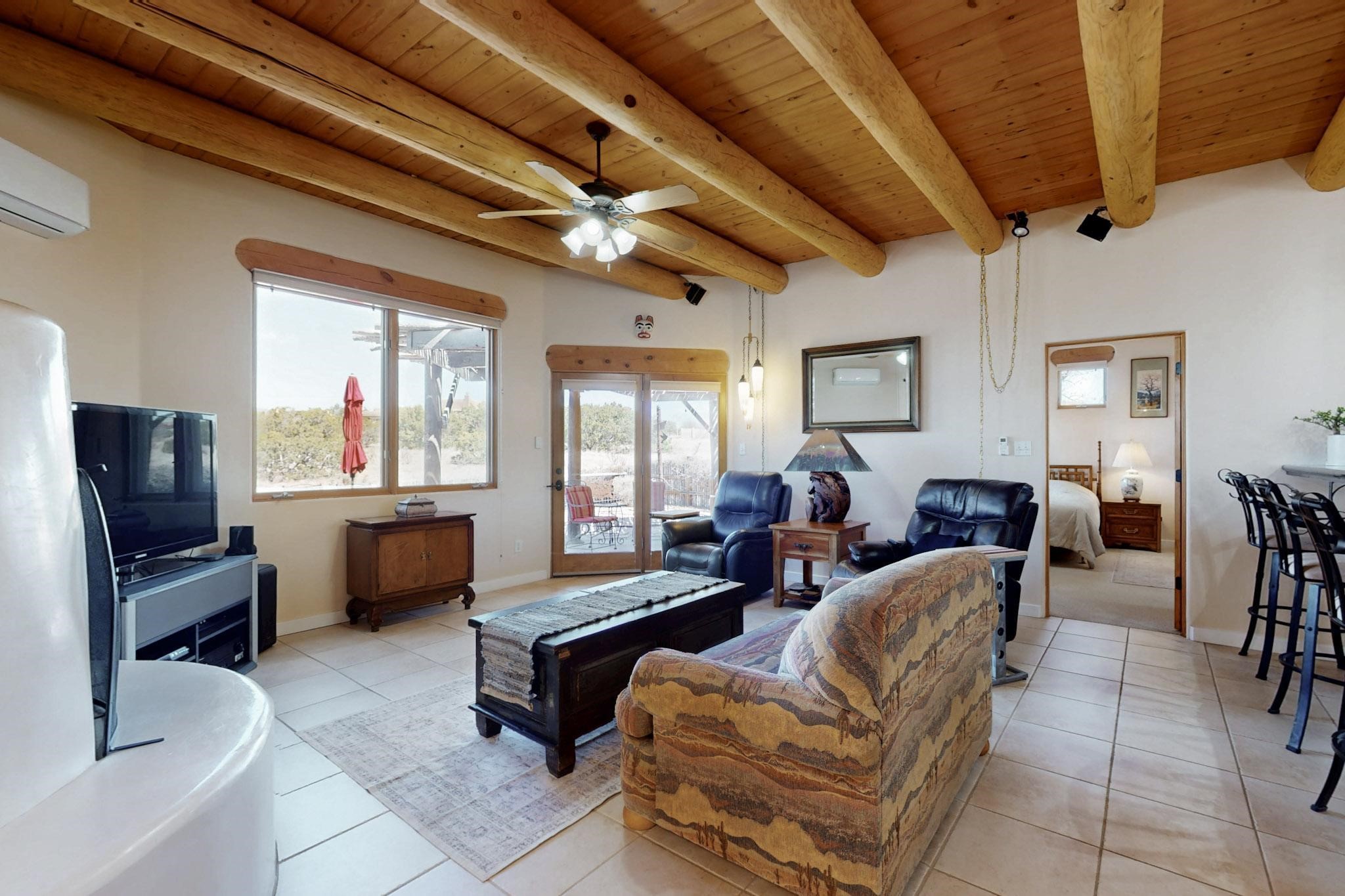 Lovely contemporary pueblo open plan design custom built by the builder for himself, enhanced by wonderful handcrafted additional Santa Fe features by the current owners. The refreshed kitchen area has added southwestern touches, custom hardware and cabinetry, granite countertop and newer appliances. There are two mini splits for air-conditioning and supplemental heat, the radiant heating is believed to be Pex, boiler serviced and new hot water heater in 2025. The stucco was redone in 2024, and the roof upgraded in 2025 with a 2 year warranty. The 2 car finished garage has an added 3rd bay/workshop/studio plus there is an approved RV parking area. The fabulous exterior metal artwork outside will stay, there is a sunset bench, walkways and private landscaped north patio with Jemez and north mountain views. This home has access to all Eldorado amenities, easy reach to parks, trails, local library, senior centre, shopping, schools and only minutes into Santa Fe.
