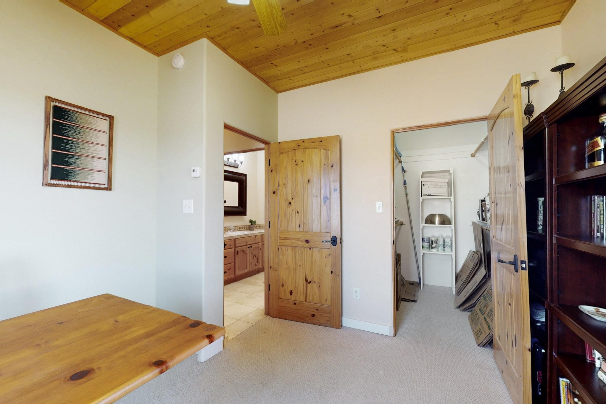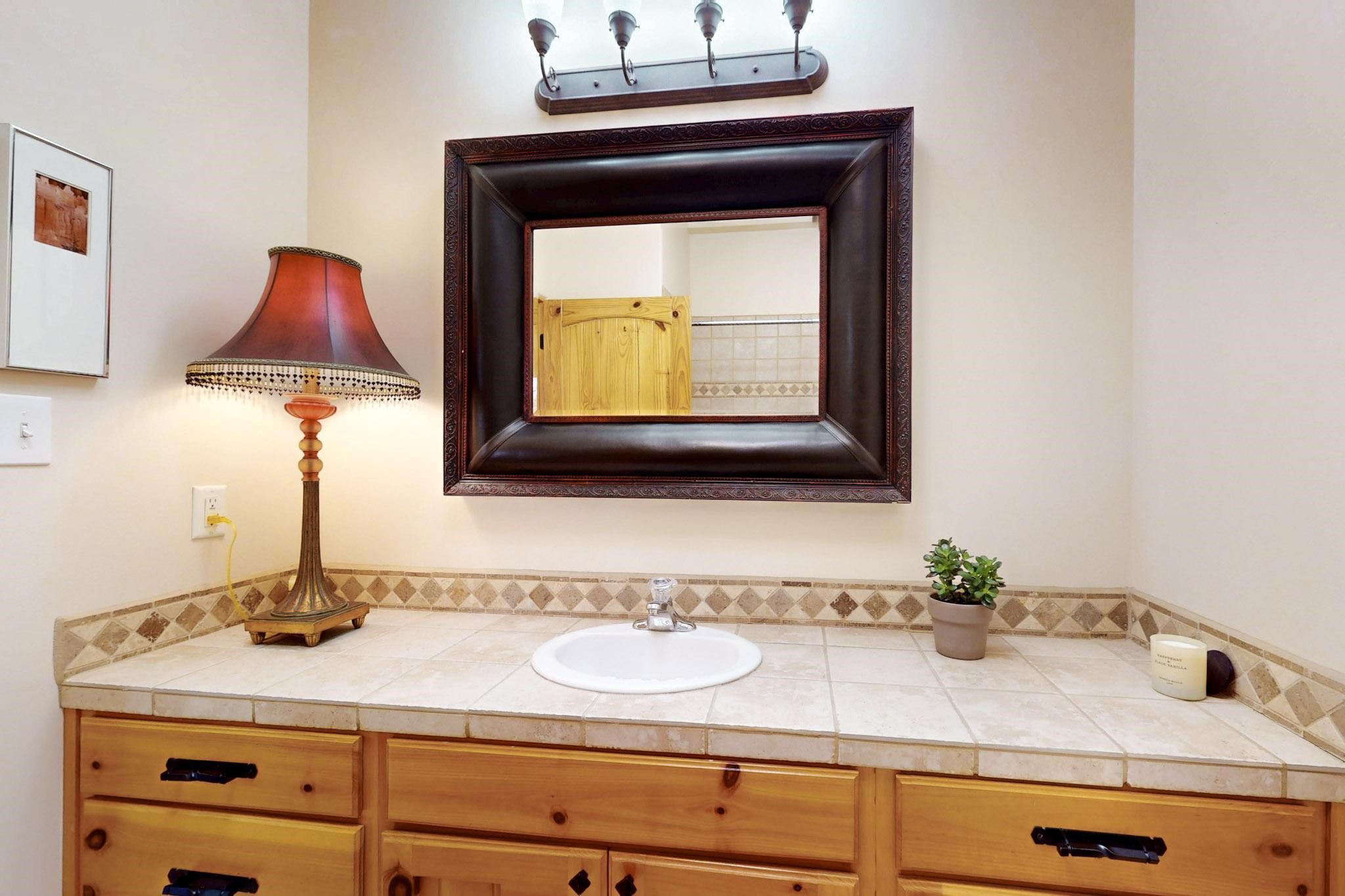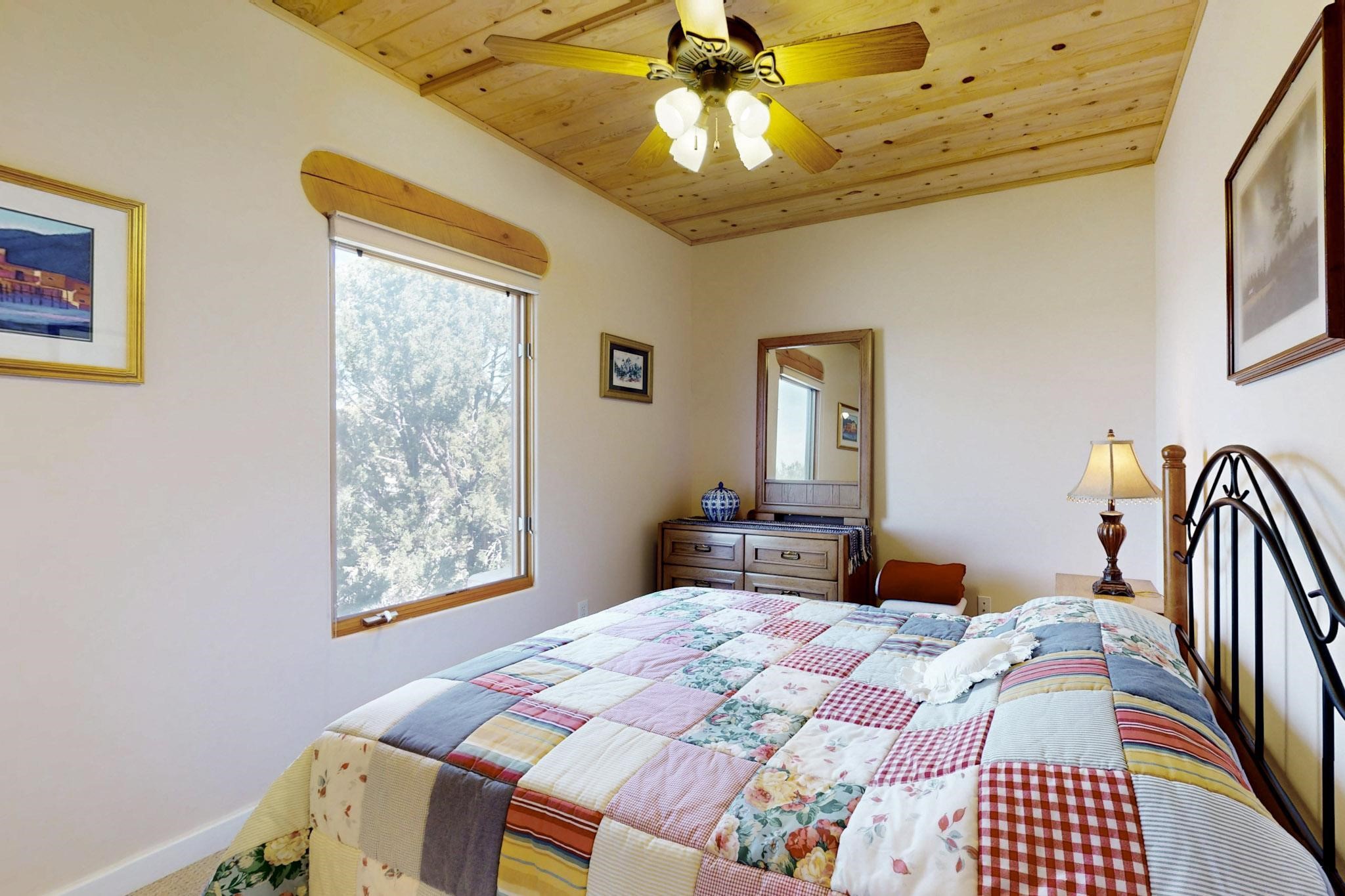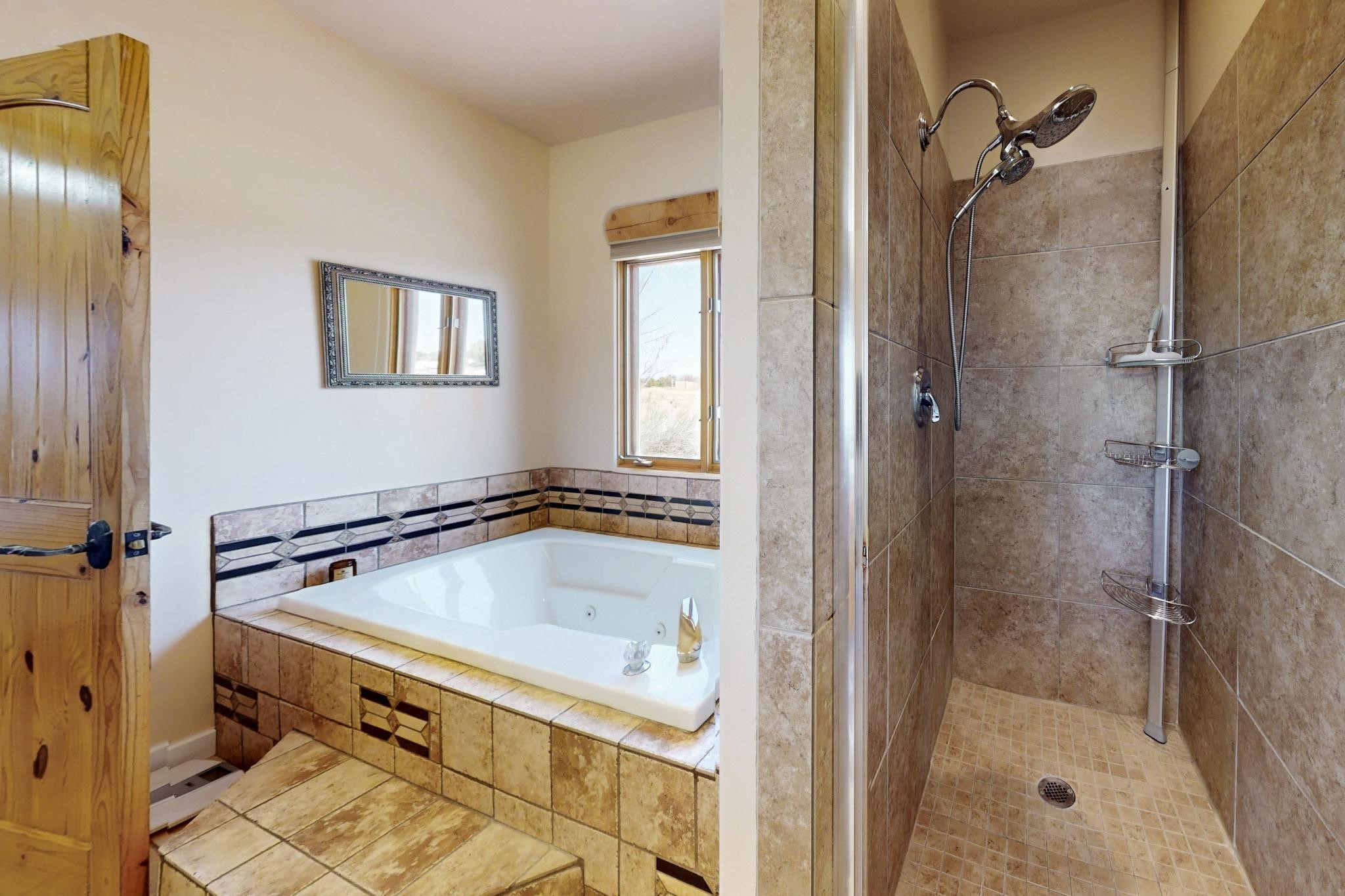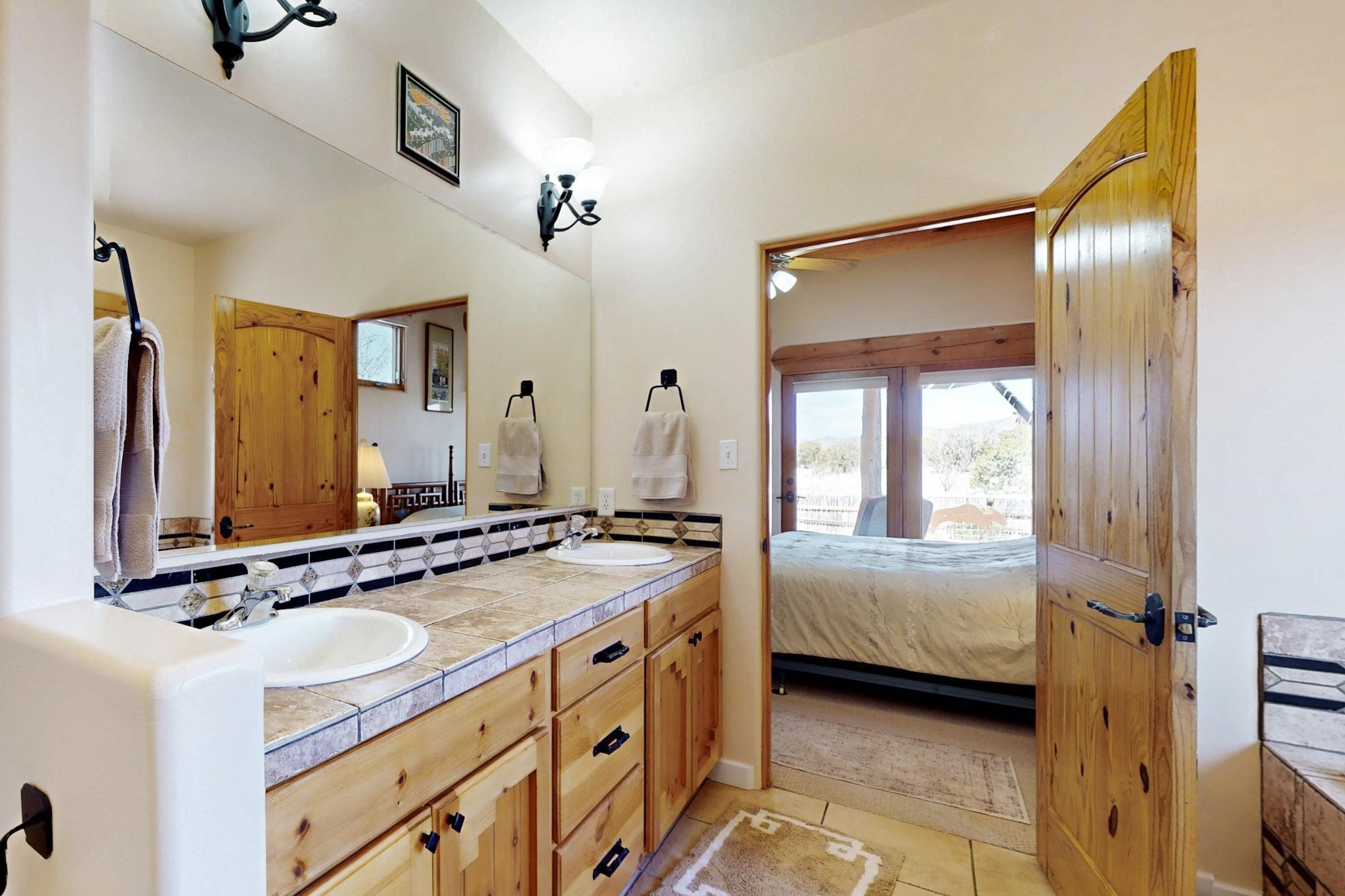 Lovely contemporary pueblo open plan design custom built by the builder for himself, enhanced by wonderful handcrafted additional Santa Fe features by the current owners. The refreshed kitchen area has added southwestern touches, custom hardware and cabinetry, granite countertop and newer appliances. There are two mini splits for air-conditioning and supplemental heat, the radiant heating is believed to be Pex, boiler serviced and new hot water heater in 2025. The stucco was redone in 2024, and the roof upgraded in 2025 with a 2 year warranty. The 2 car finished garage has an added 3rd bay/workshop/studio plus there is an approved RV parking area. The fabulous exterior metal artwork outside will stay, there is a sunset bench, walkways and private landscaped north patio with Jemez and north mountain views. This home has access to all Eldorado amenities, easy reach to parks, trails, local library, senior centre, shopping, schools and only minutes into Santa Fe.