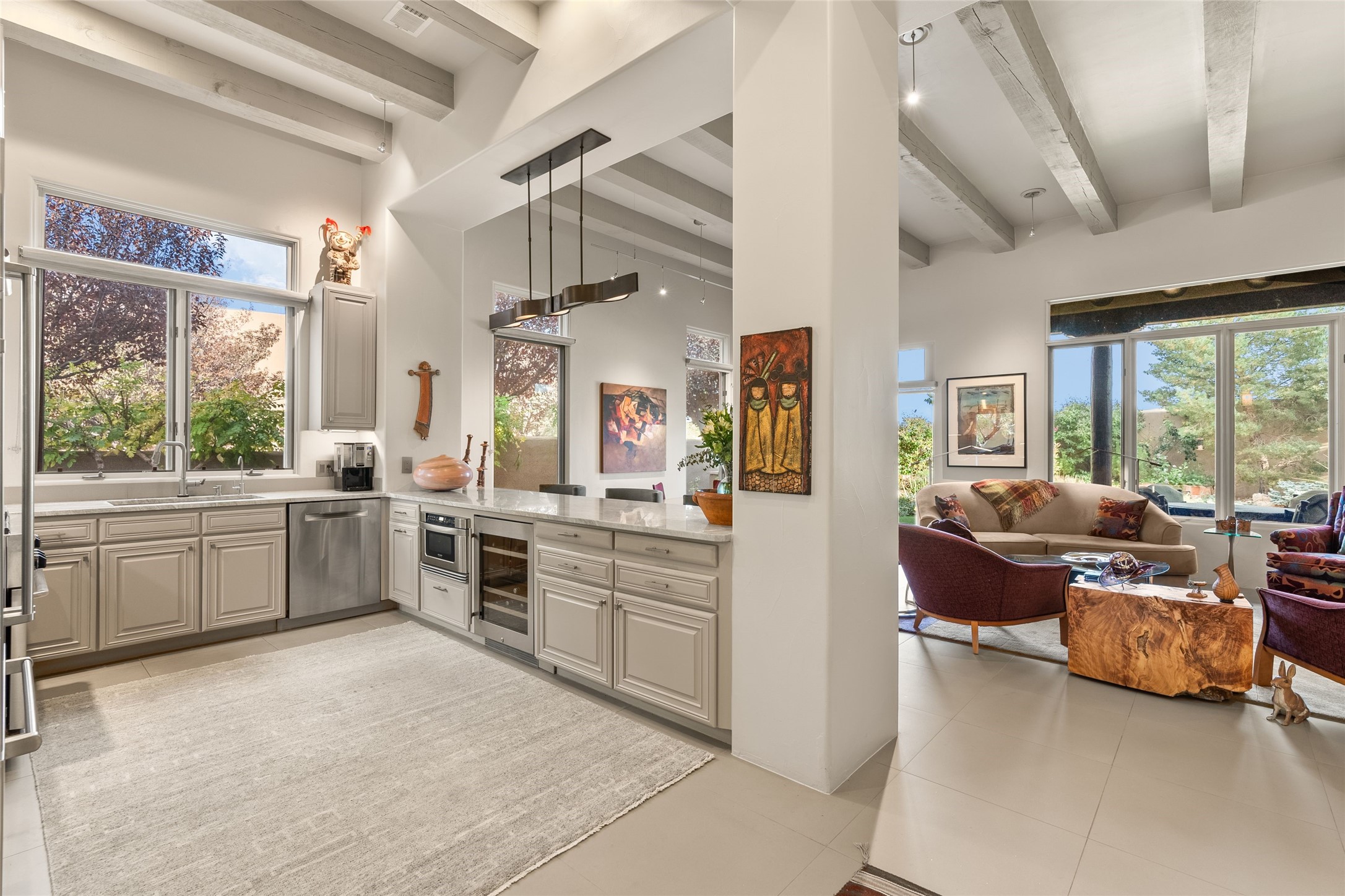 This inviting, Soft Contemporary 2-Bed + Den / 3-Bath home in Gated Las Campanas provides easy, "Lock & Leave" convenience with a gorgeous view of the Sangre de Cristo Mountains. Two rustic wood entry gates lead to the private, intimate entry courtyard, which is beautifully landscaped with a water feature & cozy wood-burning fireplace for entertaining guests. The Main house is an open floor plan with an easy flow from the Living & Dining areas to the Gourmet Kitchen with Taj Majal Quartzite countertop and stainless appliances - Sub Zero refrigerator, a 36-inch Frigidaire gas range/oven (installed in January 2025 & never used), Dacor hood, Bosch dishwasher, Sharp microwave drawer and wine cooler. The Elegant Master Bedroom & Bath offers two separate vanities, oval soaking tub, separate shower and a fabulous California Closet. The Media Room could easily be converted to a Bedroom and has an adjacent Bath. The Private, Detached 1-Bed / 1-Bath Guest Casita offers great privacy for visiting friends & family, with enough room for a King-size bed. The back yard is fully landscaped and walled-in for pets, with a water feature, built-in Viking grill and Sangre de Cristo Mountain view. This home has it all - Contemporary style, Detached Casita and a View of the Sangre de Cristo Mountains.