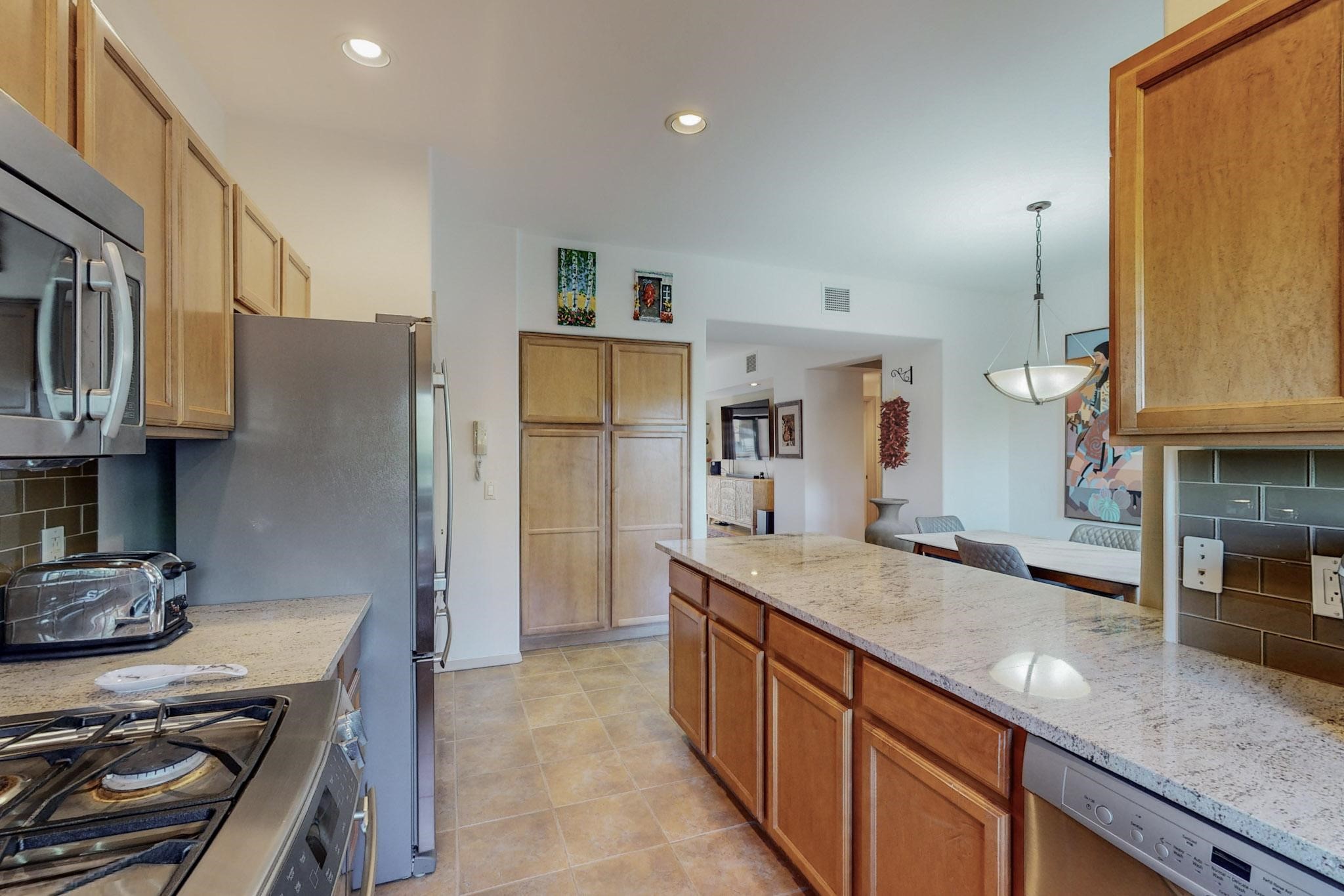 This beautiful home is an urban oasis surrounded by mature trees in a superb midtown location with beautifully inviting landscaped entry and walkways. Close to restaurants and shopping! Perfect for access to walking trails, biking or catching the Rail Runner train just a few blocks away. An upscale and mildly contemporary condo with 2 spacious balconies overlooking a courtyard with lots of greenery, and to the west, views of the Jemez mountains and magnificent colorful sunsets. Light filled, open and very comfortable floor plan with a large, exciting kitchen that includes granite counters and substantial cabinet space including a spacious pantry. The warm hardwood flooring adds additional beauty and dimensions to the home's spacious living area and lends itself well to a variety of layouts. Two comfortable bedrooms, a large bathroom for two and centrally located utility room with a washer & dryer. A surprisingly large 6.50' X 17' ground floor personal storage unit for your seasonal items and sports equipment. Covered parking keeps your vehicle protected from the elements. A NEW roof was added in 2024 and NEW stucco will be going in 2025! This very private and quiet location is centrally located, very affordable for Santa Fe, and is ready for you to call it home!