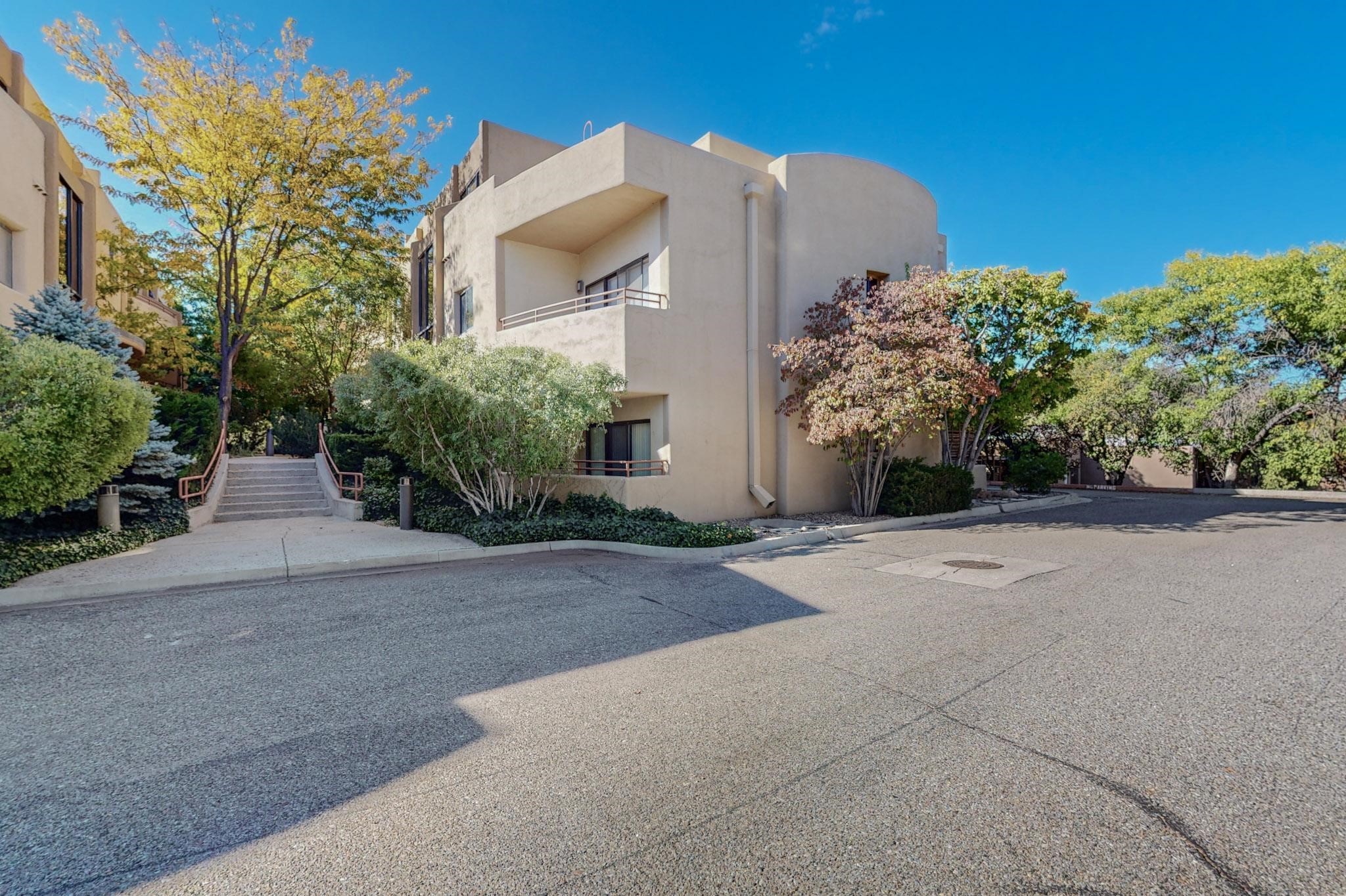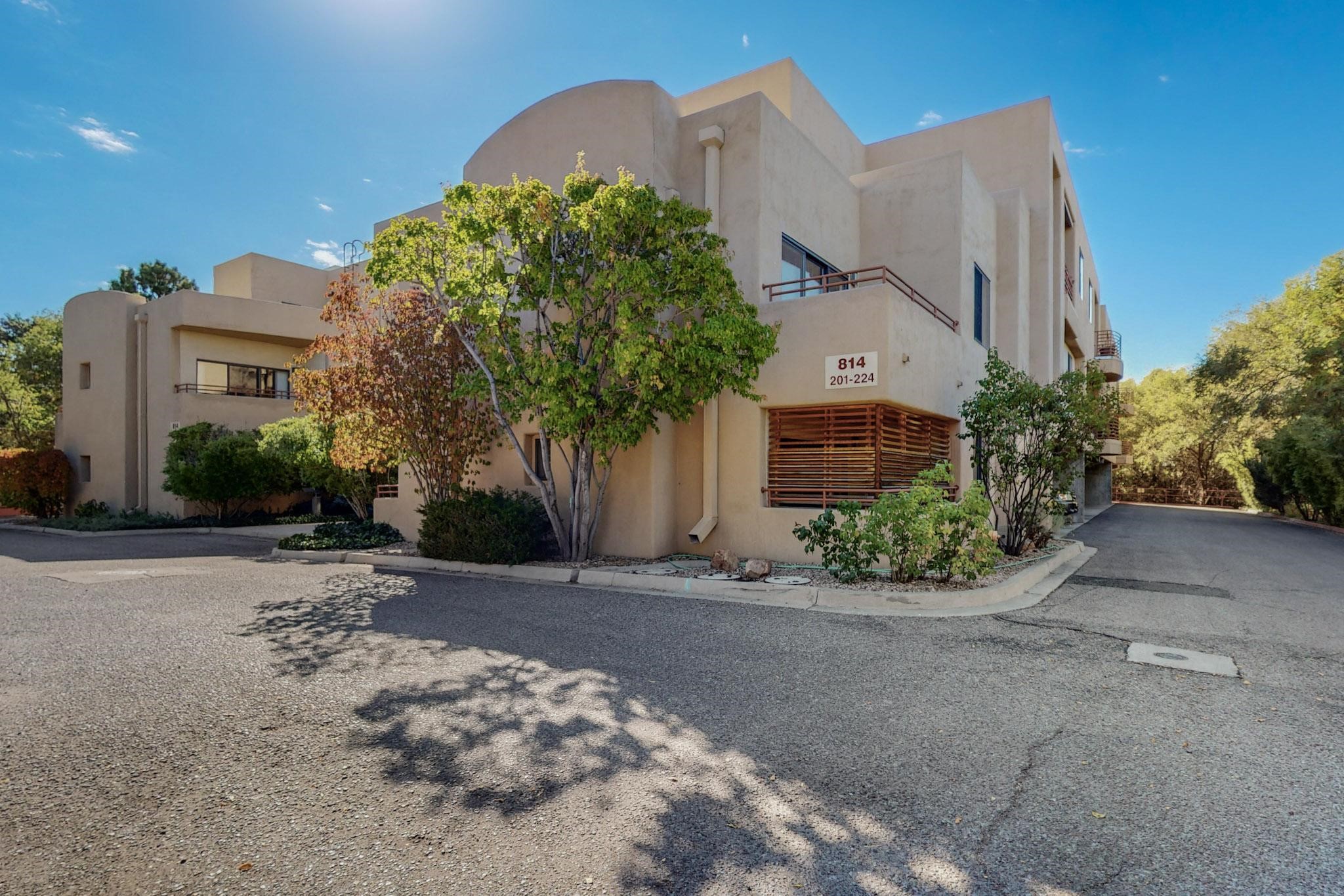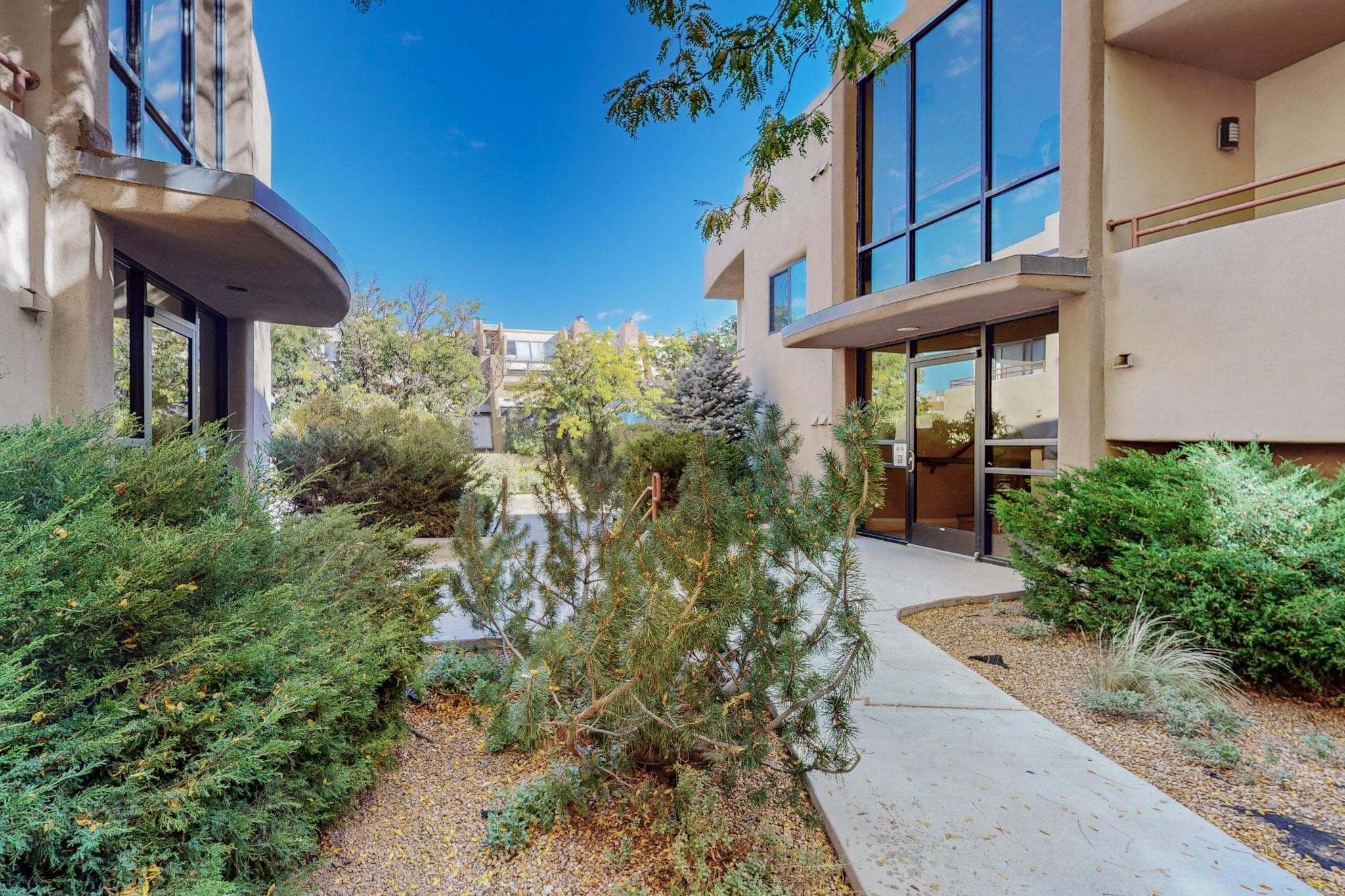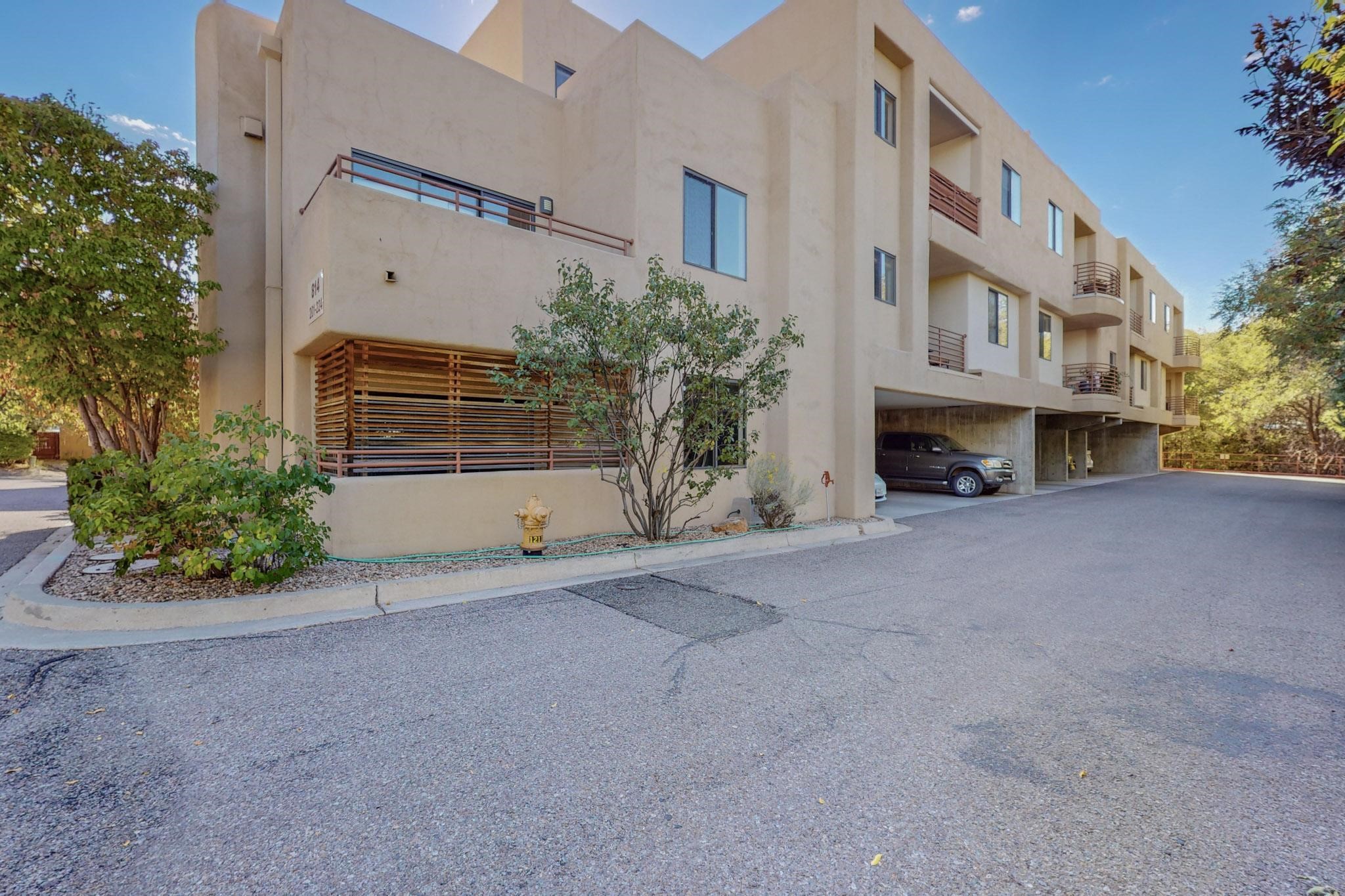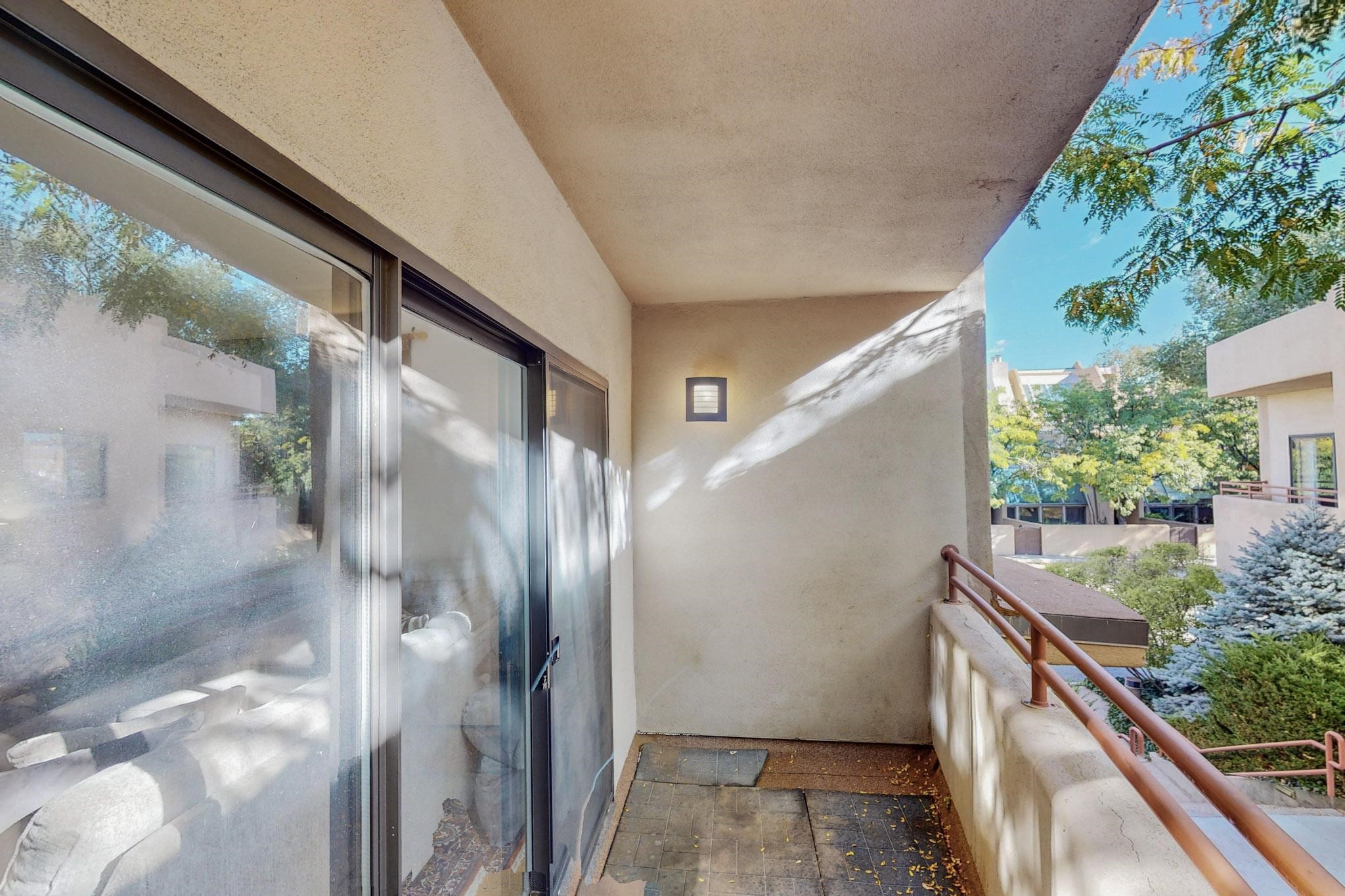 This beautiful home is an urban oasis surrounded by mature trees in a superb midtown location with beautifully inviting landscaped entry and walkways. Close to restaurants and shopping! Perfect for access to walking trails, biking or catching the Rail Runner train just a few blocks away. An upscale and mildly contemporary condo with 2 spacious balconies overlooking a courtyard with lots of greenery, and to the west, views of the Jemez mountains and magnificent colorful sunsets. Light filled, open and very comfortable floor plan with a large, exciting kitchen that includes granite counters and substantial cabinet space including a spacious pantry. The warm hardwood flooring adds additional beauty and dimensions to the home's spacious living area and lends itself well to a variety of layouts. Two comfortable bedrooms, a large bathroom for two and centrally located utility room with a washer & dryer. A surprisingly large 6.50' X 17' ground floor personal storage unit for your seasonal items and sports equipment. Covered parking keeps your vehicle protected from the elements. A NEW roof was added in 2024 and NEW stucco will be going in 2025! This very private and quiet location is centrally located, very affordable for Santa Fe, and is ready for you to call it home!