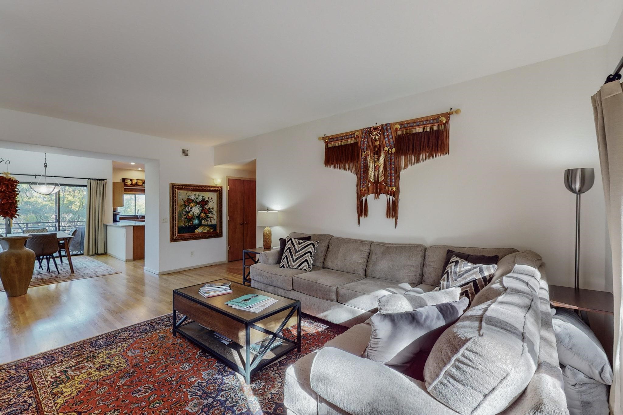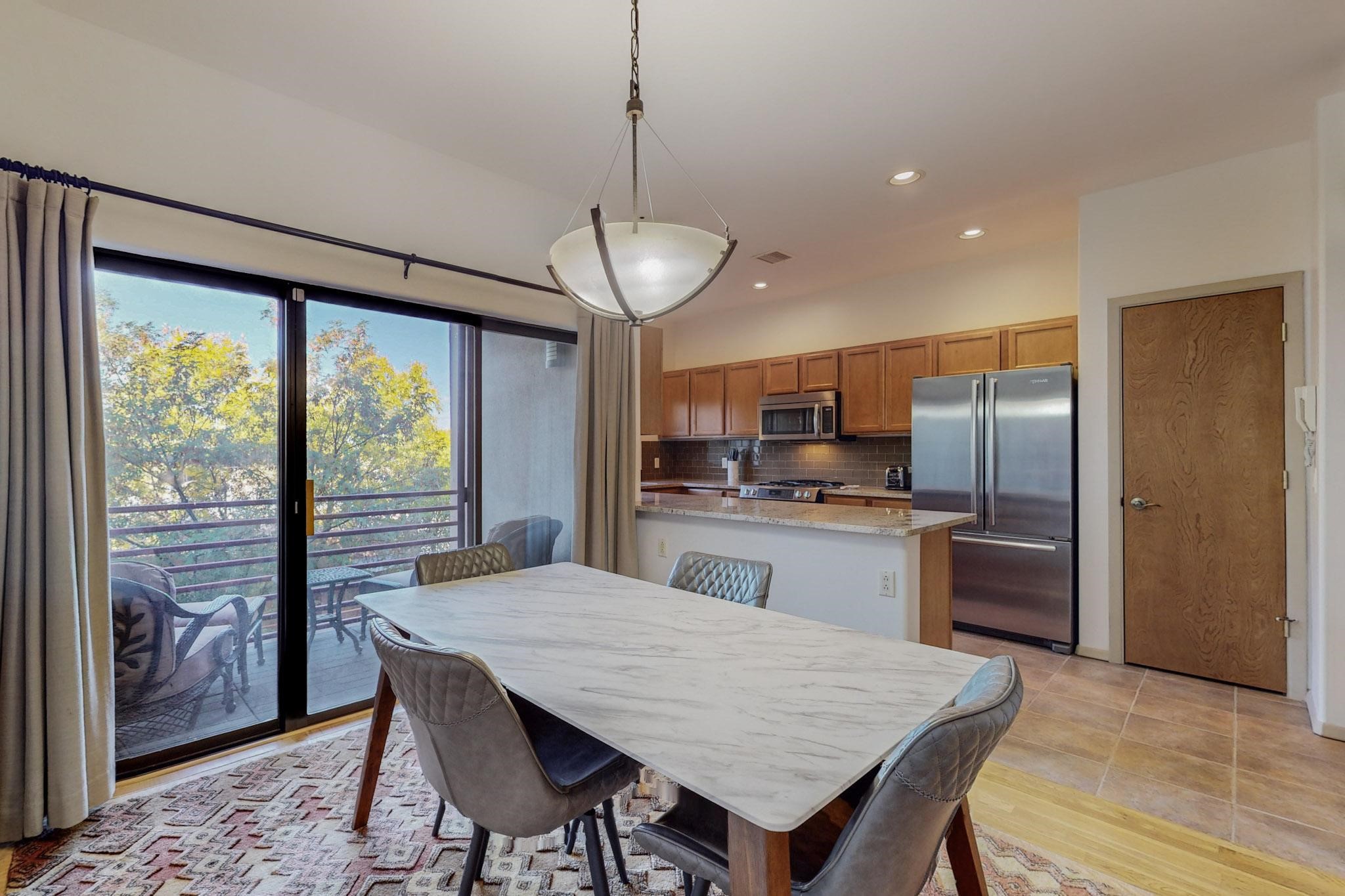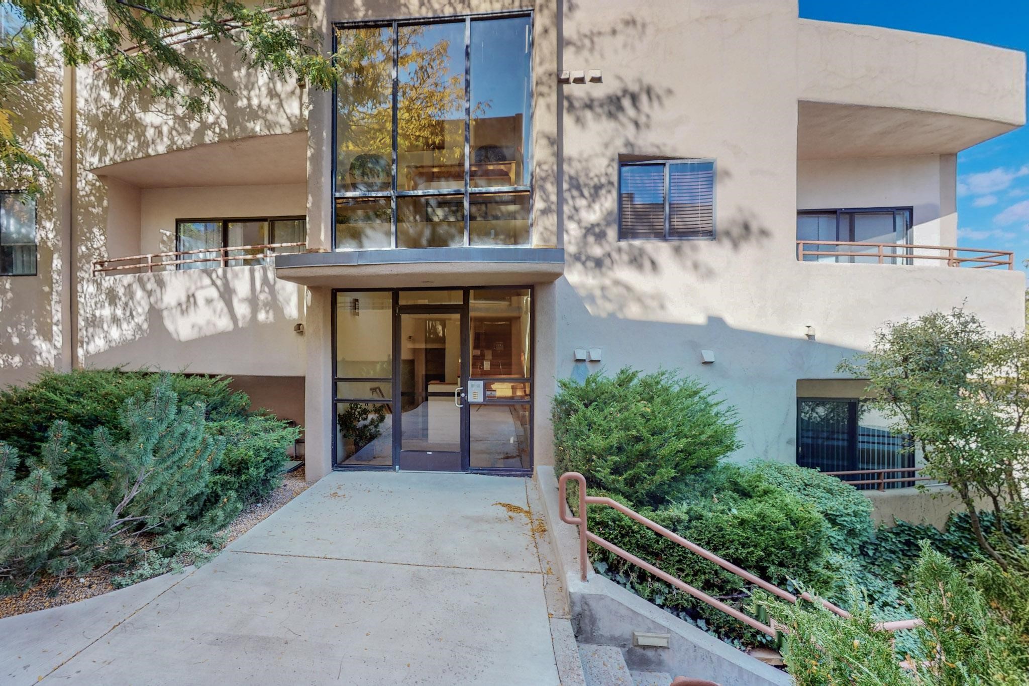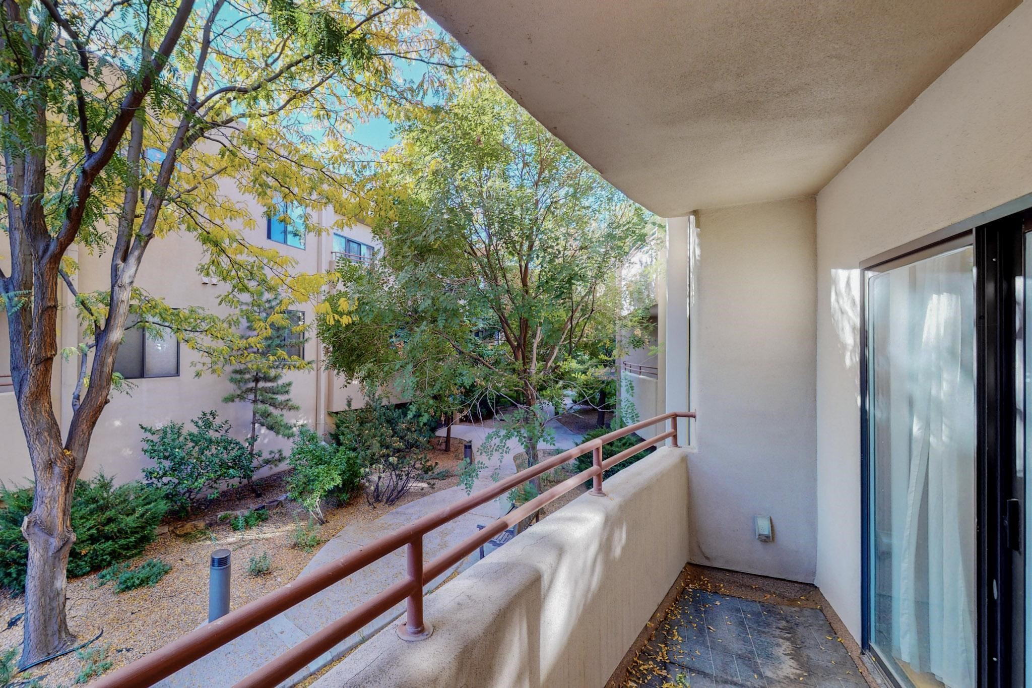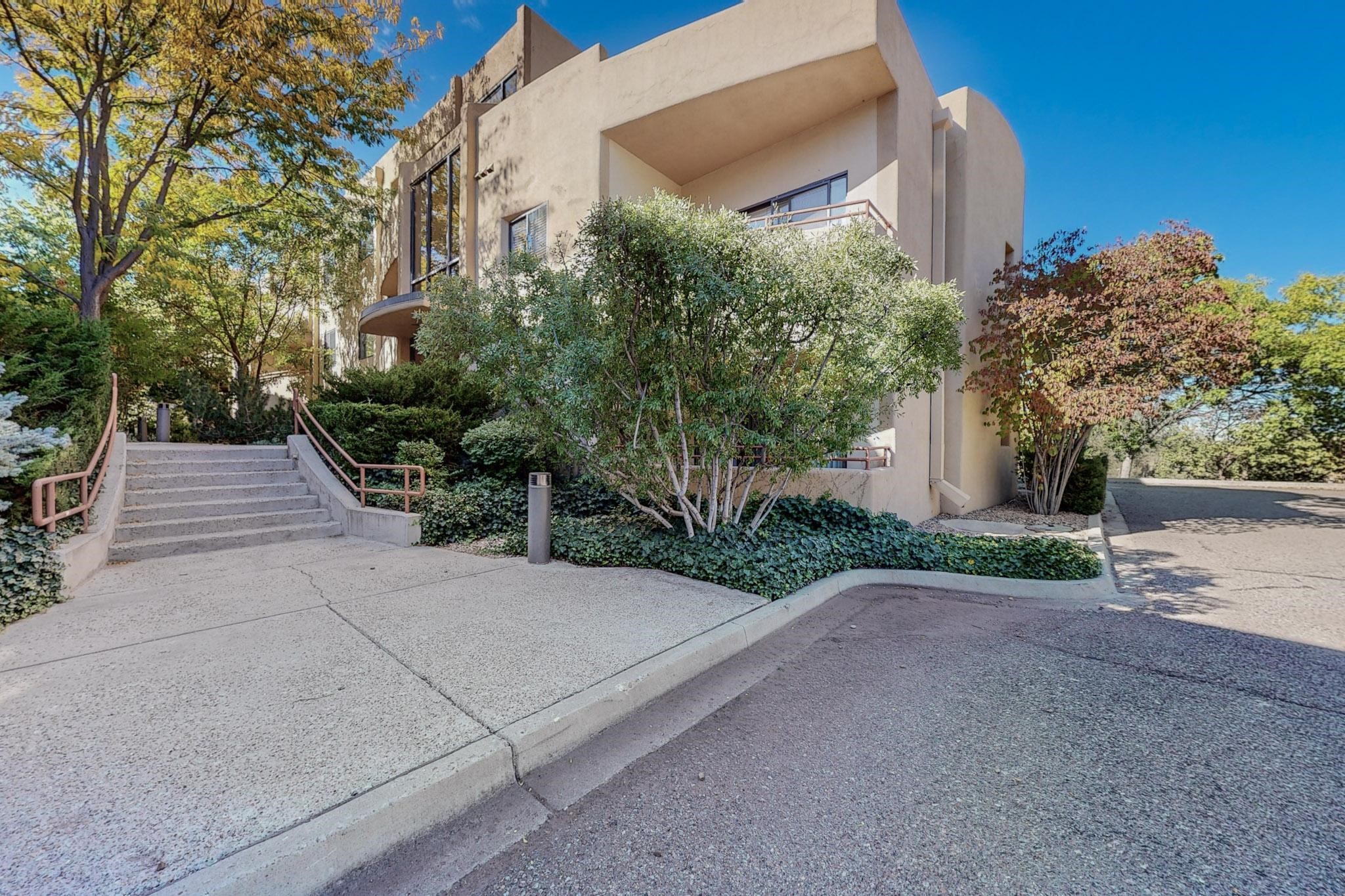 This beautiful home is an urban oasis surrounded by mature trees in a superb midtown location with beautifully inviting landscaped entry and walkways. Close to restaurants and shopping! Perfect for access to walking trails, biking or catching the Rail Runner train just a few blocks away. An upscale and mildly contemporary condo with 2 spacious balconies overlooking a courtyard with lots of greenery, and to the west, views of the Jemez mountains and magnificent colorful sunsets. Light filled, open and very comfortable floor plan with a large, exciting kitchen that includes granite counters and substantial cabinet space including a spacious pantry. The warm hardwood flooring adds additional beauty and dimensions to the home's spacious living area and lends itself well to a variety of layouts. Two comfortable bedrooms, a large bathroom for two and centrally located utility room with a washer & dryer. A surprisingly large 6.50' X 17' ground floor personal storage unit for your seasonal items and sports equipment. Covered parking keeps your vehicle protected from the elements. A NEW roof was added in 2024 and NEW stucco will be going in 2025! This very private and quiet location is centrally located, very affordable for Santa Fe, and is ready for you to call it home!