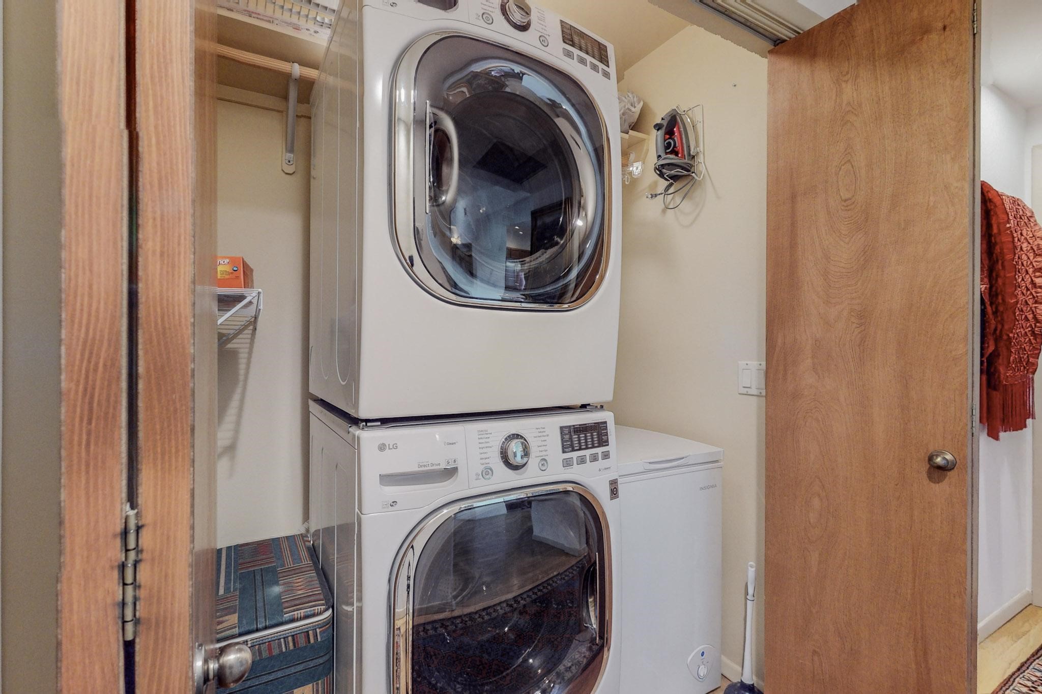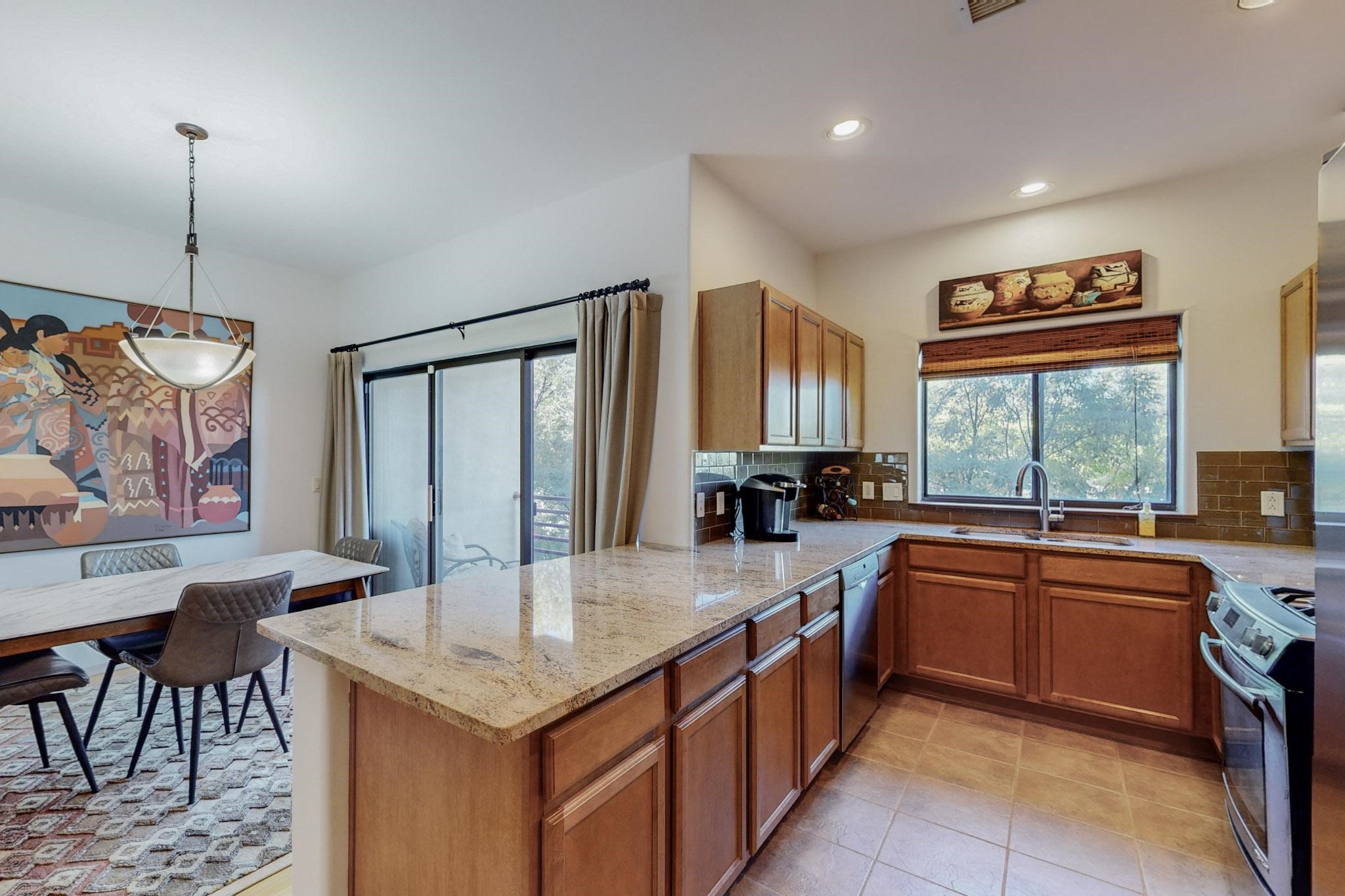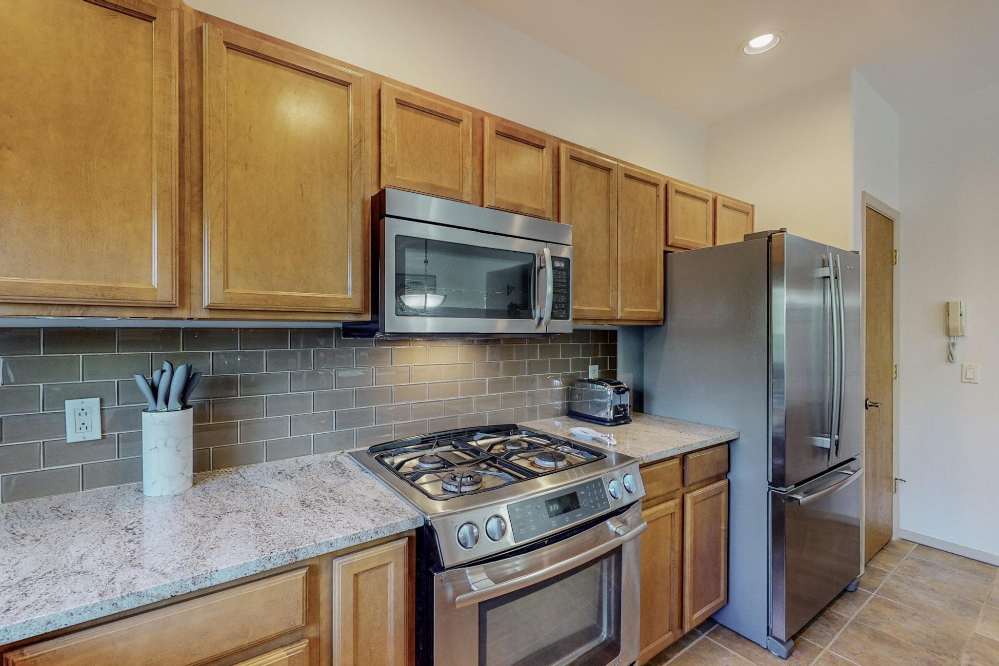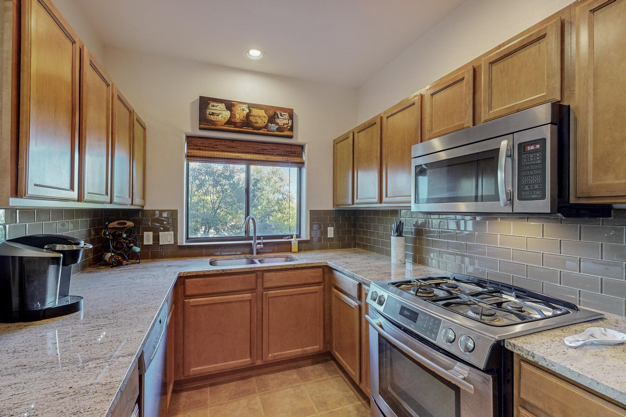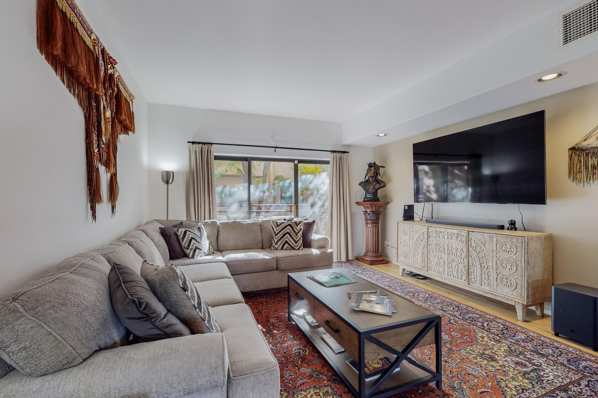 This beautiful home is an urban oasis surrounded by mature trees in a superb midtown location with beautifully inviting landscaped entry and walkways. Close to restaurants and shopping! Perfect for access to walking trails, biking or catching the Rail Runner train just a few blocks away. An upscale and mildly contemporary condo with 2 spacious balconies overlooking a courtyard with lots of greenery, and to the west, views of the Jemez mountains and magnificent colorful sunsets. Light filled, open and very comfortable floor plan with a large, exciting kitchen that includes granite counters and substantial cabinet space including a spacious pantry. The warm hardwood flooring adds additional beauty and dimensions to the home's spacious living area and lends itself well to a variety of layouts. Two comfortable bedrooms, a large bathroom for two and centrally located utility room with a washer & dryer. A surprisingly large 6.50' X 17' ground floor personal storage unit for your seasonal items and sports equipment. Covered parking keeps your vehicle protected from the elements. A NEW roof was added in 2024 and NEW stucco will be going in 2025! This very private and quiet location is centrally located, very affordable for Santa Fe, and is ready for you to call it home!