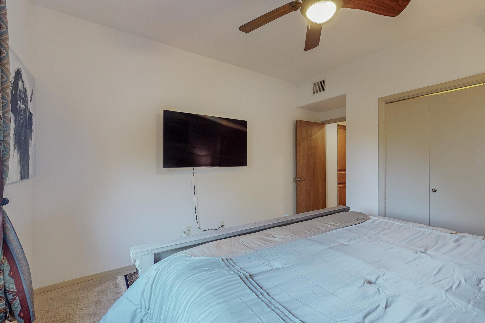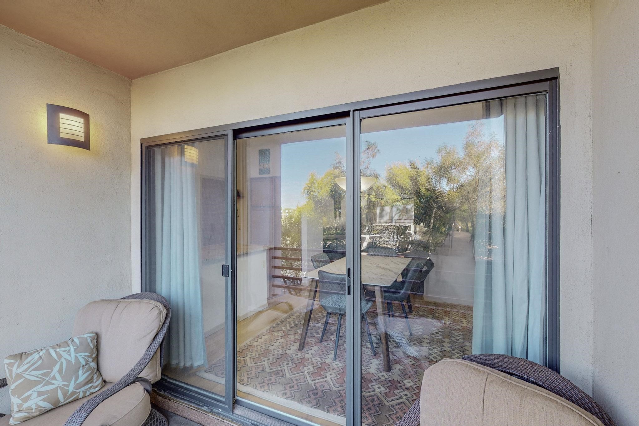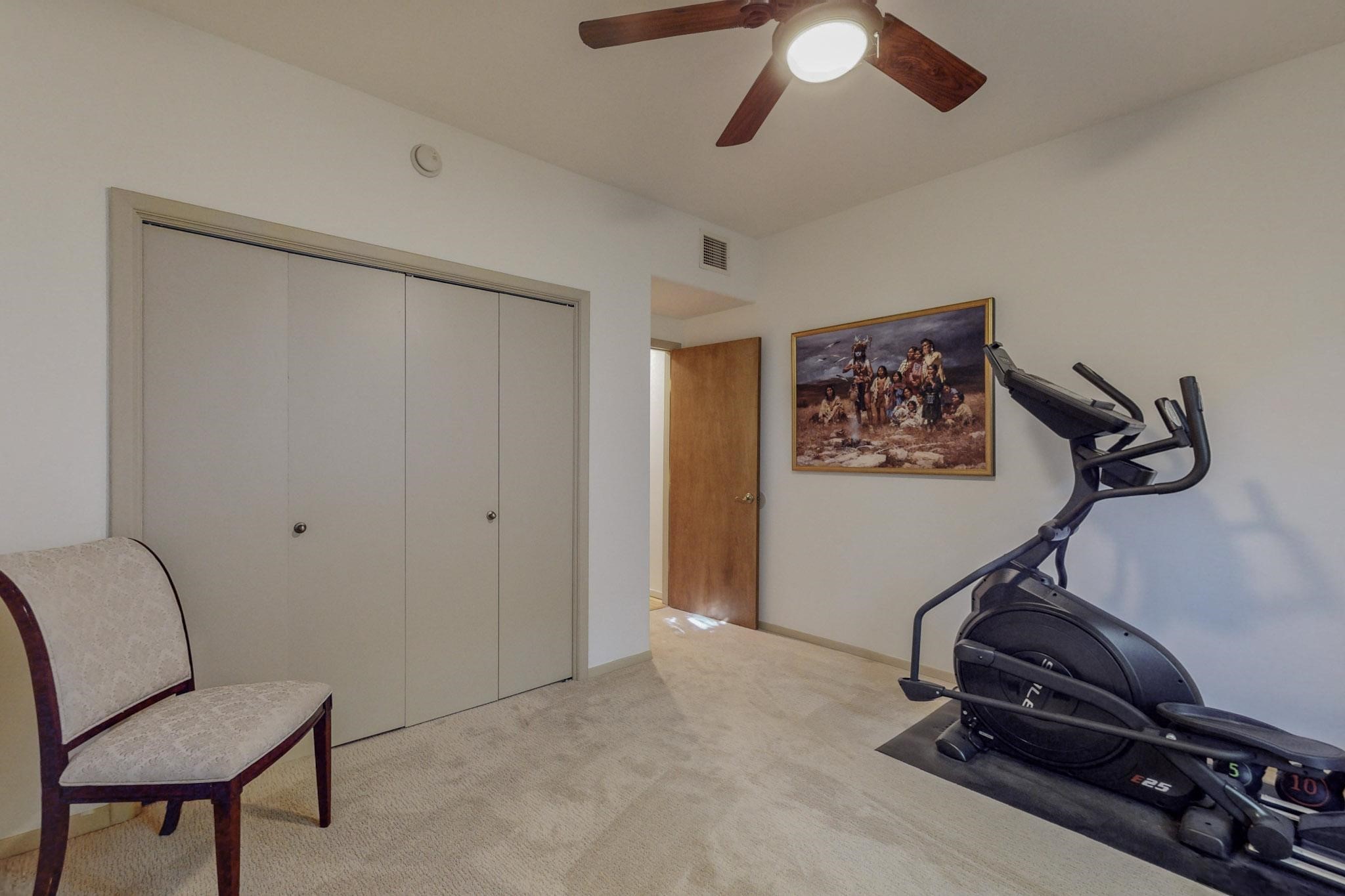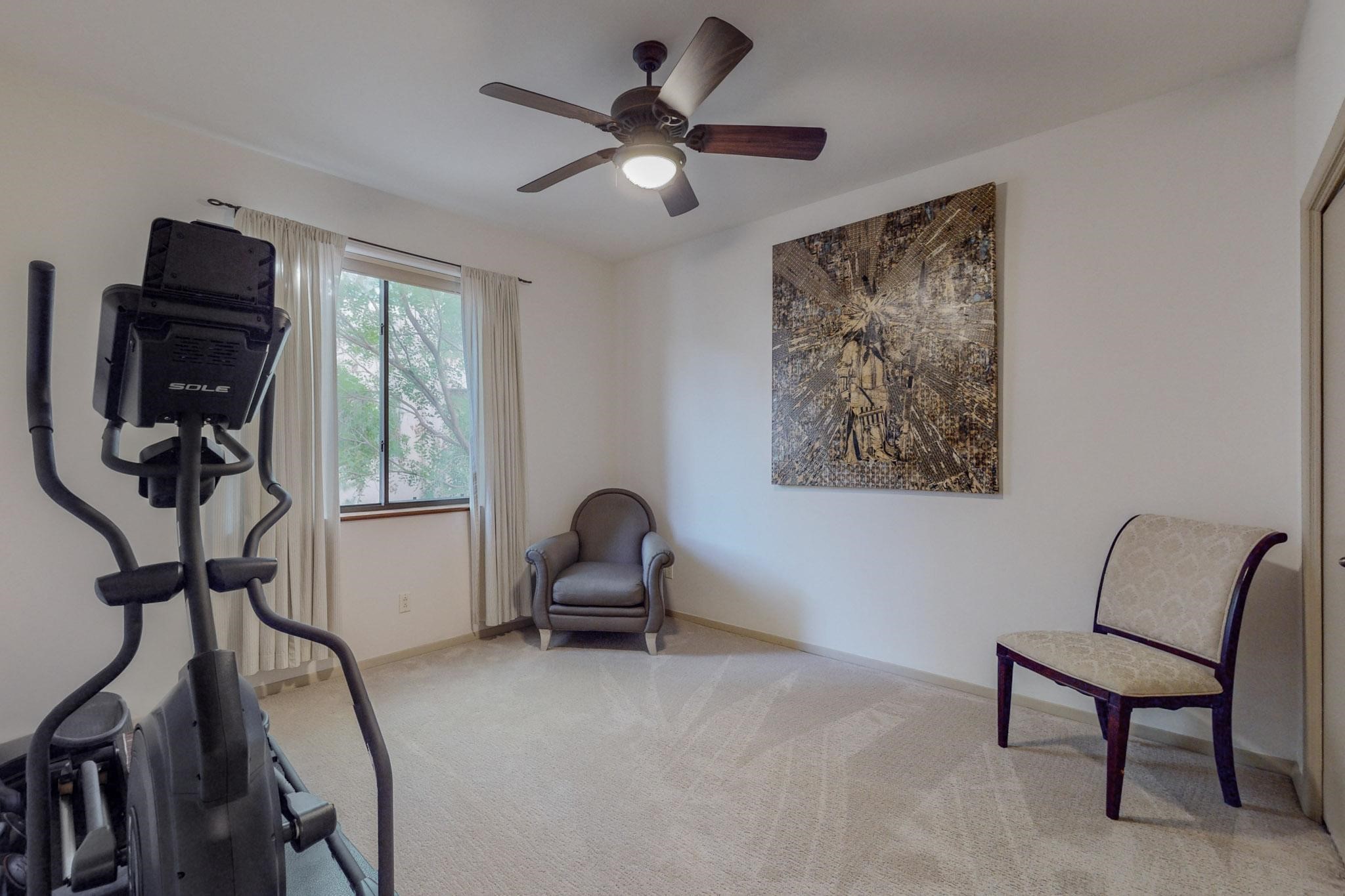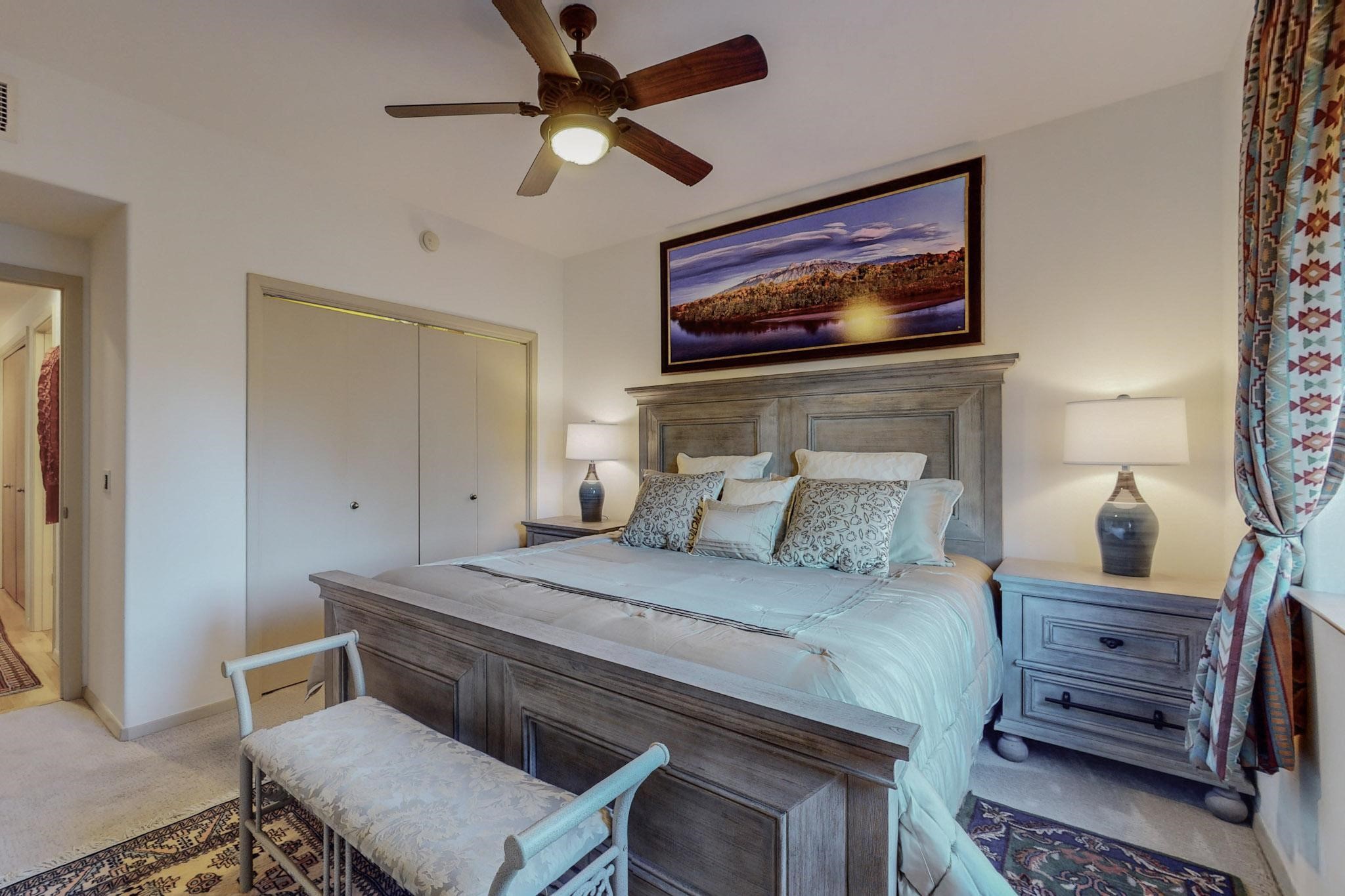 This beautiful home is an urban oasis surrounded by mature trees in a superb midtown location with beautifully inviting landscaped entry and walkways. Close to restaurants and shopping! Perfect for access to walking trails, biking or catching the Rail Runner train just a few blocks away. An upscale and mildly contemporary condo with 2 spacious balconies overlooking a courtyard with lots of greenery, and to the west, views of the Jemez mountains and magnificent colorful sunsets. Light filled, open and very comfortable floor plan with a large, exciting kitchen that includes granite counters and substantial cabinet space including a spacious pantry. The warm hardwood flooring adds additional beauty and dimensions to the home's spacious living area and lends itself well to a variety of layouts. Two comfortable bedrooms, a large bathroom for two and centrally located utility room with a washer & dryer. A surprisingly large 6.50' X 17' ground floor personal storage unit for your seasonal items and sports equipment. Covered parking keeps your vehicle protected from the elements. A NEW roof was added in 2024 and NEW stucco will be going in 2025! This very private and quiet location is centrally located, very affordable for Santa Fe, and is ready for you to call it home!
