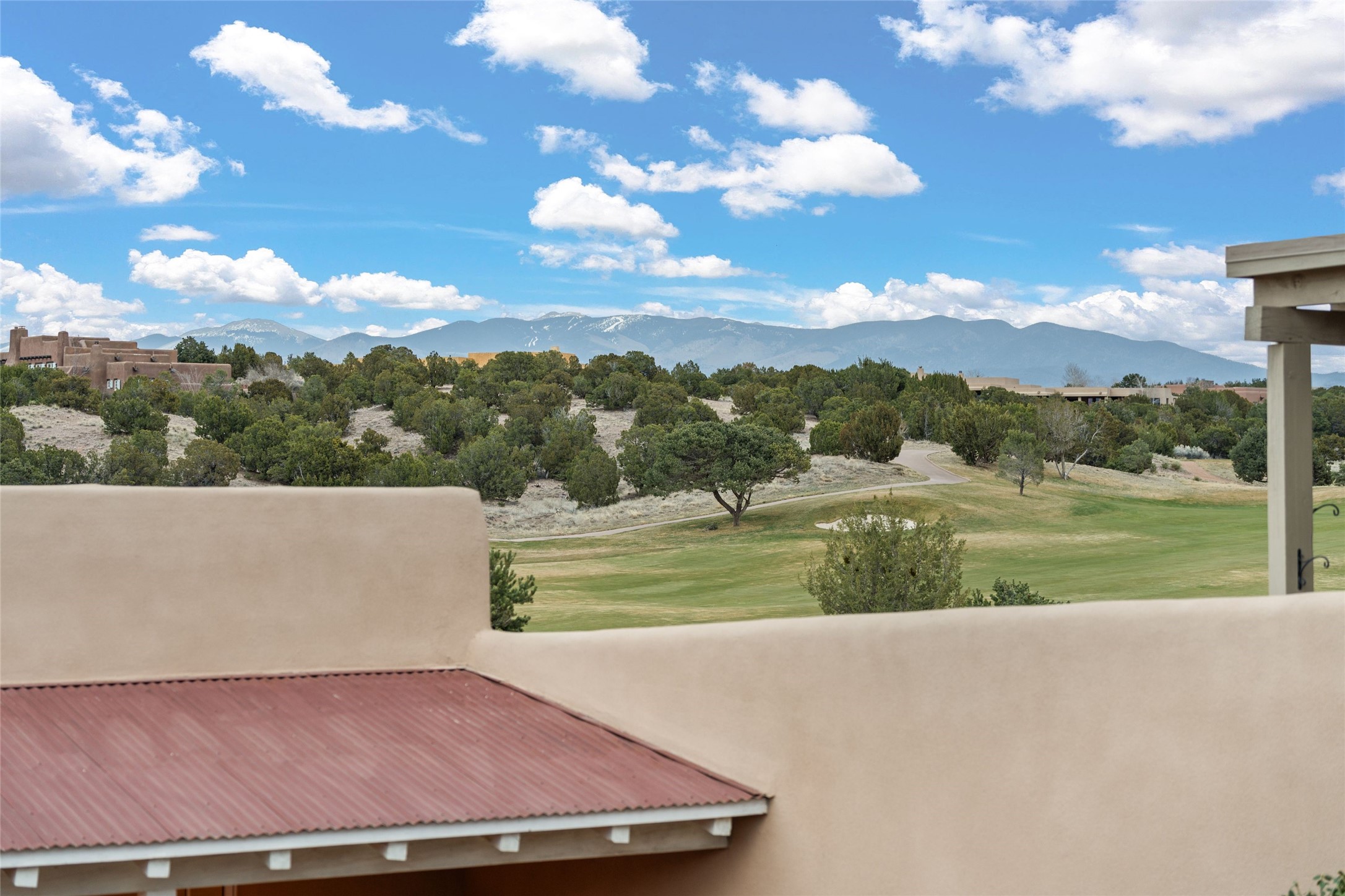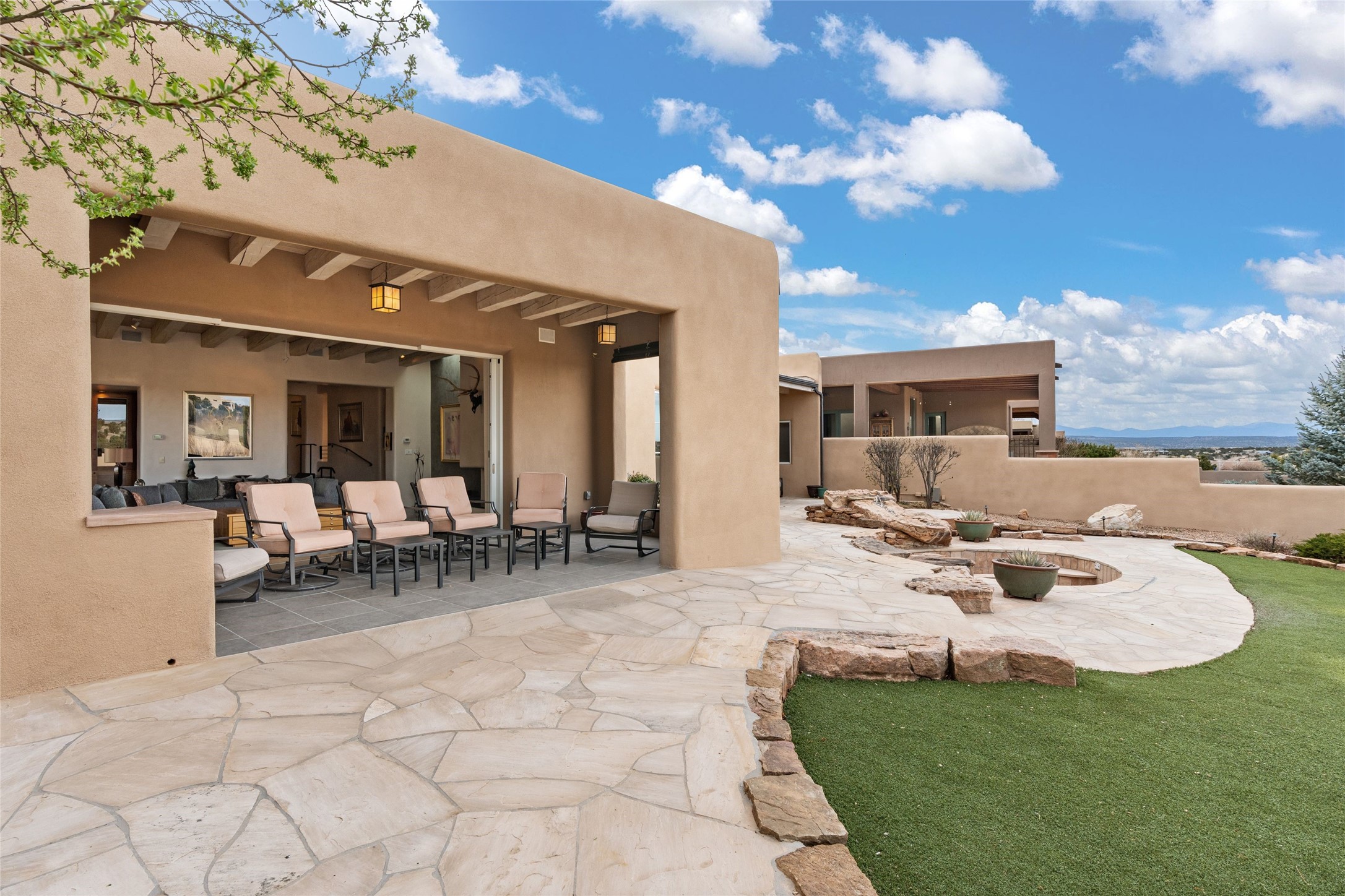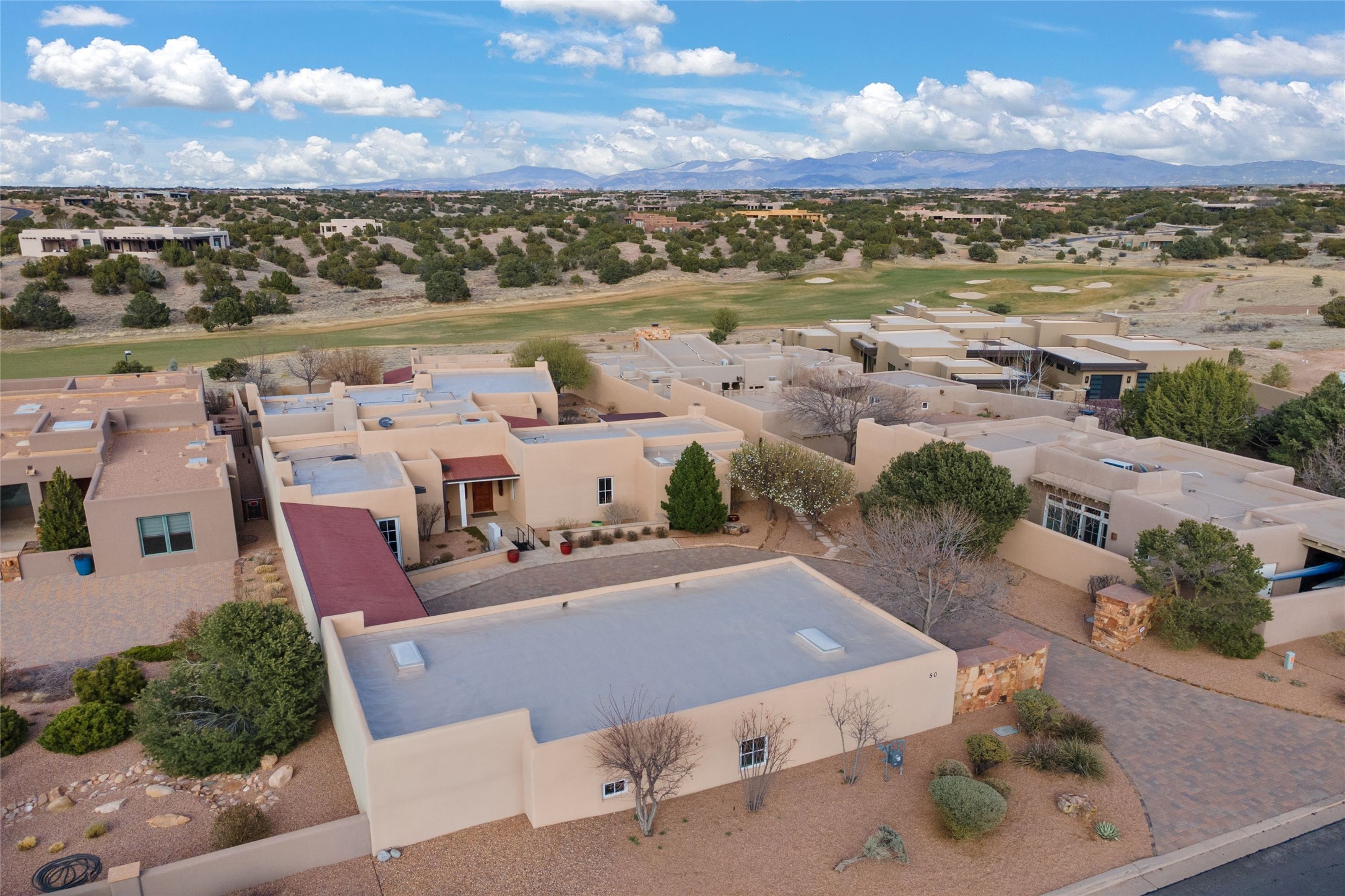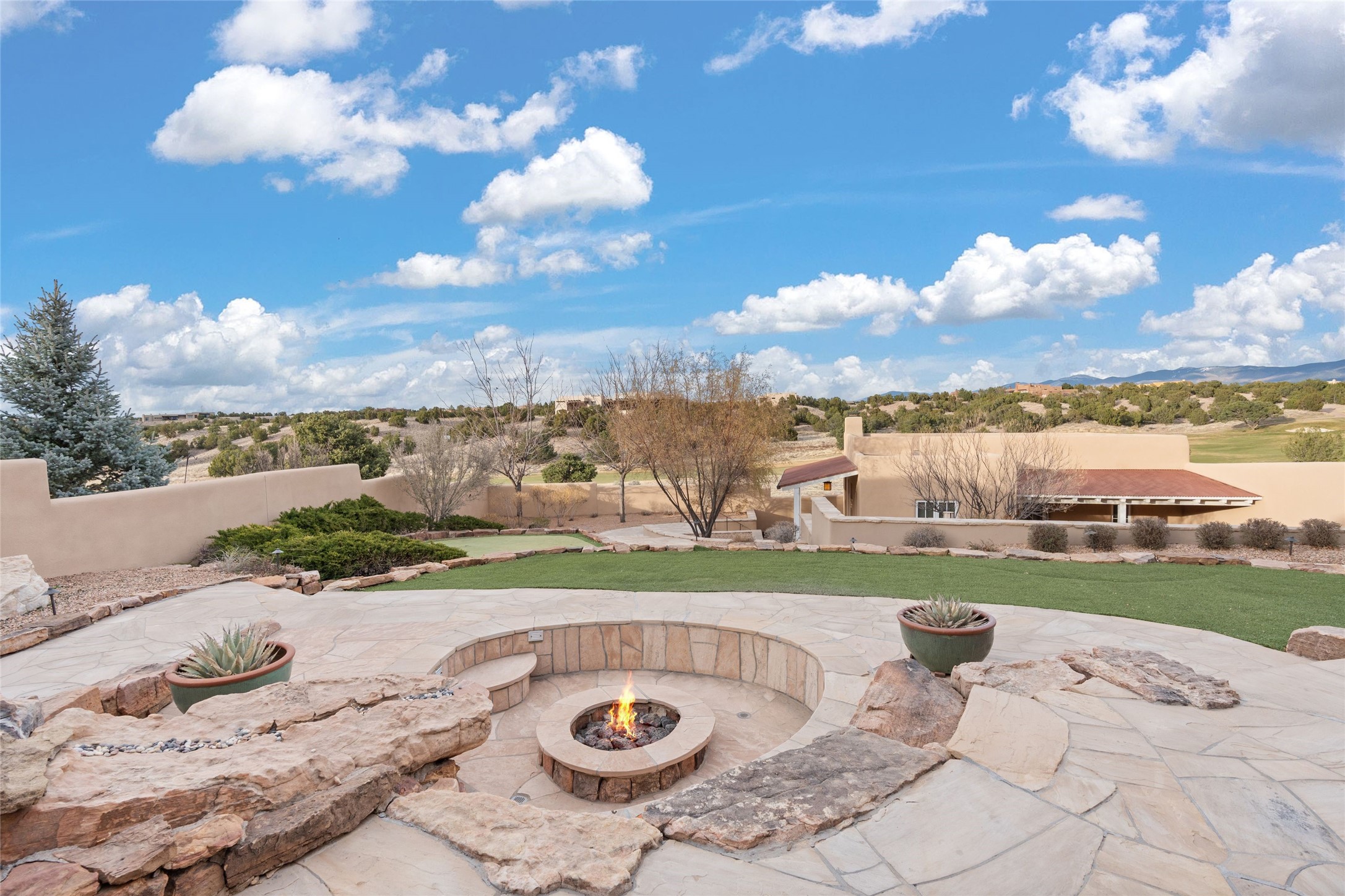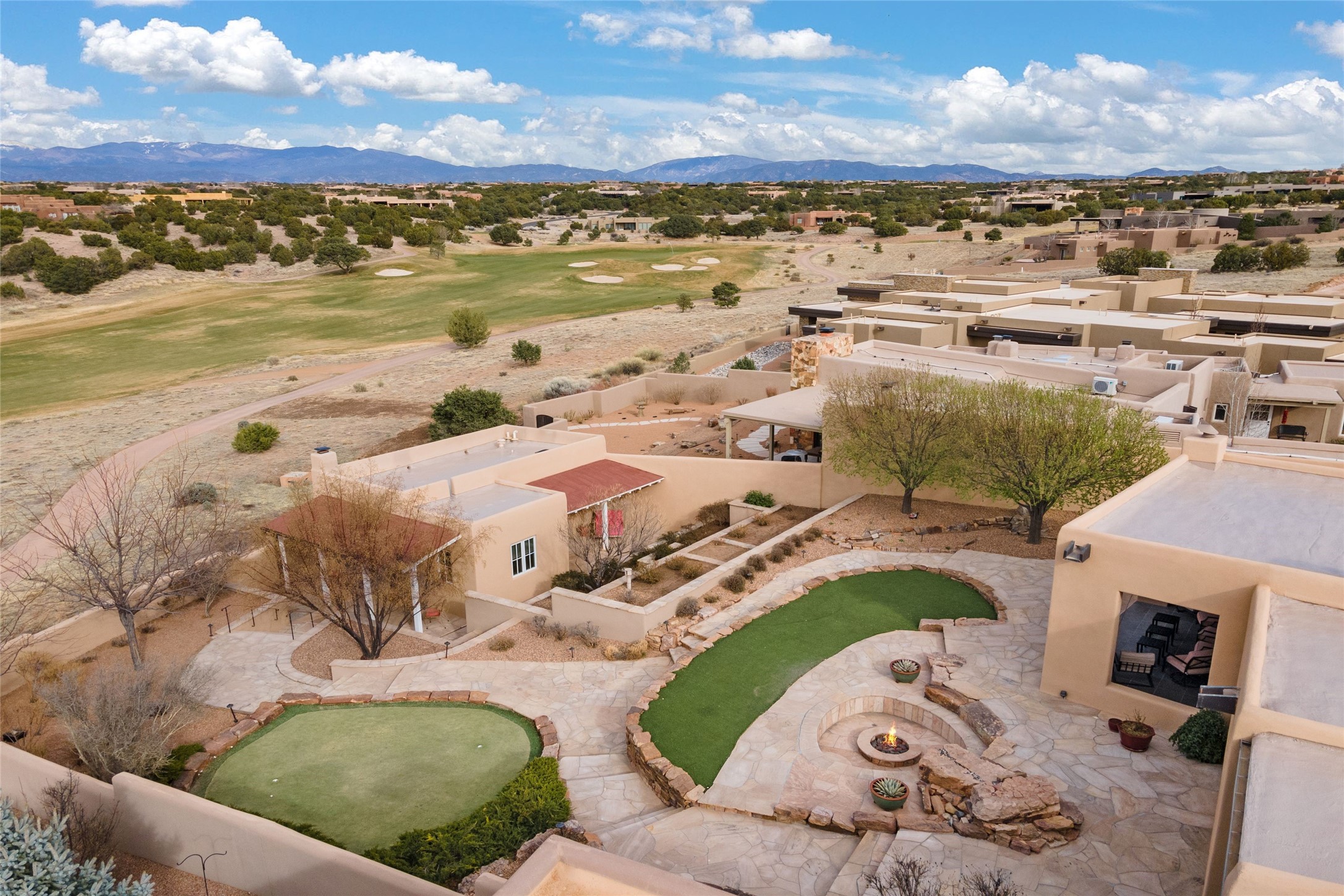 Panoramic Golf Course & Sangre de Cristo Mountain views are yours at this Soft Contemporary Masterpiece in Gated Las Campanas w 3 Bedrooms + Office + Media + 3-1/2 Baths, including a Guest House & 3-Car Garage & 6 Fireplaces. Spacious Living Room features a distinctive fireplace, wet bar & access to the back portal thru 4 glass doors that vanish into the wall, creating a 16-foot opening to the view. The Dining Room has space for 8 & a Chandelier of 6 stunning glass sculptures. The impressive Media Room has 11.2 sound system, refrigerator & reclining sectional couch. Gourmet Kitchen is designed for effortless meal preparation, w Wolf gas range/oven, Vent-a-Hood, Sub-Zero Refrigerator, double dishwasher + 4' x 9' island w prep sink & Insta-Hot water. The cozy Kitchen Nook has a wood-burning fireplace, room for casual dining + 2 lounge chairs.. The Main Bedroom Suite has a wood-burning fireplace, walk-in shower, 16-foot closet & & jetted tub w golf course view. Bedroom 2 is in a separate wing, located near the Den/Office. The free-standing Guest House offers the ultimate in privacy, w a Kitchen, Living area, Bedroom & washer/dryer. This Exquisite Residence has it All - 3 Bedrooms, Office, Media, 3-car garage, free-standing Guest House & recent major Stucco maintenance & GACO Roof Coating..The Outdoor Amenities make it a self-contained resort - Synthetic Putting Green, Fire Pit, Portal for the BBQ plus Golf & Mountain Views - Live the Resort Lifestyle in Las Campanas!