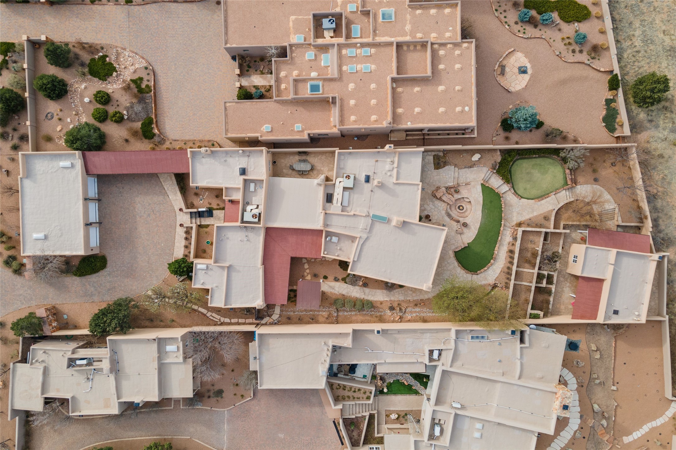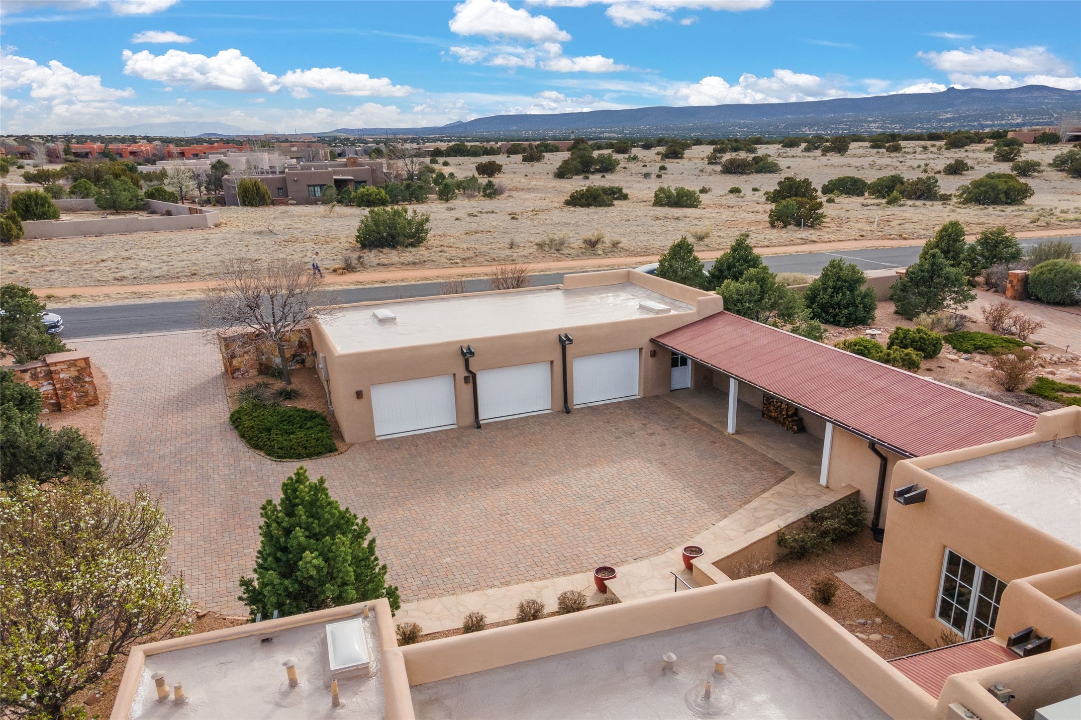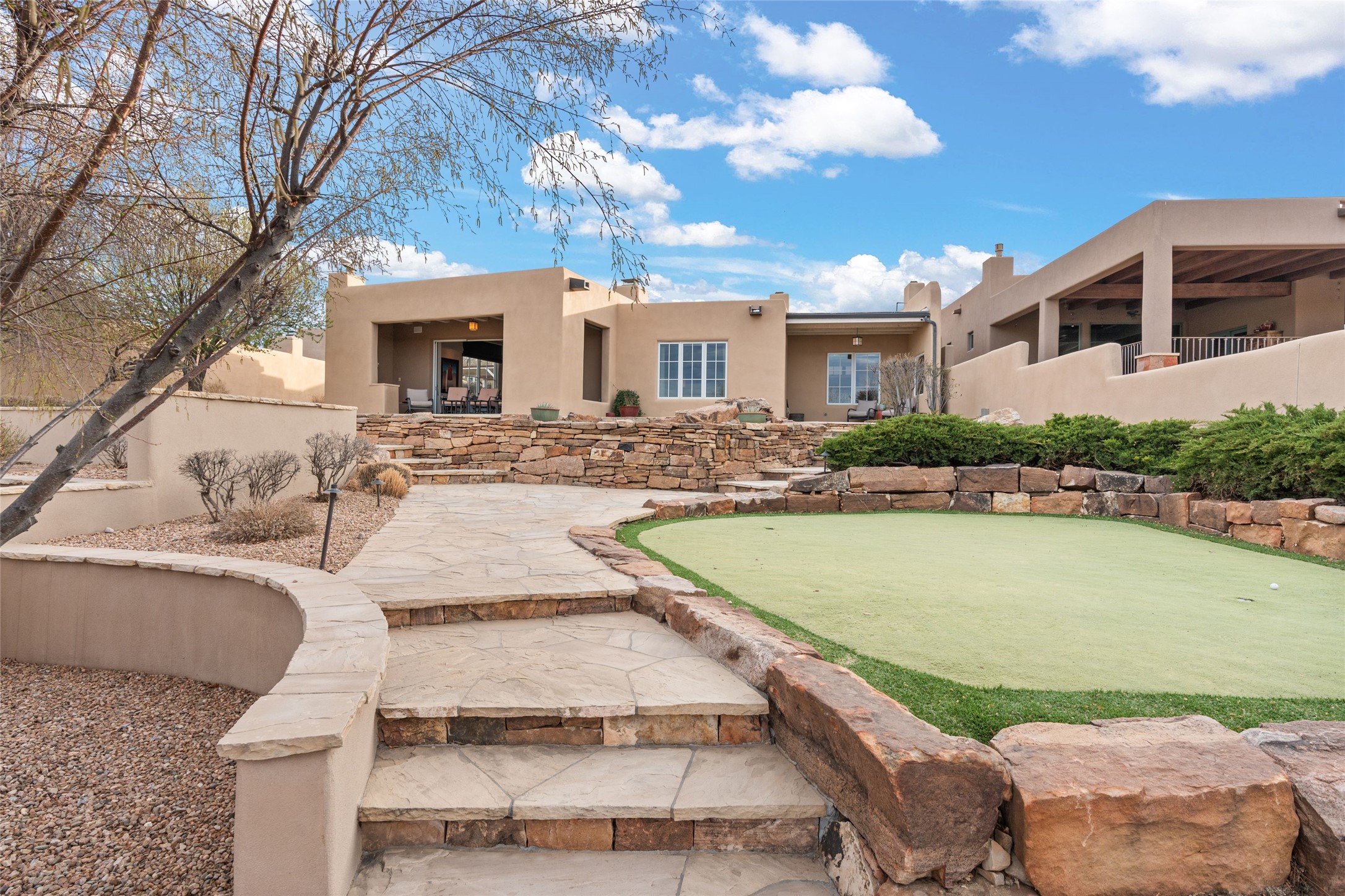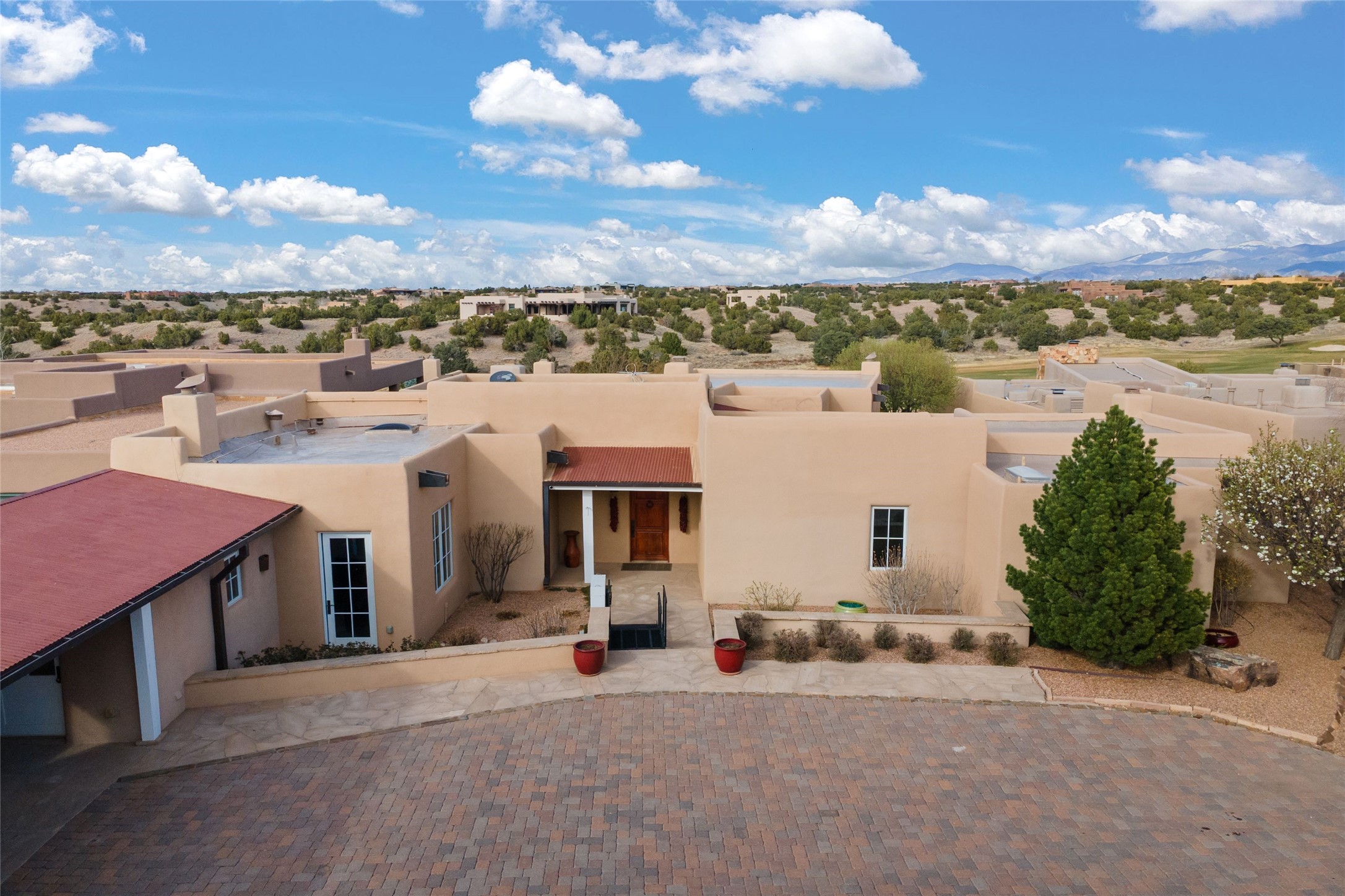Panoramic Golf Course & Sangre de Cristo Mountain views are yours at this Soft Contemporary Masterpiece in Gated Las Campanas w 3 Bedrooms + Office + Media + 3-1/2 Baths, including a Guest House & 3-Car Garage & 6 Fireplaces. Spacious Living Room features a distinctive fireplace, wet bar & access to the back portal thru 4 glass doors that vanish into the wall, creating a 16-foot opening to the view. The Dining Room has space for 8 & a Chandelier of 6 stunning glass sculptures. The impressive Media Room has 11.2 sound system, refrigerator & reclining sectional couch. Gourmet Kitchen is designed for effortless meal preparation, w Wolf gas range/oven, Vent-a-Hood, Sub-Zero Refrigerator, double dishwasher + 4' x 9' island w prep sink & Insta-Hot water. The cozy Kitchen Nook has a wood-burning fireplace, room for casual dining + 2 lounge chairs.. The Main Bedroom Suite has a wood-burning fireplace, walk-in shower, 16-foot closet & & jetted tub w golf course view. Bedroom 2 is in a separate wing, located near the Den/Office. The free-standing Guest House offers the ultimate in privacy, w a Kitchen, Living area, Bedroom & washer/dryer. This Exquisite Residence has it All - 3 Bedrooms, Office, Media, 3-car garage, free-standing Guest House & recent major Stucco maintenance & GACO Roof Coating..The Outdoor Amenities make it a self-contained resort - Synthetic Putting Green, Fire Pit, Portal for the BBQ plus Golf & Mountain Views - Live the Resort Lifestyle in Las Campanas!