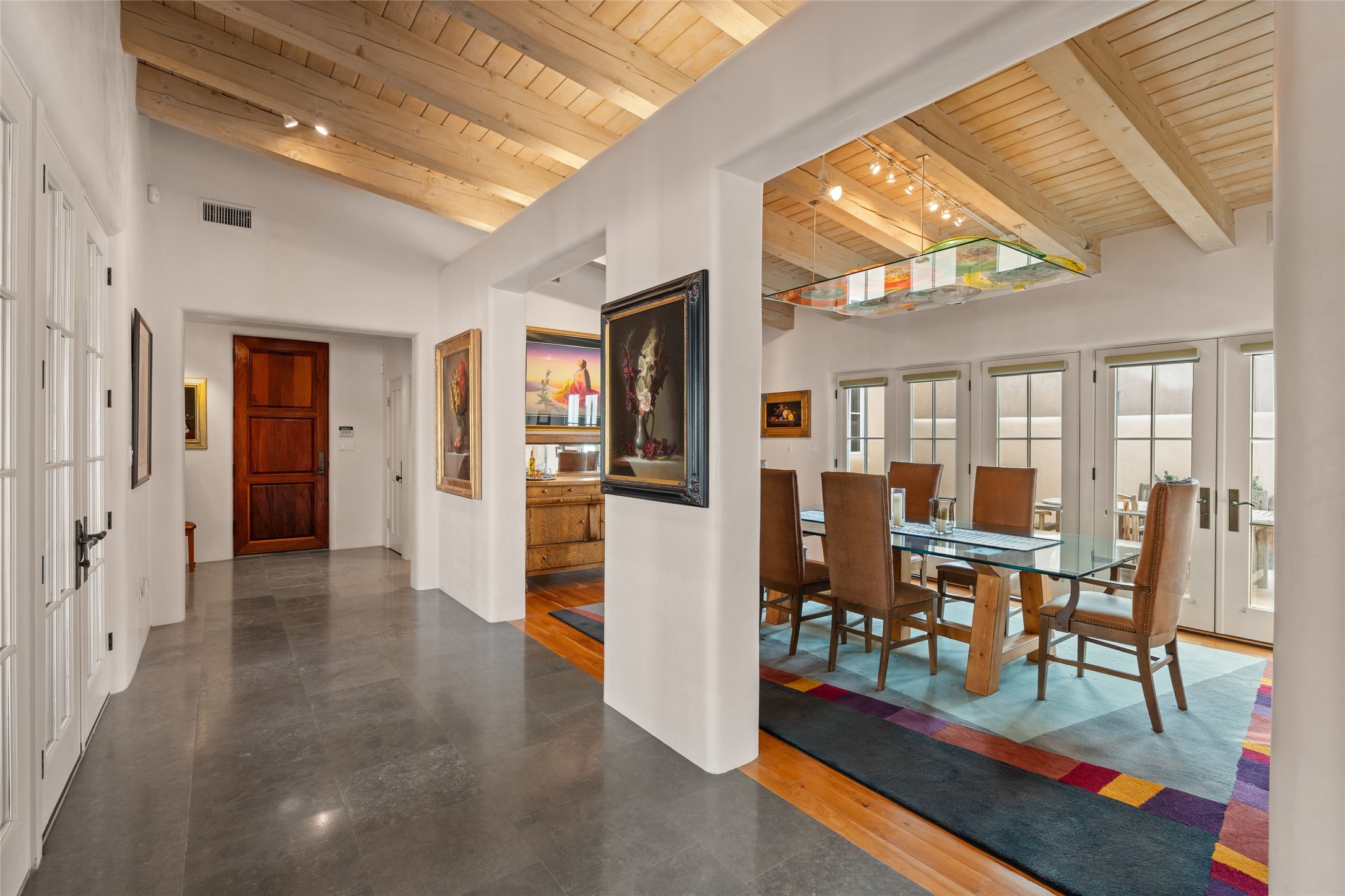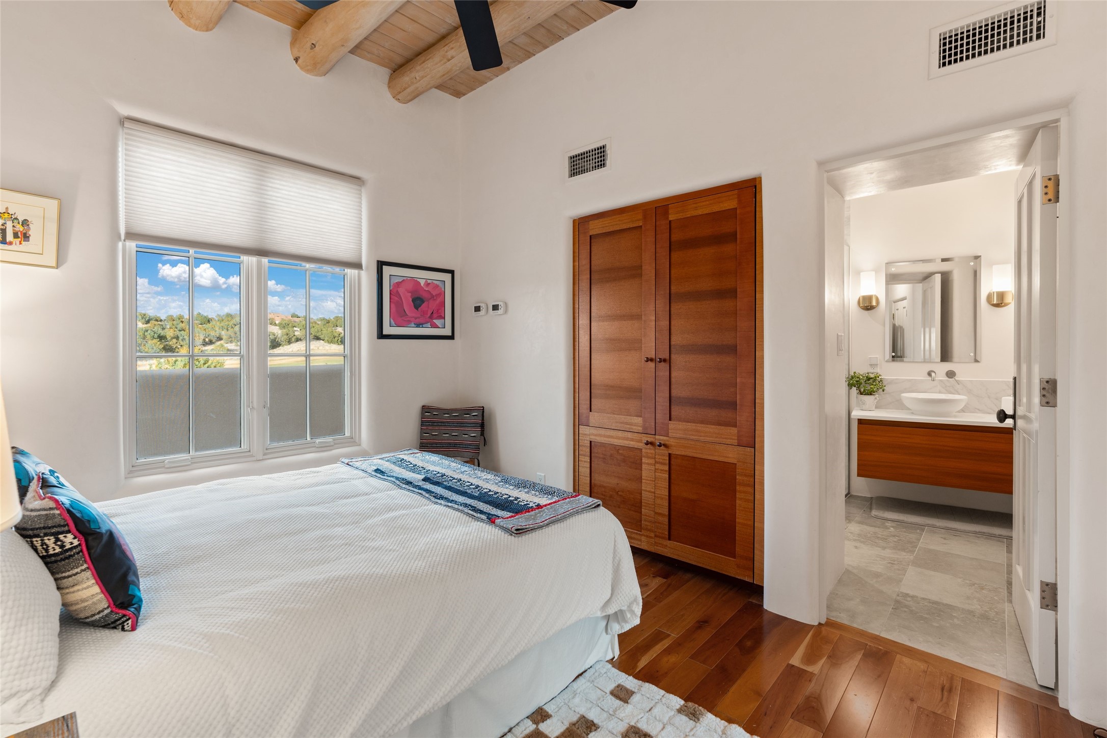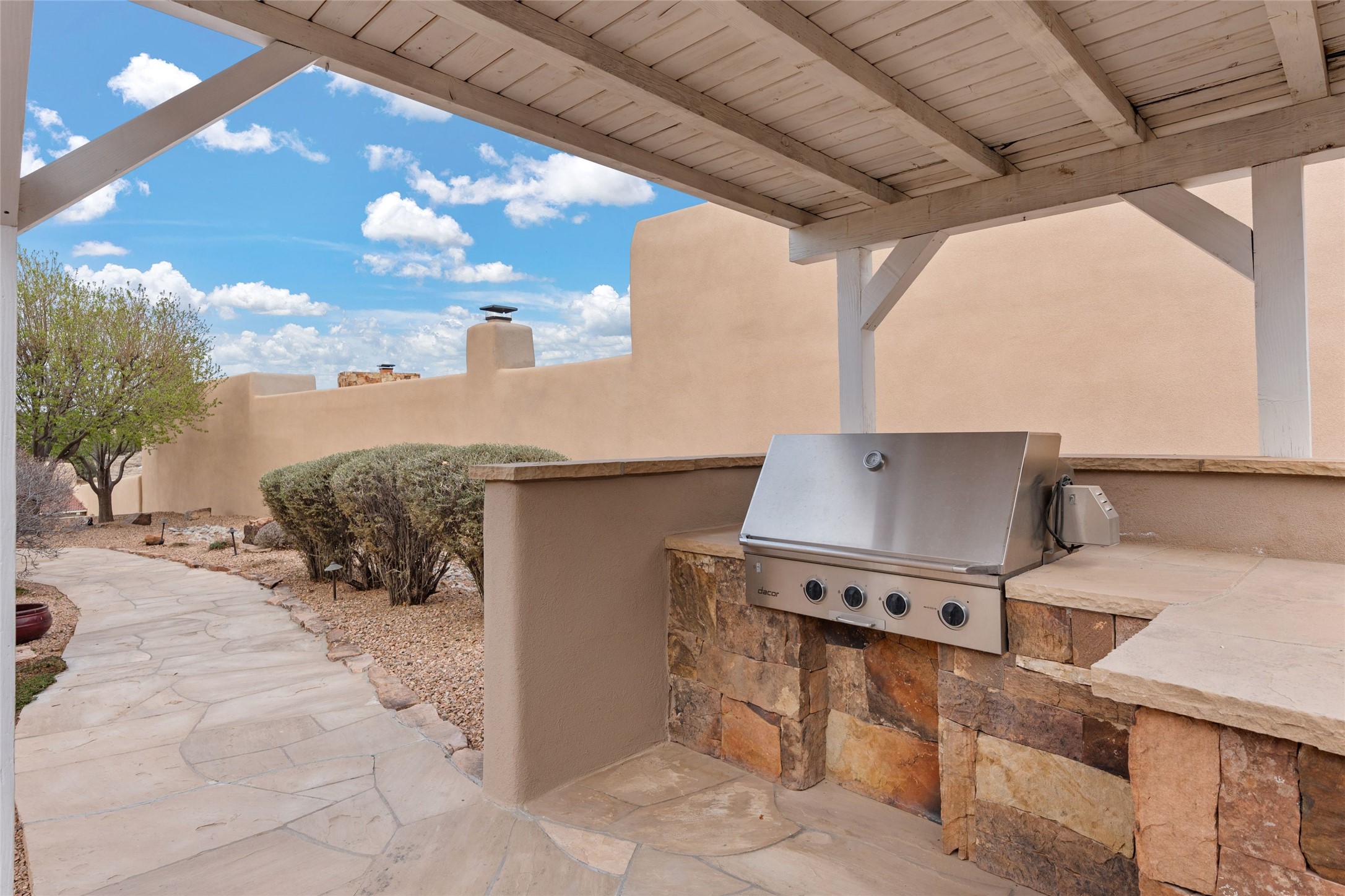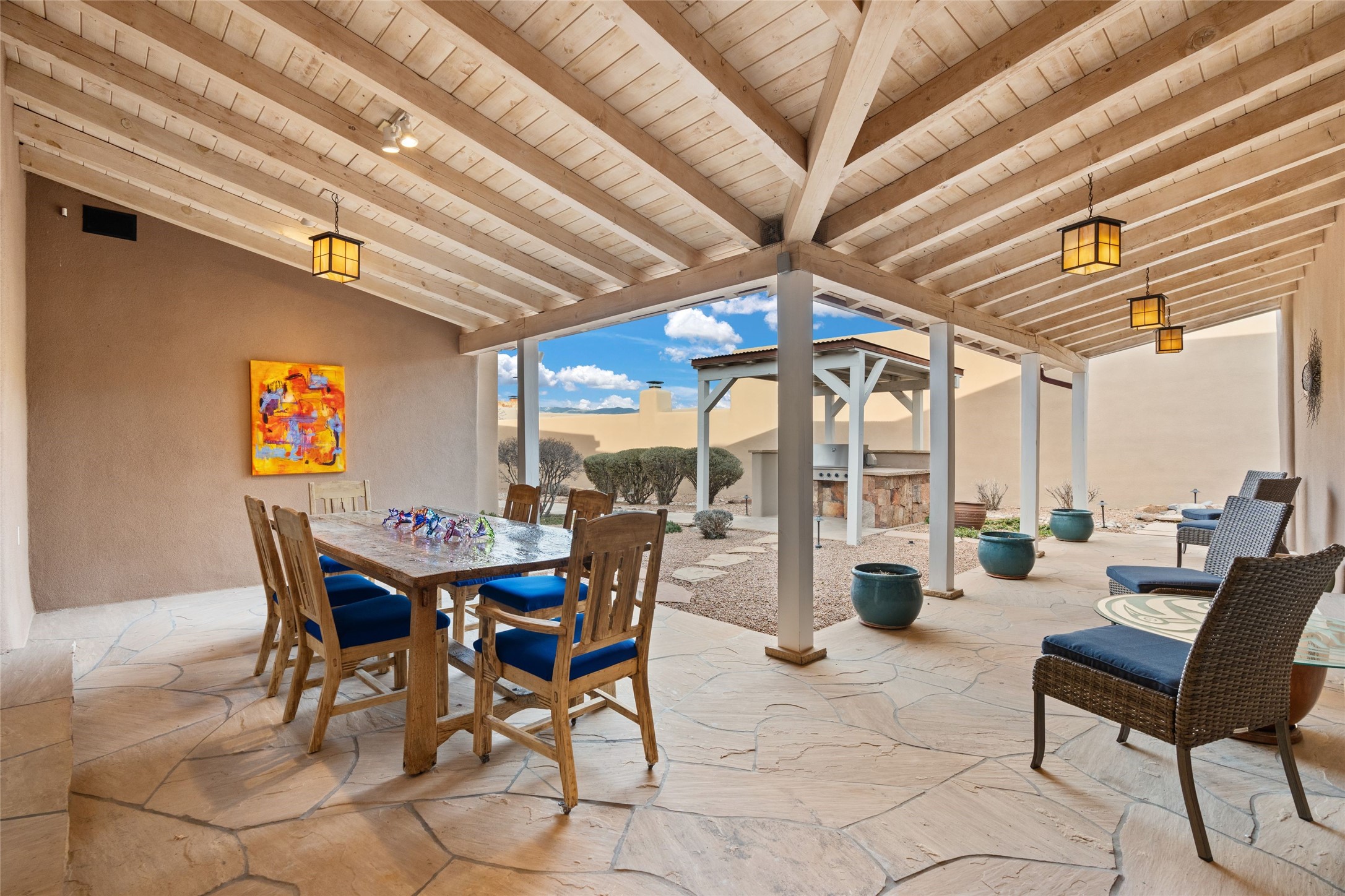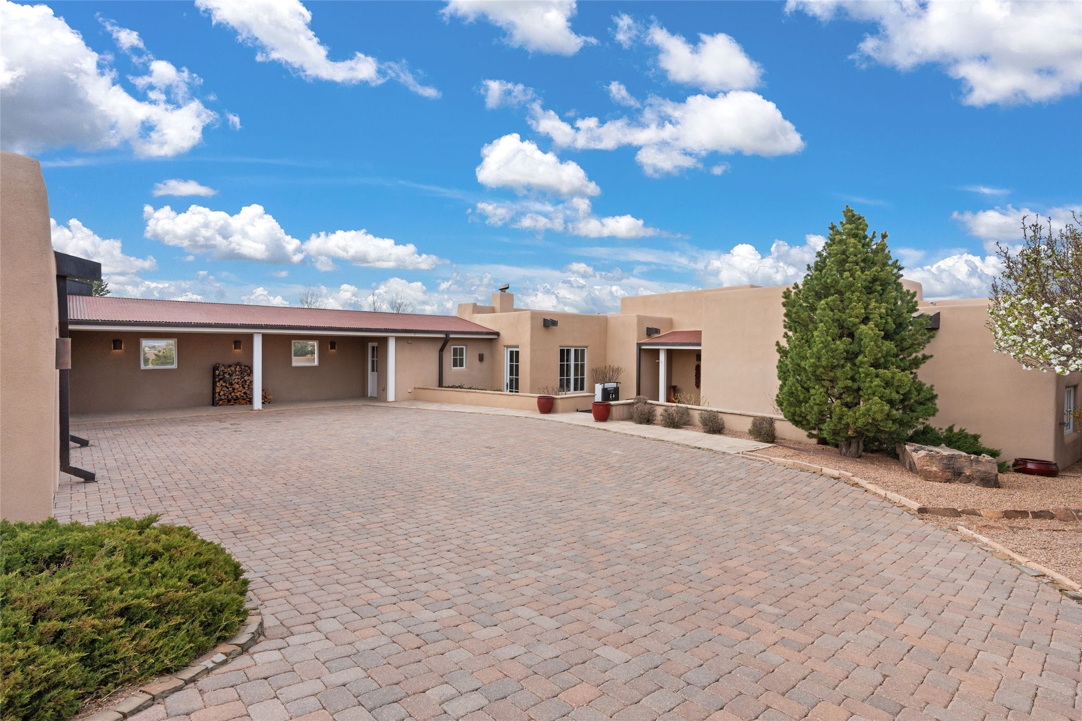 Panoramic Golf Course & Sangre de Cristo Mountain views are yours at this Soft Contemporary Masterpiece in Gated Las Campanas w 3 Bedrooms + Office + Media + 3-1/2 Baths, including a Guest House & 3-Car Garage & 6 Fireplaces. Spacious Living Room features a distinctive fireplace, wet bar & access to the back portal thru 4 glass doors that vanish into the wall, creating a 16-foot opening to the view. The Dining Room has space for 8 & a Chandelier of 6 stunning glass sculptures. The impressive Media Room has 11.2 sound system, refrigerator & reclining sectional couch. Gourmet Kitchen is designed for effortless meal preparation, w Wolf gas range/oven, Vent-a-Hood, Sub-Zero Refrigerator, double dishwasher + 4' x 9' island w prep sink & Insta-Hot water. The cozy Kitchen Nook has a wood-burning fireplace, room for casual dining + 2 lounge chairs.. The Main Bedroom Suite has a wood-burning fireplace, walk-in shower, 16-foot closet & & jetted tub w golf course view. Bedroom 2 is in a separate wing, located near the Den/Office. The free-standing Guest House offers the ultimate in privacy, w a Kitchen, Living area, Bedroom & washer/dryer. This Exquisite Residence has it All - 3 Bedrooms, Office, Media, 3-car garage, free-standing Guest House & recent major Stucco maintenance & GACO Roof Coating..The Outdoor Amenities make it a self-contained resort - Synthetic Putting Green, Fire Pit, Portal for the BBQ plus Golf & Mountain Views - Live the Resort Lifestyle in Las Campanas!