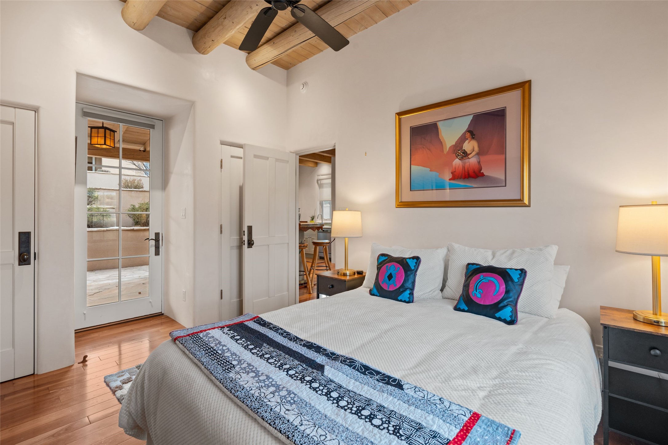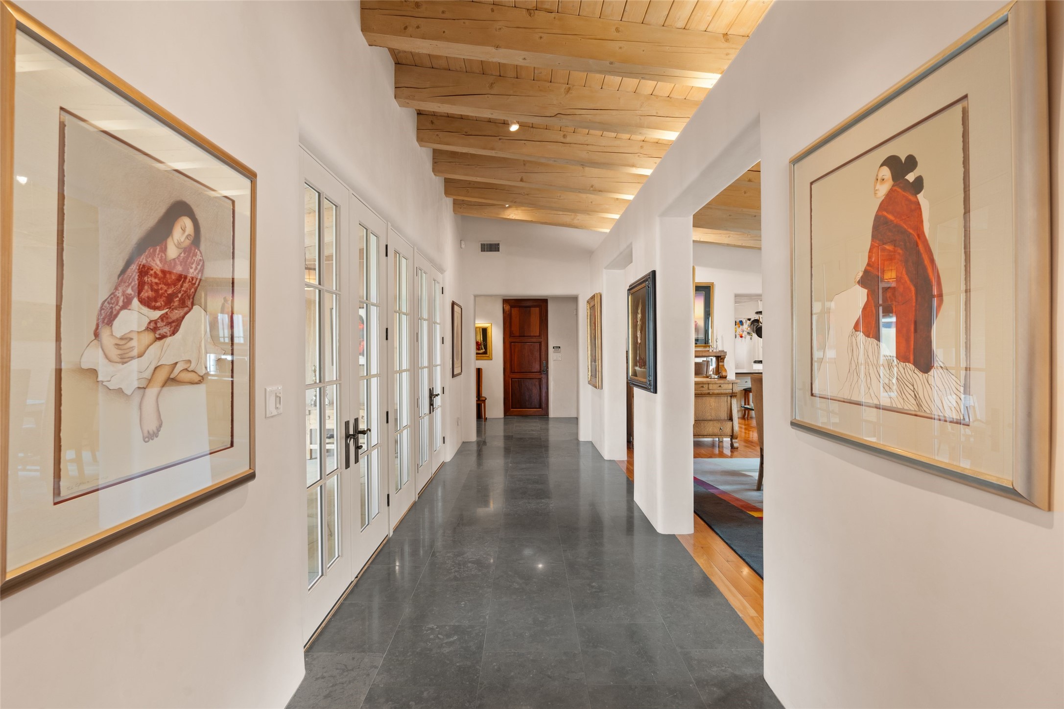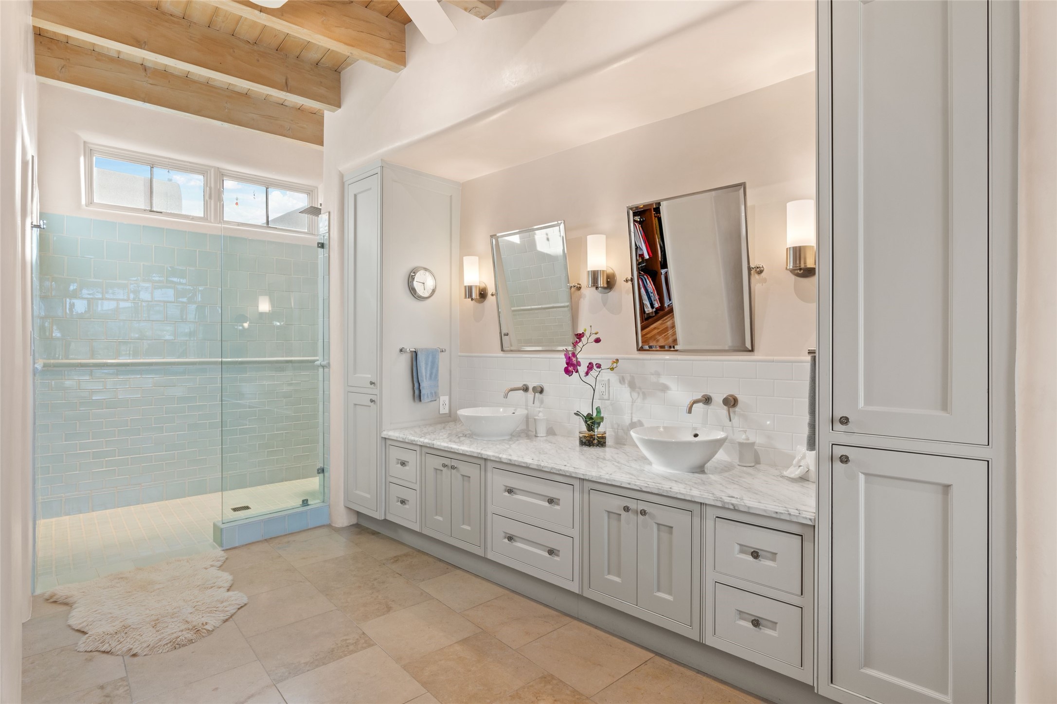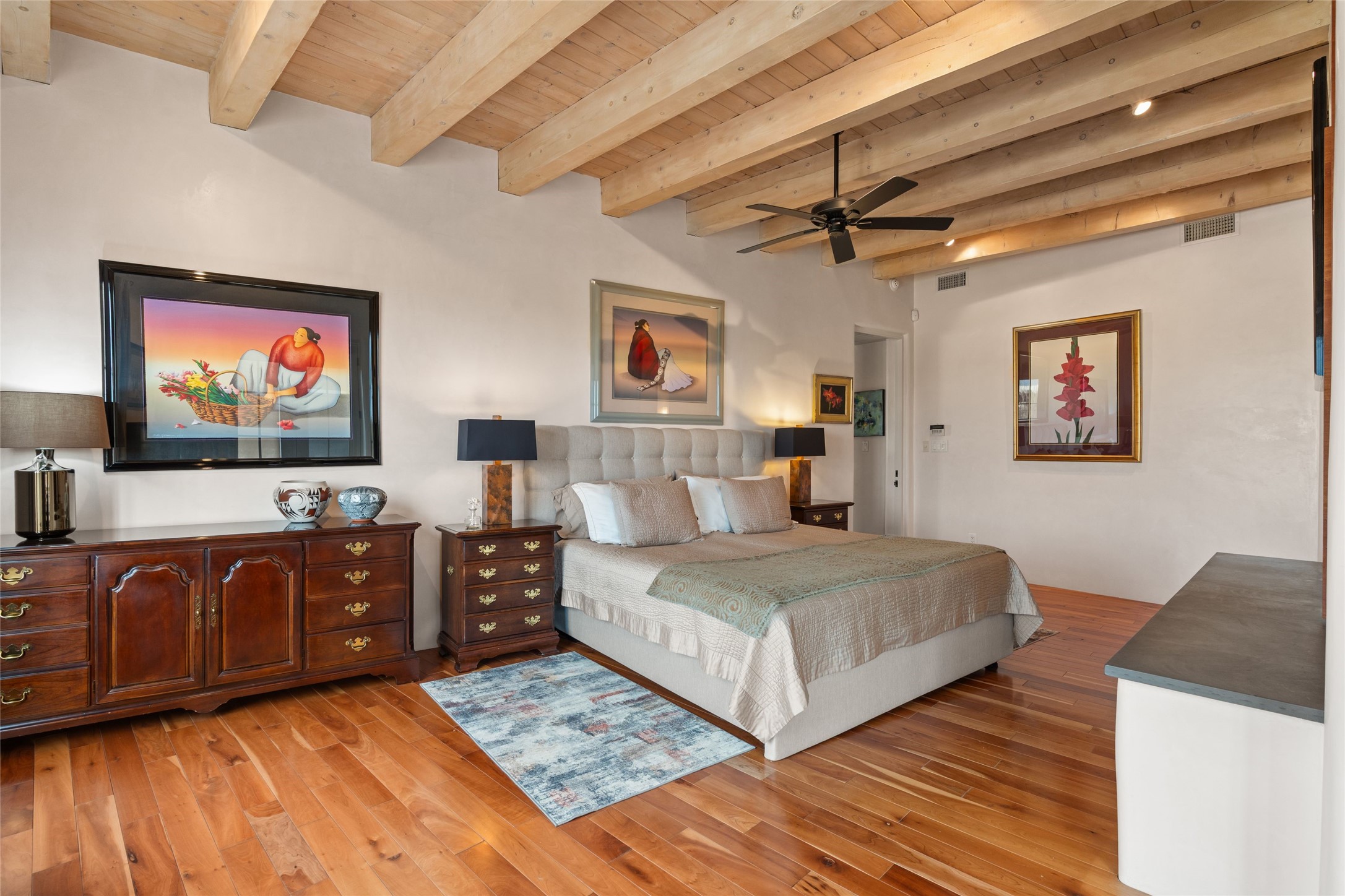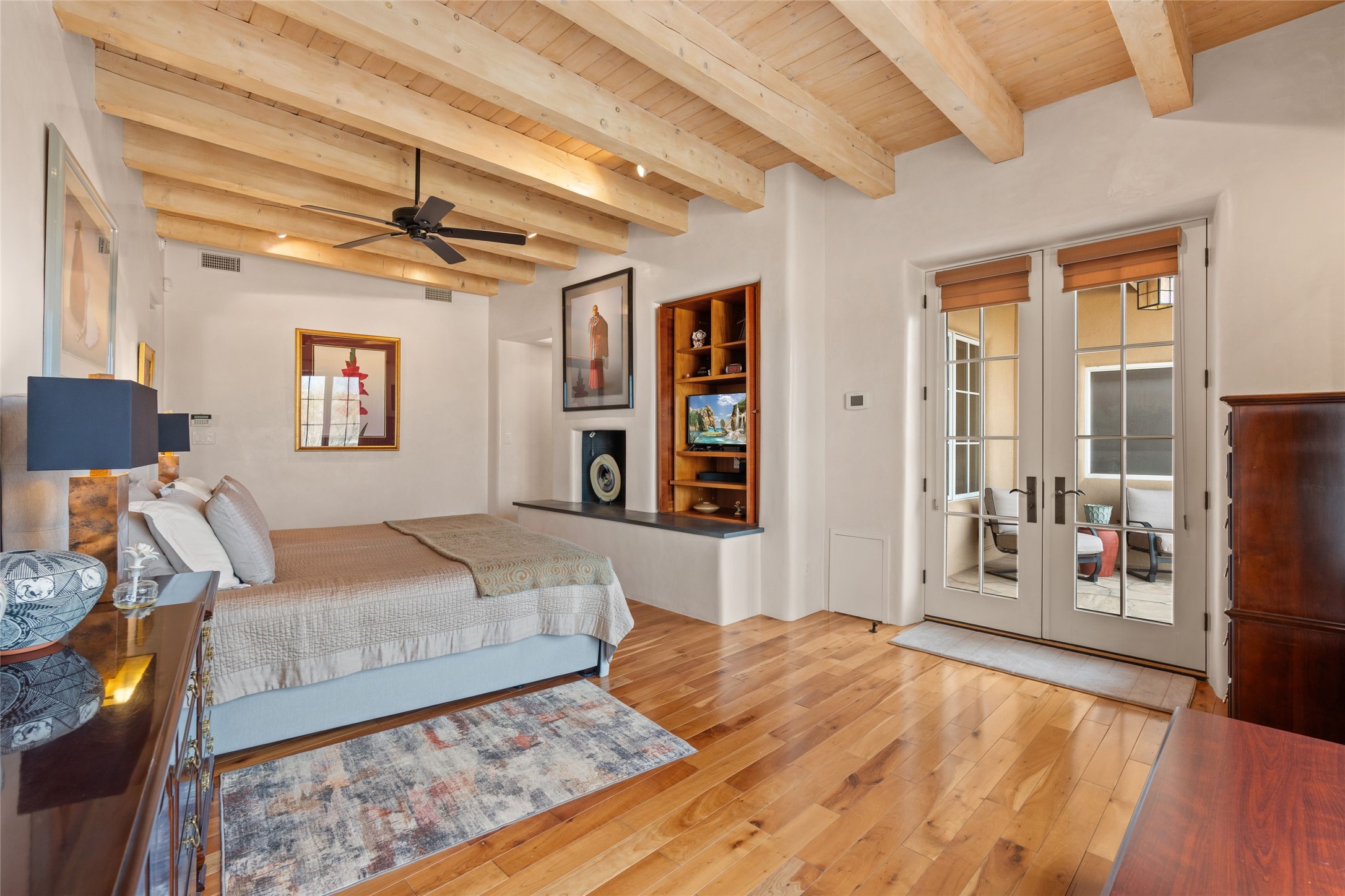 Panoramic Golf Course & Sangre de Cristo Mountain views are yours at this Soft Contemporary Masterpiece in Gated Las Campanas w 3 Bedrooms + Office + Media + 3-1/2 Baths, including a Guest House & 3-Car Garage & 6 Fireplaces. Spacious Living Room features a distinctive fireplace, wet bar & access to the back portal thru 4 glass doors that vanish into the wall, creating a 16-foot opening to the view. The Dining Room has space for 8 & a Chandelier of 6 stunning glass sculptures. The impressive Media Room has 11.2 sound system, refrigerator & reclining sectional couch. Gourmet Kitchen is designed for effortless meal preparation, w Wolf gas range/oven, Vent-a-Hood, Sub-Zero Refrigerator, double dishwasher + 4' x 9' island w prep sink & Insta-Hot water. The cozy Kitchen Nook has a wood-burning fireplace, room for casual dining + 2 lounge chairs.. The Main Bedroom Suite has a wood-burning fireplace, walk-in shower, 16-foot closet & & jetted tub w golf course view. Bedroom 2 is in a separate wing, located near the Den/Office. The free-standing Guest House offers the ultimate in privacy, w a Kitchen, Living area, Bedroom & washer/dryer. This Exquisite Residence has it All - 3 Bedrooms, Office, Media, 3-car garage, free-standing Guest House & recent major Stucco maintenance & GACO Roof Coating..The Outdoor Amenities make it a self-contained resort - Synthetic Putting Green, Fire Pit, Portal for the BBQ plus Golf & Mountain Views - Live the Resort Lifestyle in Las Campanas!