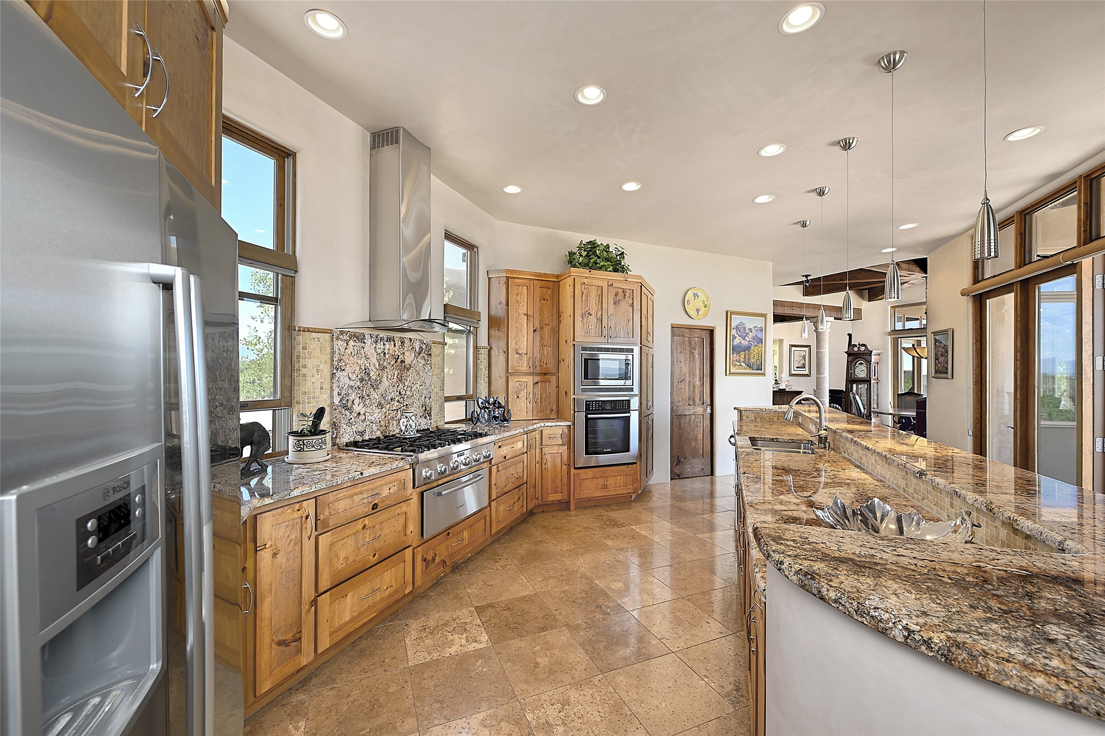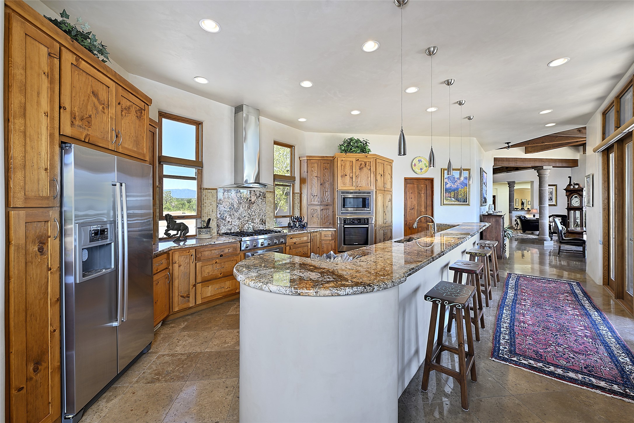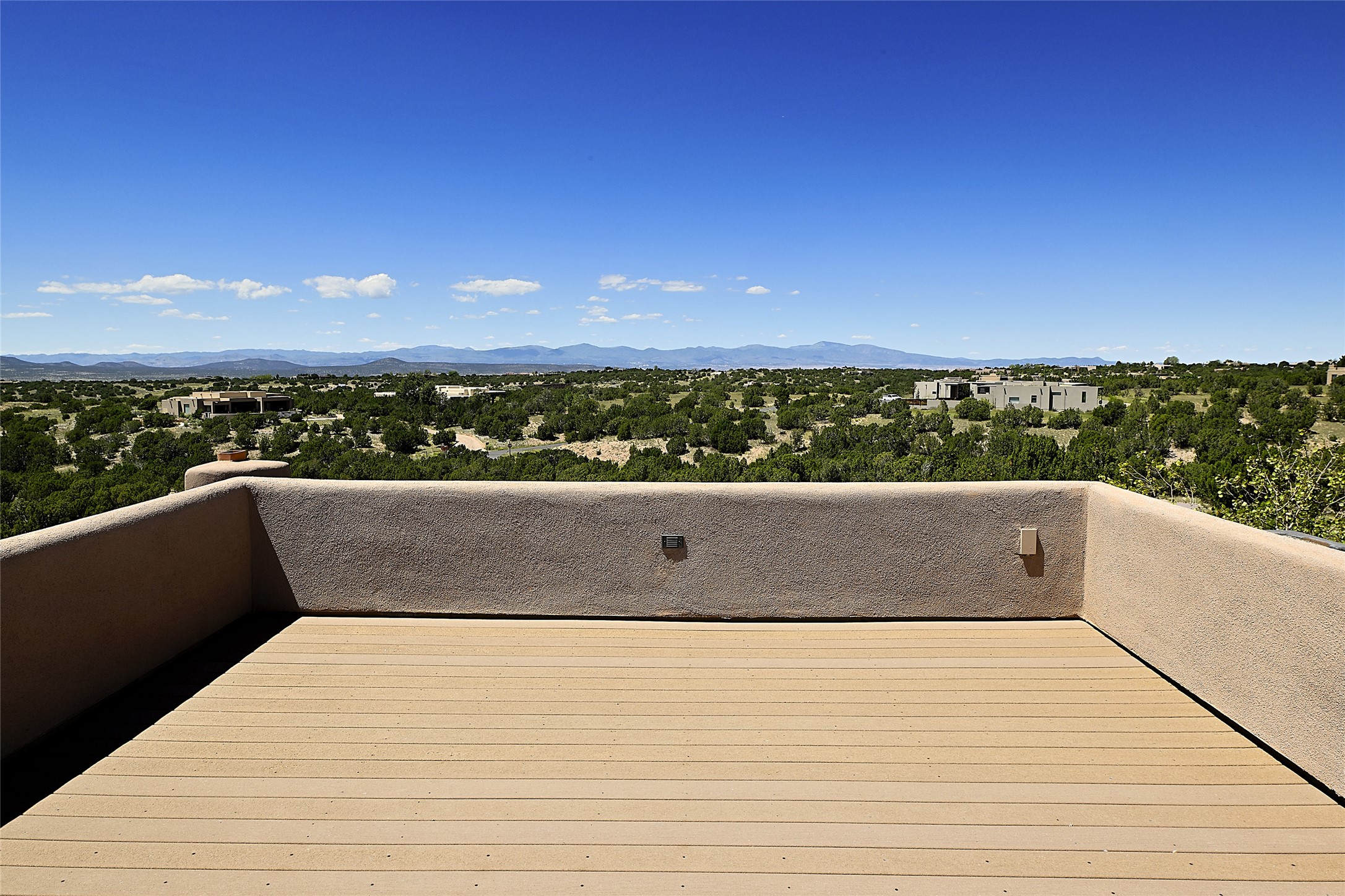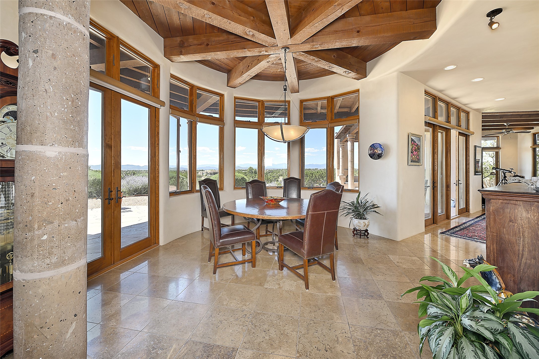 This beautiful 3,900+ sq ft, single level home is sited on a large and exciting 2.9 acre lot in Estates I of Las Campanas, only 6 miles from the Santa Fe Plaza. Incredible 360 degree views to the Jemez and Sandia mountains as well as the Sangre de Cristo mountains are framed by the spacious portals that surround the home, ideal for entertaining. The curved diamond plaster walls, with rounded details define the open living room, dining, kitchen and family areas. There are three bedrooms and four bathrooms, plus flex room. Mexican stone and travertine tiled floors and columns are skillfully incorporated into the luxurious interior spaces. A sweeping stairway on an outside portal leads to a roof top deck offering spectacular and unobstructed views of all the surrounding mountains. This gorgeous home has the location, design fit and fixtures that make it a must see. Memberships to The Club at Las Campanas are available for purchase upon approval.