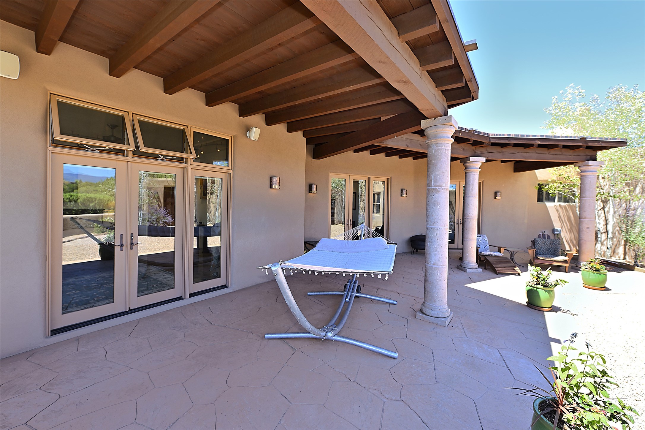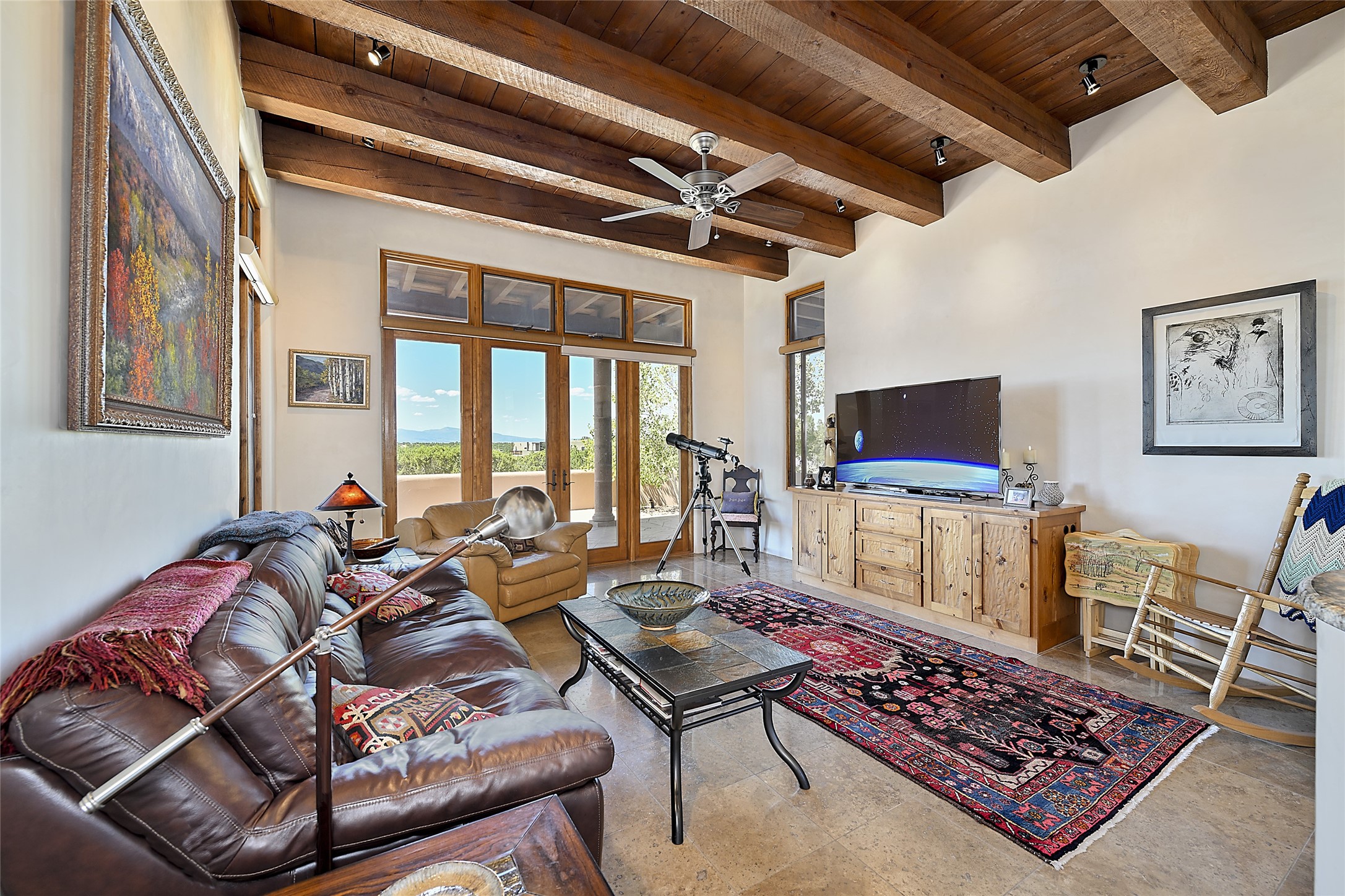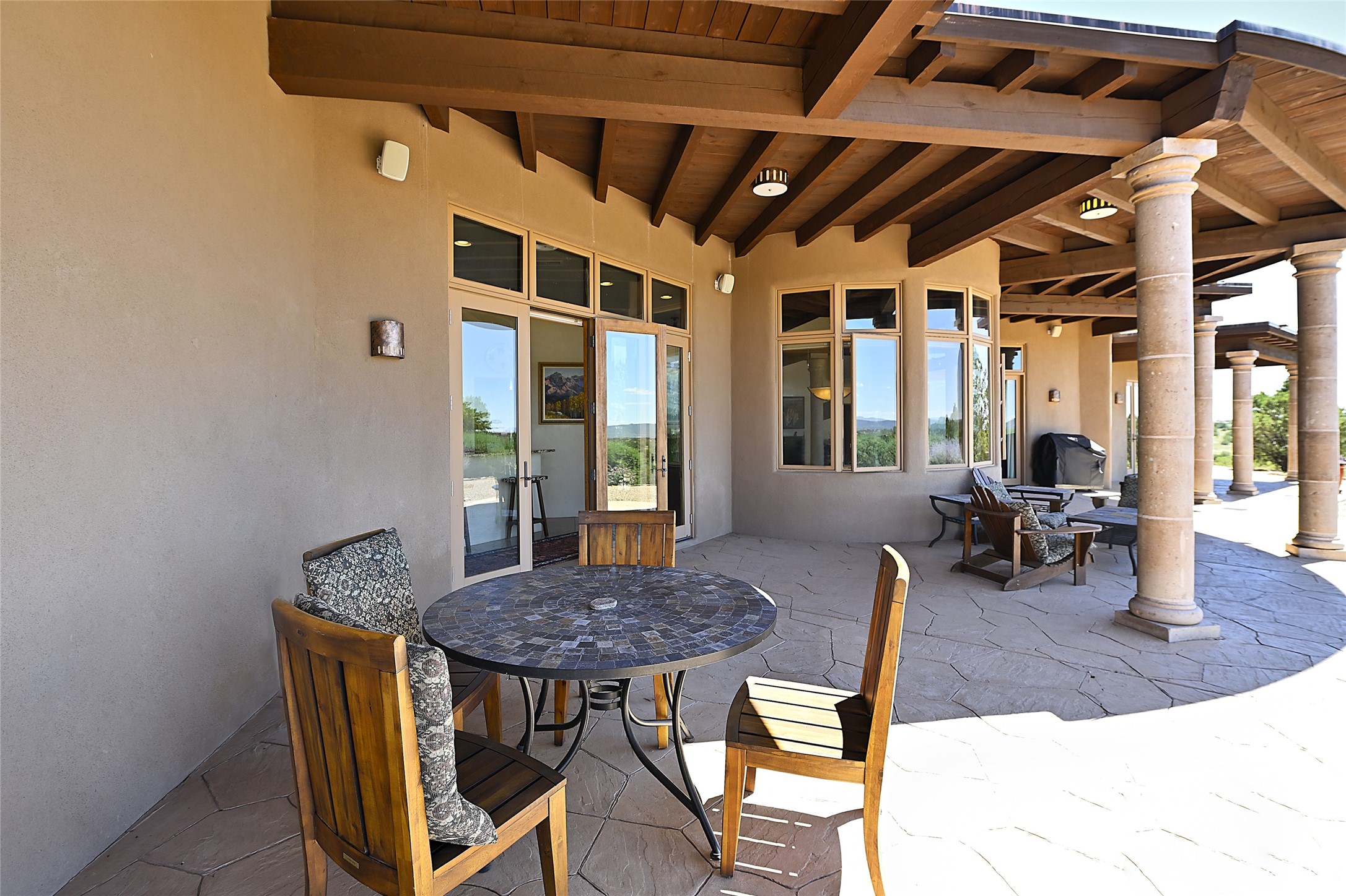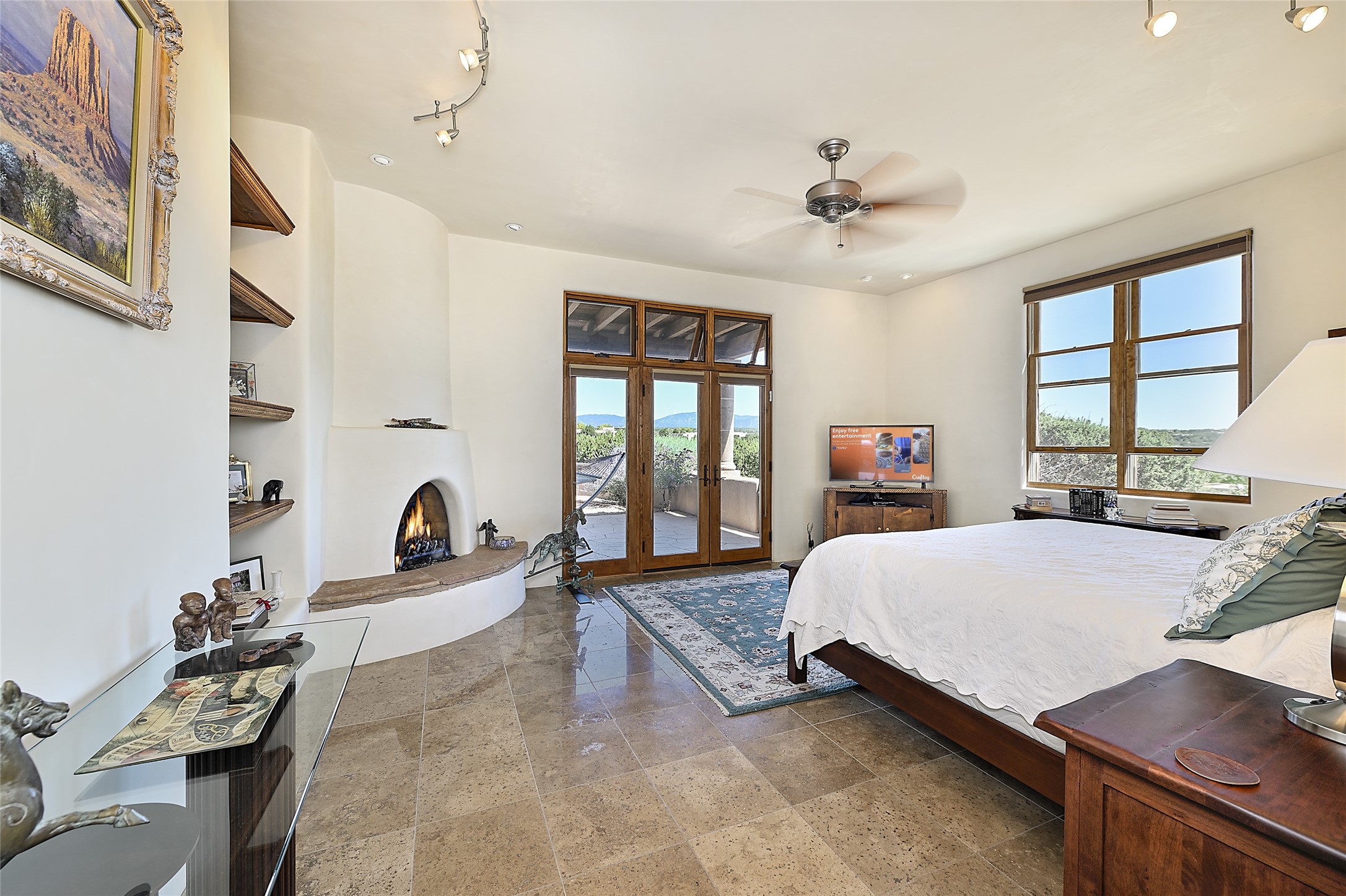 This beautiful 3,900+ sq ft, single level home is sited on a large and exciting 2.9 acre lot in Estates I of Las Campanas, only 6 miles from the Santa Fe Plaza. Incredible 360 degree views to the Jemez and Sandia mountains as well as the Sangre de Cristo mountains are framed by the spacious portals that surround the home, ideal for entertaining. The curved diamond plaster walls, with rounded details define the open living room, dining, kitchen and family areas. There are three bedrooms and four bathrooms, plus flex room. Mexican stone and travertine tiled floors and columns are skillfully incorporated into the luxurious interior spaces. A sweeping stairway on an outside portal leads to a roof top deck offering spectacular and unobstructed views of all the surrounding mountains. This gorgeous home has the location, design fit and fixtures that make it a must see. Memberships to The Club at Las Campanas are available for purchase upon approval.