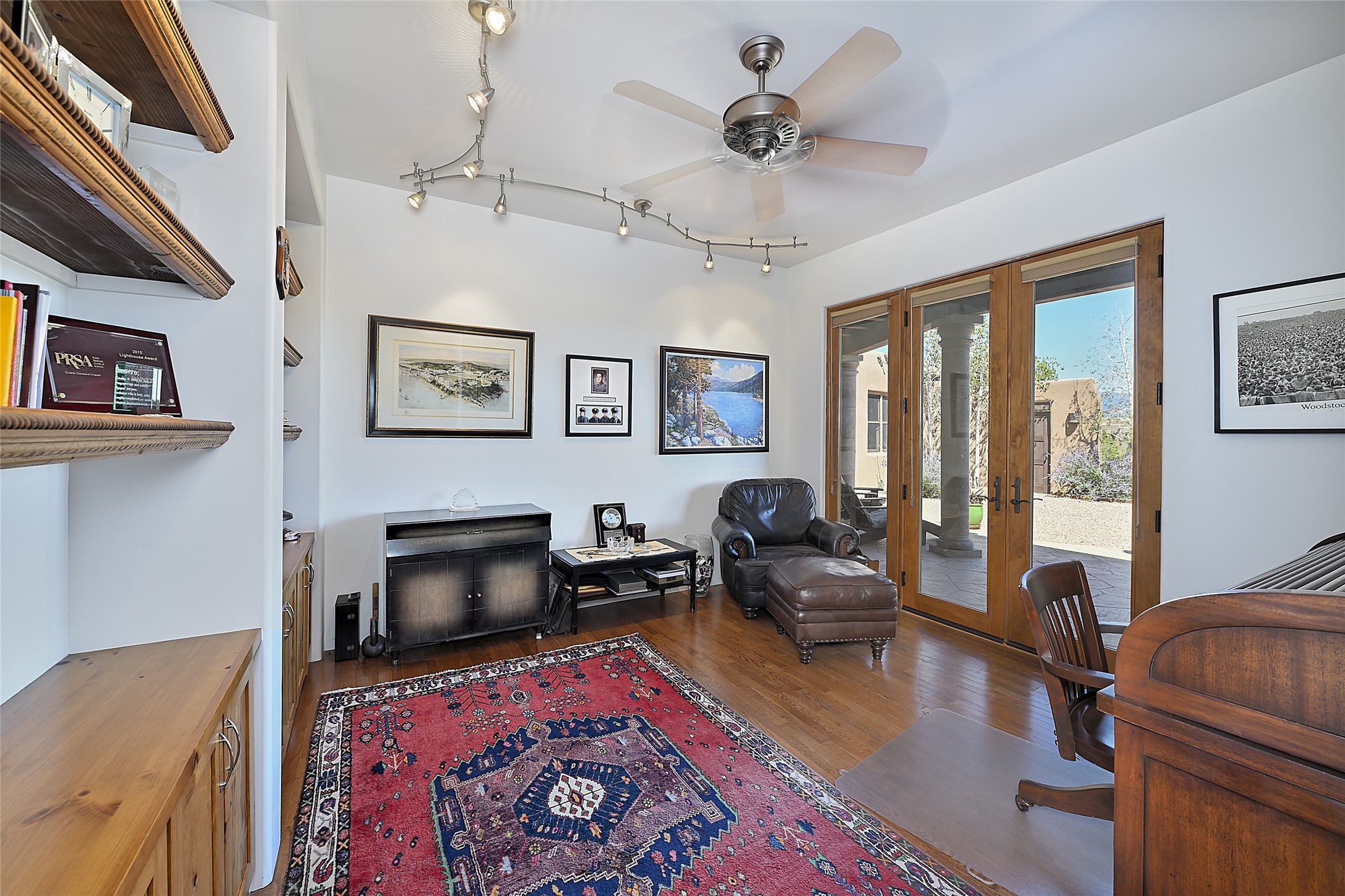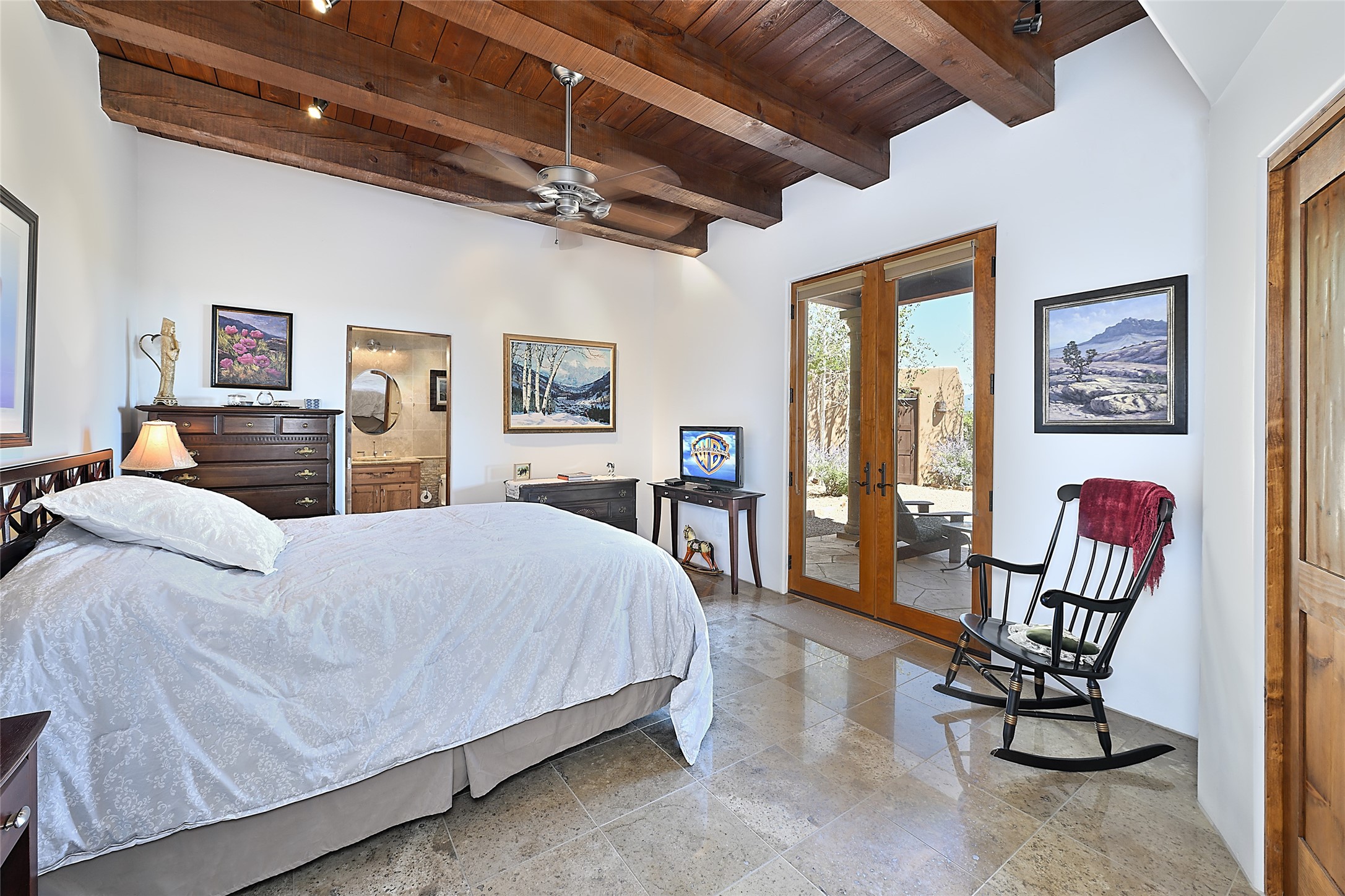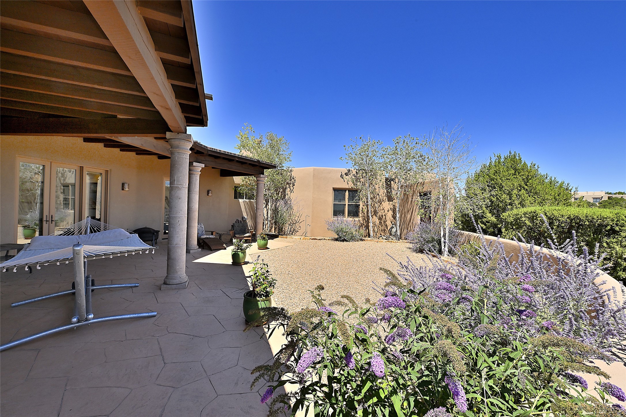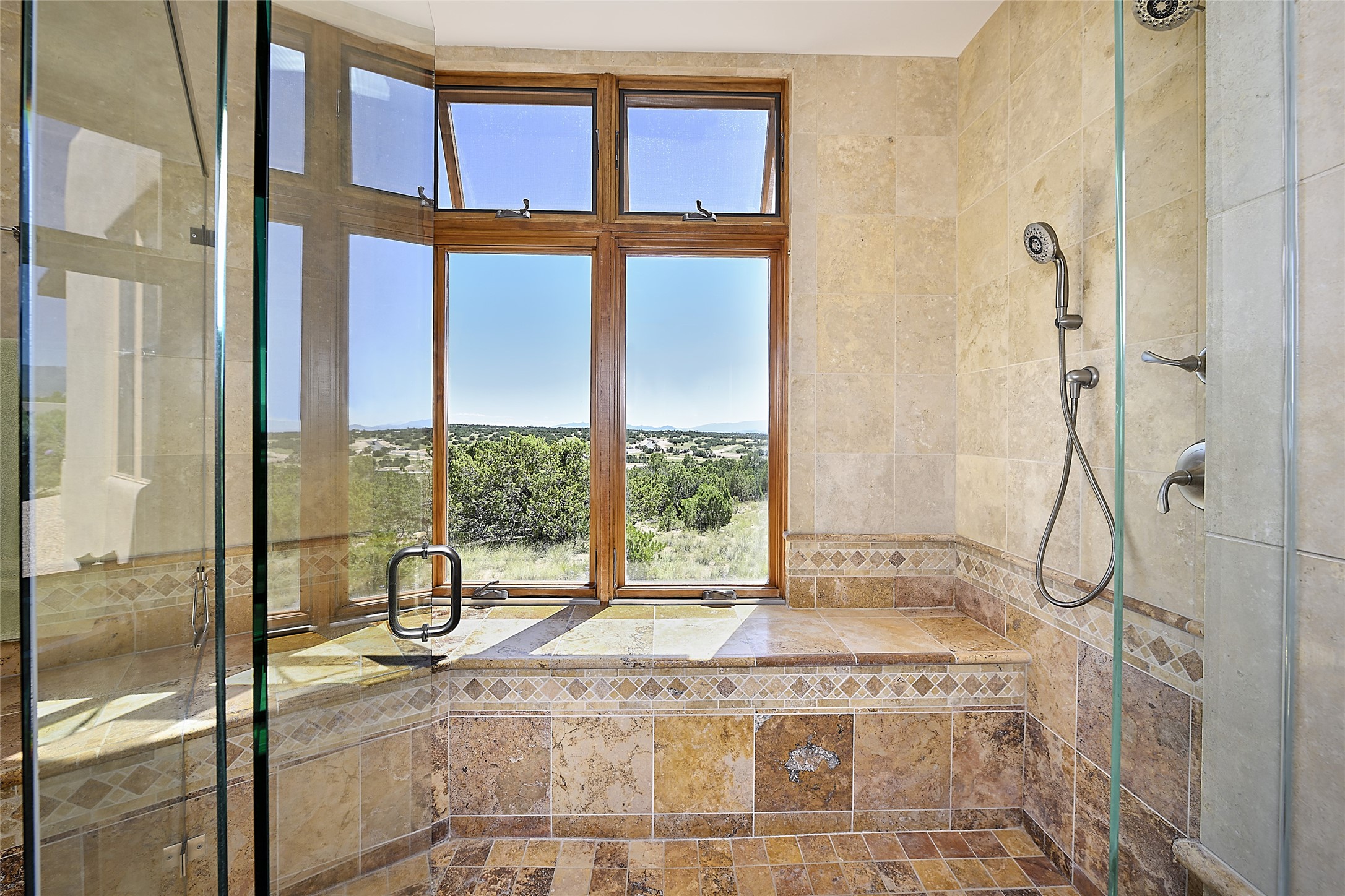 This beautiful 3,900+ sq ft, single level home is sited on a large and exciting 2.9 acre lot in Estates I of Las Campanas, only 6 miles from the Santa Fe Plaza. Incredible 360 degree views to the Jemez and Sandia mountains as well as the Sangre de Cristo mountains are framed by the spacious portals that surround the home, ideal for entertaining. The curved diamond plaster walls, with rounded details define the open living room, dining, kitchen and family areas. There are three bedrooms and four bathrooms, plus flex room. Mexican stone and travertine tiled floors and columns are skillfully incorporated into the luxurious interior spaces. A sweeping stairway on an outside portal leads to a roof top deck offering spectacular and unobstructed views of all the surrounding mountains. This gorgeous home has the location, design fit and fixtures that make it a must see. Memberships to The Club at Las Campanas are available for purchase upon approval.
