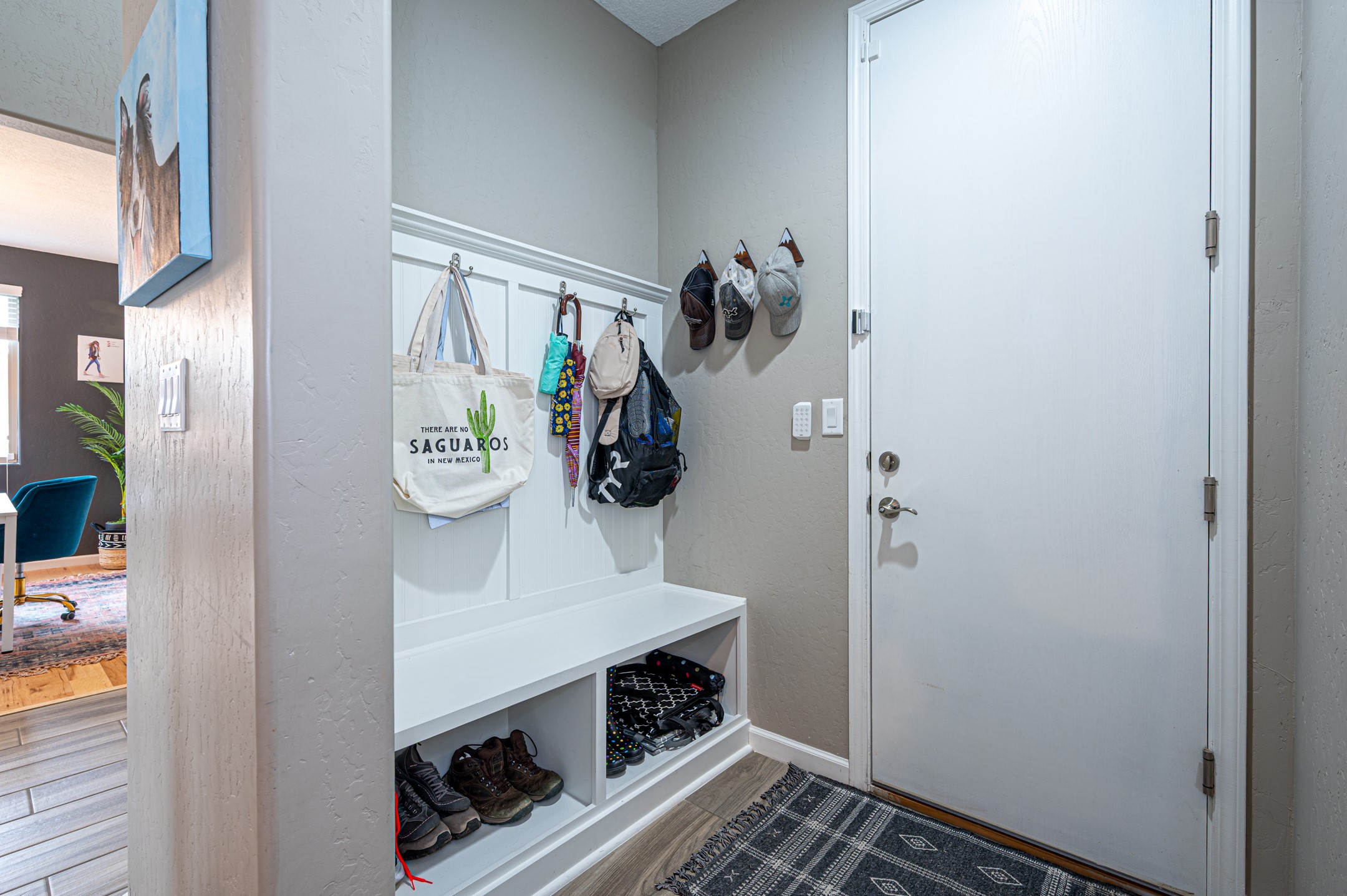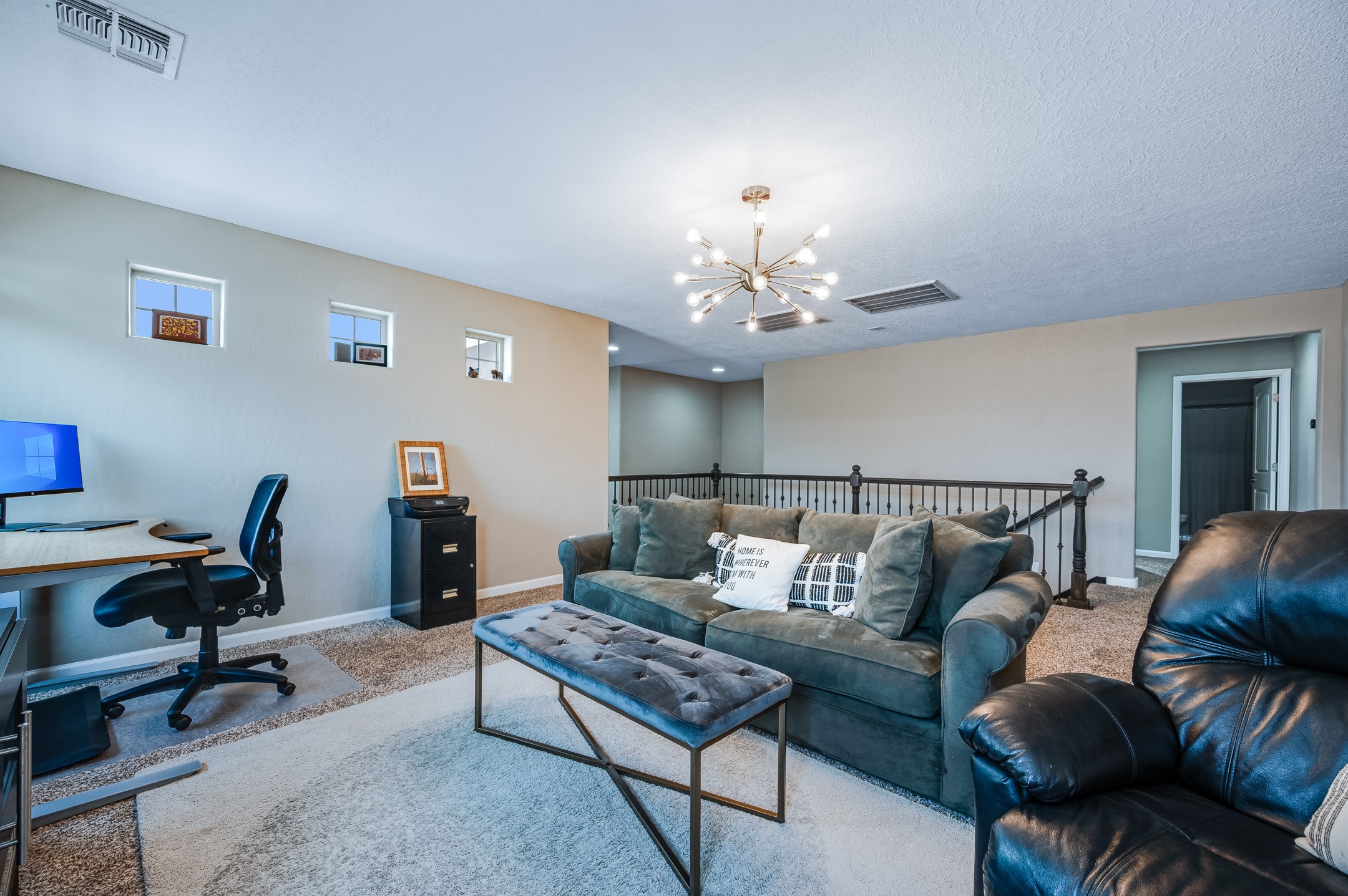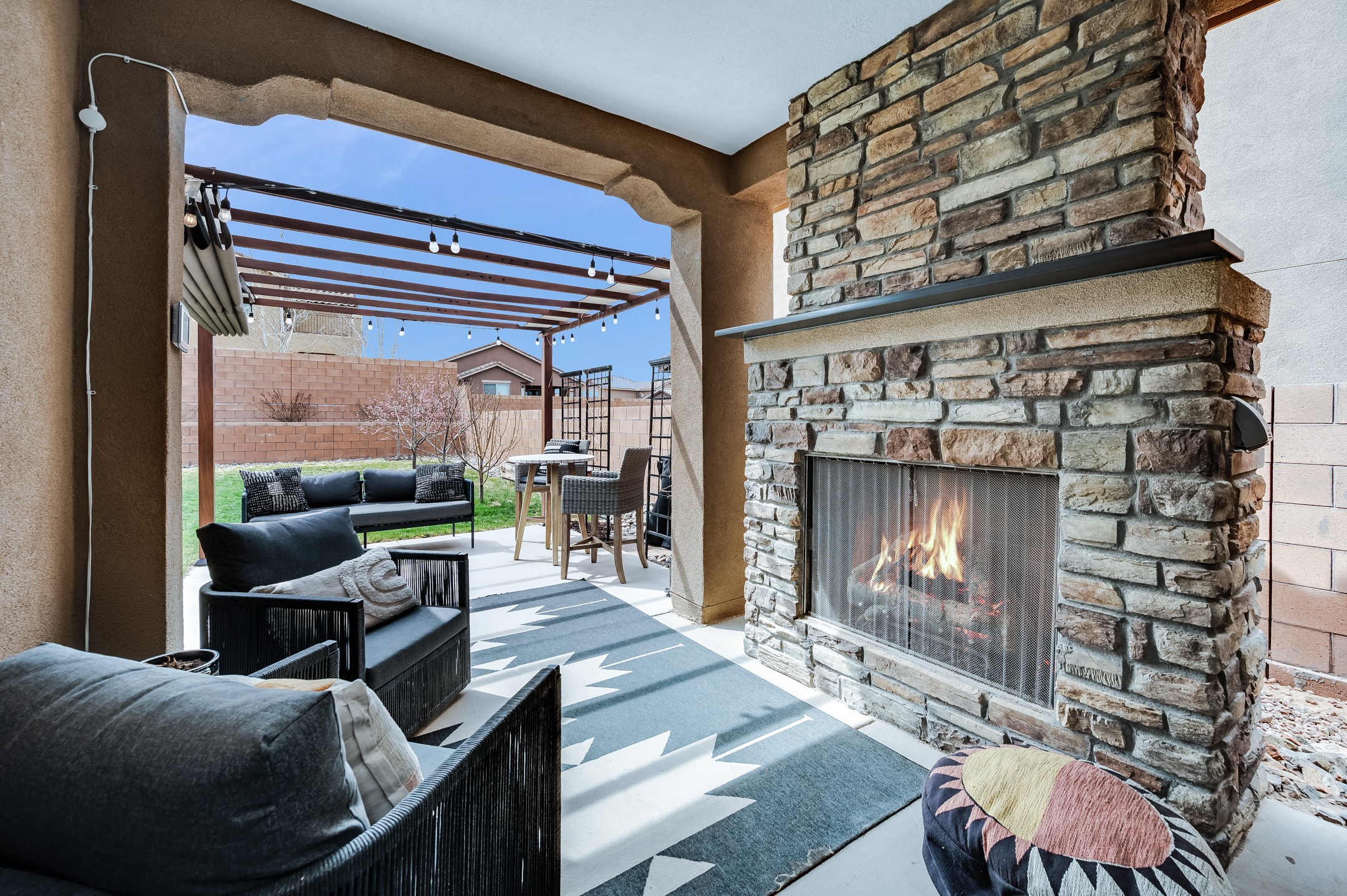 Discover stylish living in this newly listed Vistas de Las Soleras home. The skillfully designed Carissa floor plan caters to both everyday comforts and high-end entertaining. This stunning residence - in mint condition, features an open concept living area with bar, office, laundry, mud room, guest bed & bath AND a luxurious owners' suite...ALL on the main level. The heart of the home is anchored with a cozy fireplace, enhanced by the natural light streaming in from large windows. A recently renovated kitchen is equipped with top-tier appliances, large island with bar seating, and quartz countertops. Step outside to enjoy a charming back portal with its own fireplace, perfect for alfresco dining and entertaining. Established landscaping with irrigation, an attached garage that can accommodate 2-3 cars (or 2 + workshop), high ceilings, central A/C, and an upstairs den with guest suite for additional relaxation space or hosting visitors, all add to the appeal of this virtually new home. Proximity to essential amenities is a real plus - with Santa Fe Regional Airport, Santa Fe Place Mall, and Presbyterian Santa Fe Medical Center all within easy reach. Experience comfort and convenience in this beautifully crafted, move-in ready home. **See additional information in Broker Remarks. Details as provided by Sellers.**
