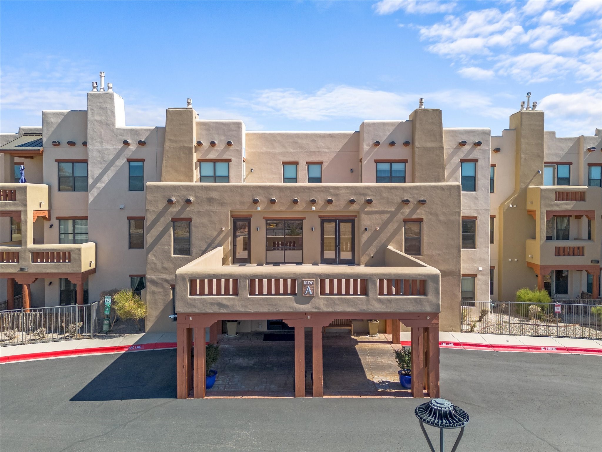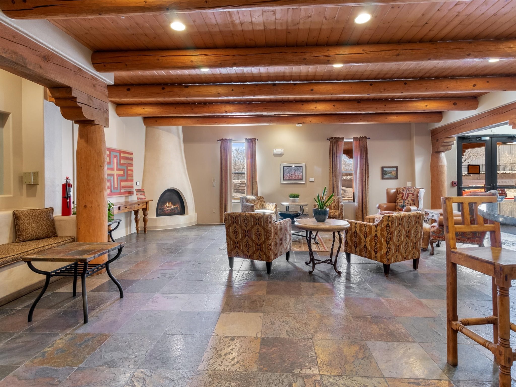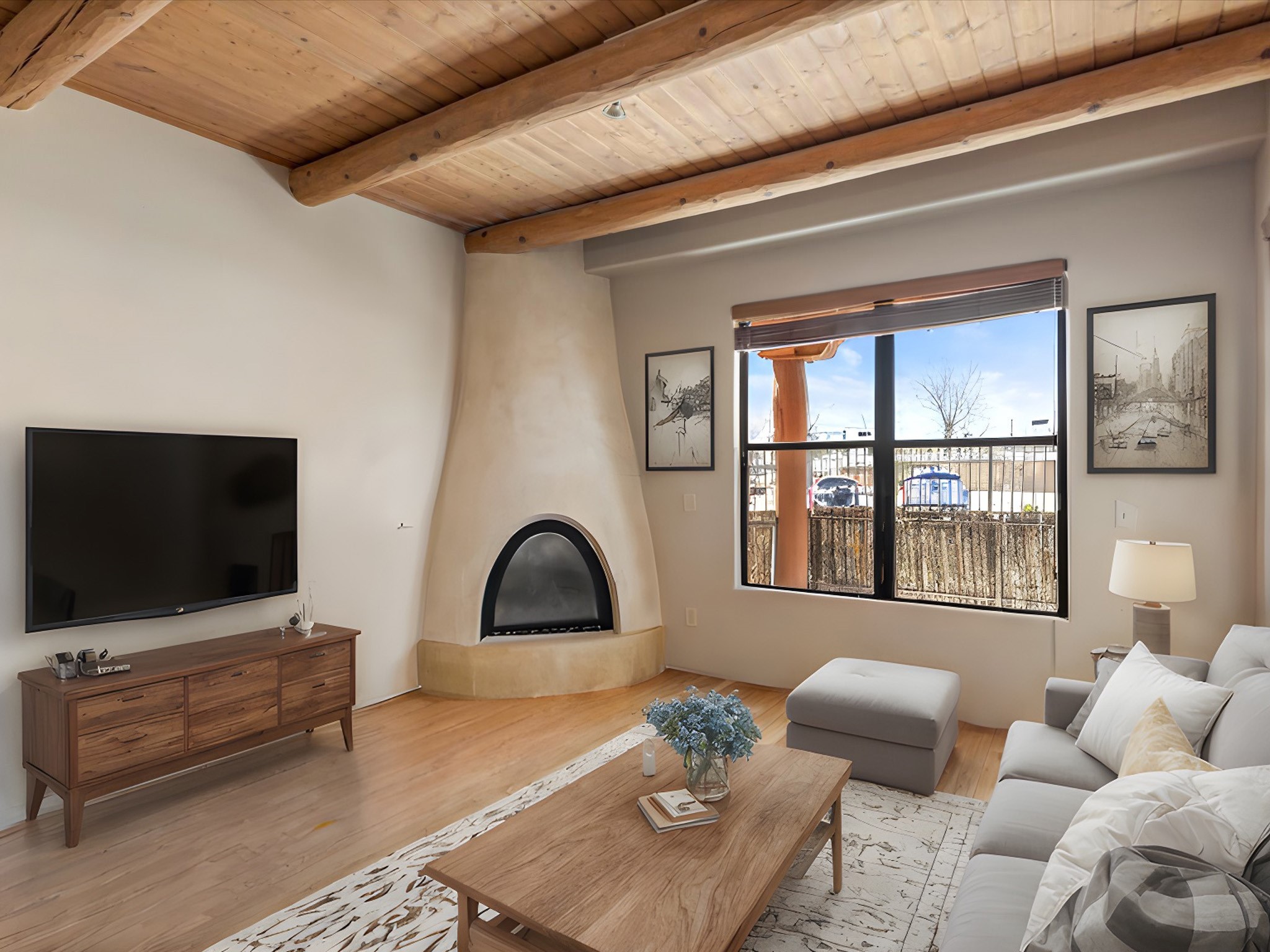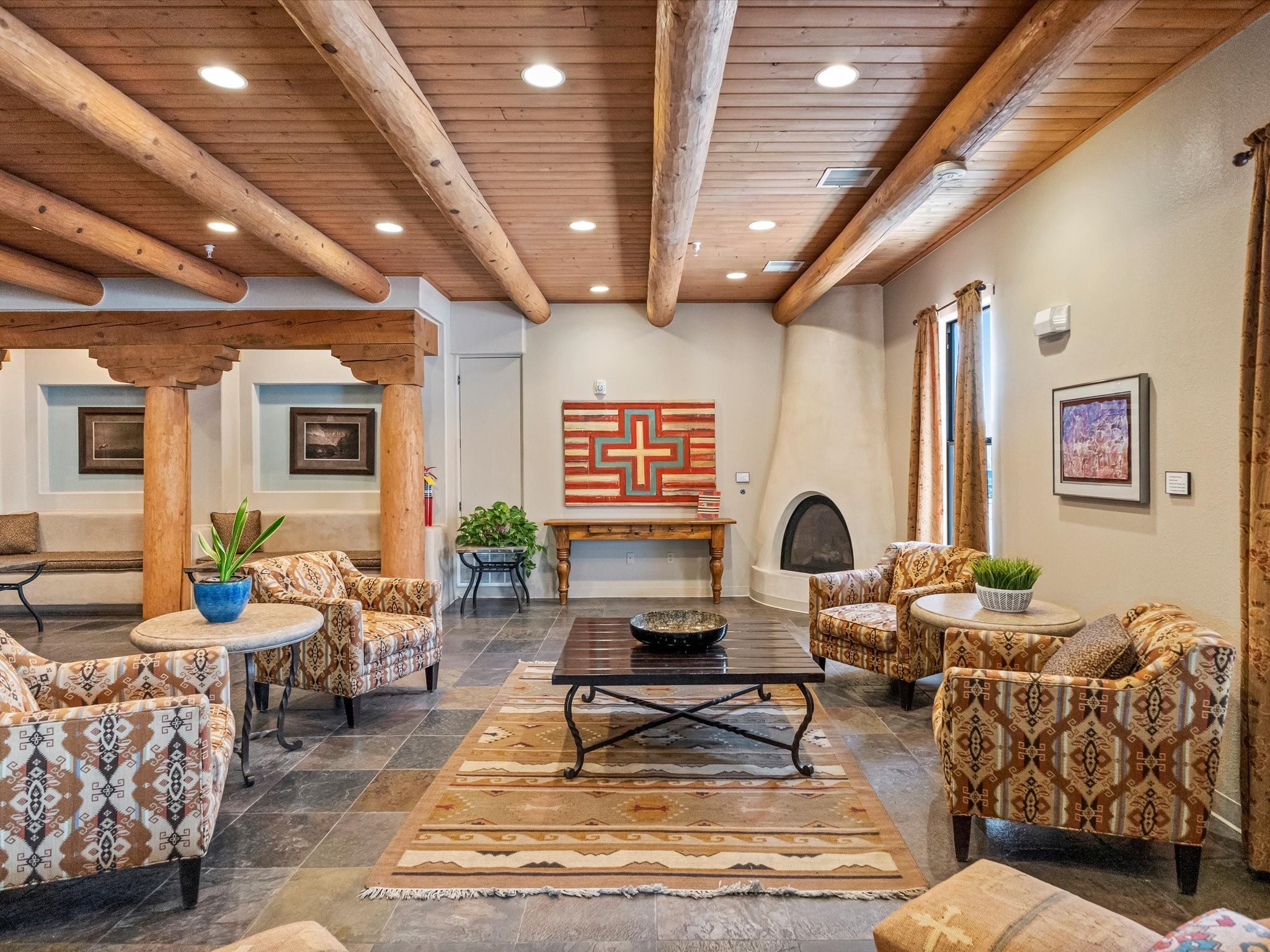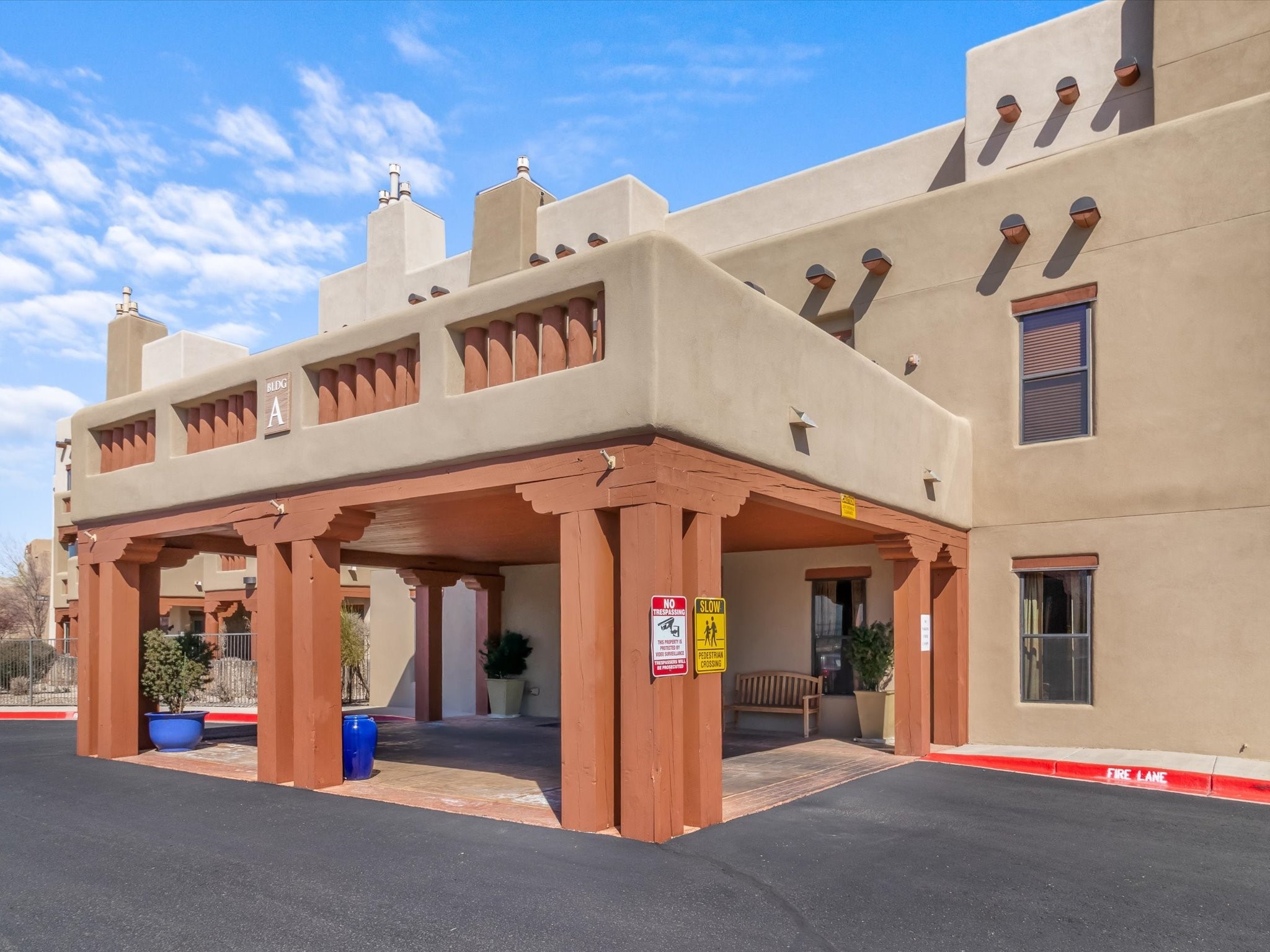 Charming Ground-Floor Condo in The Alameda - Santa Fe Living at Its Best!Welcome to this highly desirable 1-bedroom, 1.5-bathroom ground-floor condo, ideally situated near the secure front entrance of The Alameda Condominiums. This beautifully appointed former model/showroom unit offers style, convenience, and comfort in one perfect package.Step inside to discover a blend of upscale Pueblo-style charm and modern features. Soaring ceilings, decorative wood corbels and vigas, a cozy kiva fireplace, and a custom sliding barn door set a warm, inviting tone. The thoughtfully designed layout includes an open living area, a spacious walk-in closet, a powder room, and an in-unit washer/dryer for ultimate convenience.Enjoy cooking in the modern kitchen, complete with stainless steel appliances, granite countertops, and sleek slate floors. Step outside to your private patio surrounded by classic coyote fencing - a tranquil spot to relax or entertain.This unit also includes a large deeded storage space just steps from your front door, as well as easy access to the mailroom.Residents of The Alameda enjoy lots of amenities including gated parking, 24/7 controlled access, on-site management and maintenance, a fitness center, swimming pool, clubhouse, elevators, and beautifully landscaped grounds. Located close to Santa Fe Place Mall, Sprouts, Albertsons, and with direct access to bike and nature trails - you'll have everything you need at your fingertips. Just a ~10-minute drive to the iconic Santa Fe Plaza!Don't miss your chance to own a slice of Santa Fe charm in one of the city's most sought-after communities!