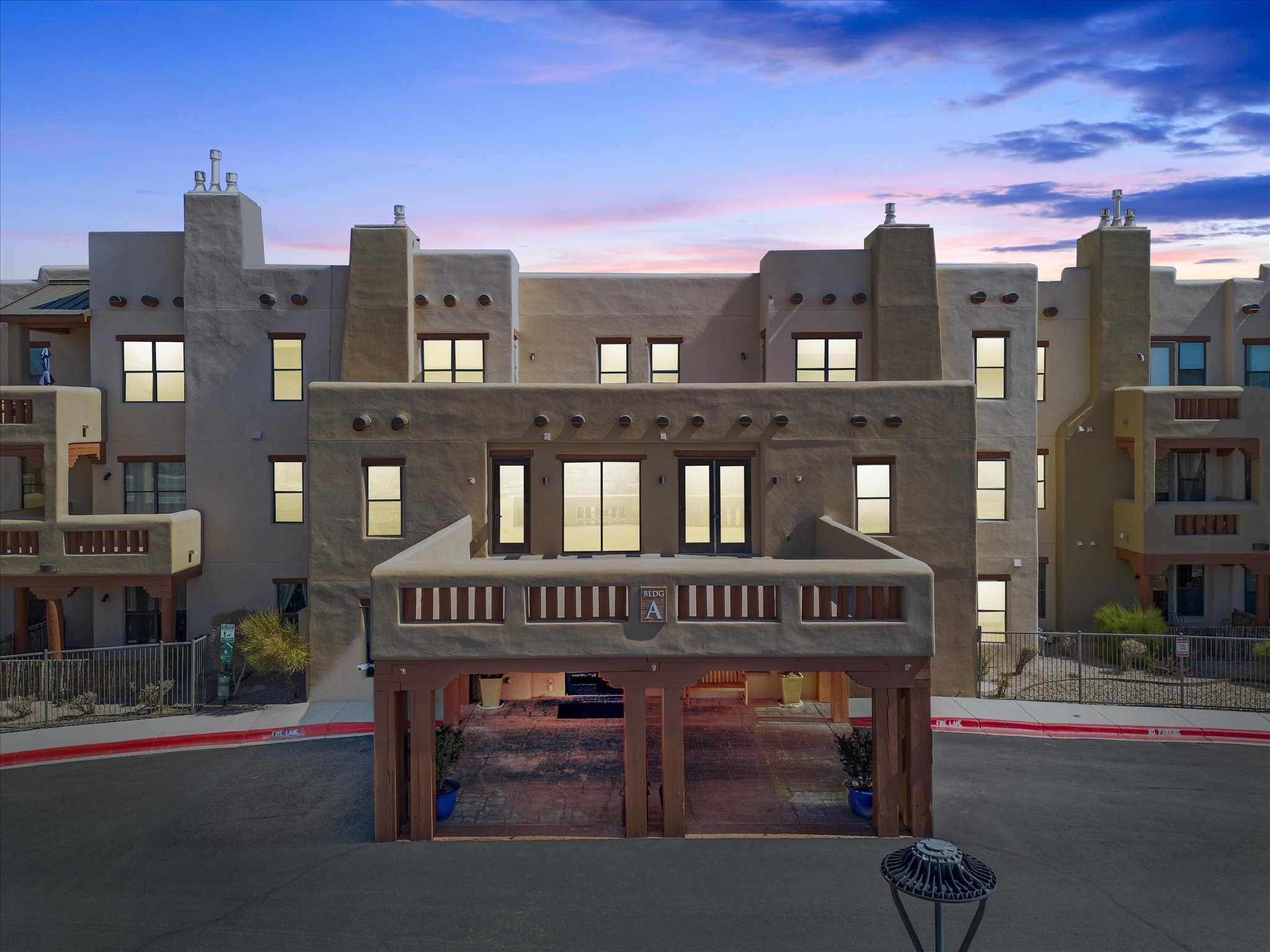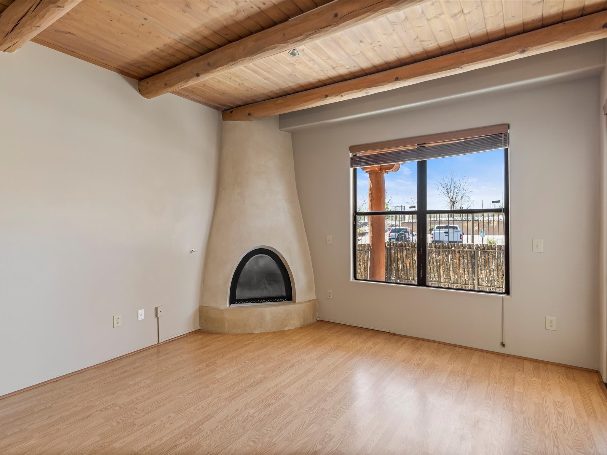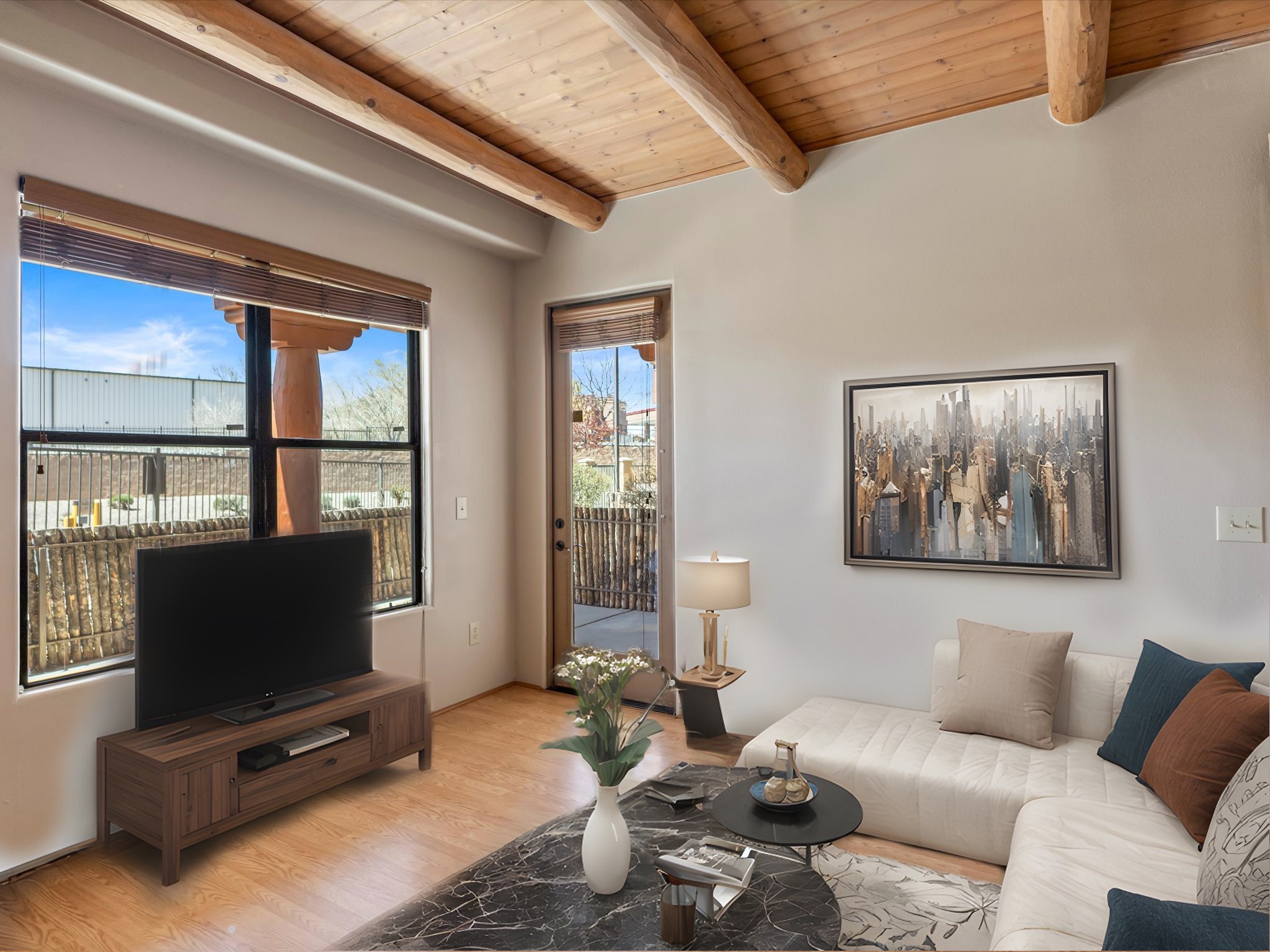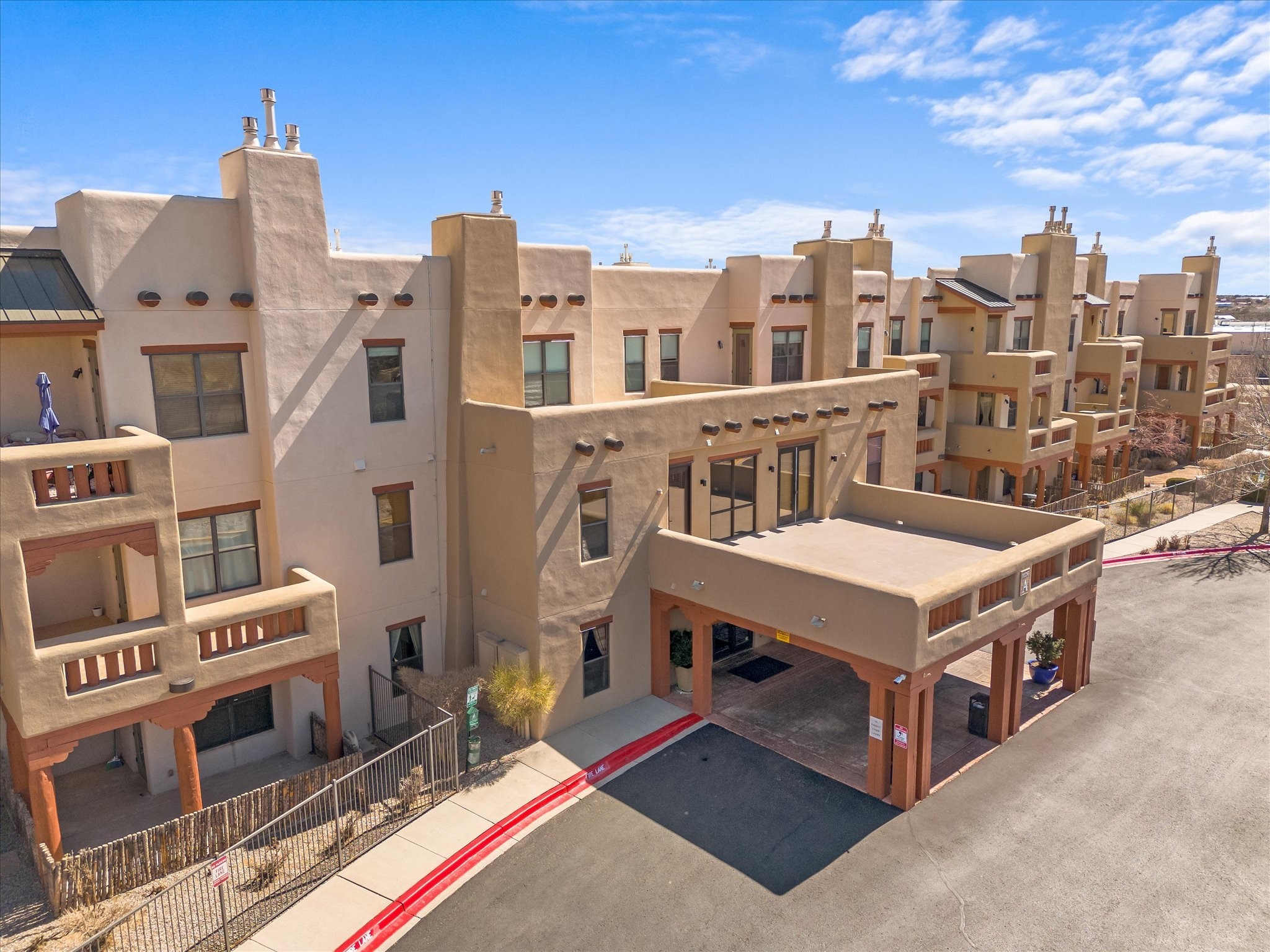 Charming Ground-Floor Condo in The Alameda - Santa Fe Living at Its Best!Welcome to this highly desirable 1-bedroom, 1.5-bathroom ground-floor condo, ideally situated near the secure front entrance of The Alameda Condominiums. This beautifully appointed former model/showroom unit offers style, convenience, and comfort in one perfect package.Step inside to discover a blend of upscale Pueblo-style charm and modern features. Soaring ceilings, decorative wood corbels and vigas, a cozy kiva fireplace, and a custom sliding barn door set a warm, inviting tone. The thoughtfully designed layout includes an open living area, a spacious walk-in closet, a powder room, and an in-unit washer/dryer for ultimate convenience.Enjoy cooking in the modern kitchen, complete with stainless steel appliances, granite countertops, and sleek slate floors. Step outside to your private patio surrounded by classic coyote fencing - a tranquil spot to relax or entertain.This unit also includes a large deeded storage space just steps from your front door, as well as easy access to the mailroom.Residents of The Alameda enjoy lots of amenities including gated parking, 24/7 controlled access, on-site management and maintenance, a fitness center, swimming pool, clubhouse, elevators, and beautifully landscaped grounds. Located close to Santa Fe Place Mall, Sprouts, Albertsons, and with direct access to bike and nature trails - you'll have everything you need at your fingertips. Just a ~10-minute drive to the iconic Santa Fe Plaza!Don't miss your chance to own a slice of Santa Fe charm in one of the city's most sought-after communities!