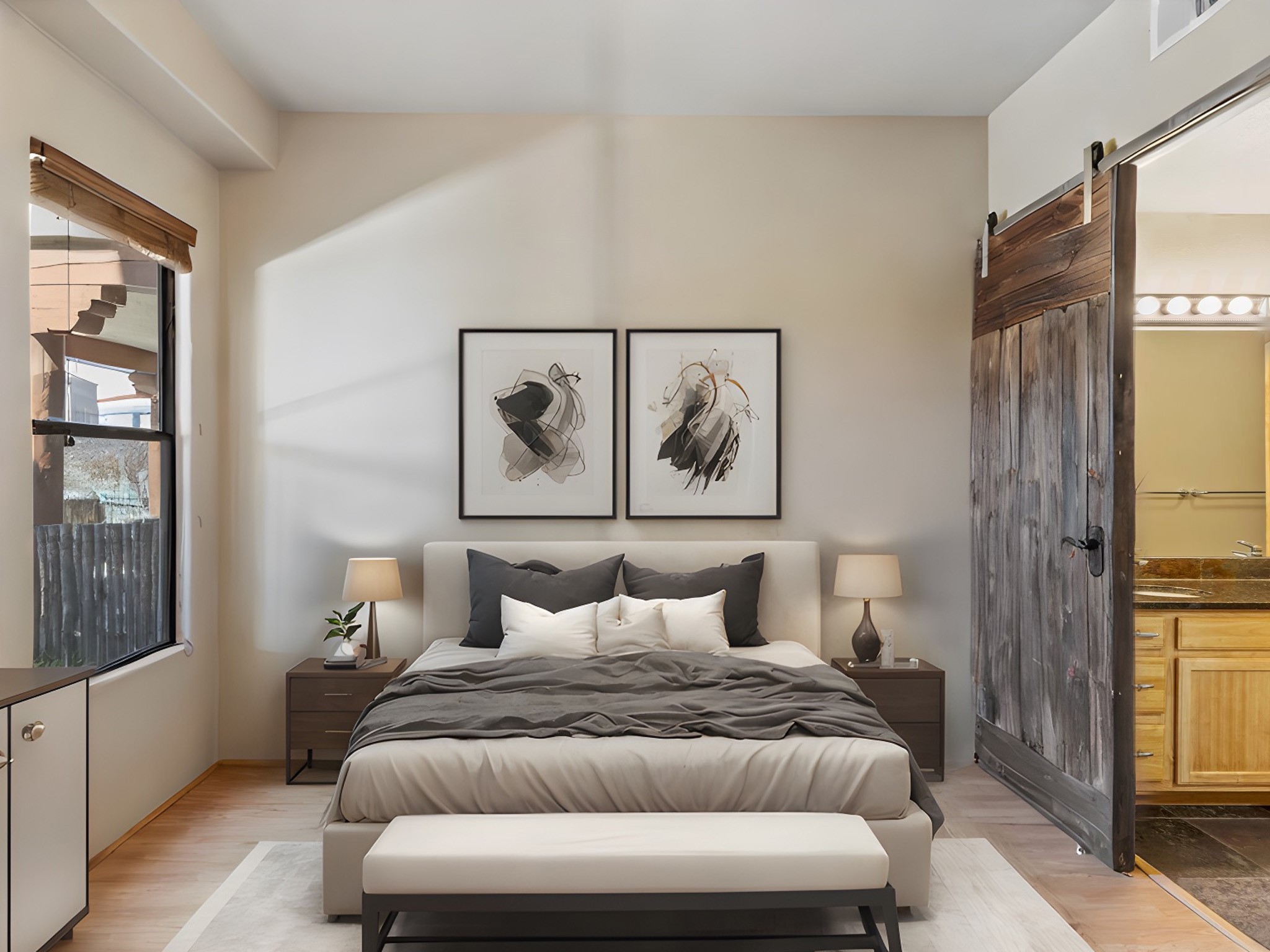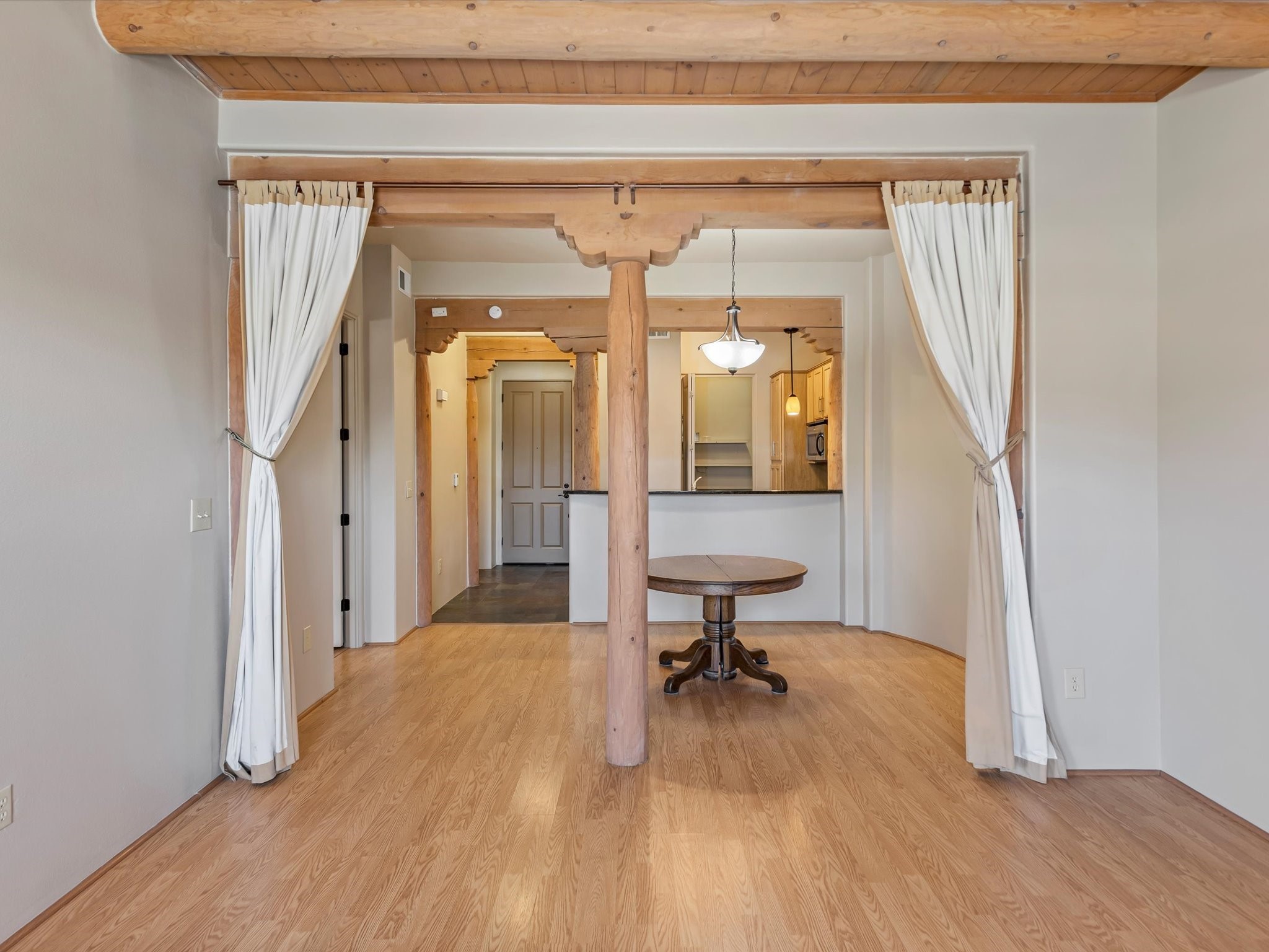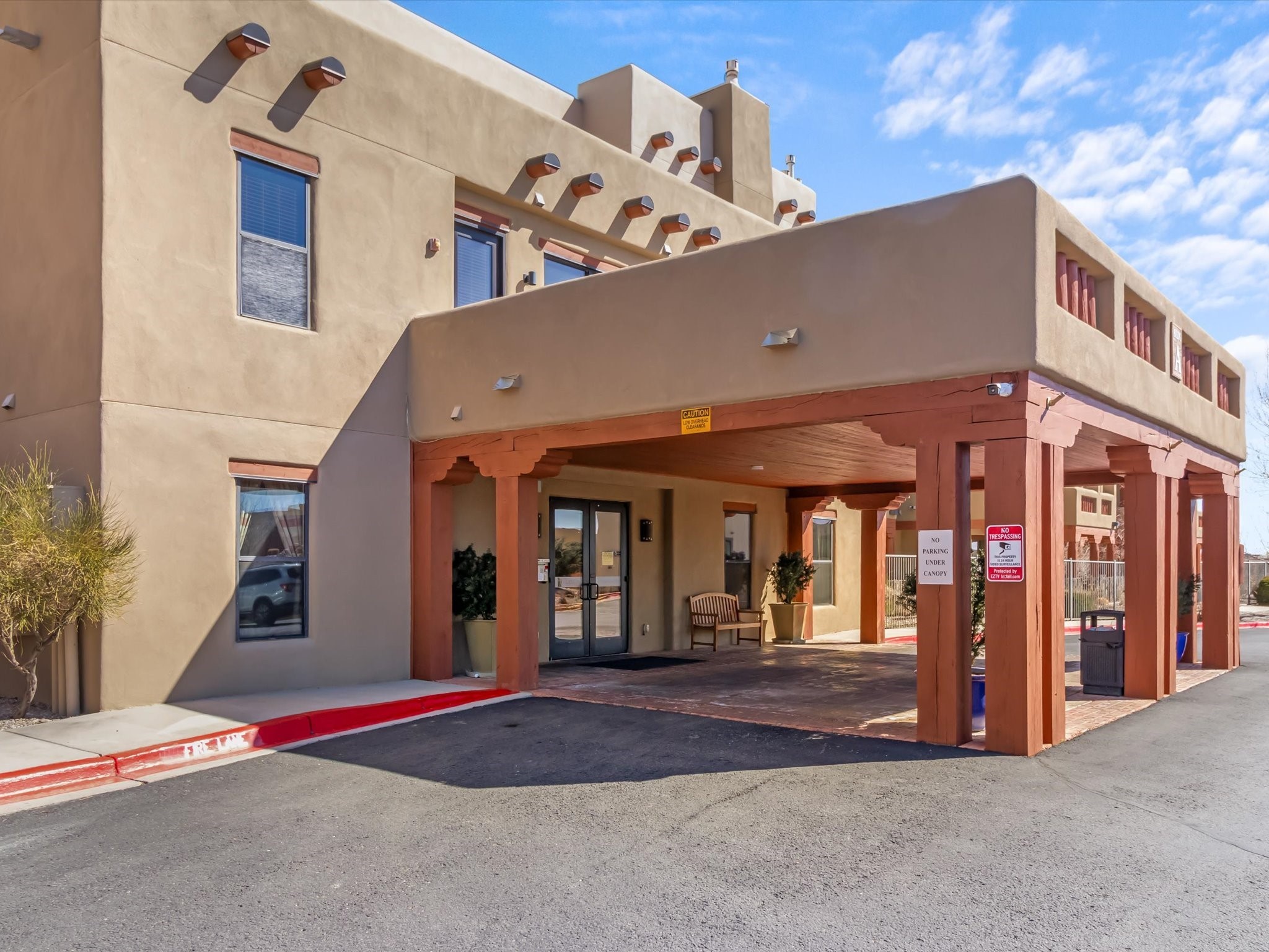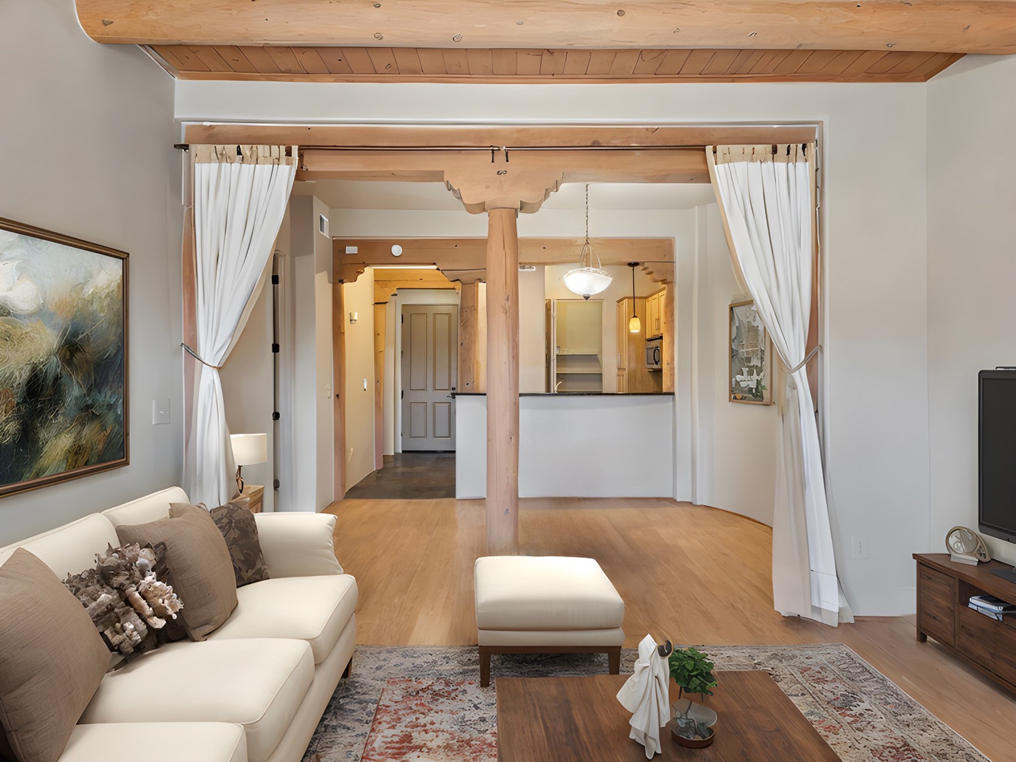 Charming Ground-Floor Condo in The Alameda - Santa Fe Living at Its Best!Welcome to this highly desirable 1-bedroom, 1.5-bathroom ground-floor condo, ideally situated near the secure front entrance of The Alameda Condominiums. This beautifully appointed former model/showroom unit offers style, convenience, and comfort in one perfect package.Step inside to discover a blend of upscale Pueblo-style charm and modern features. Soaring ceilings, decorative wood corbels and vigas, a cozy kiva fireplace, and a custom sliding barn door set a warm, inviting tone. The thoughtfully designed layout includes an open living area, a spacious walk-in closet, a powder room, and an in-unit washer/dryer for ultimate convenience.Enjoy cooking in the modern kitchen, complete with stainless steel appliances, granite countertops, and sleek slate floors. Step outside to your private patio surrounded by classic coyote fencing - a tranquil spot to relax or entertain.This unit also includes a large deeded storage space just steps from your front door, as well as easy access to the mailroom.Residents of The Alameda enjoy lots of amenities including gated parking, 24/7 controlled access, on-site management and maintenance, a fitness center, swimming pool, clubhouse, elevators, and beautifully landscaped grounds. Located close to Santa Fe Place Mall, Sprouts, Albertsons, and with direct access to bike and nature trails - you'll have everything you need at your fingertips. Just a ~10-minute drive to the iconic Santa Fe Plaza!Don't miss your chance to own a slice of Santa Fe charm in one of the city's most sought-after communities!