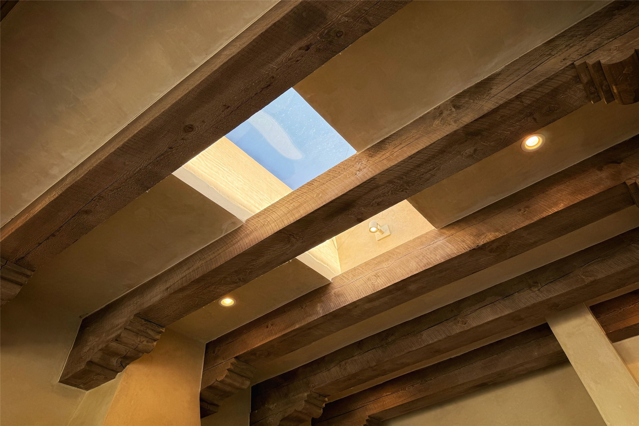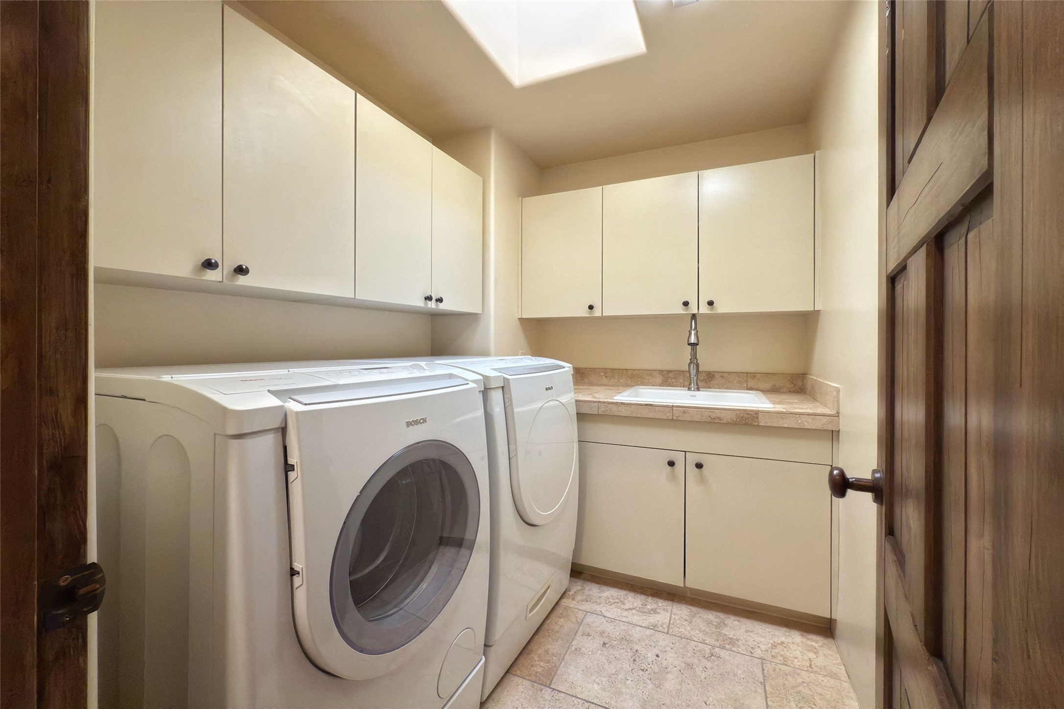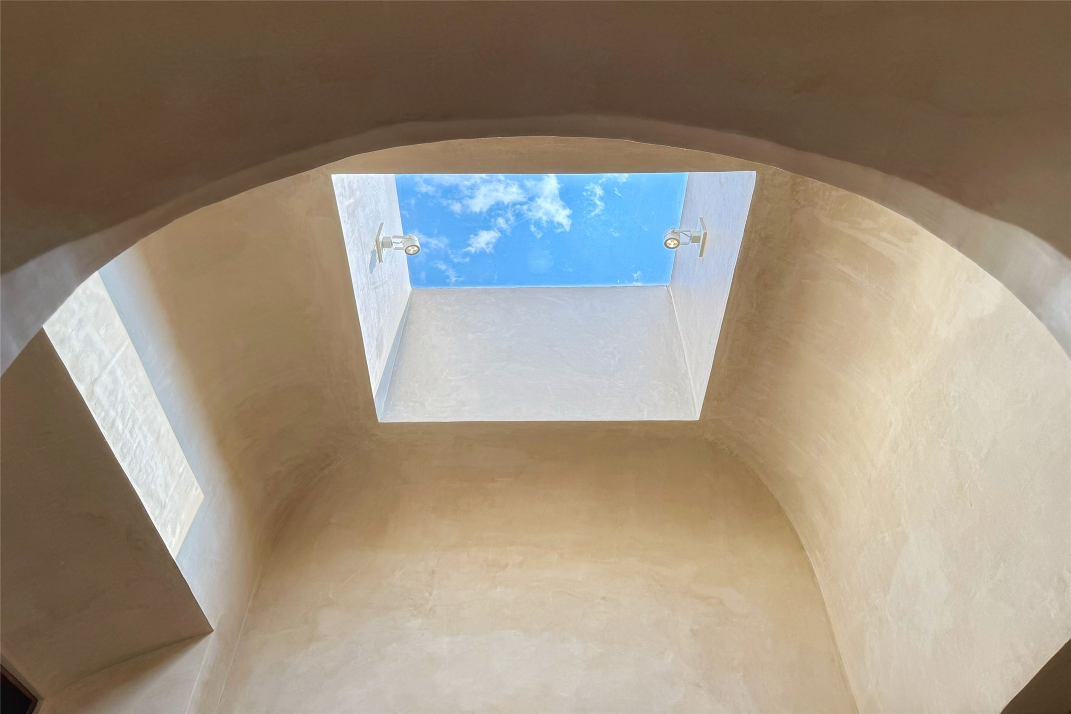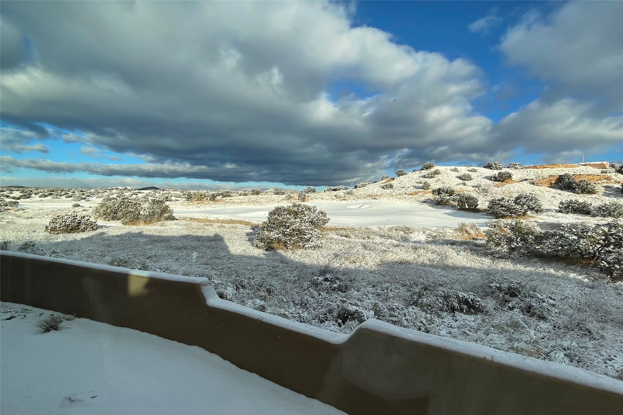 A superb location, this Las Campanas villa home provides majestic panoramic views of the Jack Nicklaus sunset golf course and Jemez / Sangre de Cristo mountain ranges. Surrounded by large open space owned by The Club at Las Campanas, affording excellent privacy. European-inspired architecture and finishes create an opulent, yet relaxed environment. Enjoy golf course views at a comfortable distance. The home sits at the end of a cul-de-sac, providing extra privacy and tranquility and ample guest parking. This home won the Parade of Homes awards for Best Floor Plan and Best Outdoor Space and features a grand arched entryway with floor lights and large Restoration Hardware mirrors to reflect the outdoors. The builder spared no expense on architectural detail and finishes: soaring 14 ft cathedral ceilings, wall wash skylights, travertine floors, handsome carved grand fireplace with custom glass doors, diamond plaster walls, granite countertops, Sub-Zero refrigerator, Wolf oven/stove, and six indoor/ two outdoor gas and wood-burning fireplaces. A sheltered interior courtyard brings the outdoors in. Choose the formal dining room that opens to the lovely courtyard or the casual eat-in nook with views. The primary bedroom suite has direct entrance to the outdoor portal overlooking the golf course and is separated from the guest bedrooms at the opposite wing of the home. Luxurious primary spa bath accesses a private enclosed side portal. Garage has large built-in cabinets for plenty of additional storage. Upgraded to entire smart home capability with high end indoor/outdoor Sonos sound system. Restoration Hardware mirrors and select indoor and all outdoor furniture pieces, as well as custom handcrafted TV cabinet and Murphy bed are included. New stucco, new roof, and tankless water heater with additional high capacity tank. Las Campanas golf membership available for purchase, subject to approval. With outstanding location, views and design, this home is truly captivating.