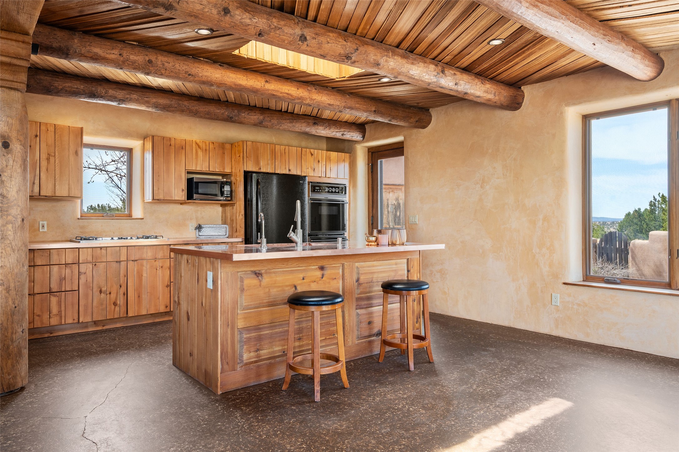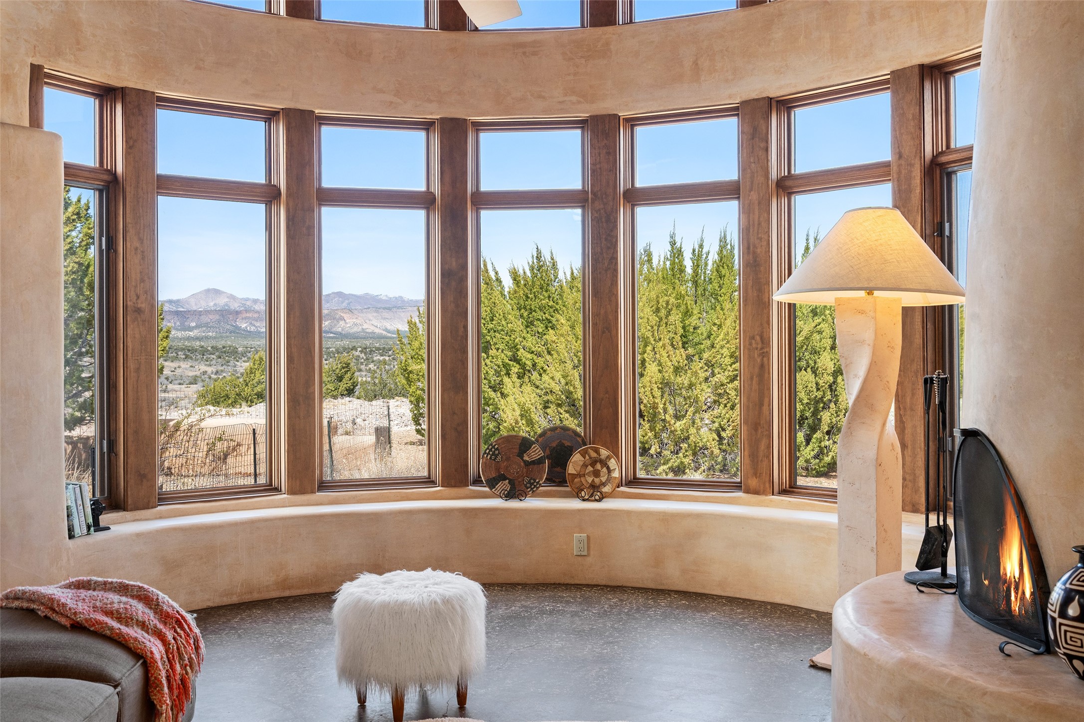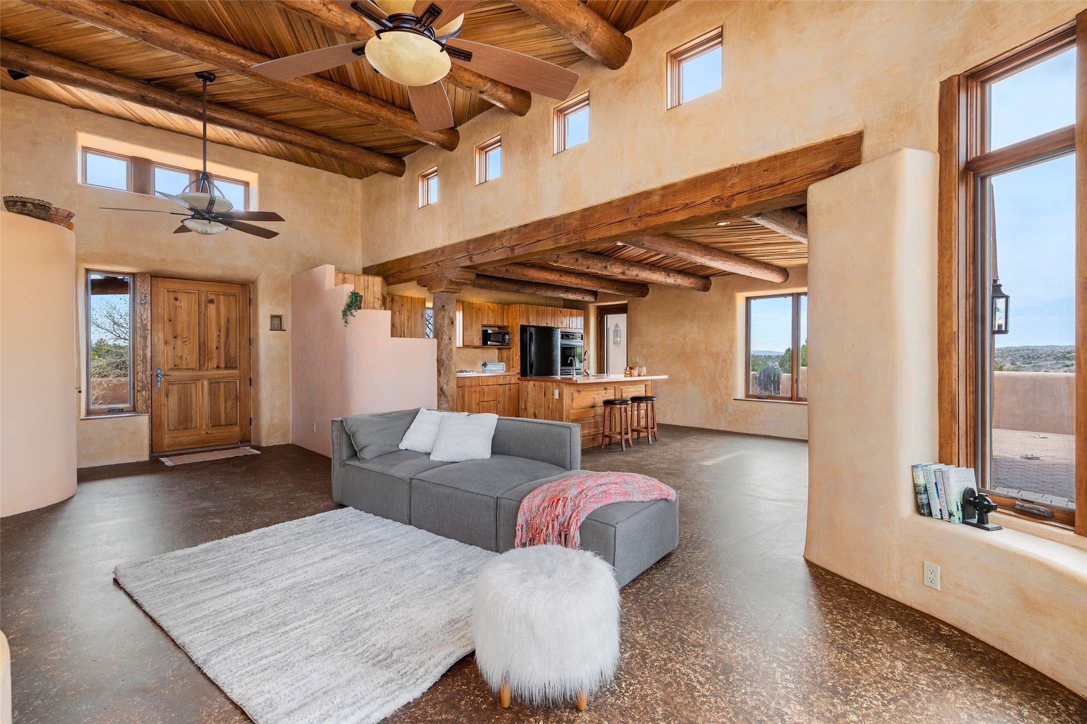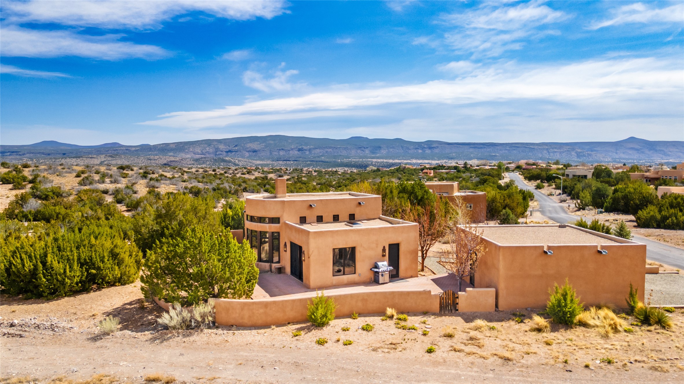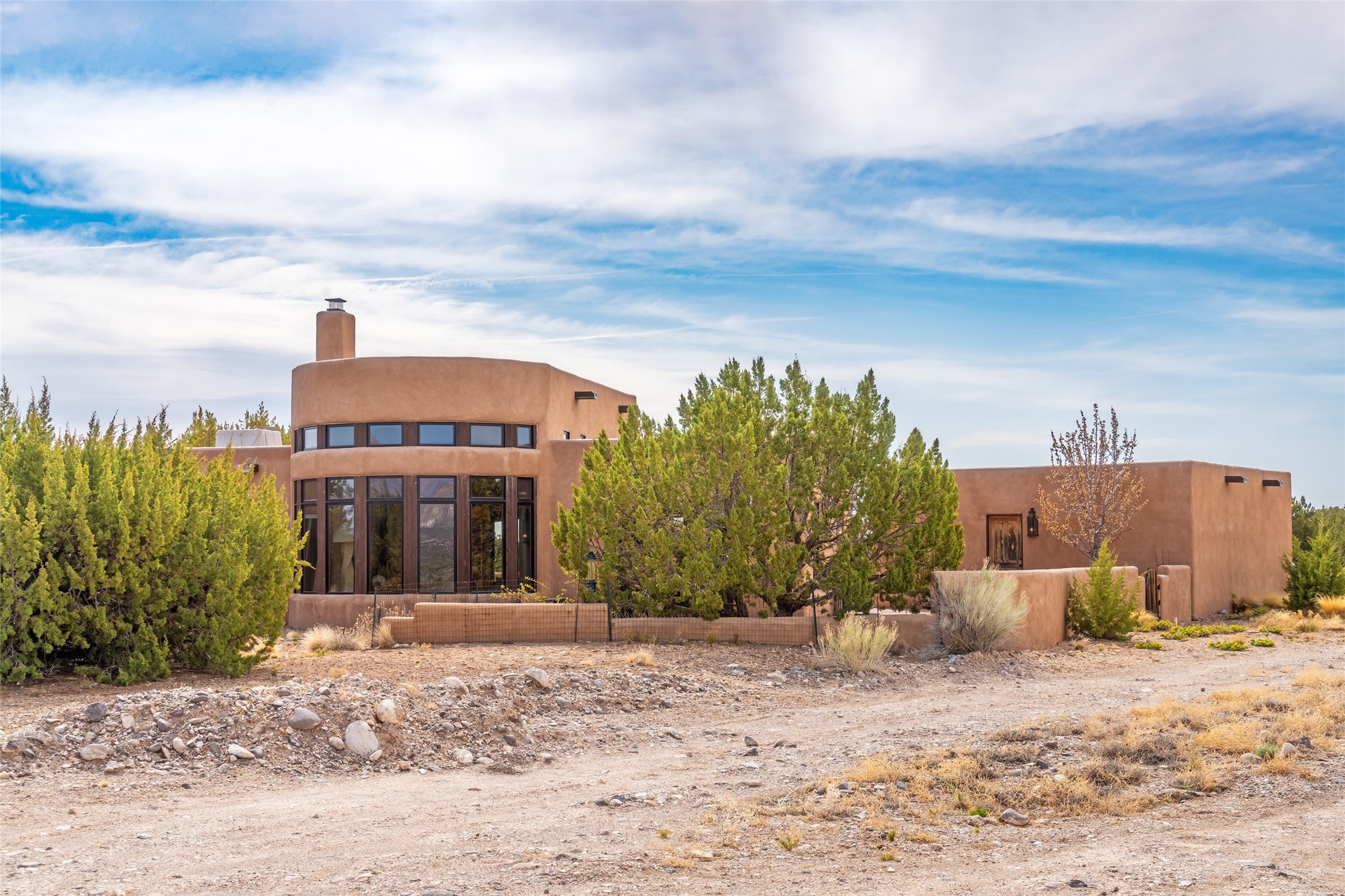 Experience timeless Santa Fe style in this stunning custom-built straw bale home wheresustainability meets classic Southwestern charm. Perched to capture sweepingpanoramic views from inside and the brick patio along the side by the kitchen.Step inside to find traditional Santa Fe details throughout--exposed wood beams,vigas, and latillas that create a warm, rustic ambiance. The spacious living room is theheart of the home, featuring floor-to-ceiling windows that flood the space with naturallight and perfectly frame the surrounding landscape. A kiva fireplace adds a touch ofcomfort and tradition. The kitchen boasts custom cabinets, double oven, pantry andsmall desk area, the counters are beautiful copper. Floors throughout are-stainedconcrete with in-floor heating. There is a swamp cooler for summer. Bathrooms alsohave custom cabinetry and sinks, both with walk-in showers.Whether you are enjoying the stunning sunsets from the patio or simply soaking in theserene beauty of the high desert on the local hiking trails, this home is a rare blend ofcraftsmanship, sustainability, and Southwestern style.