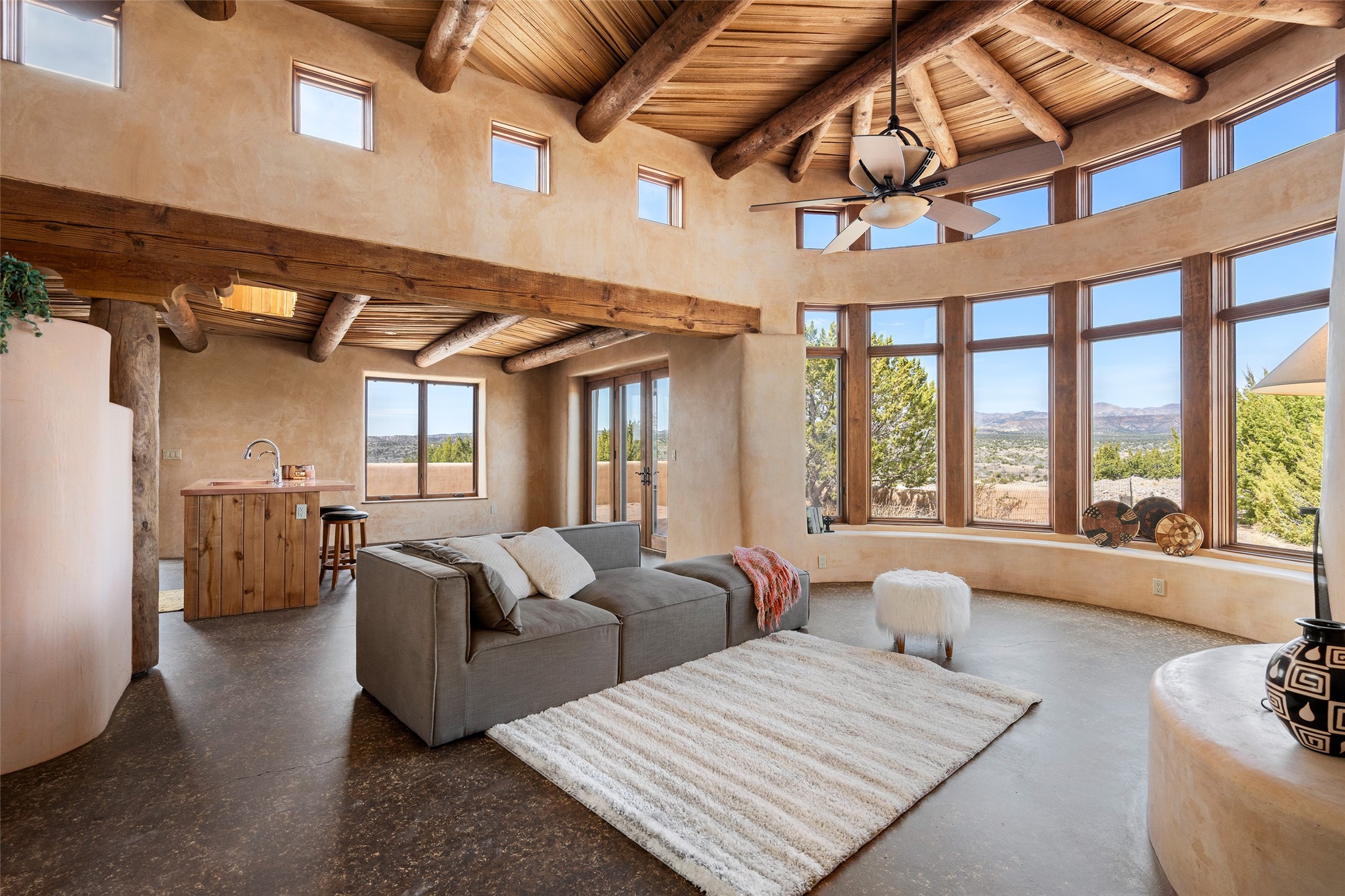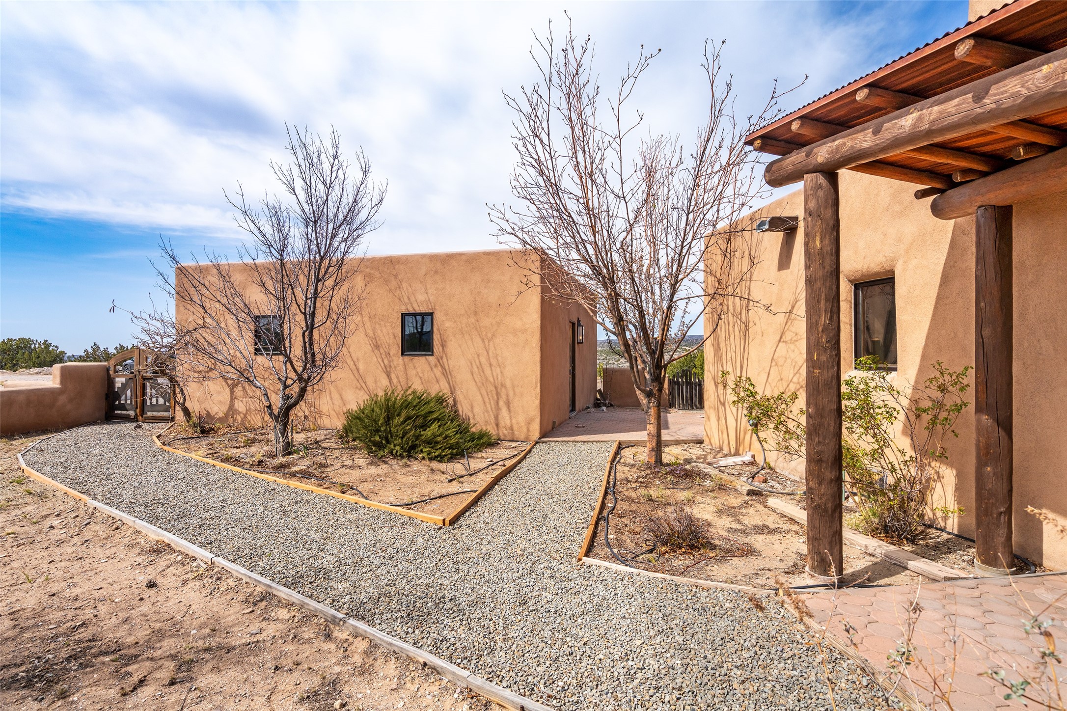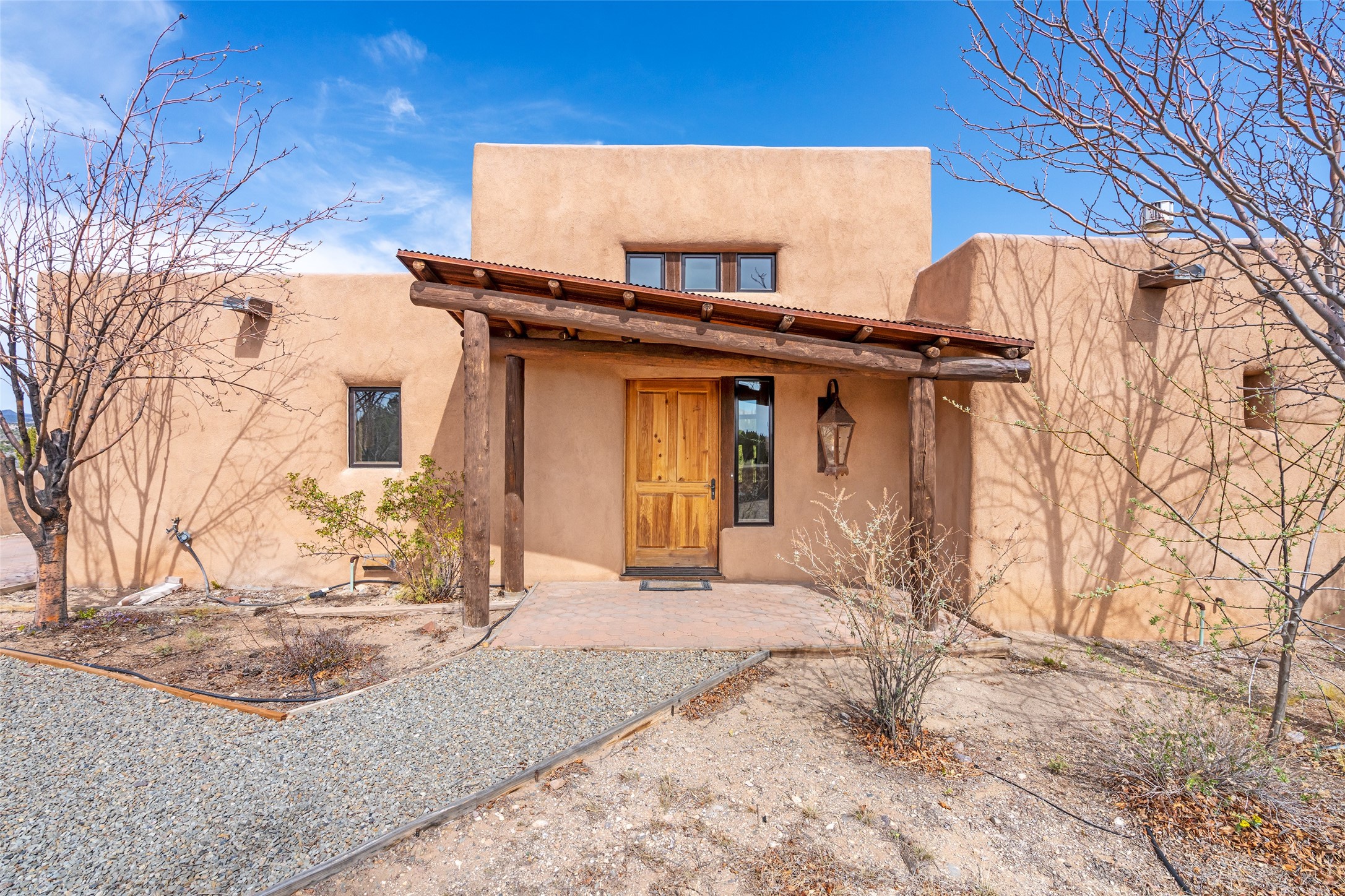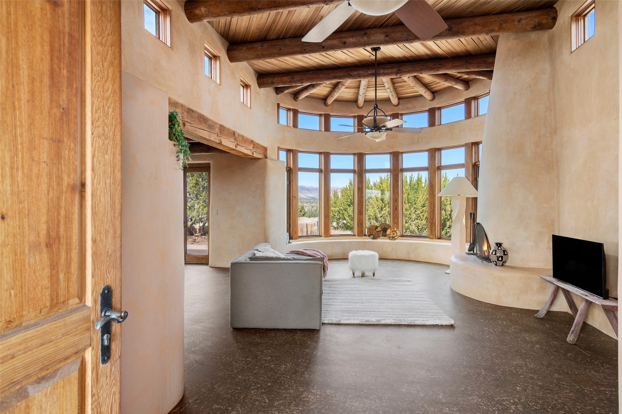 Experience timeless Santa Fe style in this stunning custom-built straw bale home wheresustainability meets classic Southwestern charm. Perched to capture sweepingpanoramic views from inside and the brick patio along the side by the kitchen.Step inside to find traditional Santa Fe details throughout--exposed wood beams,vigas, and latillas that create a warm, rustic ambiance. The spacious living room is theheart of the home, featuring floor-to-ceiling windows that flood the space with naturallight and perfectly frame the surrounding landscape. A kiva fireplace adds a touch ofcomfort and tradition. The kitchen boasts custom cabinets, double oven, pantry andsmall desk area, the counters are beautiful copper. Floors throughout are-stainedconcrete with in-floor heating. There is a swamp cooler for summer. Bathrooms alsohave custom cabinetry and sinks, both with walk-in showers.Whether you are enjoying the stunning sunsets from the patio or simply soaking in theserene beauty of the high desert on the local hiking trails, this home is a rare blend ofcraftsmanship, sustainability, and Southwestern style.