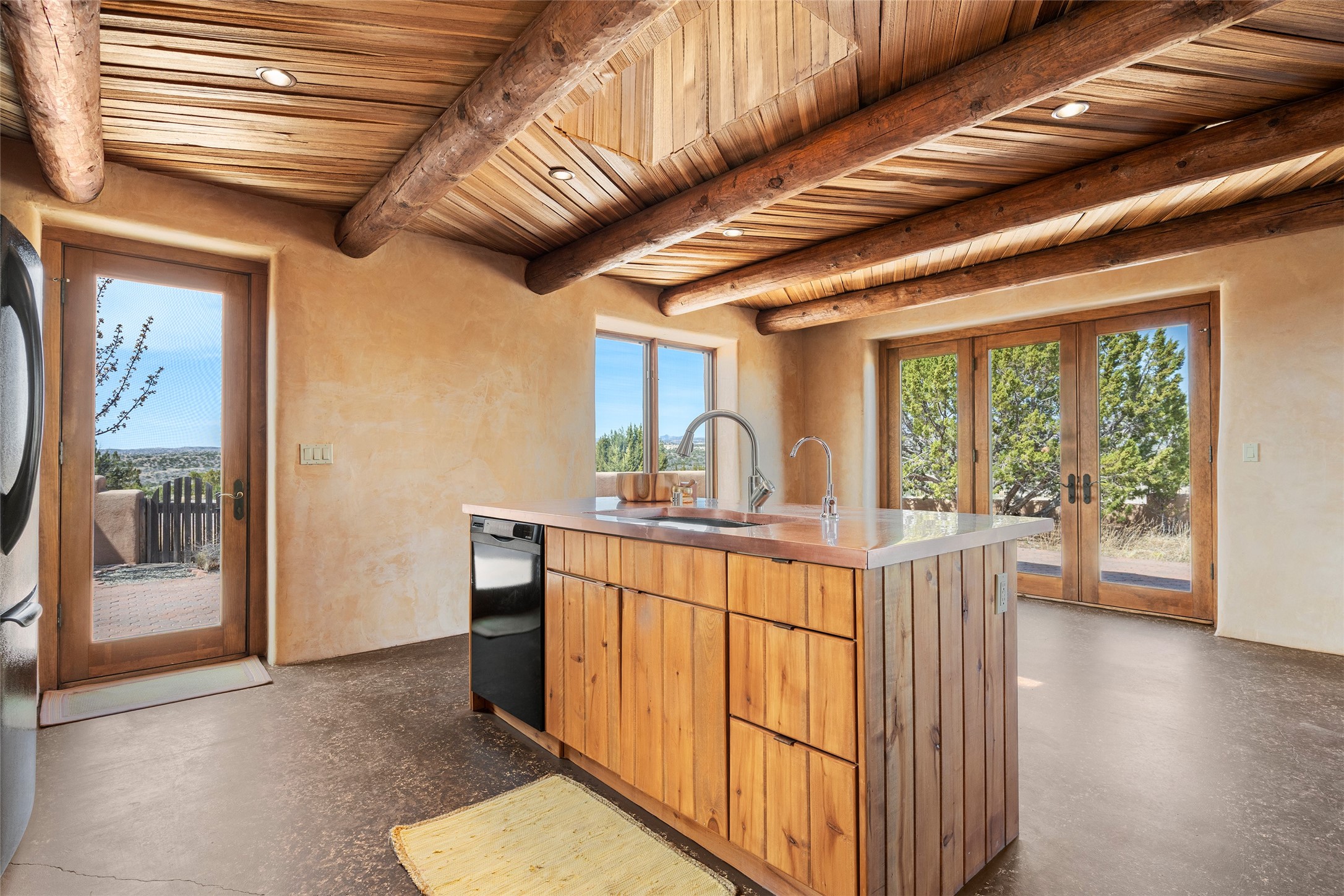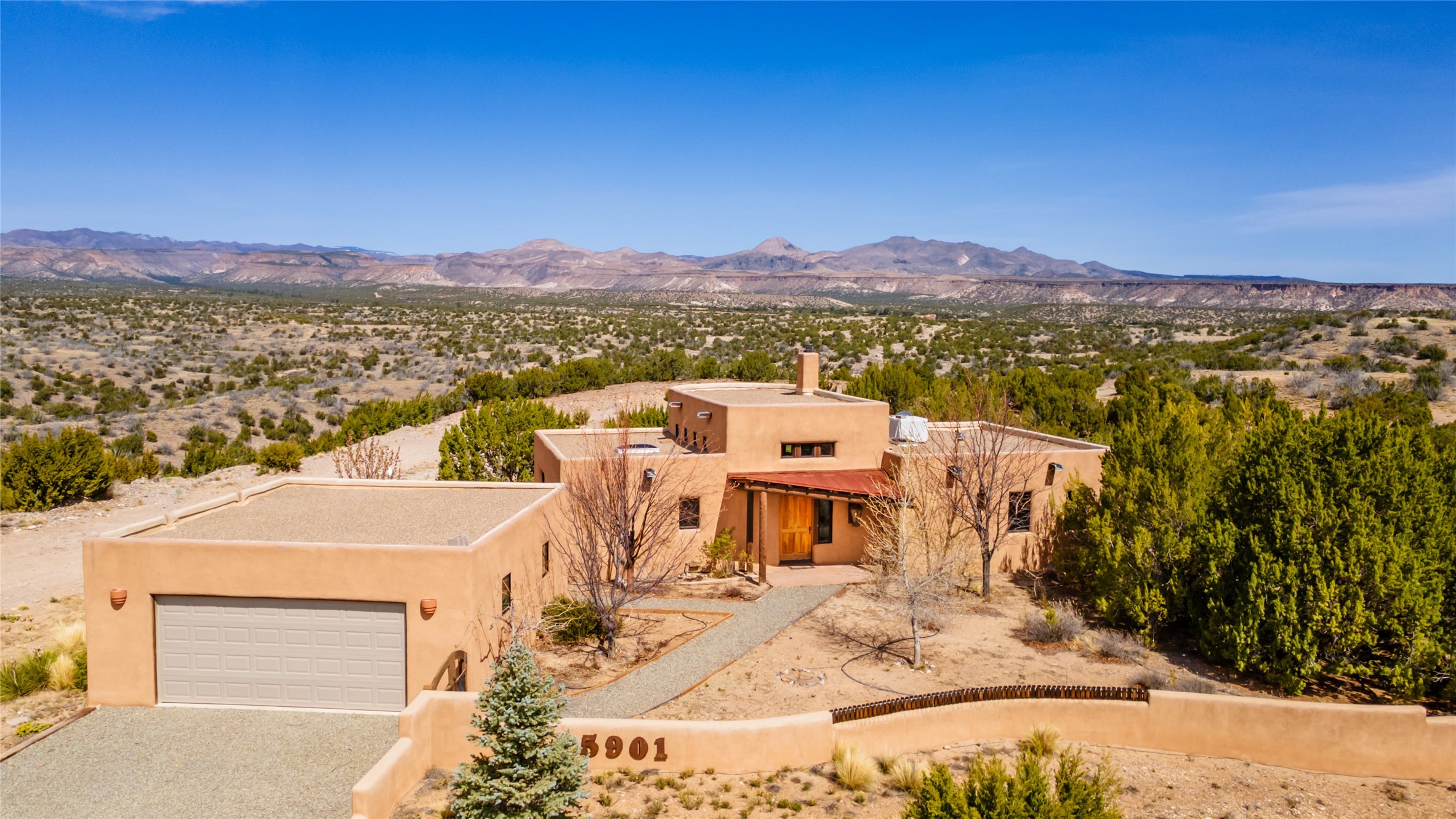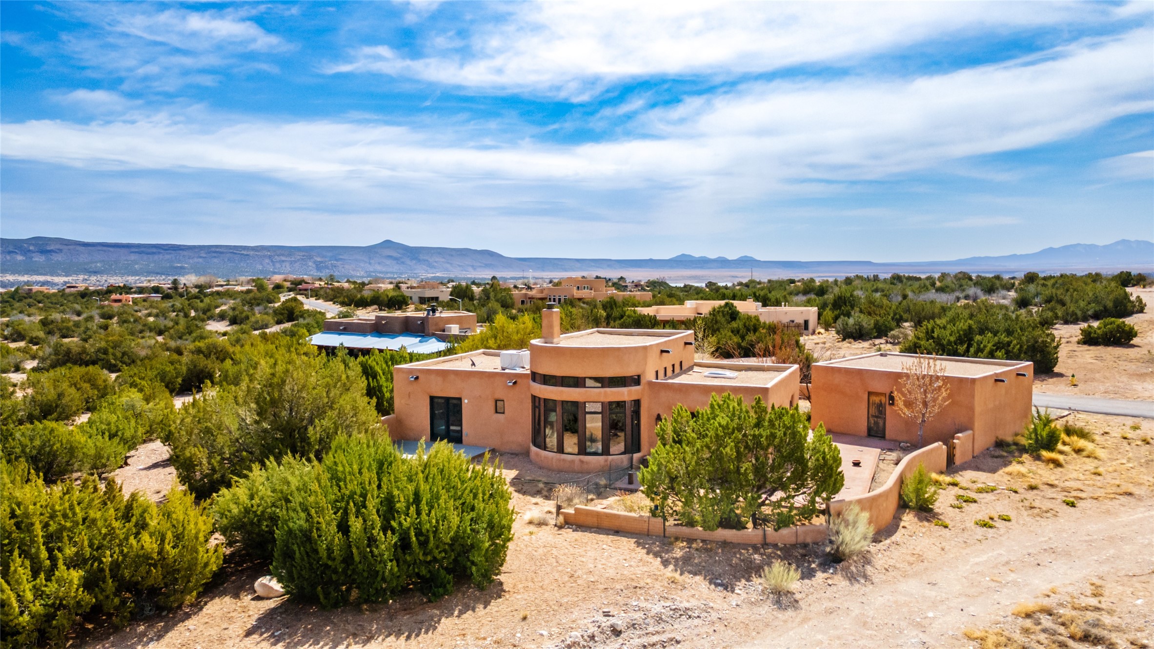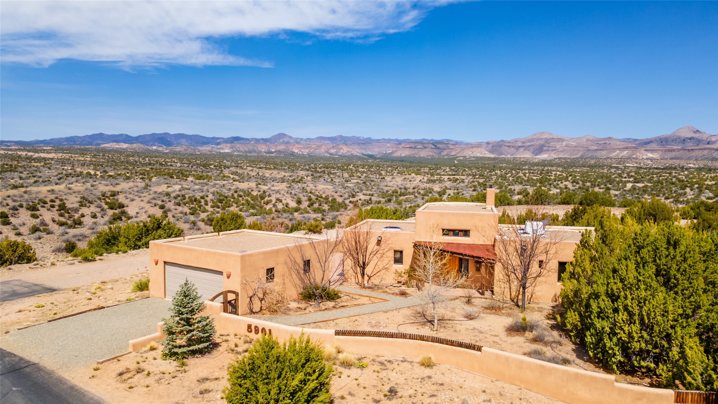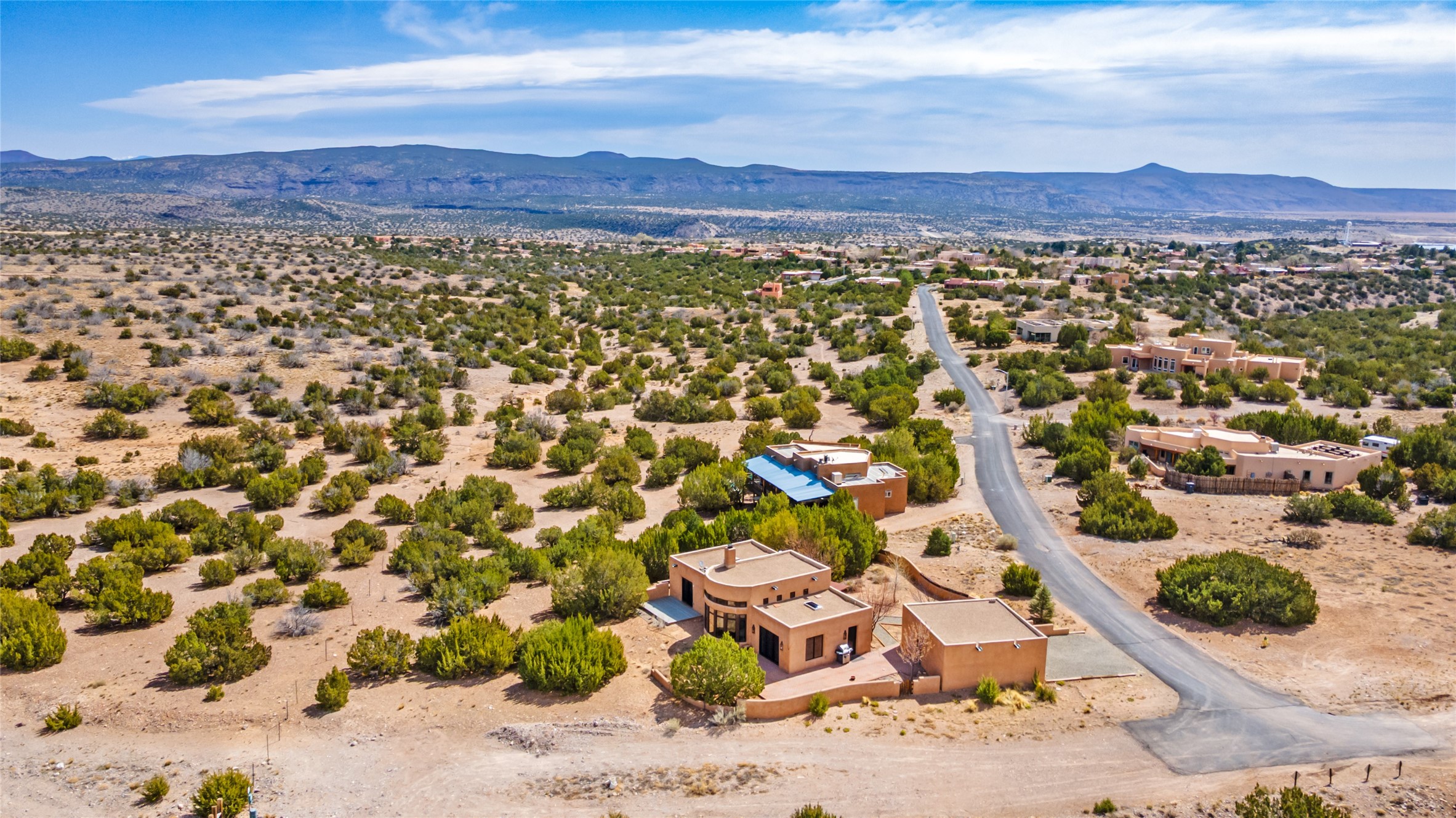 Experience timeless Santa Fe style in this stunning custom-built straw bale home wheresustainability meets classic Southwestern charm. Perched to capture sweepingpanoramic views from inside and the brick patio along the side by the kitchen.Step inside to find traditional Santa Fe details throughout--exposed wood beams,vigas, and latillas that create a warm, rustic ambiance. The spacious living room is theheart of the home, featuring floor-to-ceiling windows that flood the space with naturallight and perfectly frame the surrounding landscape. A kiva fireplace adds a touch ofcomfort and tradition. The kitchen boasts custom cabinets, double oven, pantry andsmall desk area, the counters are beautiful copper. Floors throughout are-stainedconcrete with in-floor heating. There is a swamp cooler for summer. Bathrooms alsohave custom cabinetry and sinks, both with walk-in showers.Whether you are enjoying the stunning sunsets from the patio or simply soaking in theserene beauty of the high desert on the local hiking trails, this home is a rare blend ofcraftsmanship, sustainability, and Southwestern style.