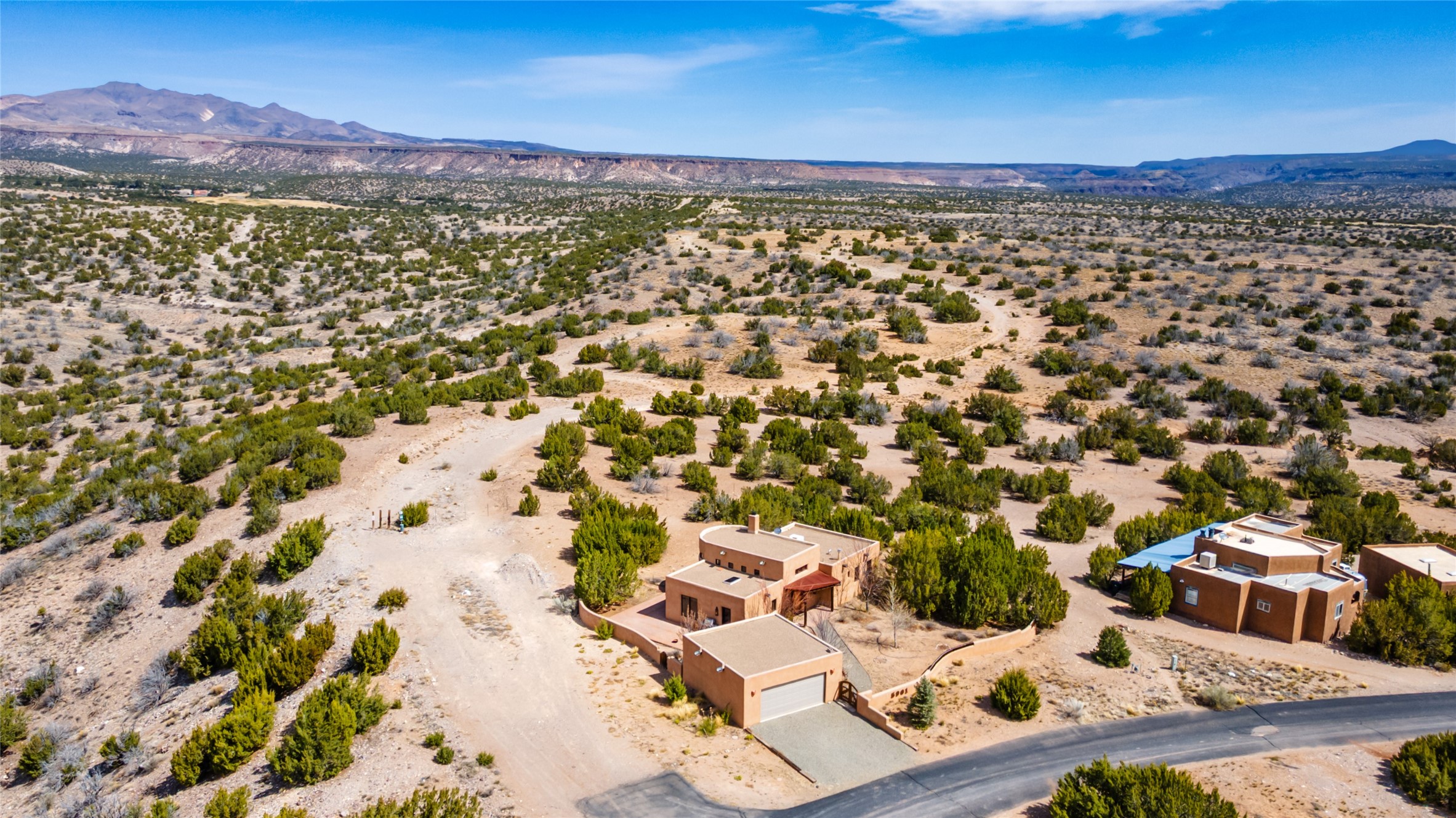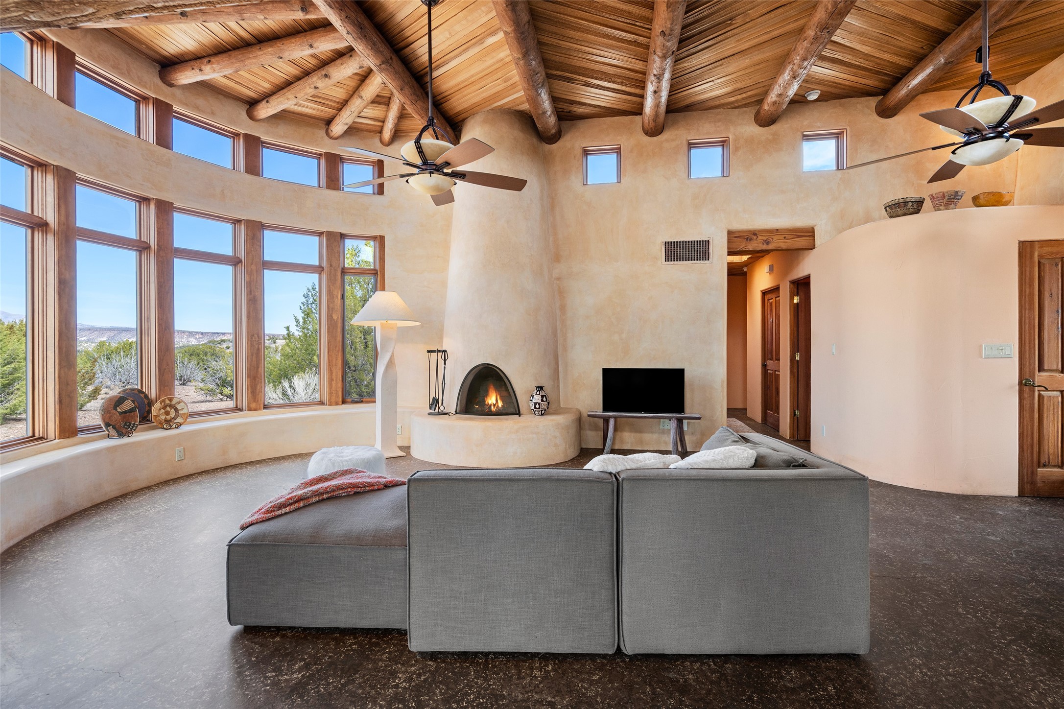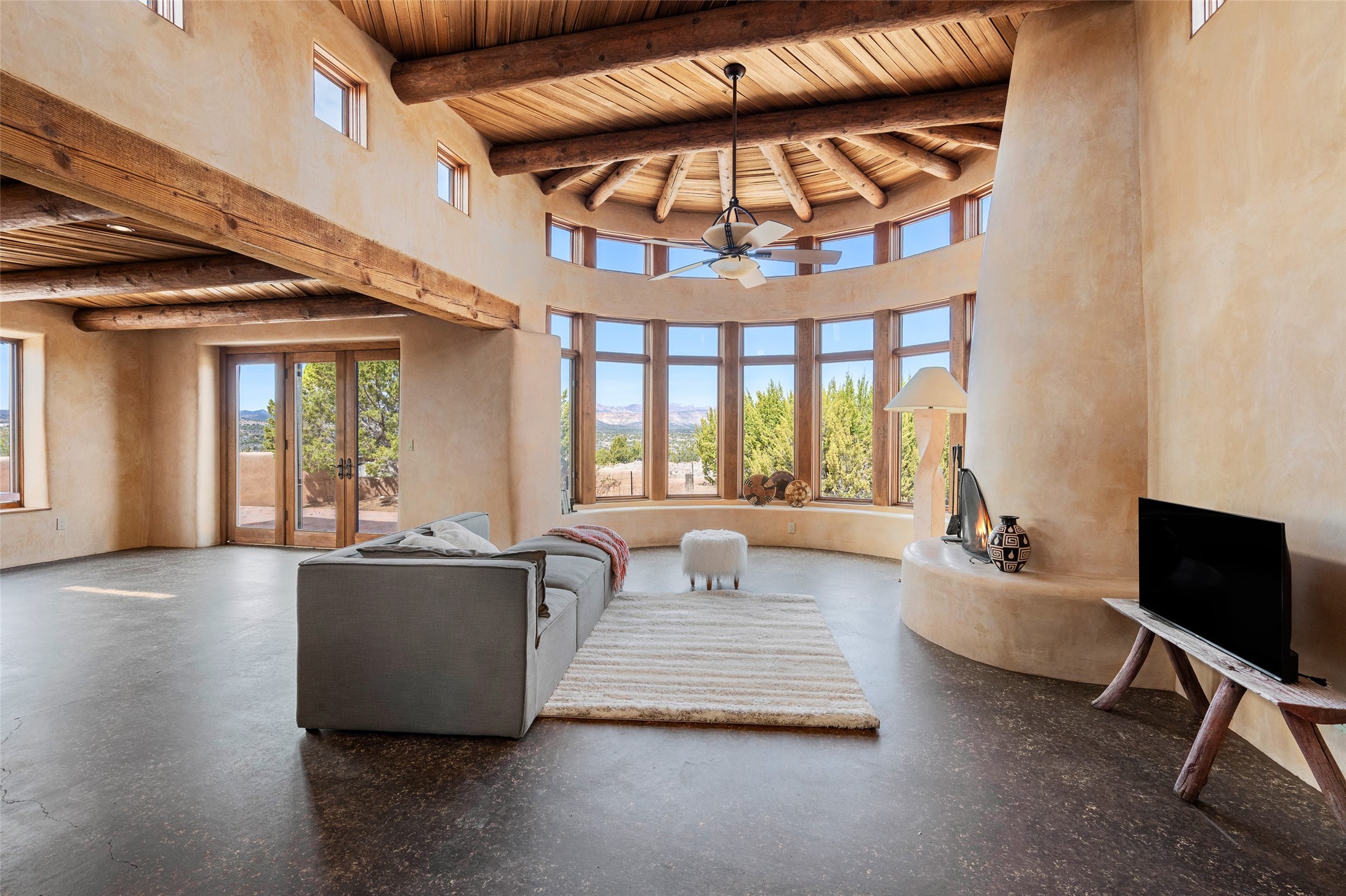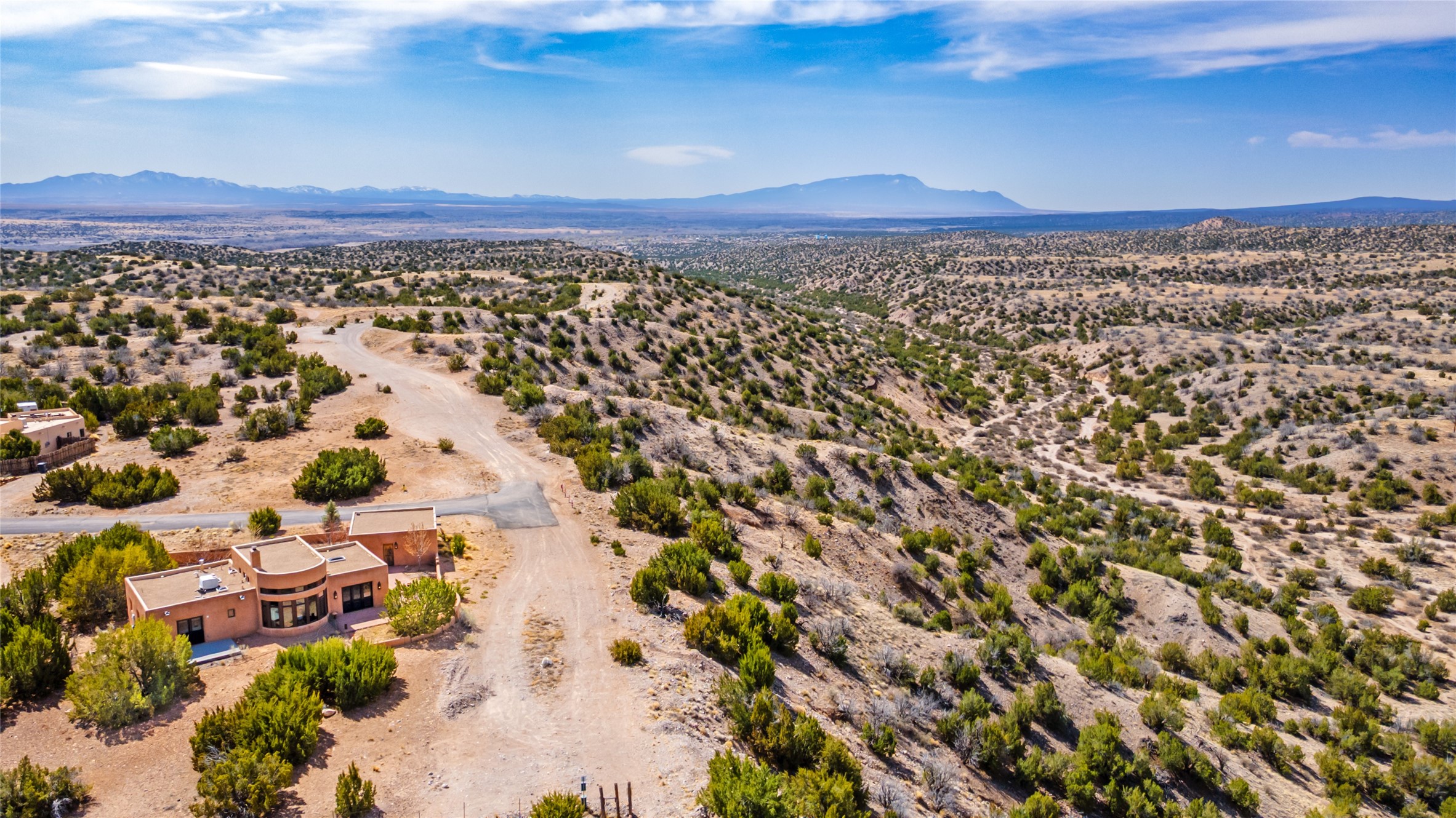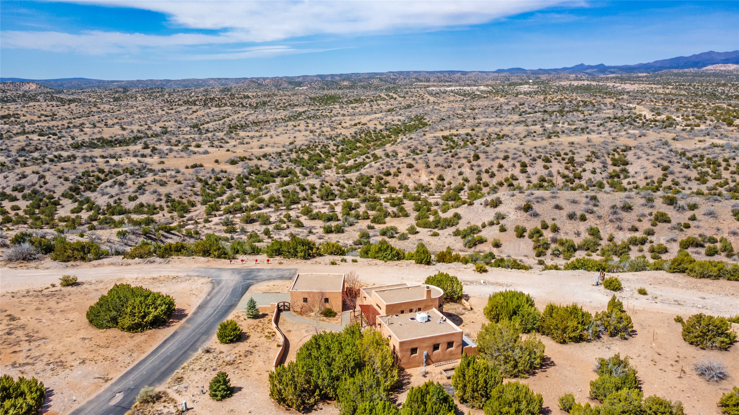 Experience timeless Santa Fe style in this stunning custom-built straw bale home wheresustainability meets classic Southwestern charm. Perched to capture sweepingpanoramic views from inside and the brick patio along the side by the kitchen.Step inside to find traditional Santa Fe details throughout--exposed wood beams,vigas, and latillas that create a warm, rustic ambiance. The spacious living room is theheart of the home, featuring floor-to-ceiling windows that flood the space with naturallight and perfectly frame the surrounding landscape. A kiva fireplace adds a touch ofcomfort and tradition. The kitchen boasts custom cabinets, double oven, pantry andsmall desk area, the counters are beautiful copper. Floors throughout are-stainedconcrete with in-floor heating. There is a swamp cooler for summer. Bathrooms alsohave custom cabinetry and sinks, both with walk-in showers.Whether you are enjoying the stunning sunsets from the patio or simply soaking in theserene beauty of the high desert on the local hiking trails, this home is a rare blend ofcraftsmanship, sustainability, and Southwestern style.