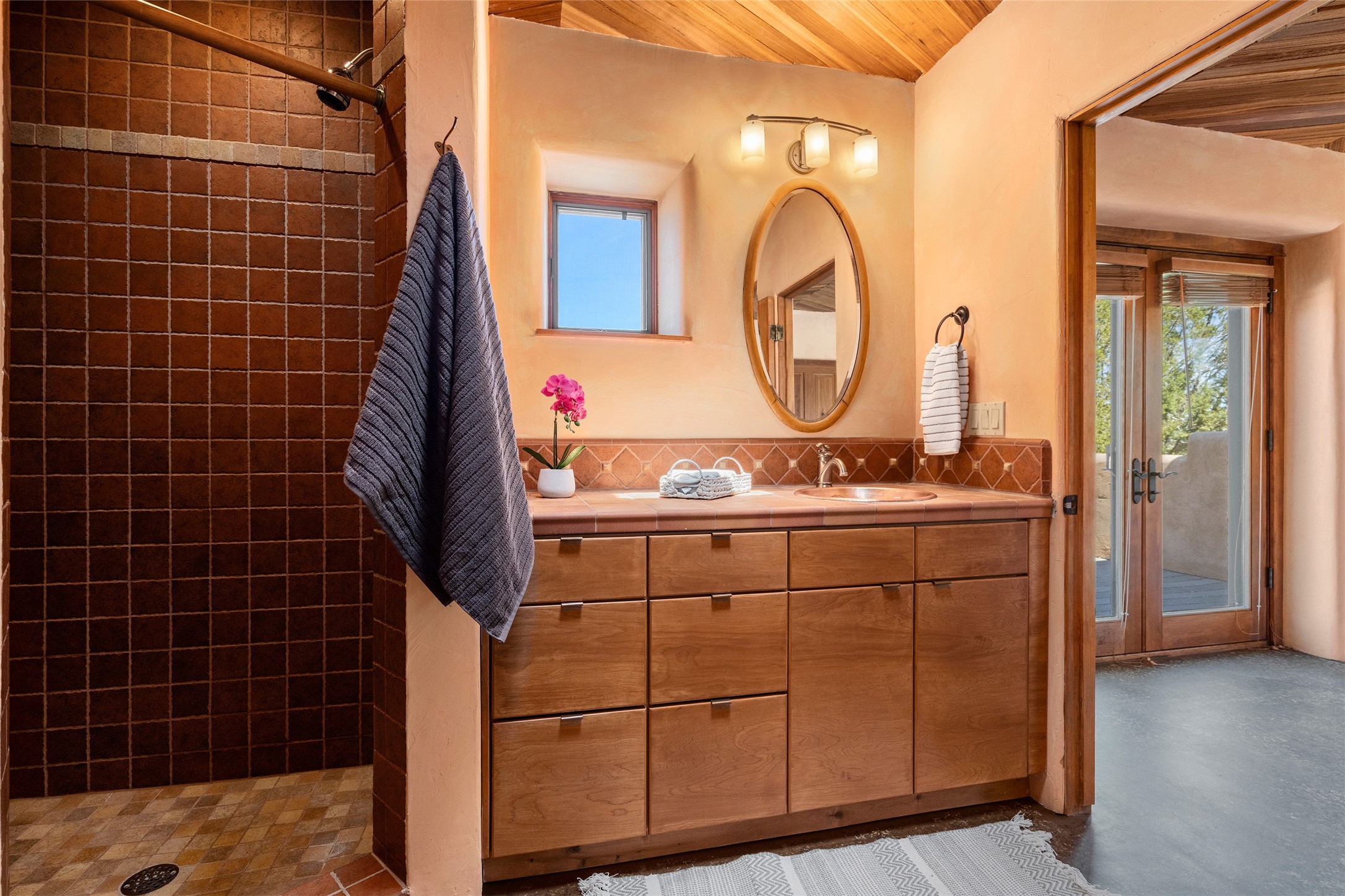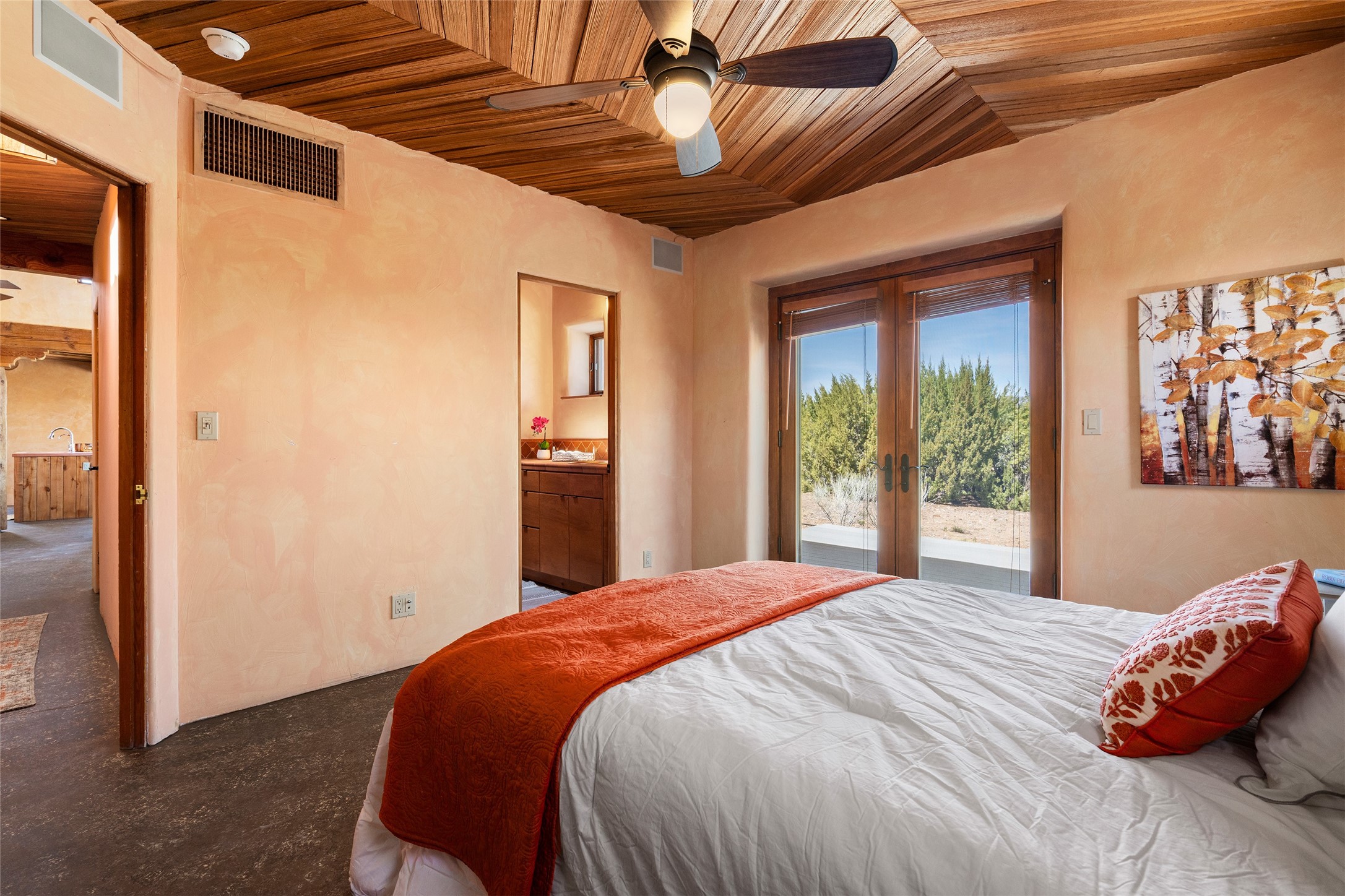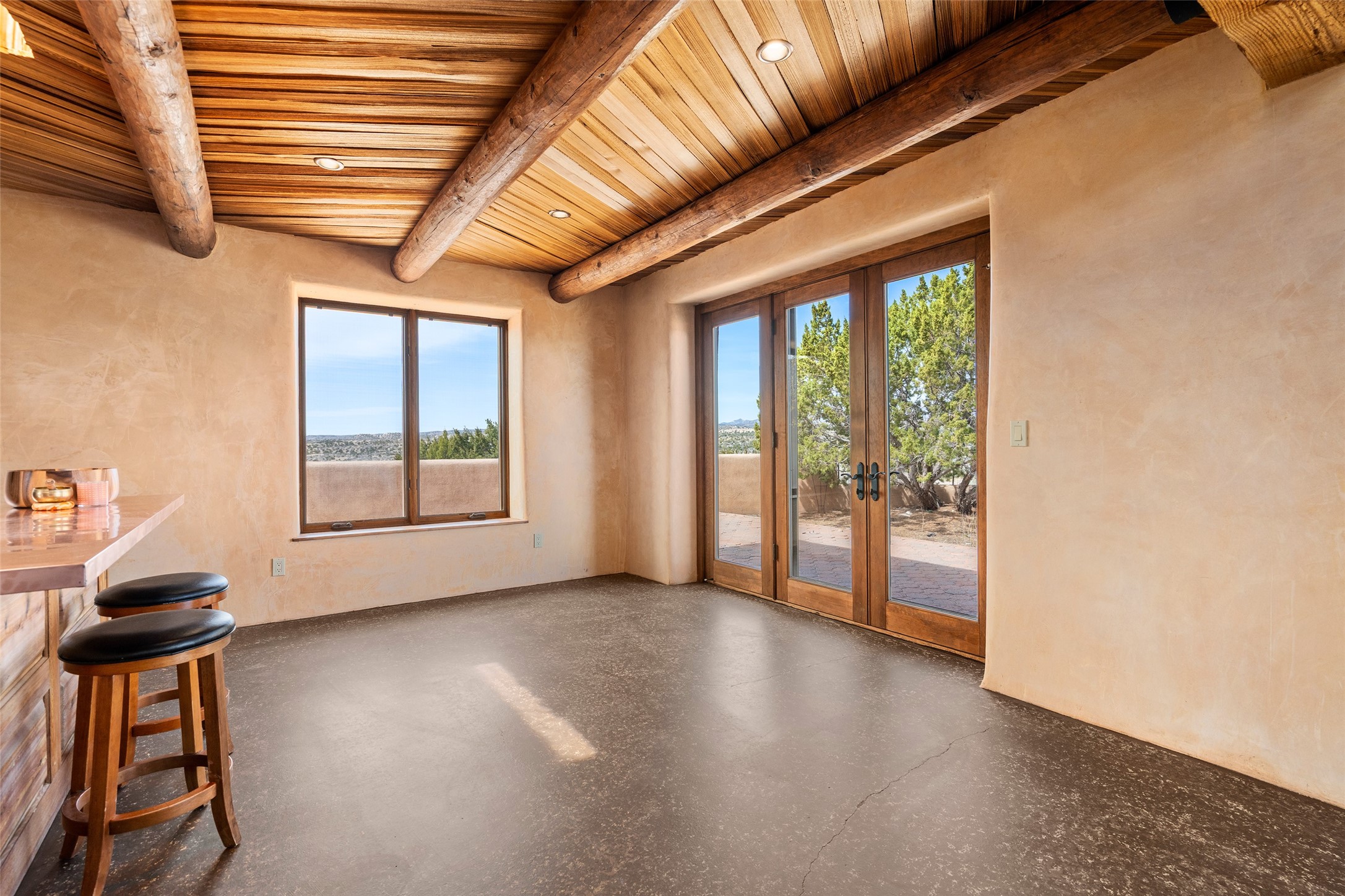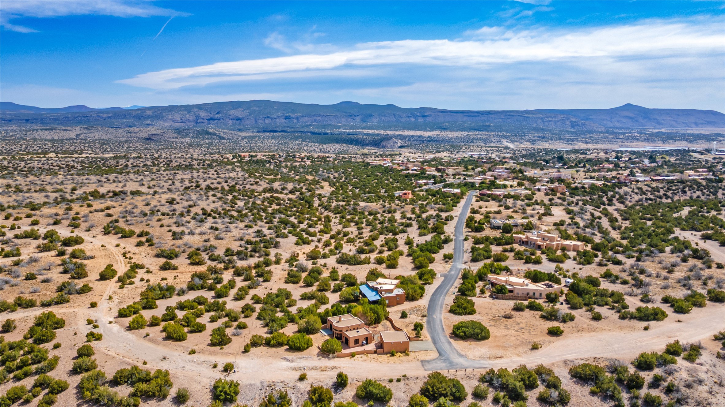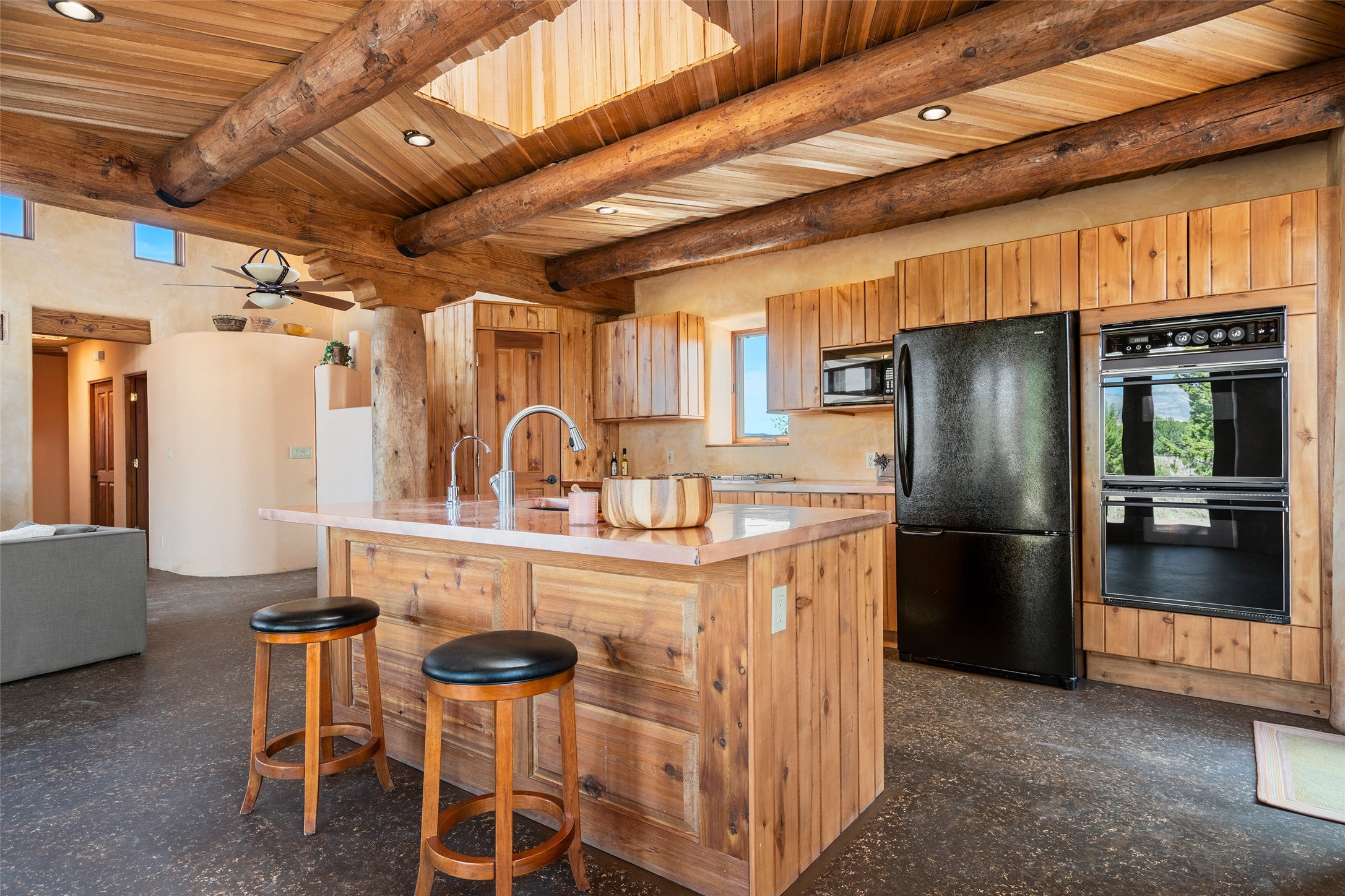 Experience timeless Santa Fe style in this stunning custom-built straw bale home wheresustainability meets classic Southwestern charm. Perched to capture sweepingpanoramic views from inside and the brick patio along the side by the kitchen.Step inside to find traditional Santa Fe details throughout--exposed wood beams,vigas, and latillas that create a warm, rustic ambiance. The spacious living room is theheart of the home, featuring floor-to-ceiling windows that flood the space with naturallight and perfectly frame the surrounding landscape. A kiva fireplace adds a touch ofcomfort and tradition. The kitchen boasts custom cabinets, double oven, pantry andsmall desk area, the counters are beautiful copper. Floors throughout are-stainedconcrete with in-floor heating. There is a swamp cooler for summer. Bathrooms alsohave custom cabinetry and sinks, both with walk-in showers.Whether you are enjoying the stunning sunsets from the patio or simply soaking in theserene beauty of the high desert on the local hiking trails, this home is a rare blend ofcraftsmanship, sustainability, and Southwestern style.