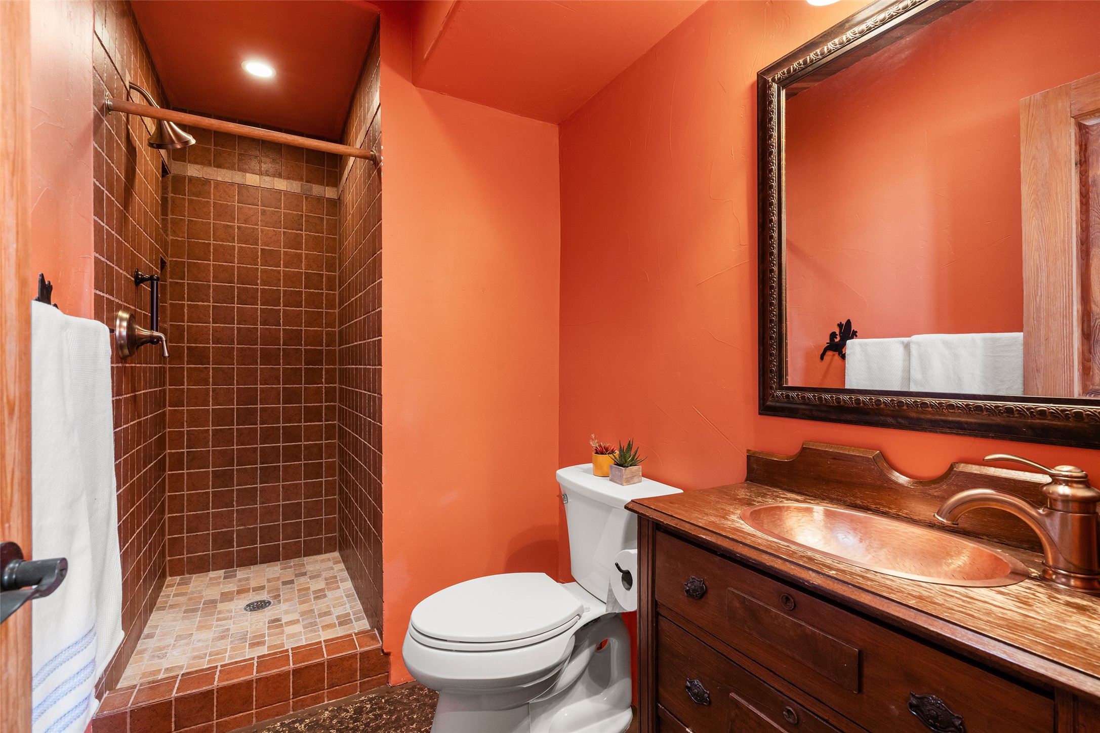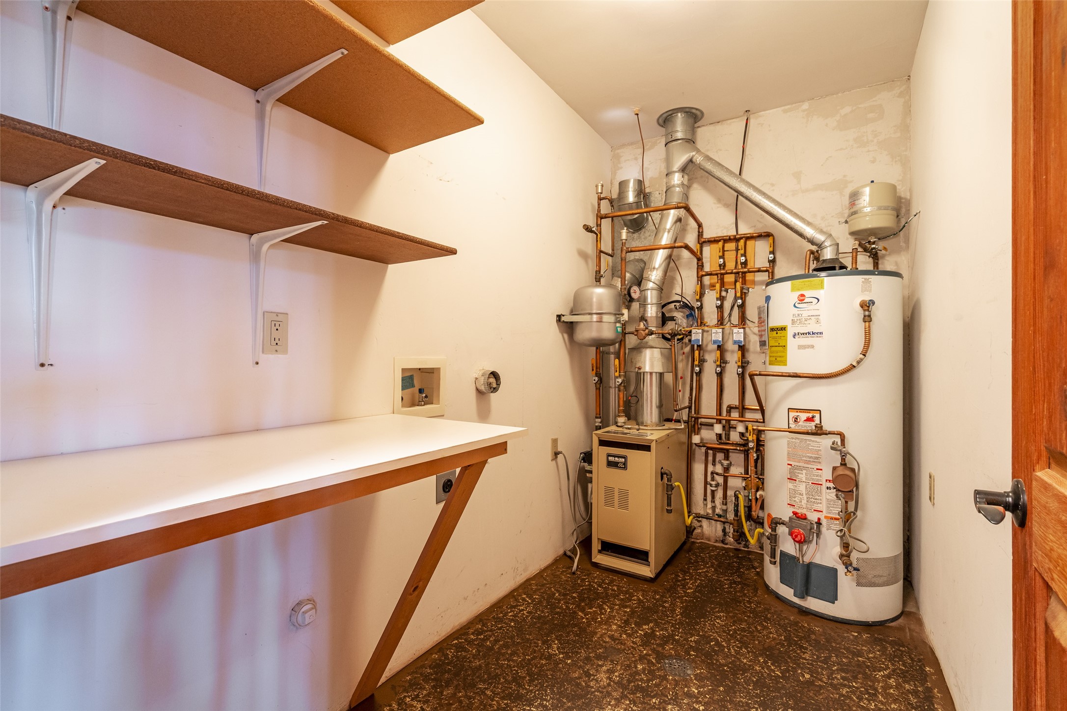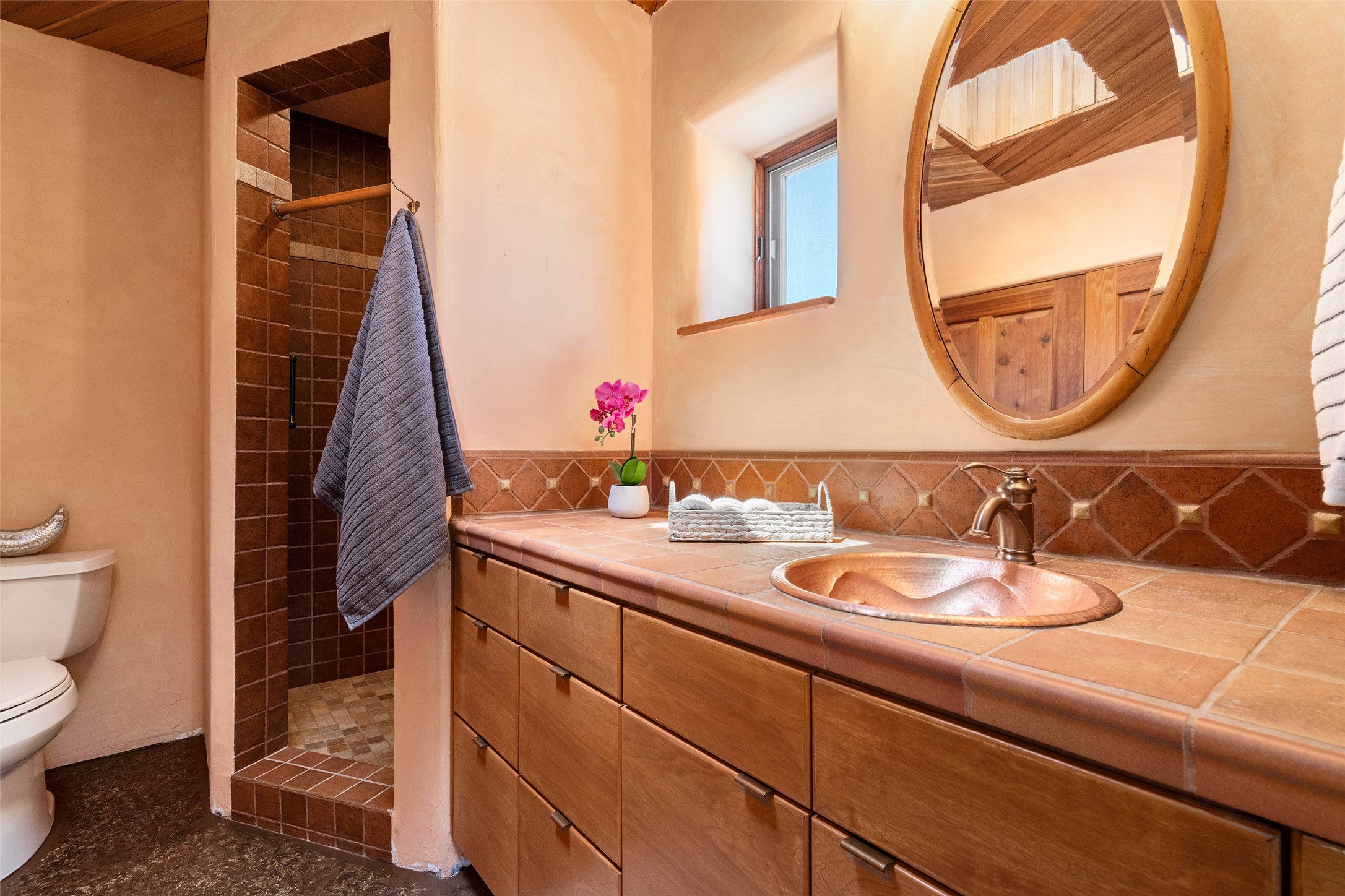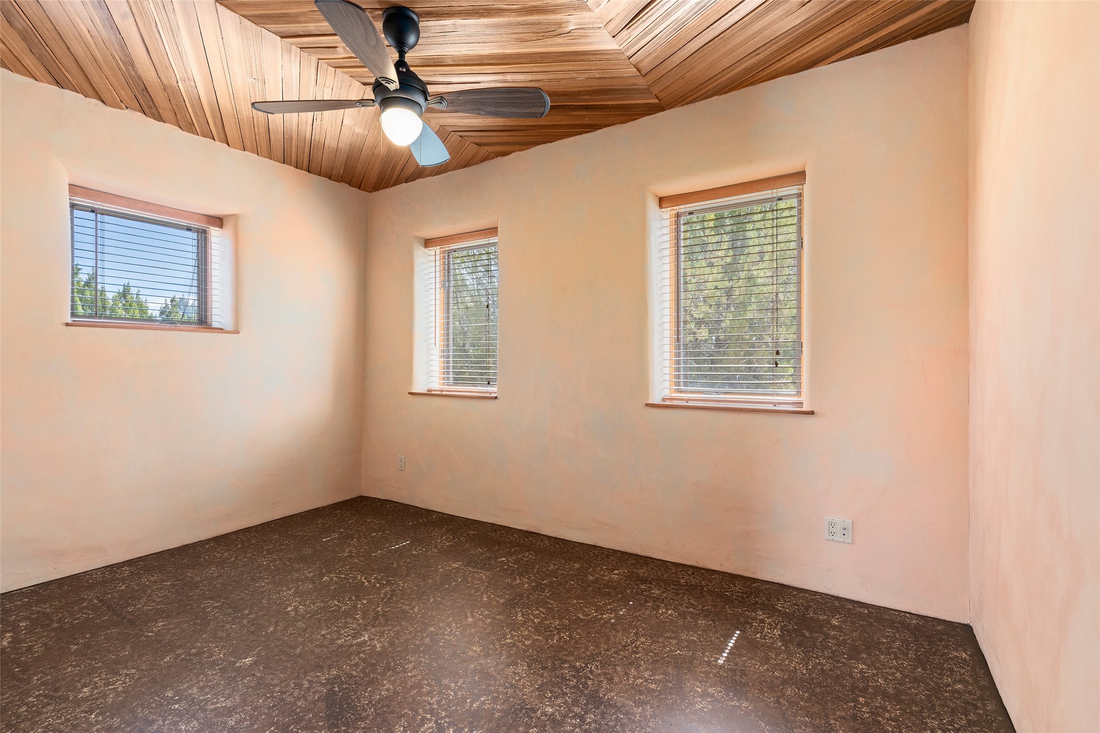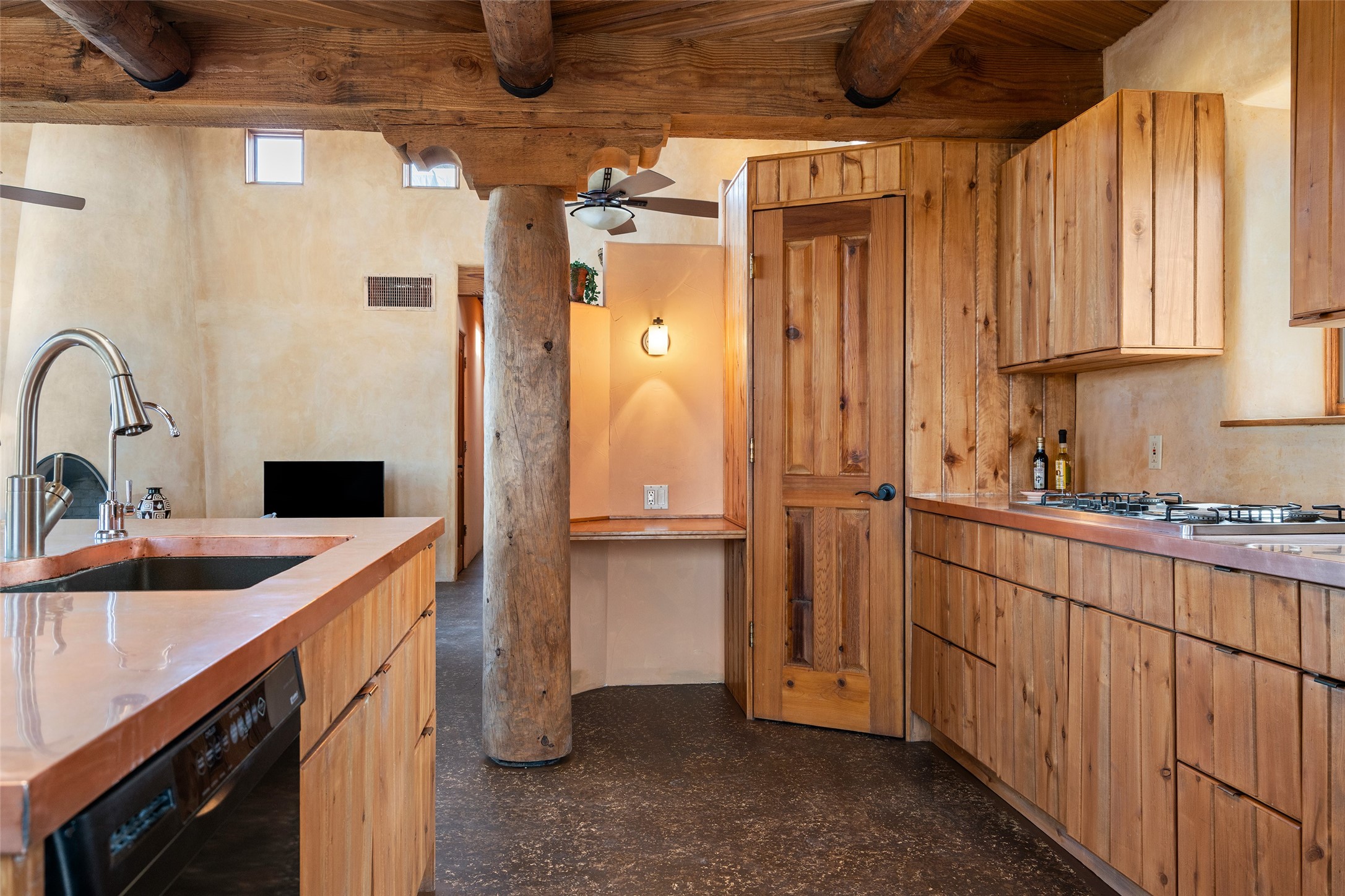 Experience timeless Santa Fe style in this stunning custom-built straw bale home wheresustainability meets classic Southwestern charm. Perched to capture sweepingpanoramic views from inside and the brick patio along the side by the kitchen.Step inside to find traditional Santa Fe details throughout--exposed wood beams,vigas, and latillas that create a warm, rustic ambiance. The spacious living room is theheart of the home, featuring floor-to-ceiling windows that flood the space with naturallight and perfectly frame the surrounding landscape. A kiva fireplace adds a touch ofcomfort and tradition. The kitchen boasts custom cabinets, double oven, pantry andsmall desk area, the counters are beautiful copper. Floors throughout are-stainedconcrete with in-floor heating. There is a swamp cooler for summer. Bathrooms alsohave custom cabinetry and sinks, both with walk-in showers.Whether you are enjoying the stunning sunsets from the patio or simply soaking in theserene beauty of the high desert on the local hiking trails, this home is a rare blend ofcraftsmanship, sustainability, and Southwestern style.
